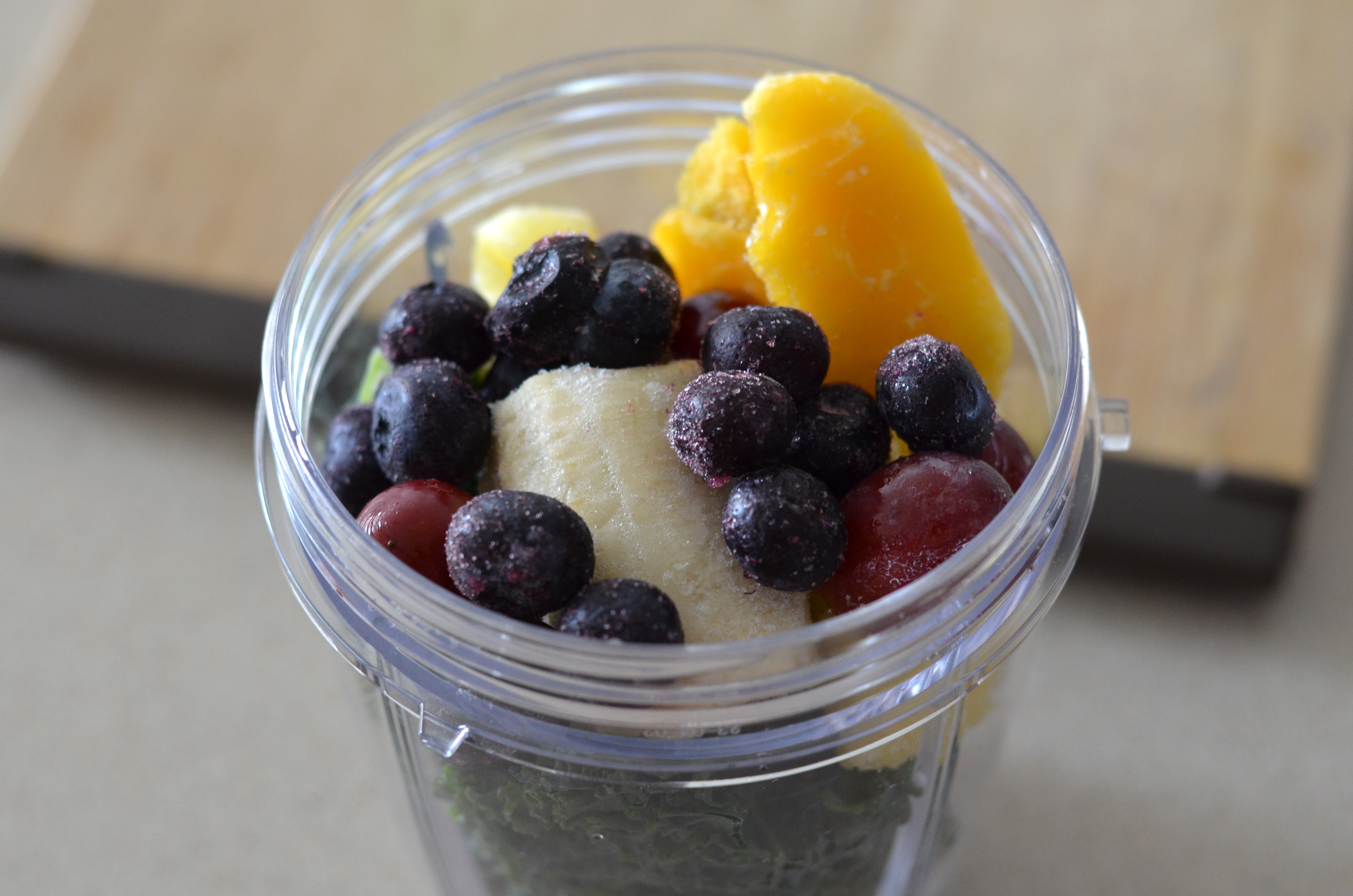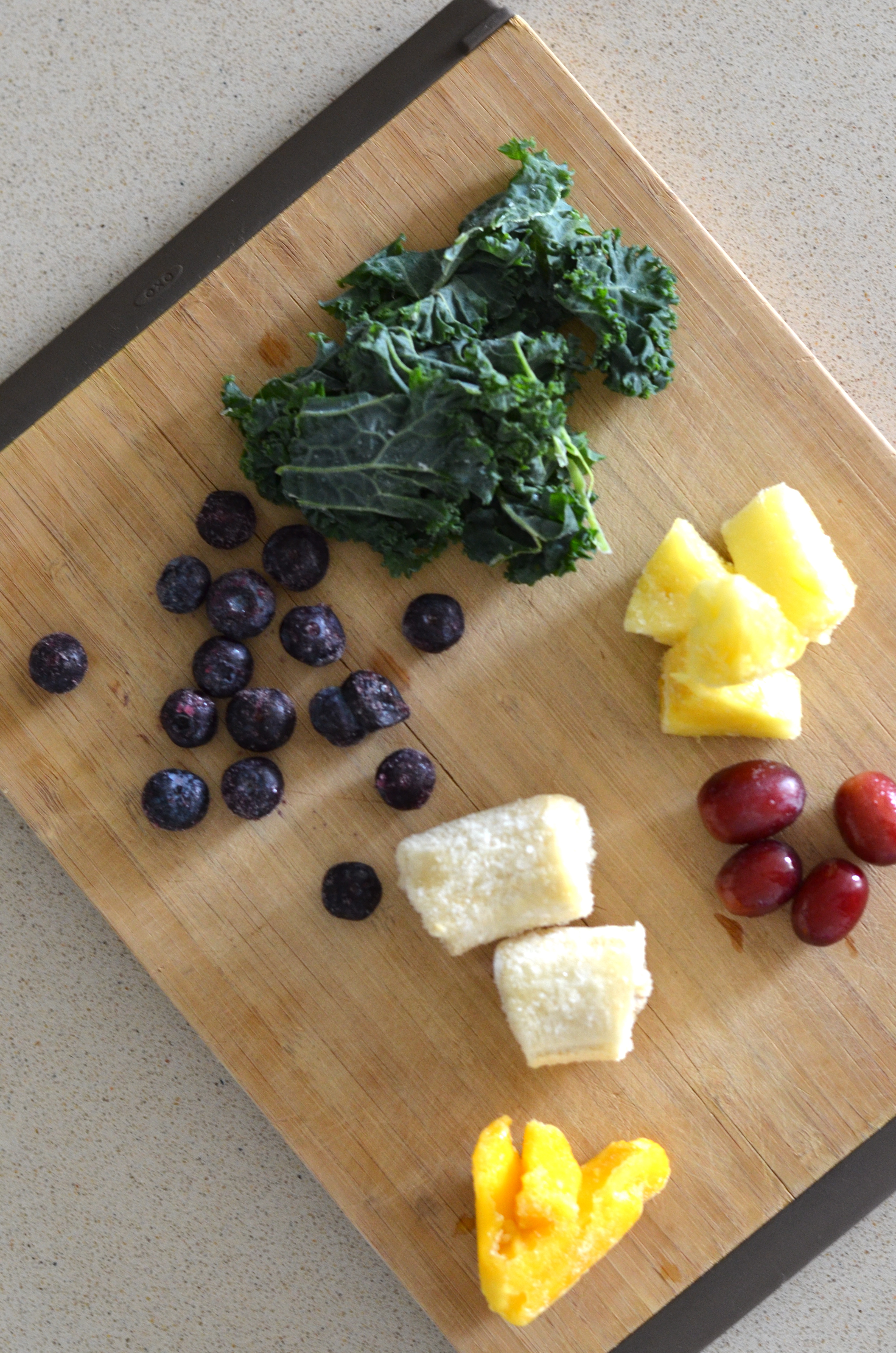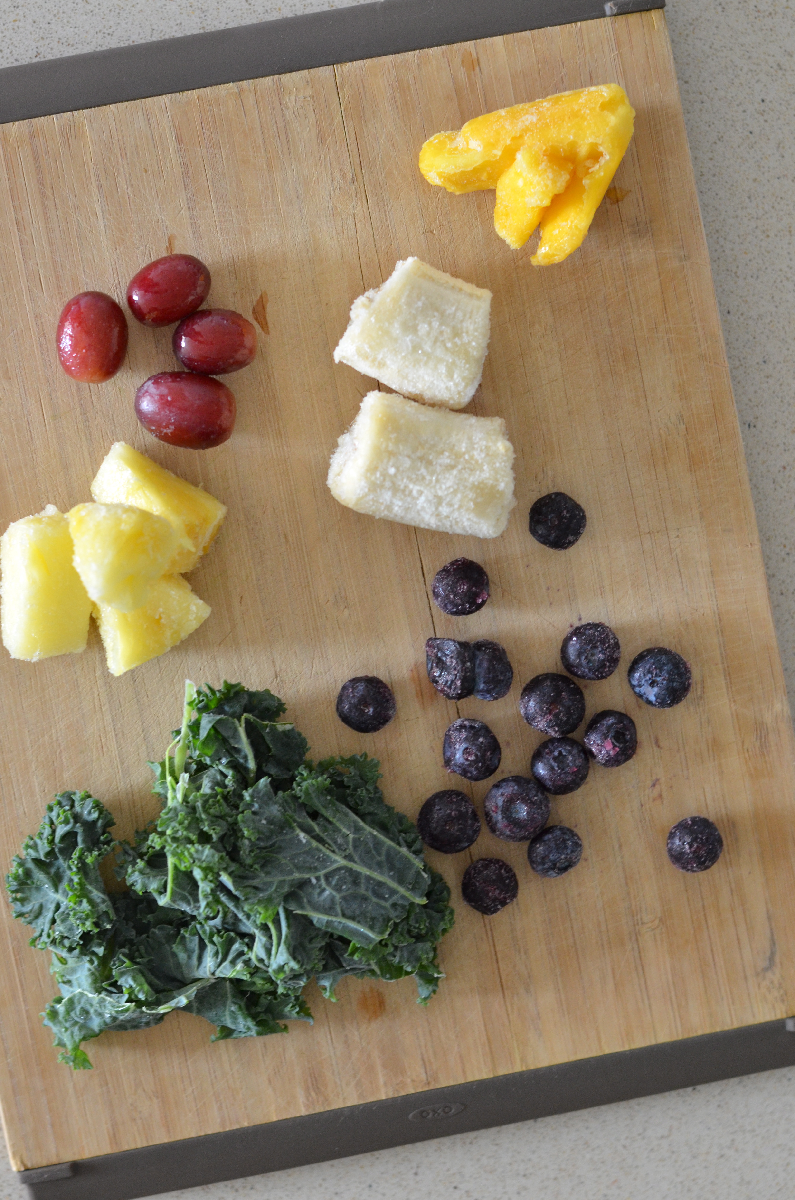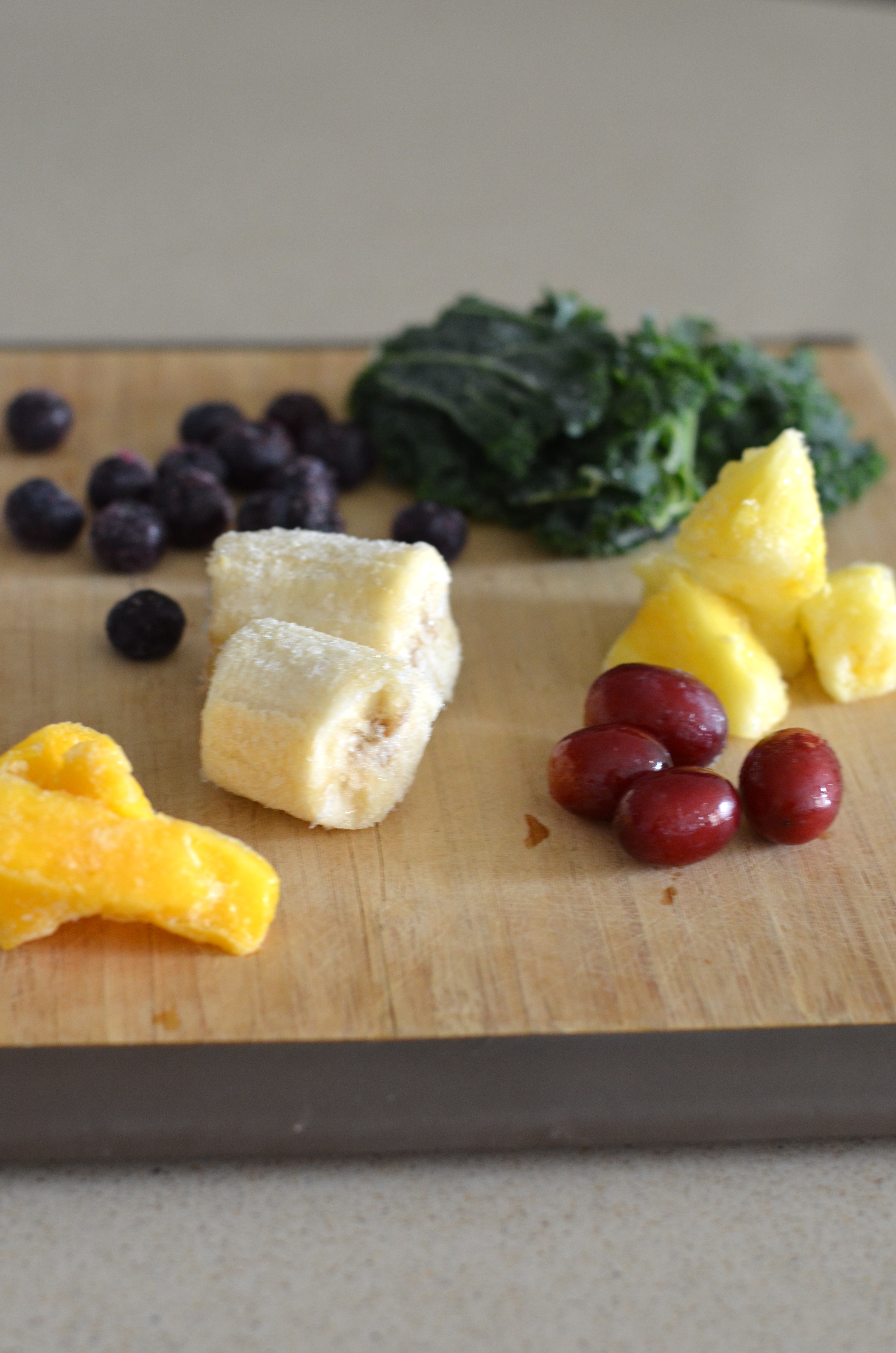 I like to keep all my ingredients in the freezer as that way I don’t have to add any ice. I buy organic kale in bulk and then wash it, remove the thick veins and put it into small baggies and freeze it until we need it. I do the same with spinach leaves. I always like to add a few pieces of frozen banana (no more than half) and a couple pieces of pineapple. We then add lots of other fruits depending on what is in season or in the freezer.
