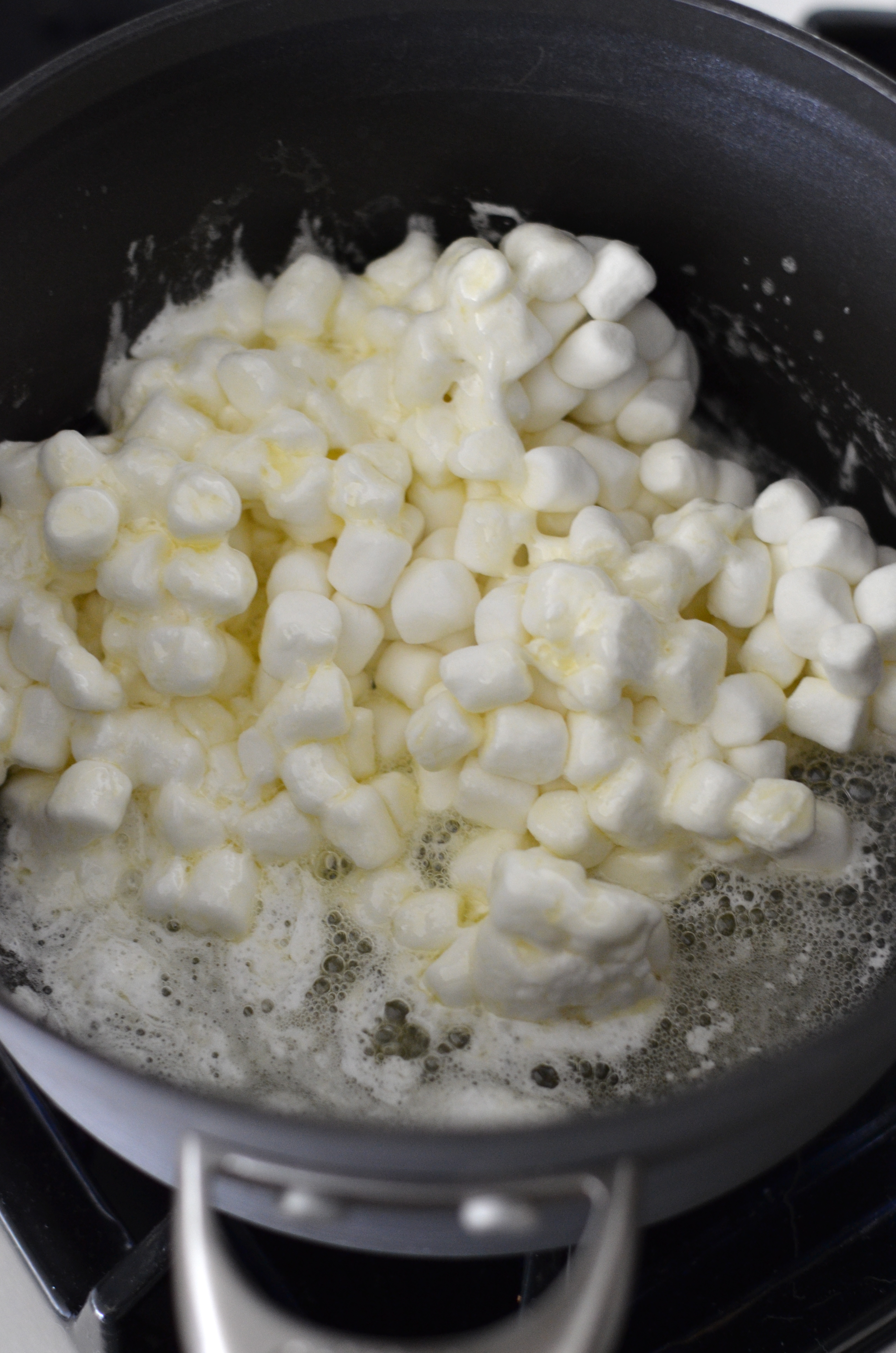 Melt butter in a large saucepan. Once melted, add marshmallows and stir continuously until melted.