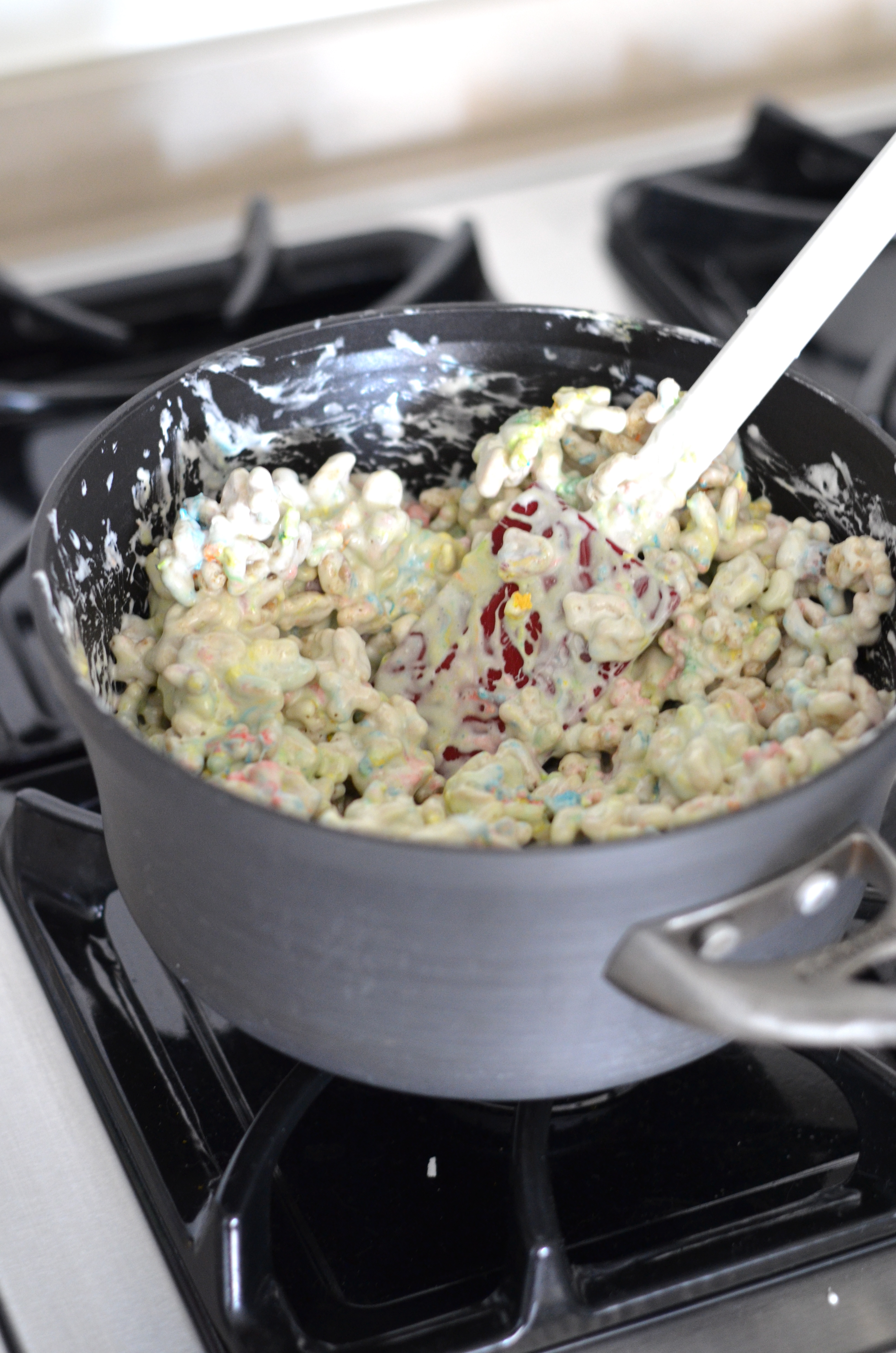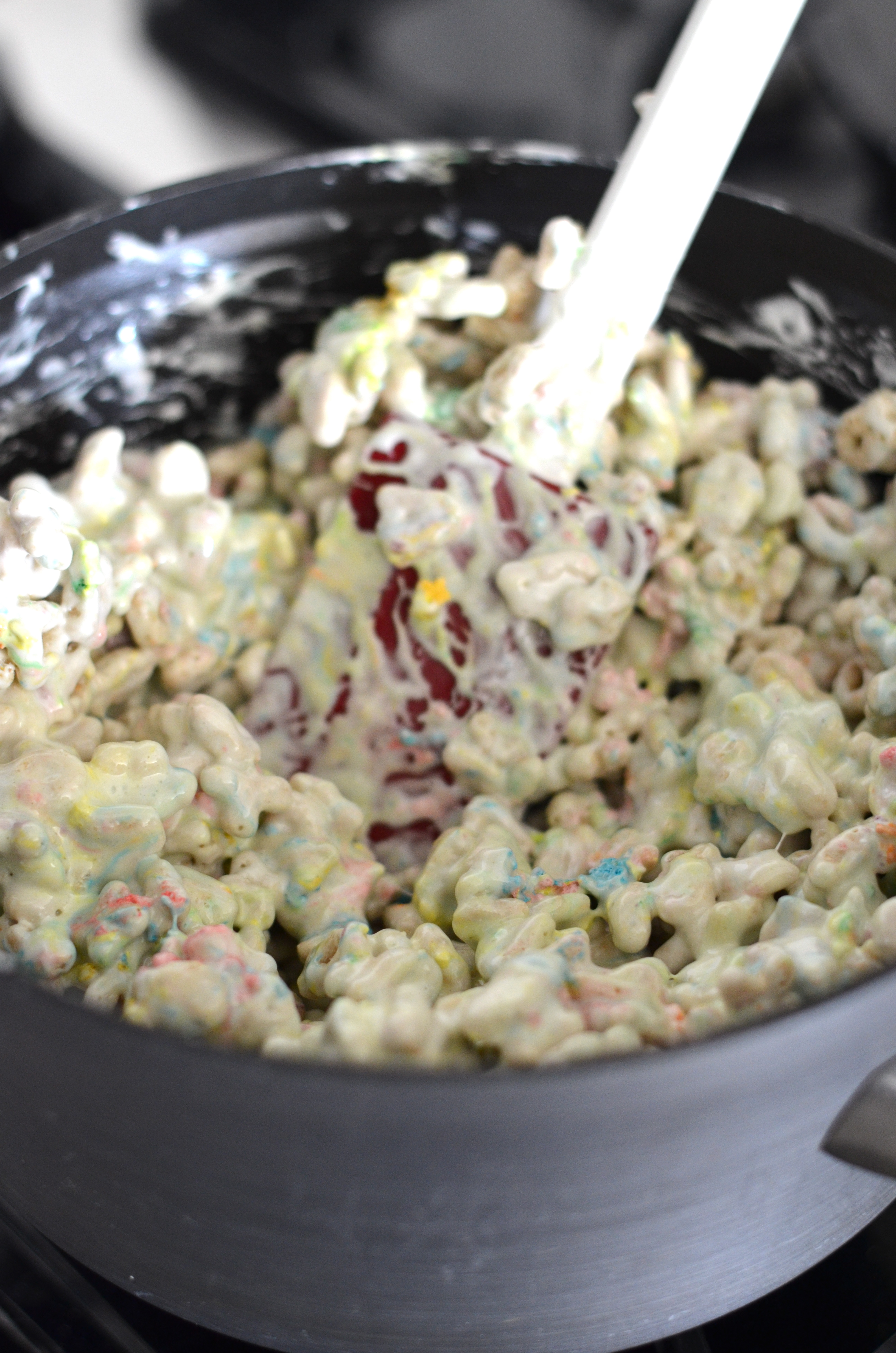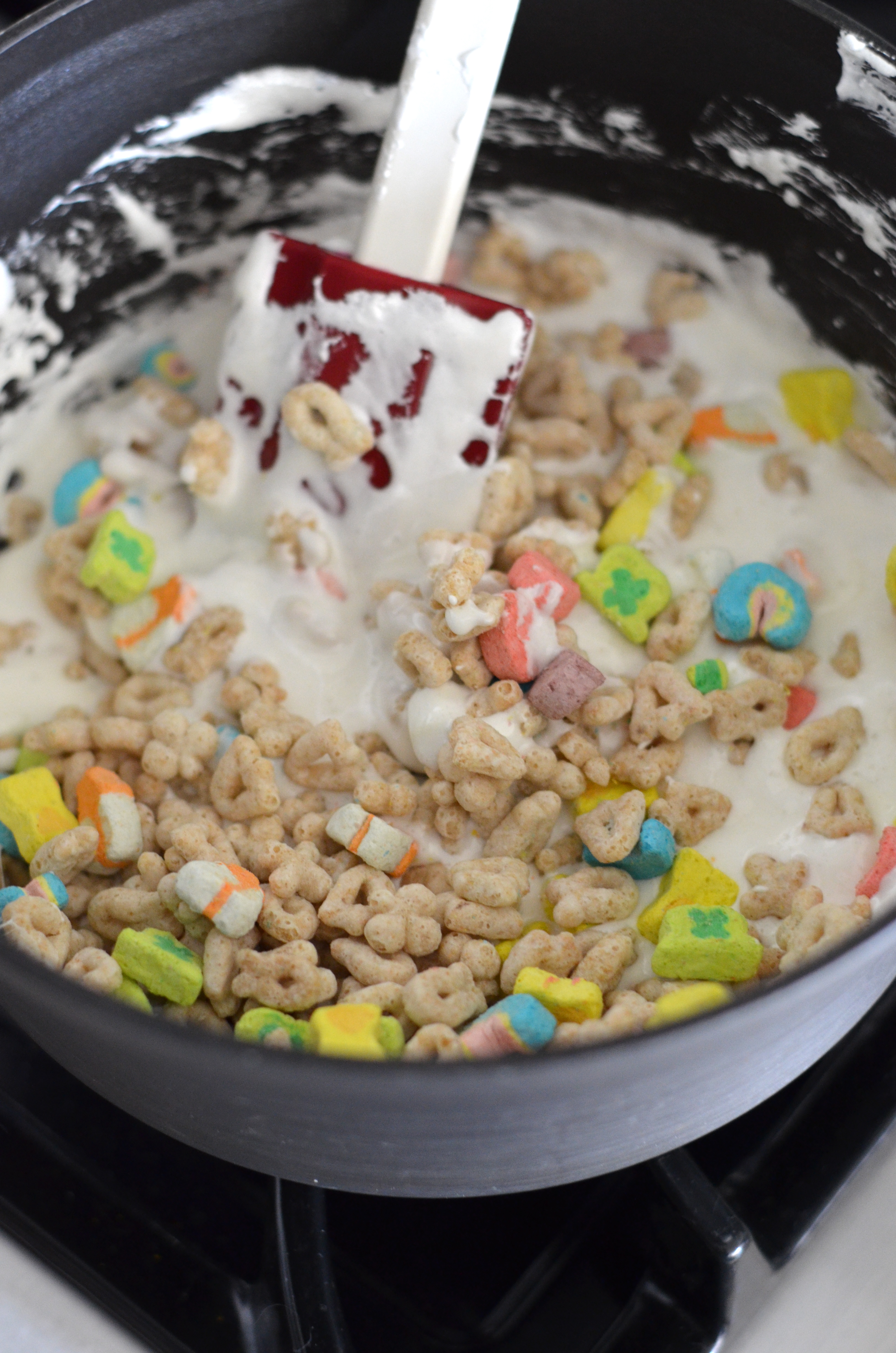 Once melted, add Lucky Charms cereal and stir until well coated.