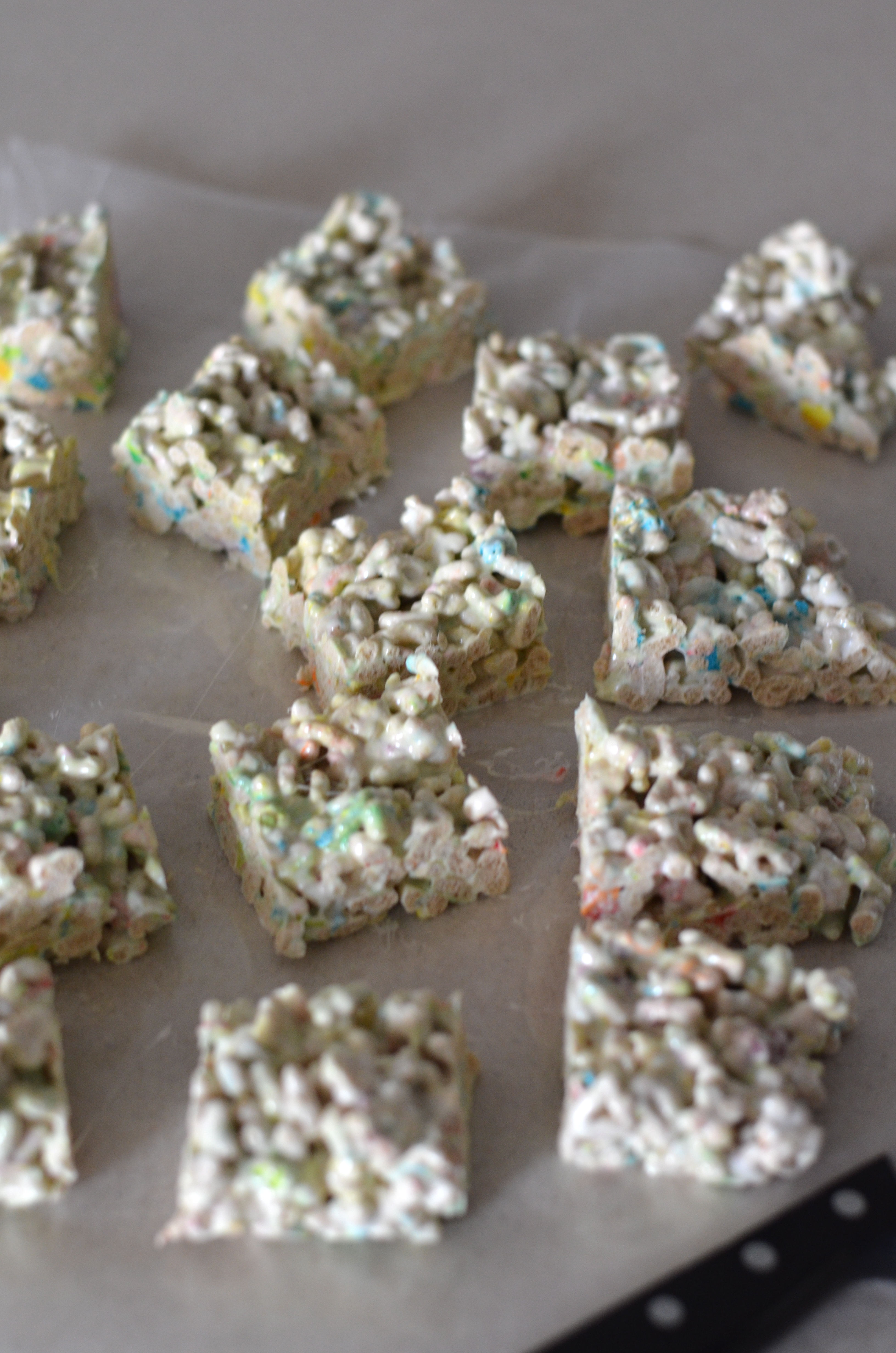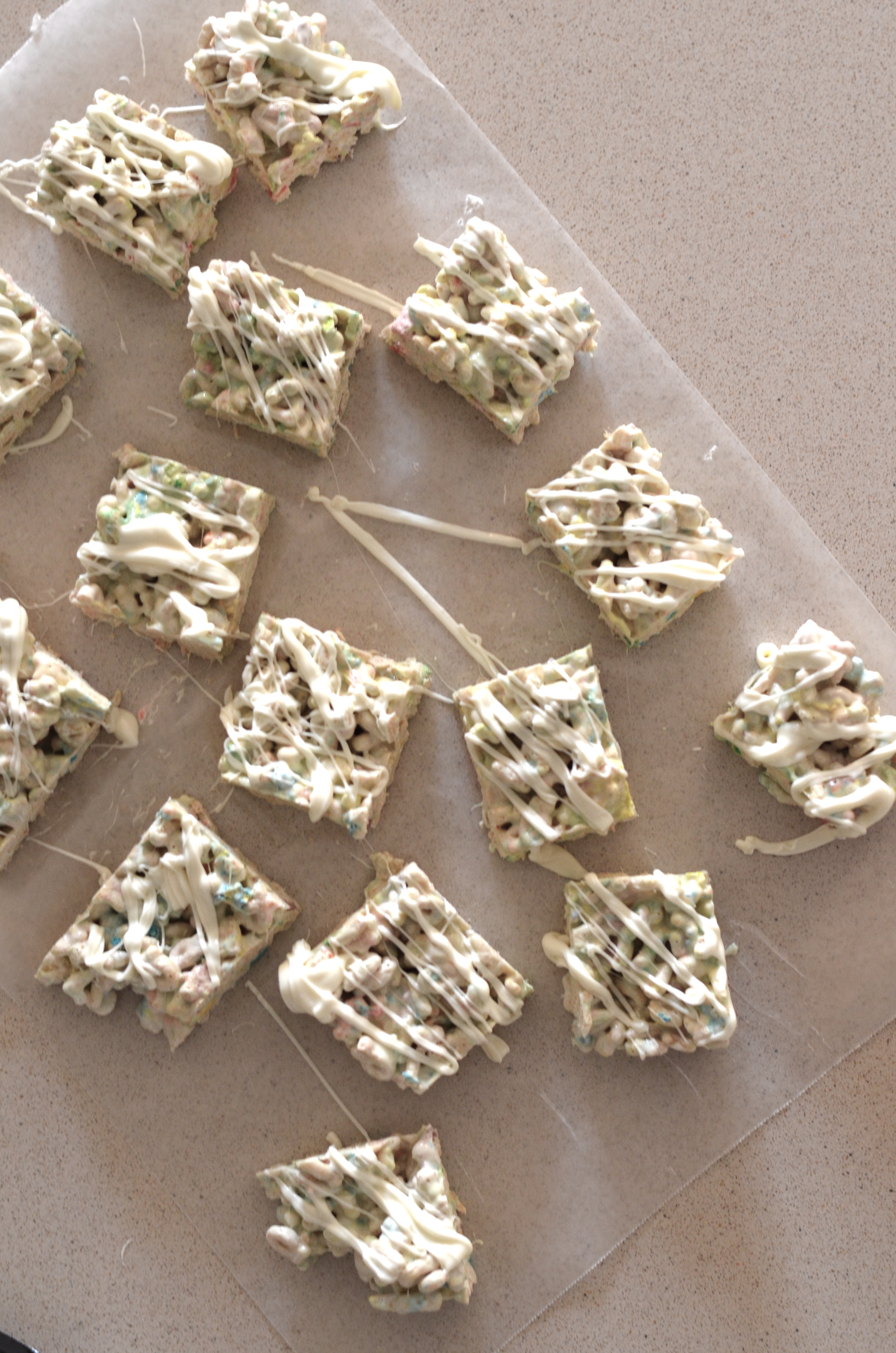 They are super quick and easy to make and you could cut them into any fun shape you like. If I was a craftier person I would have cut them into the shapes of the marshmallows (rainbows, pots of gold, 4 leaf clovers, red ballons, etc) and then dipped the bottoms in the same color chocolate. If you have more time/patience you should do that and then send me some pictures!