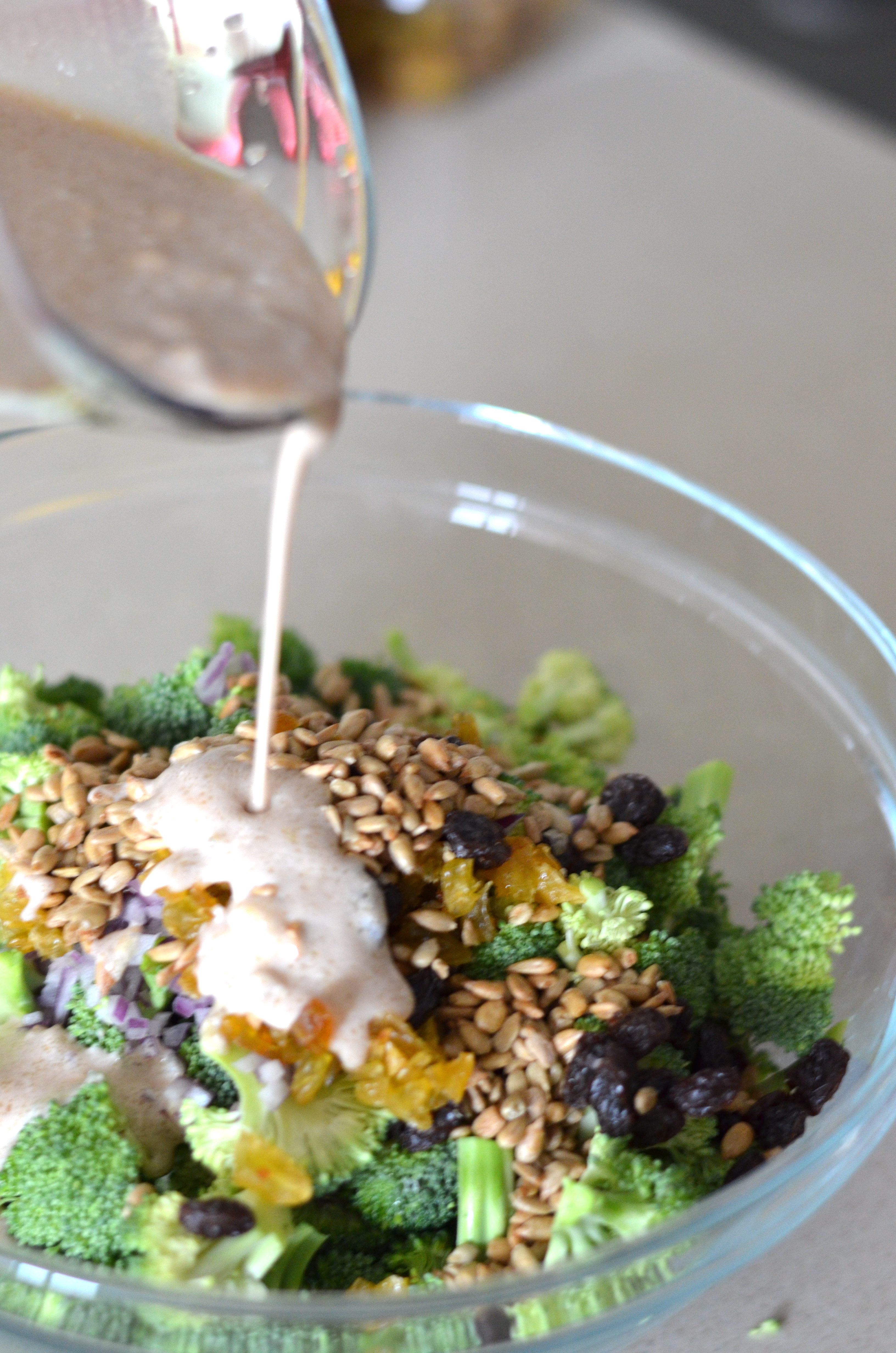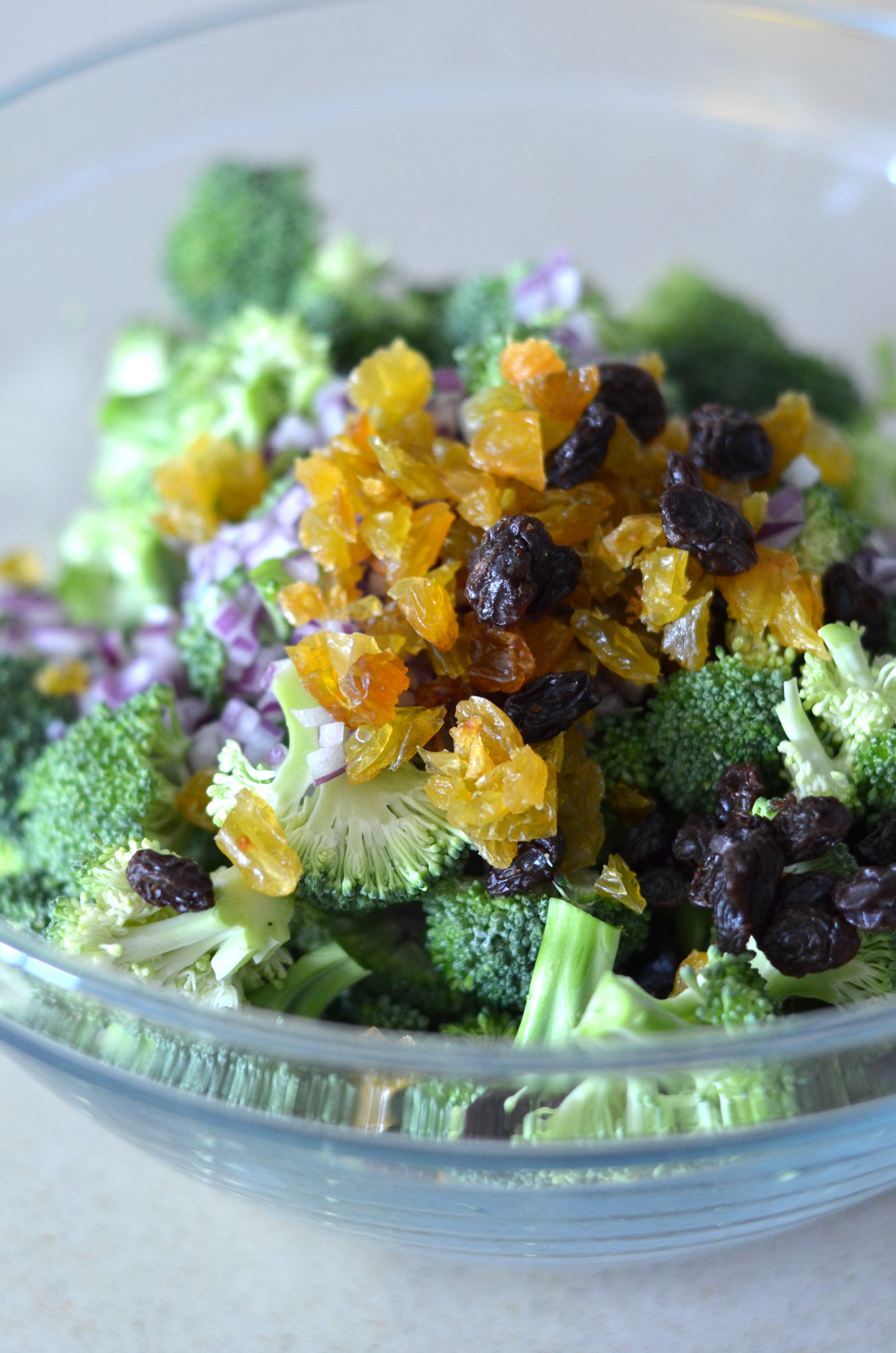 The longer you let the broccoli sit in the dressing the better it will taste. I used honey to sweeten mine but you could add brown sugar and Mayo (I used greek yogurt) if you want to make it a bit more like the original recipe.
