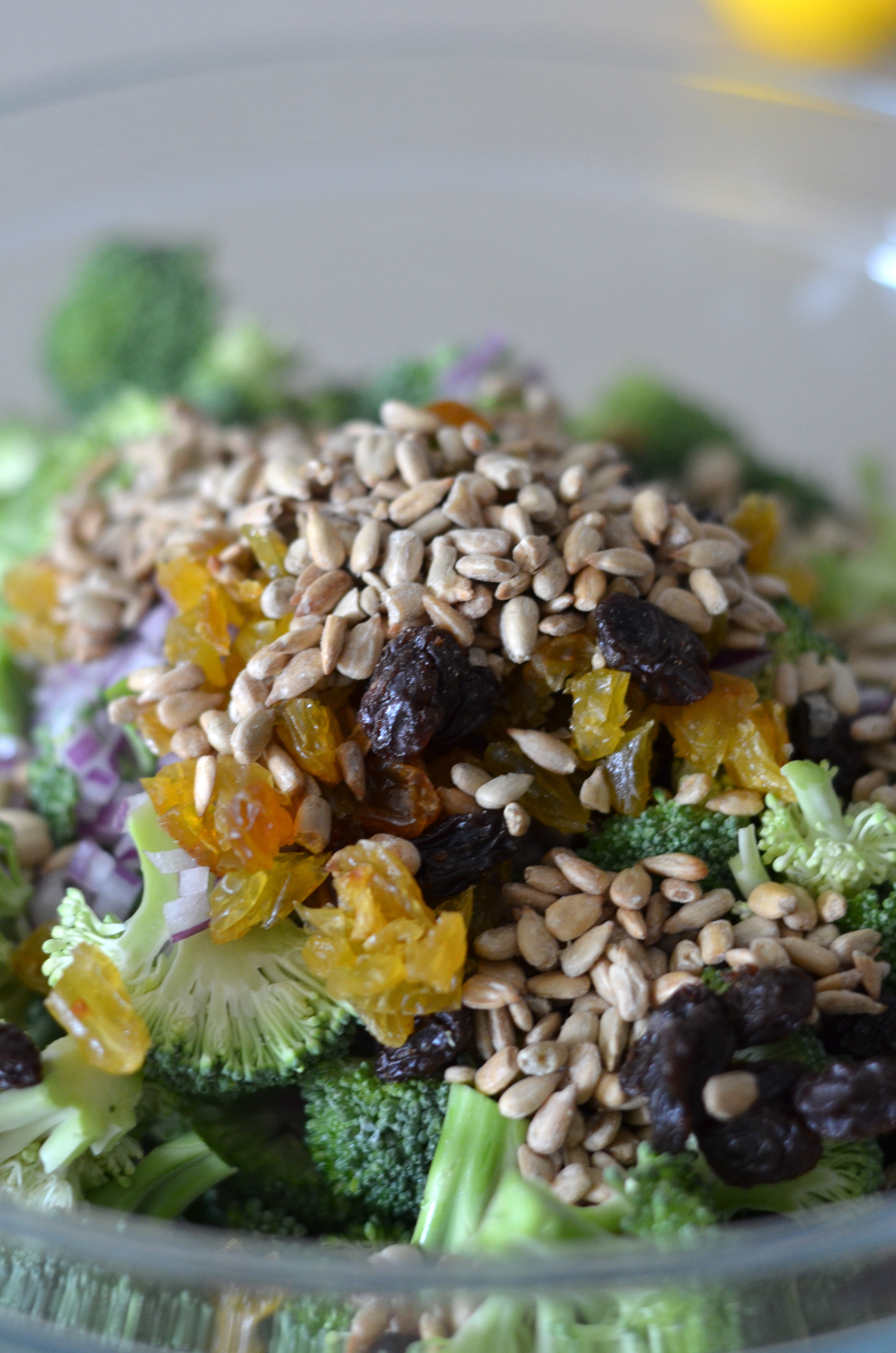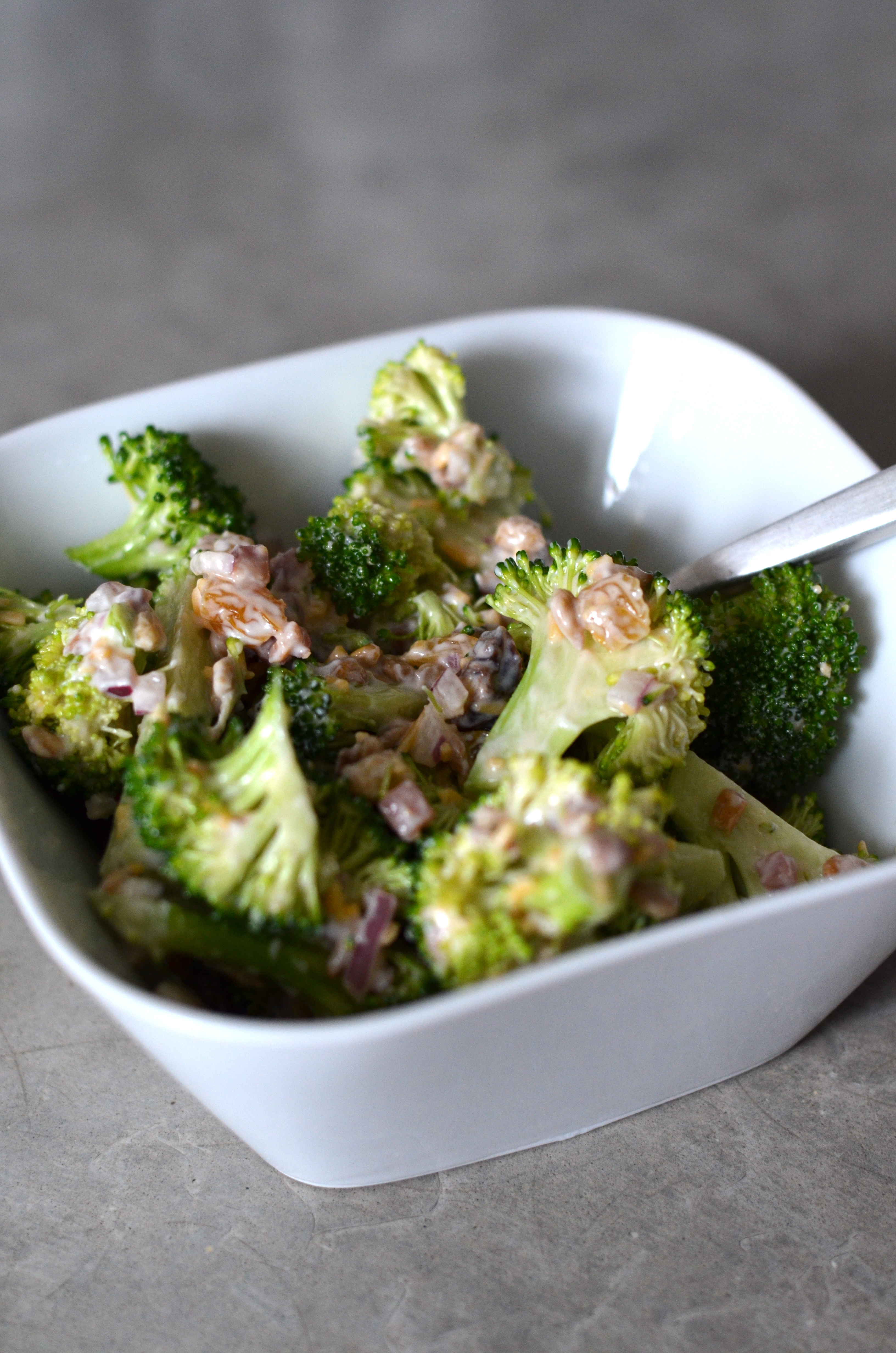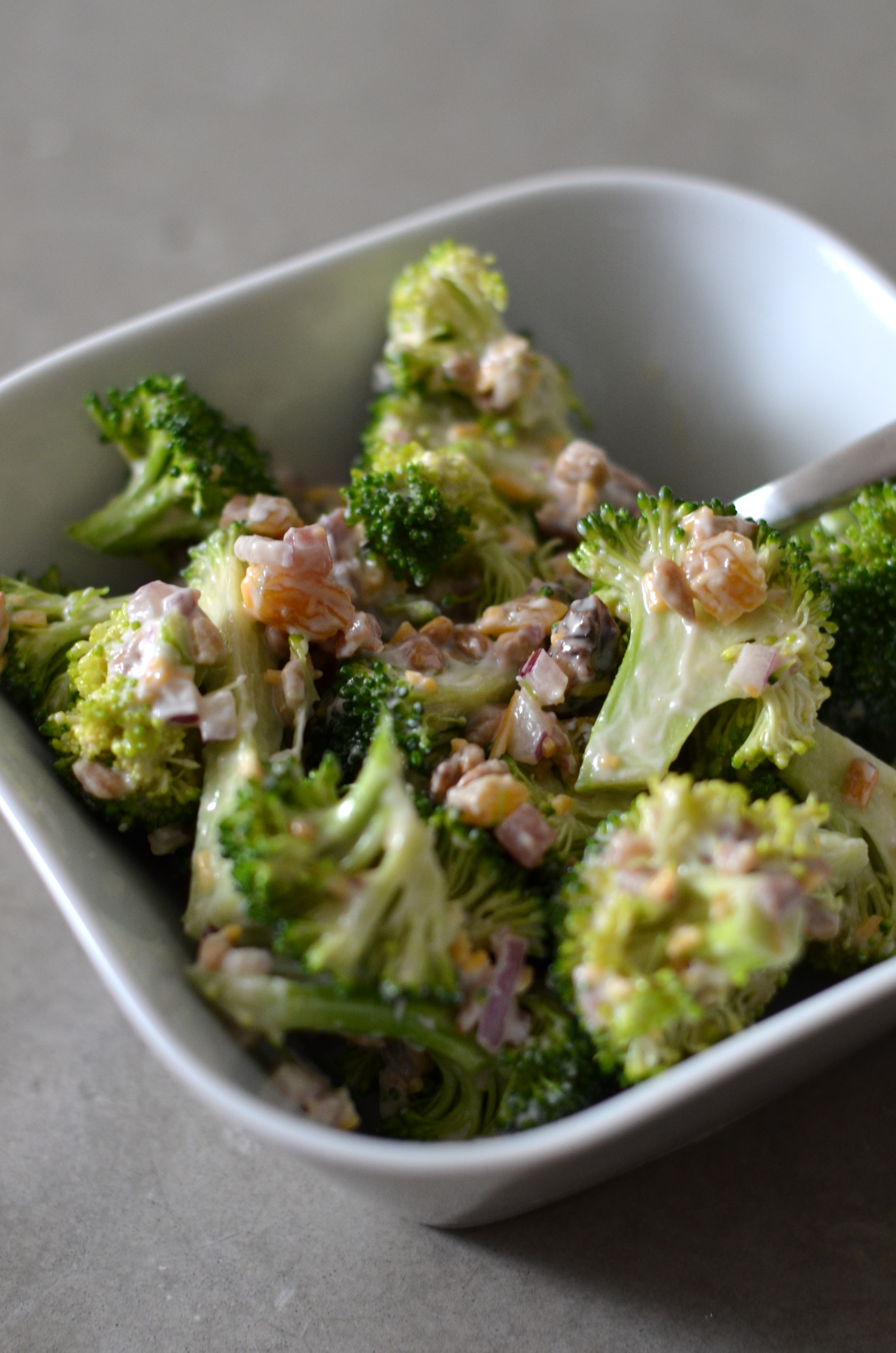 Mikey and I both LOVE Broccoli Crunch Salad with a strong passion. It is unfortunately, like most delicious things, full of sugar and fat…so I made up a lighter version that tastes pretty close to the original.