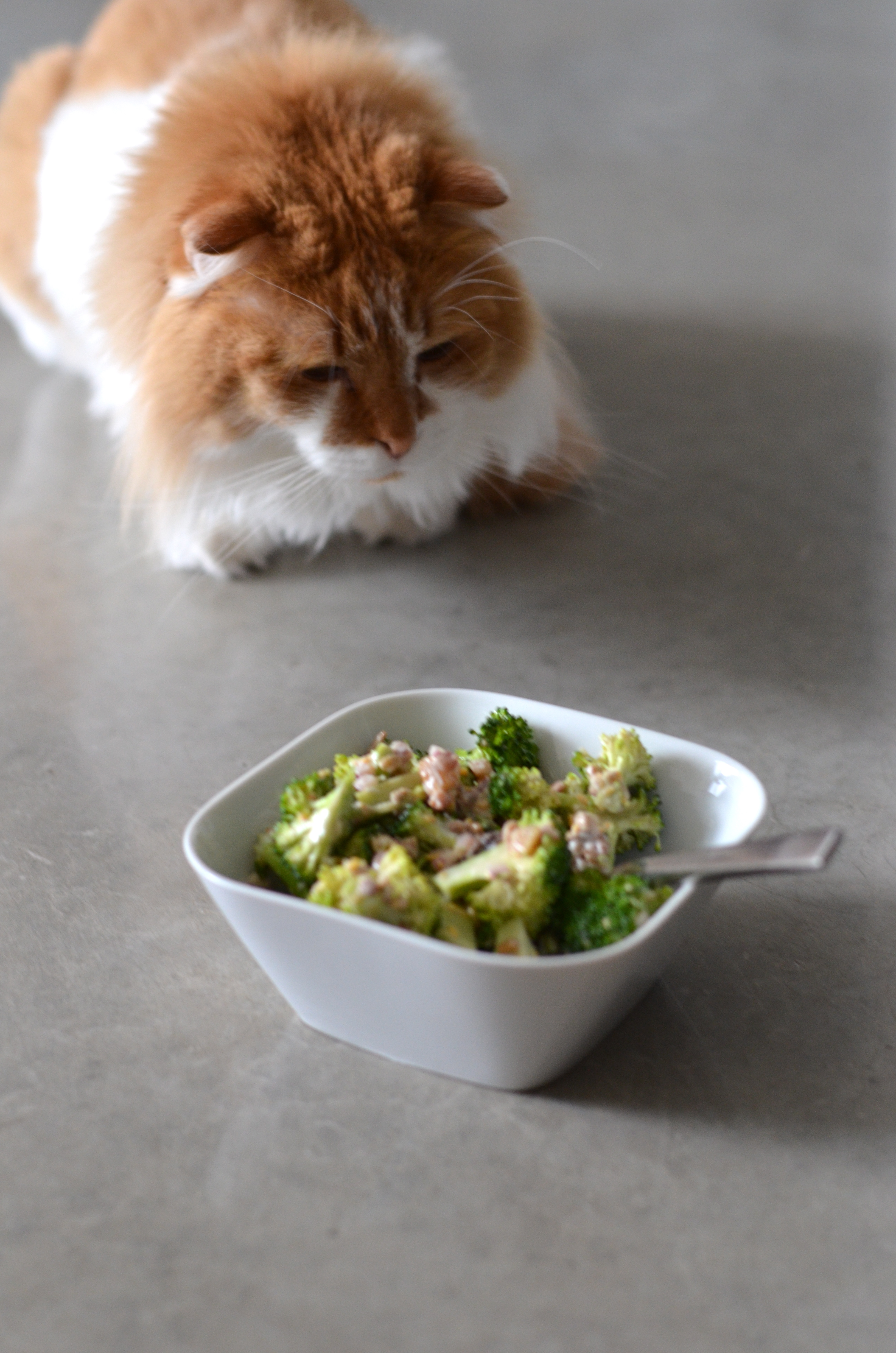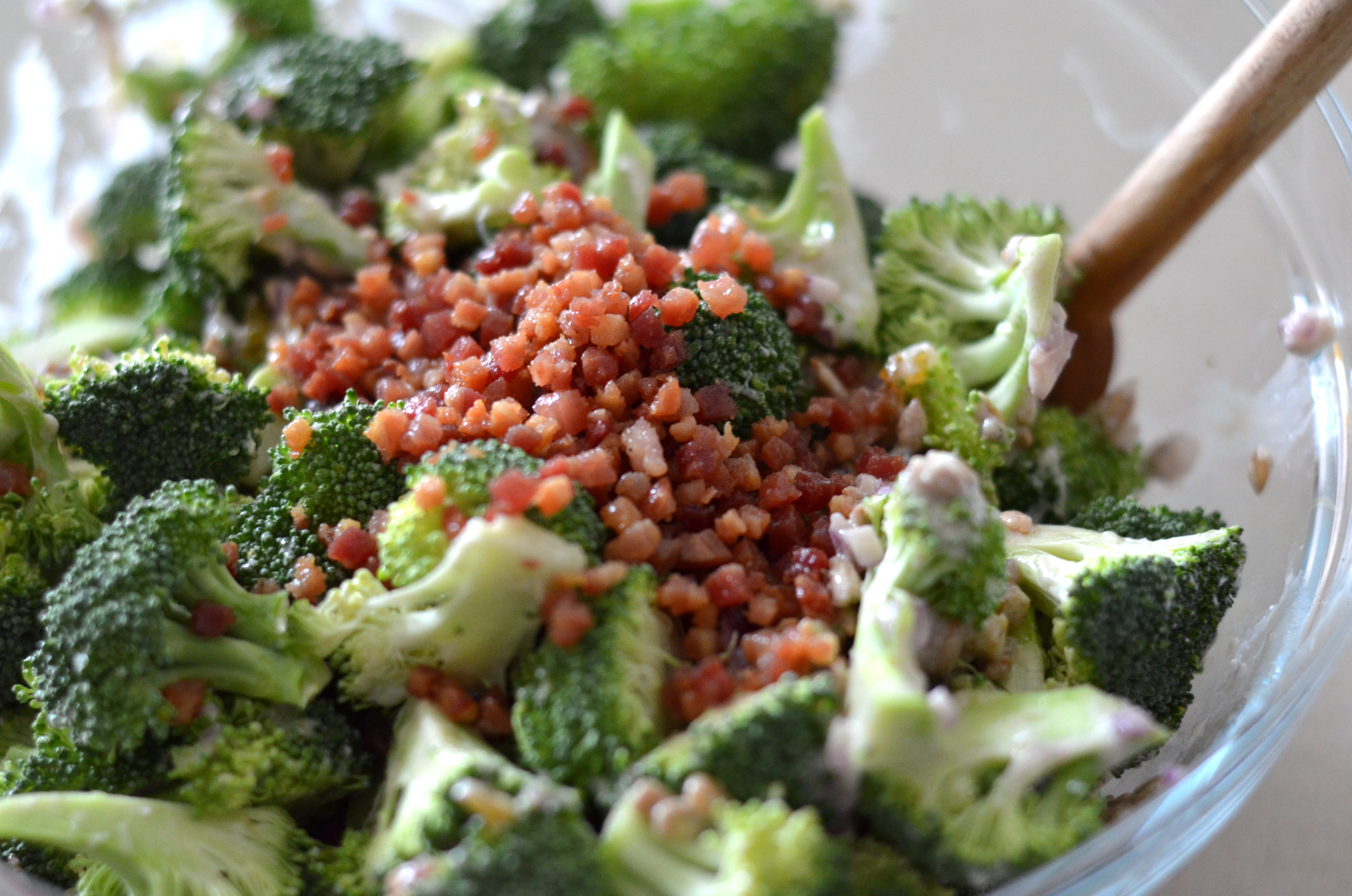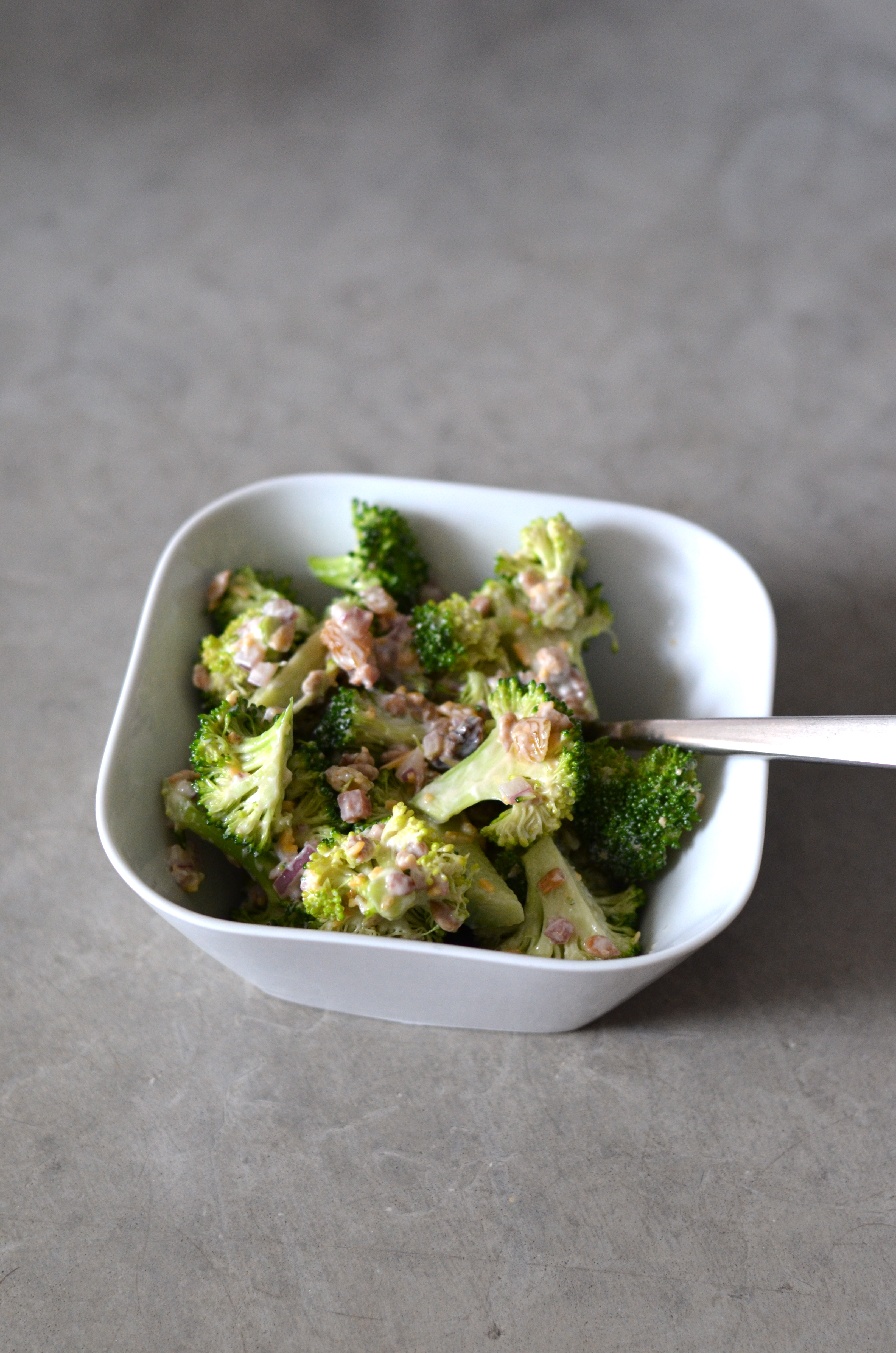 Mikey and I both LOVE Broccoli Crunch Salad with a strong passion. It is unfortunately, like most delicious things, full of sugar and fat…so I made up a lighter version that tastes pretty close to the original.