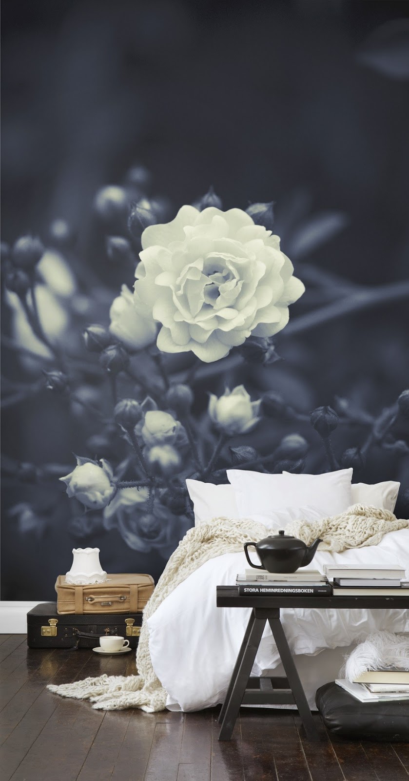 I want to fall asleep and wake up in this room every day. This is the most magical wallpaper I have ever seen. Plus that bed looks so comfortable!