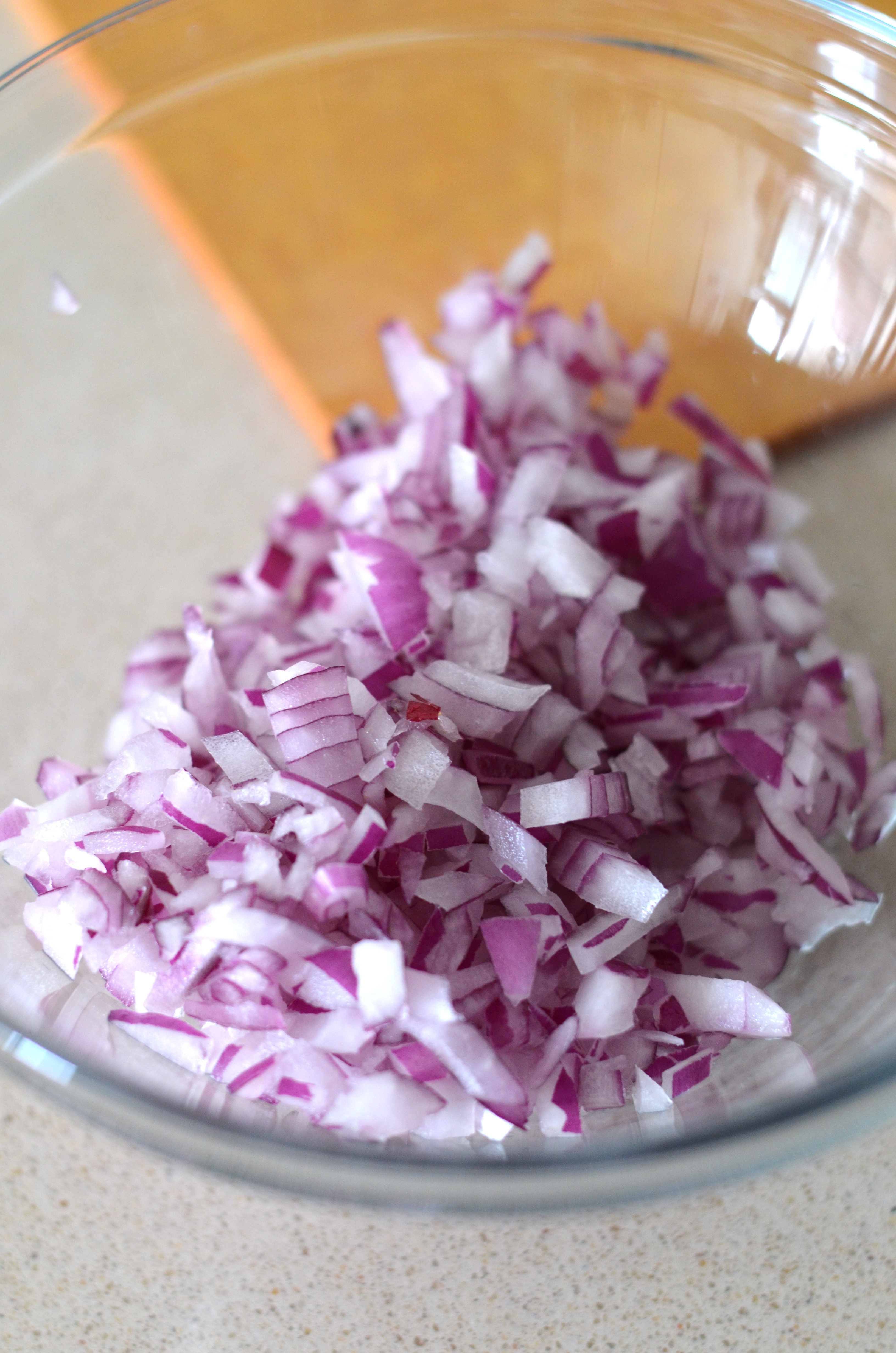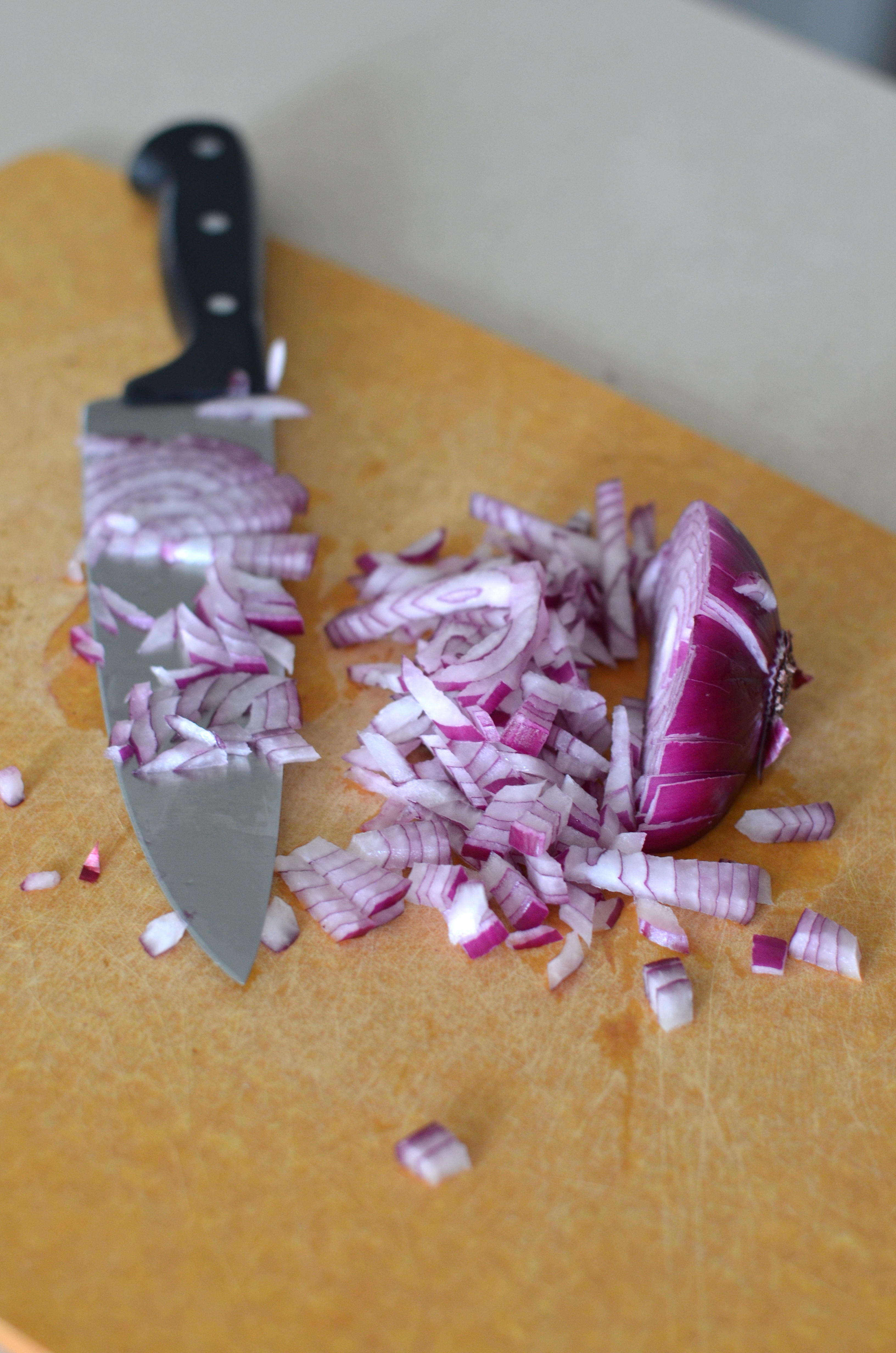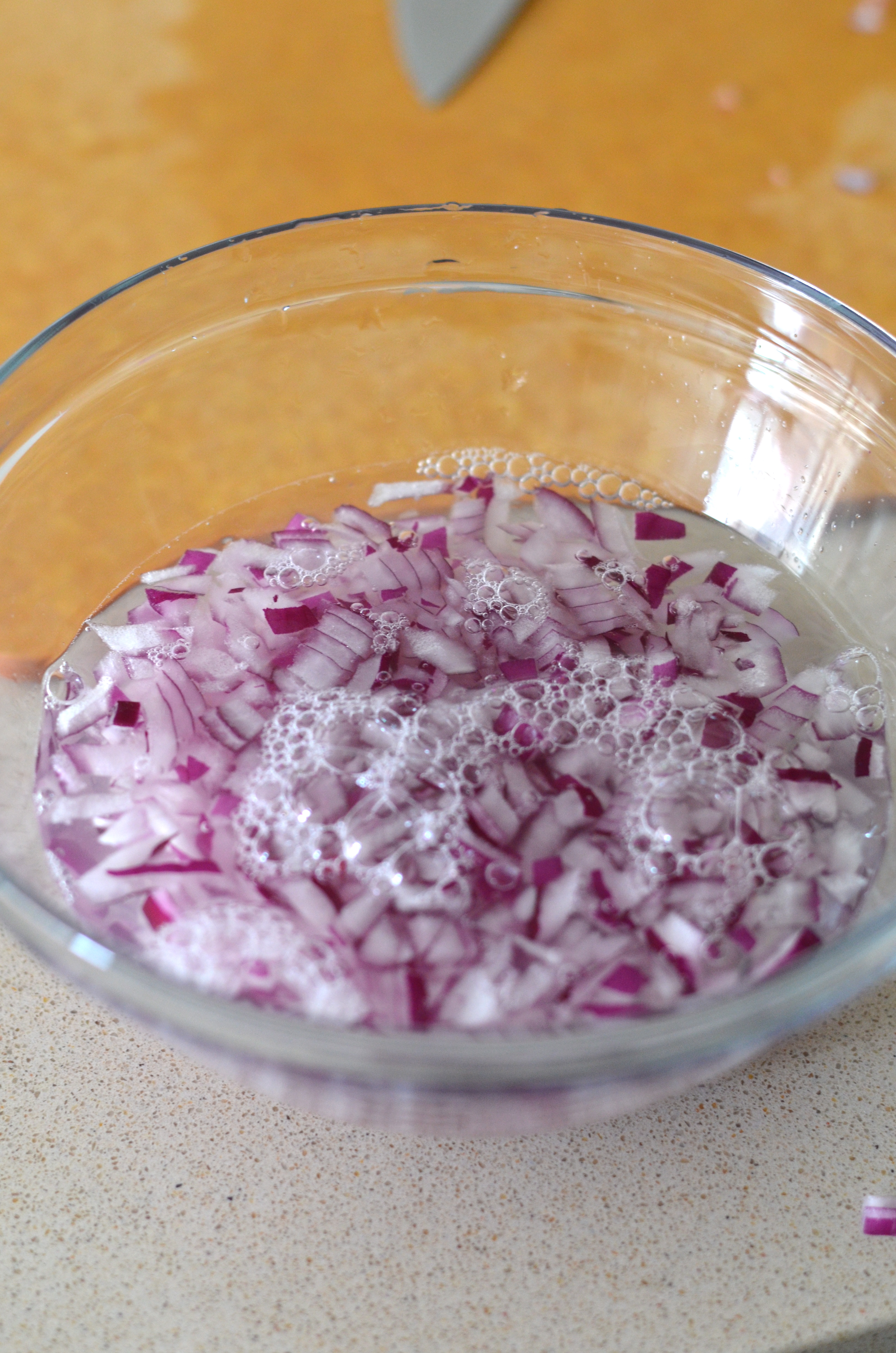 Dice onion and let soak in a bowl of water for about 10 minutes to take a bit of the strong edge off.