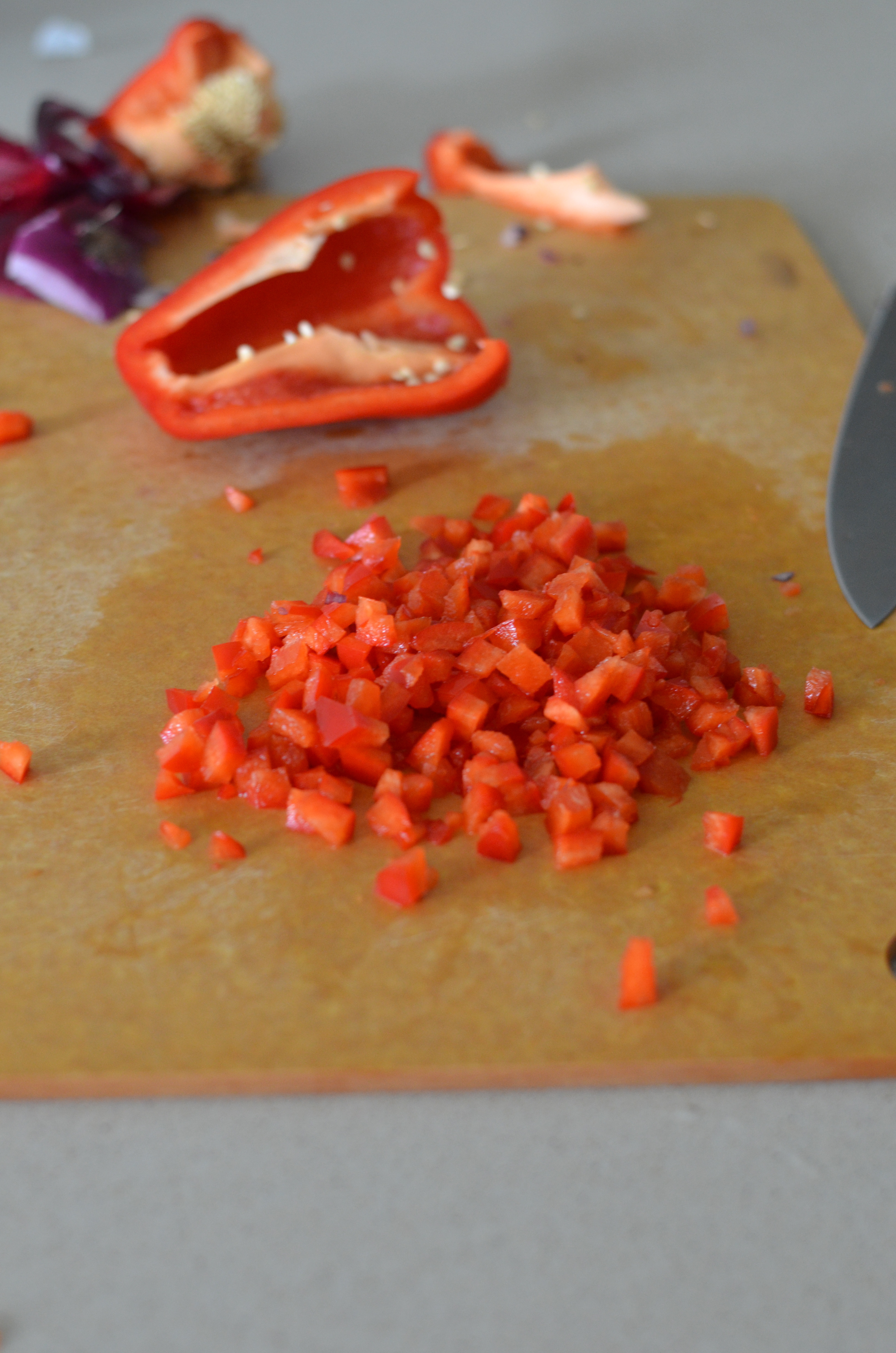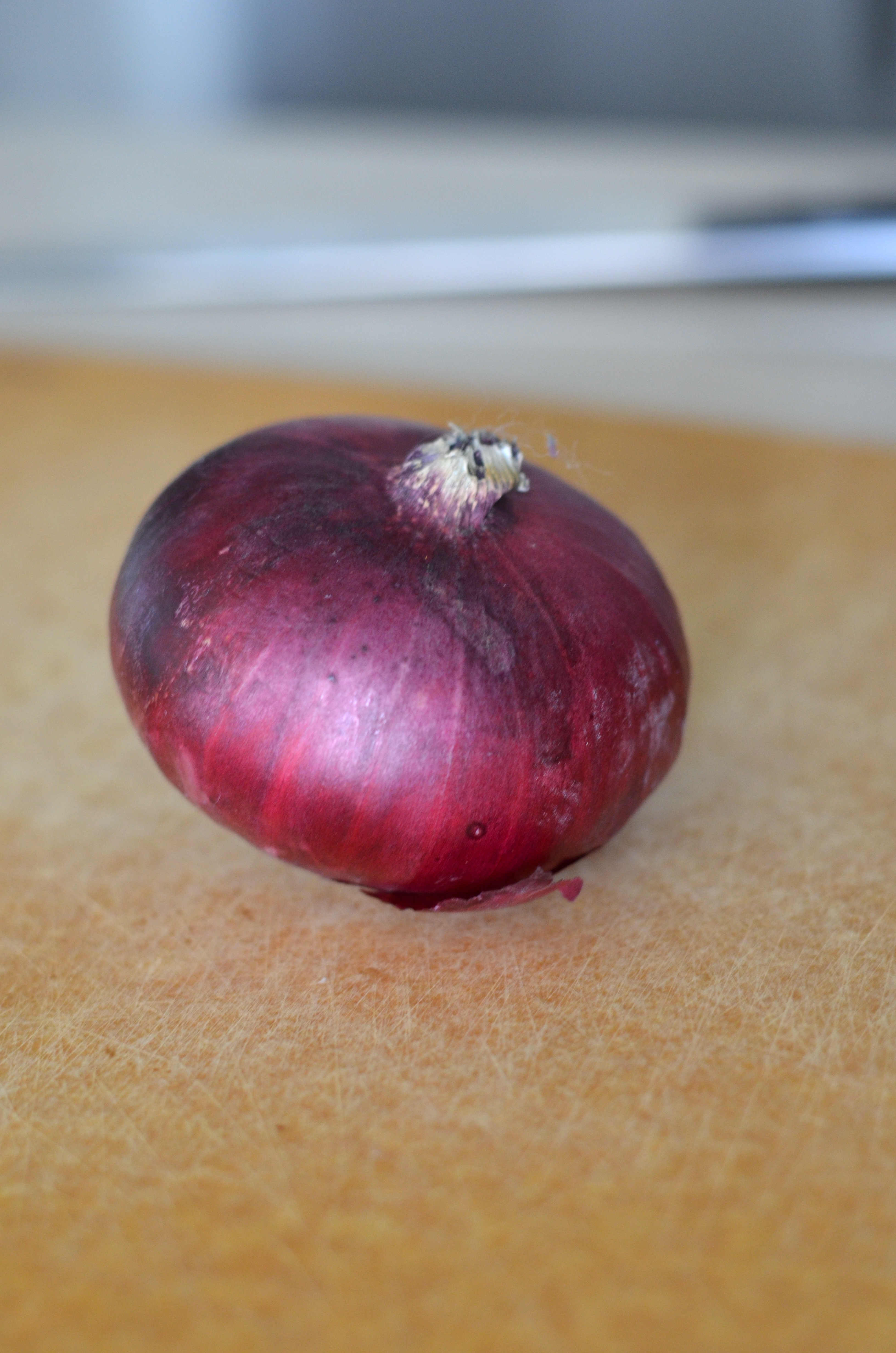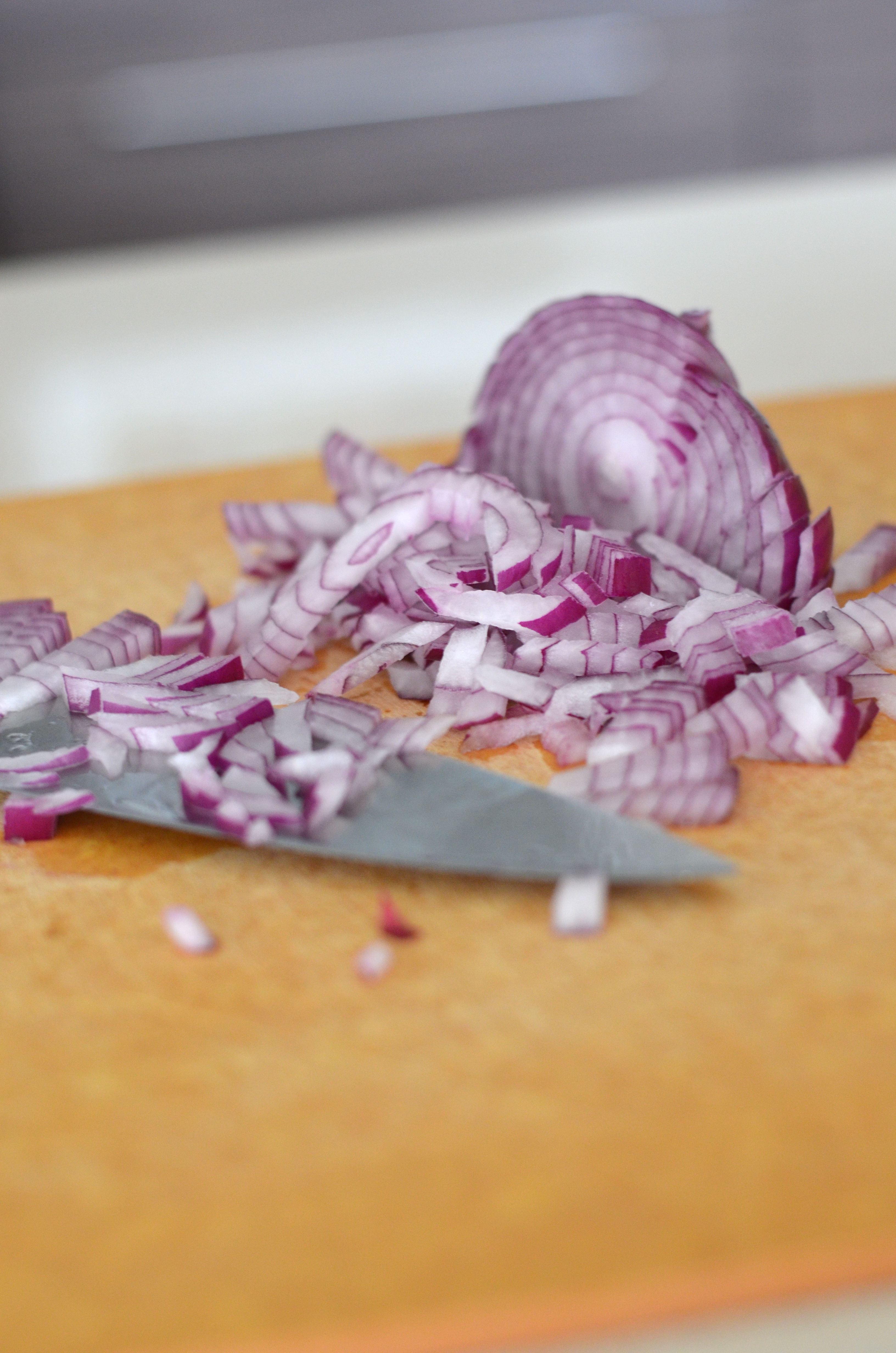 Dice onion and let soak in a bowl of water for about 10 minutes to take a bit of the strong edge off.