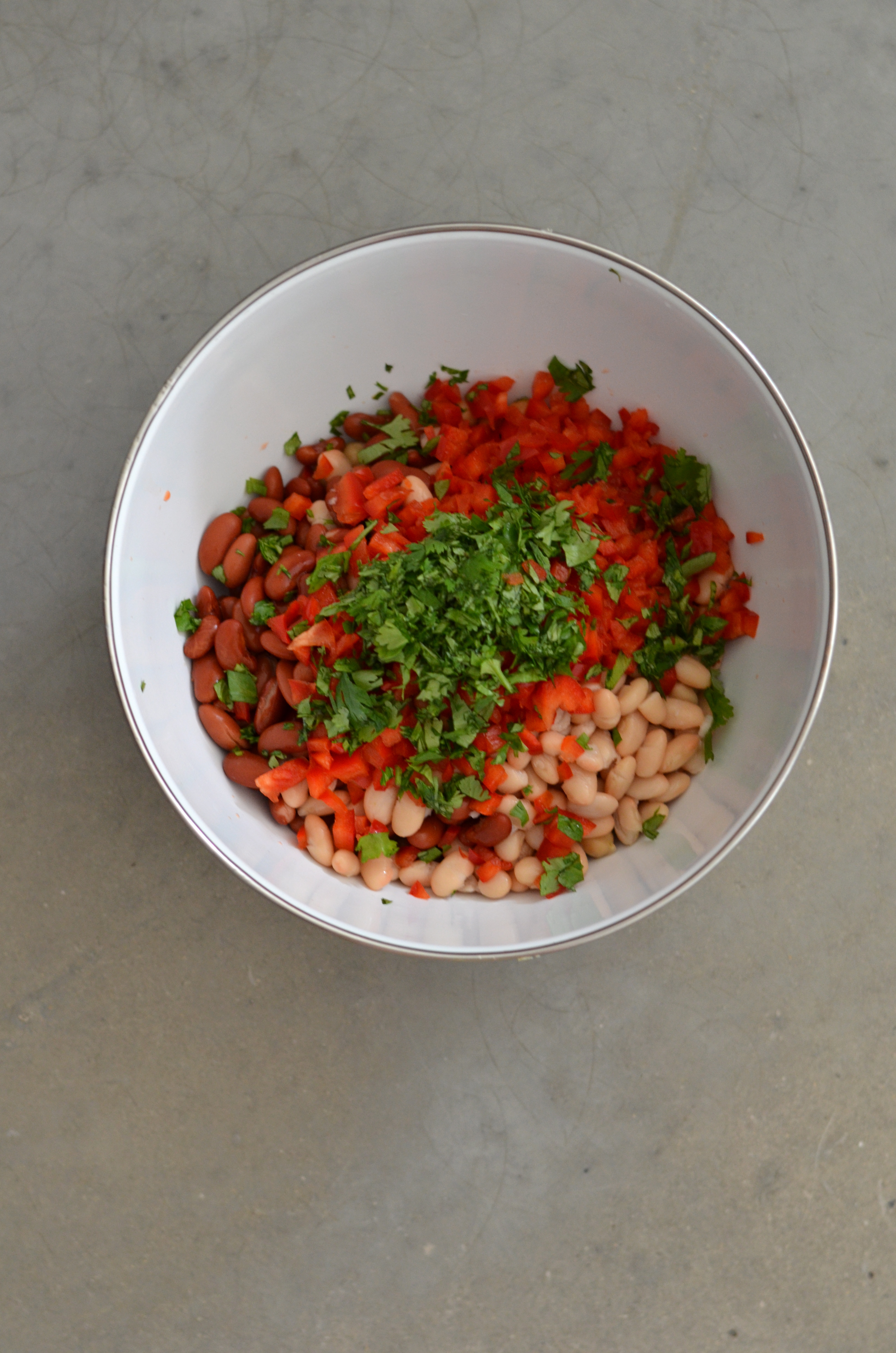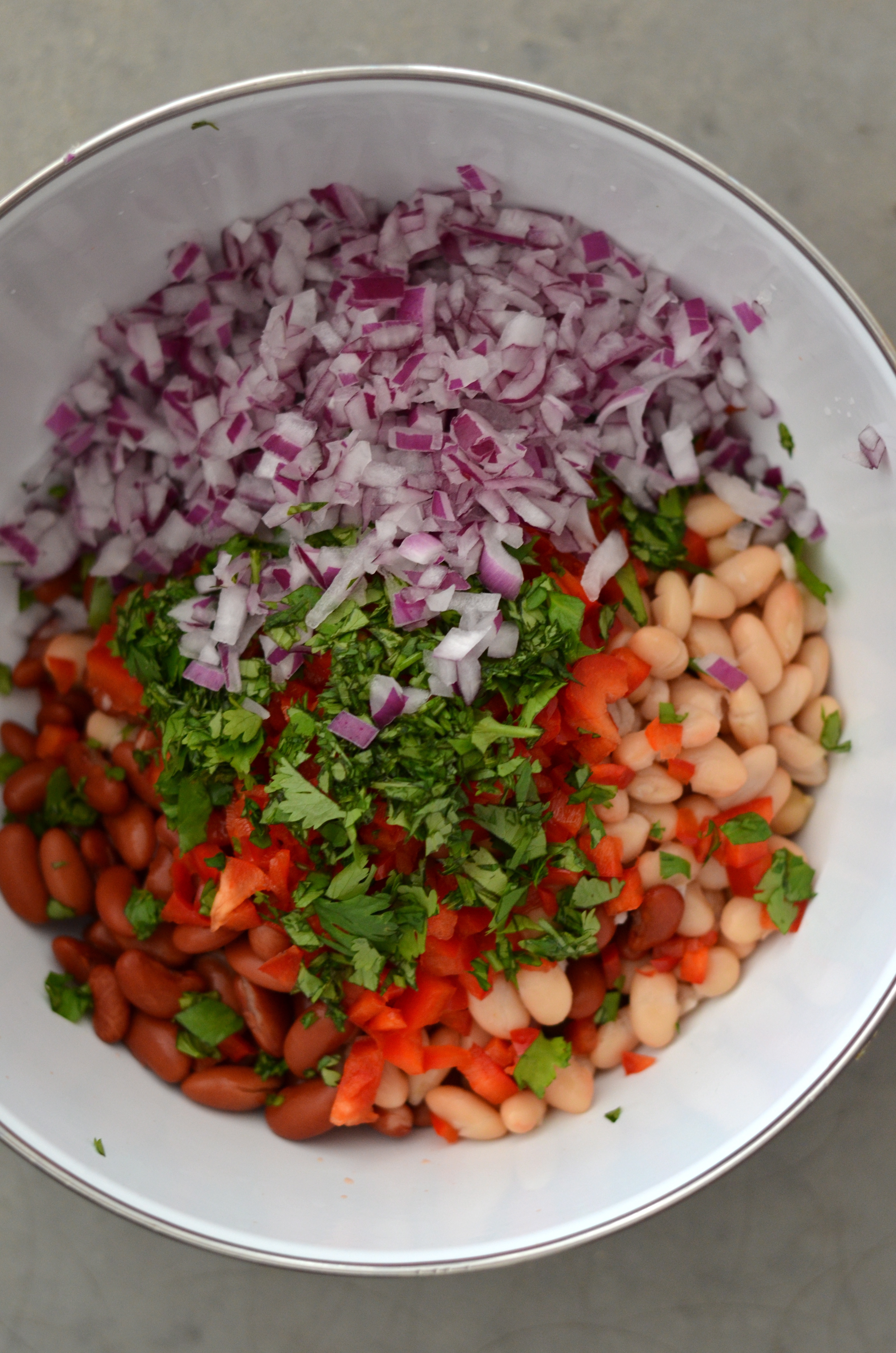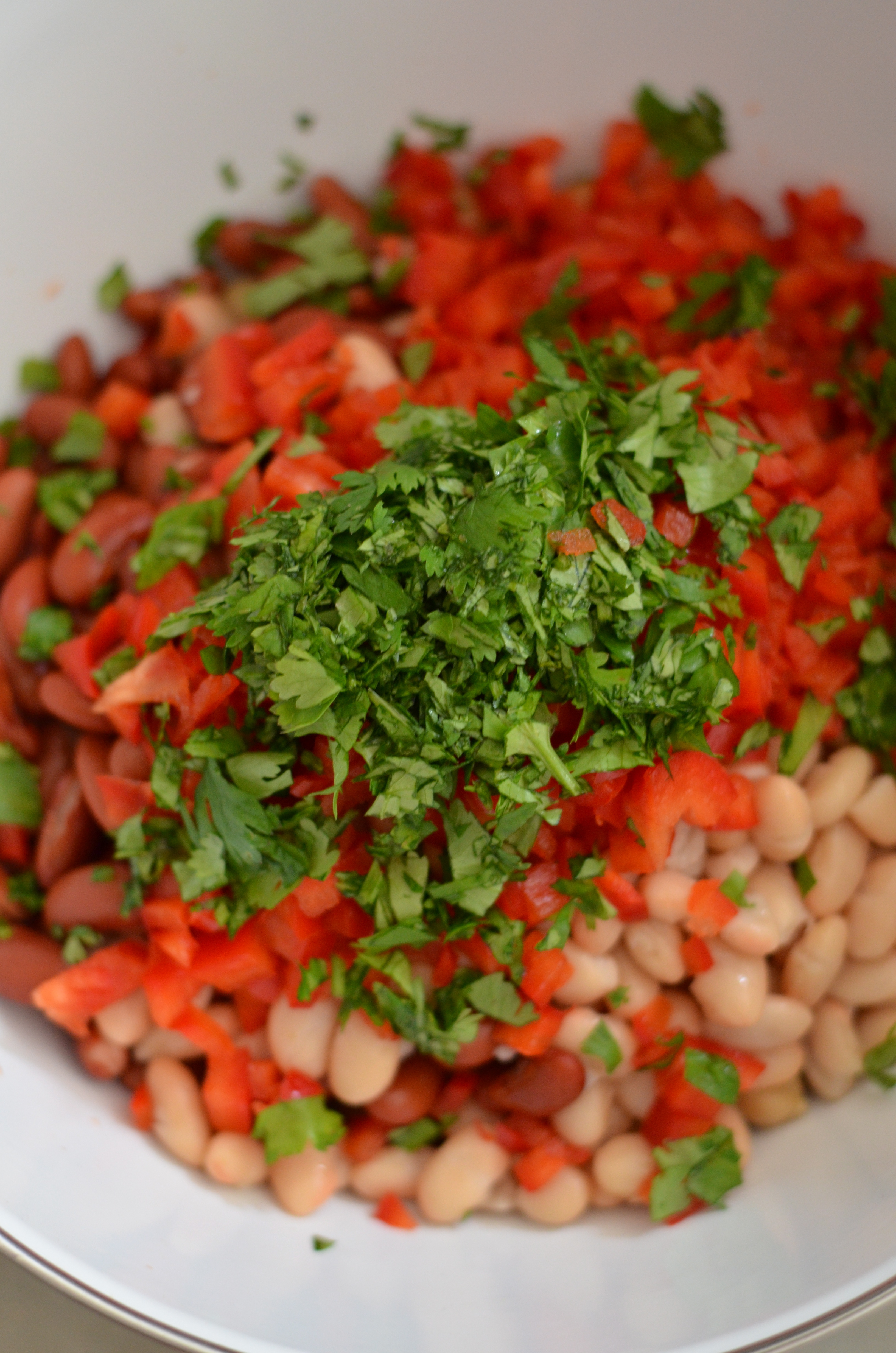 Combine cilantro, beans, red onion and red pepper together in large bowl.