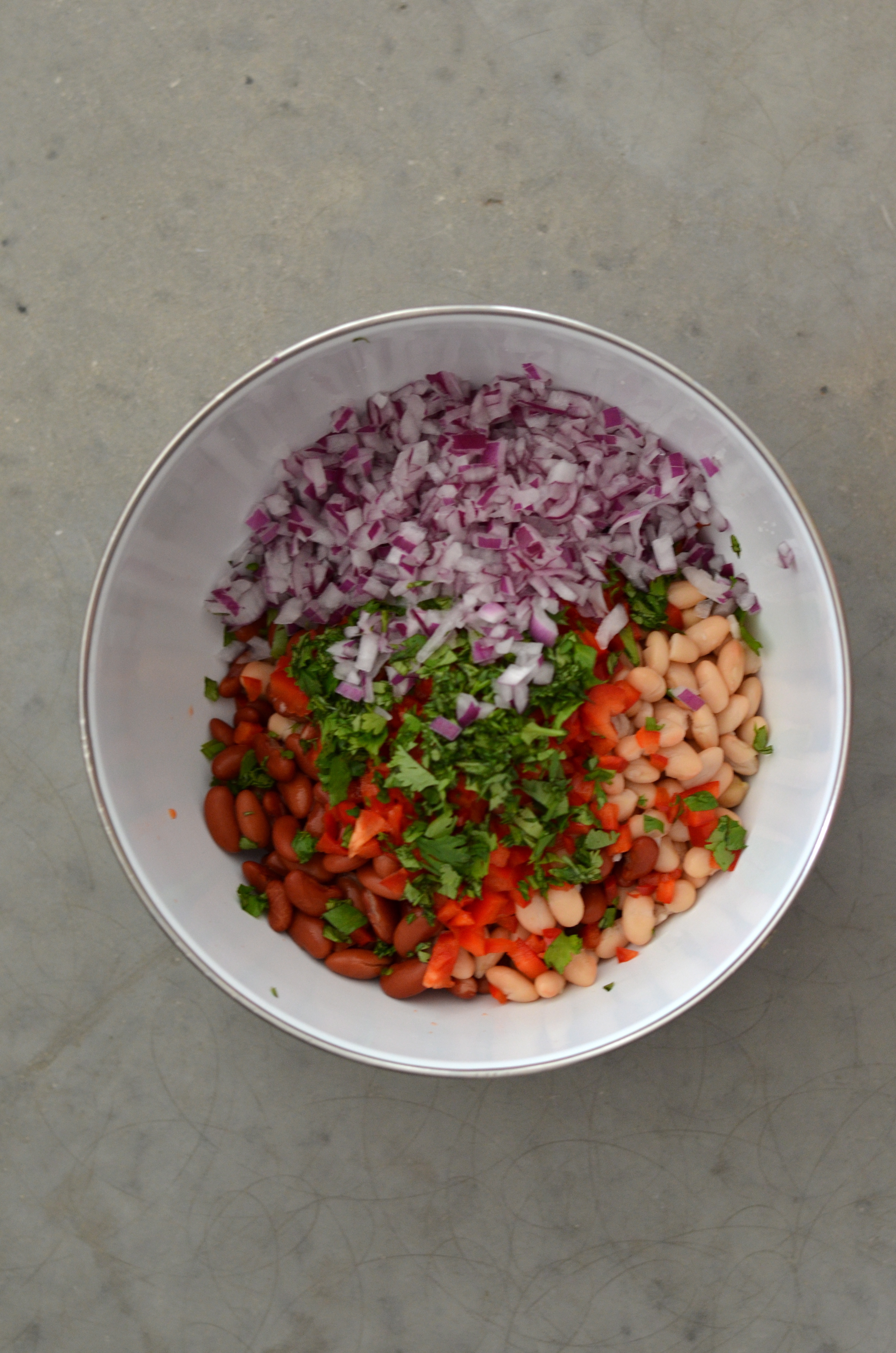 Combine all dressing ingredients and whisk well until combined. Pour over bean mixture and let soak for about 10-30 minutes before serving. Stir well and serve chilled.