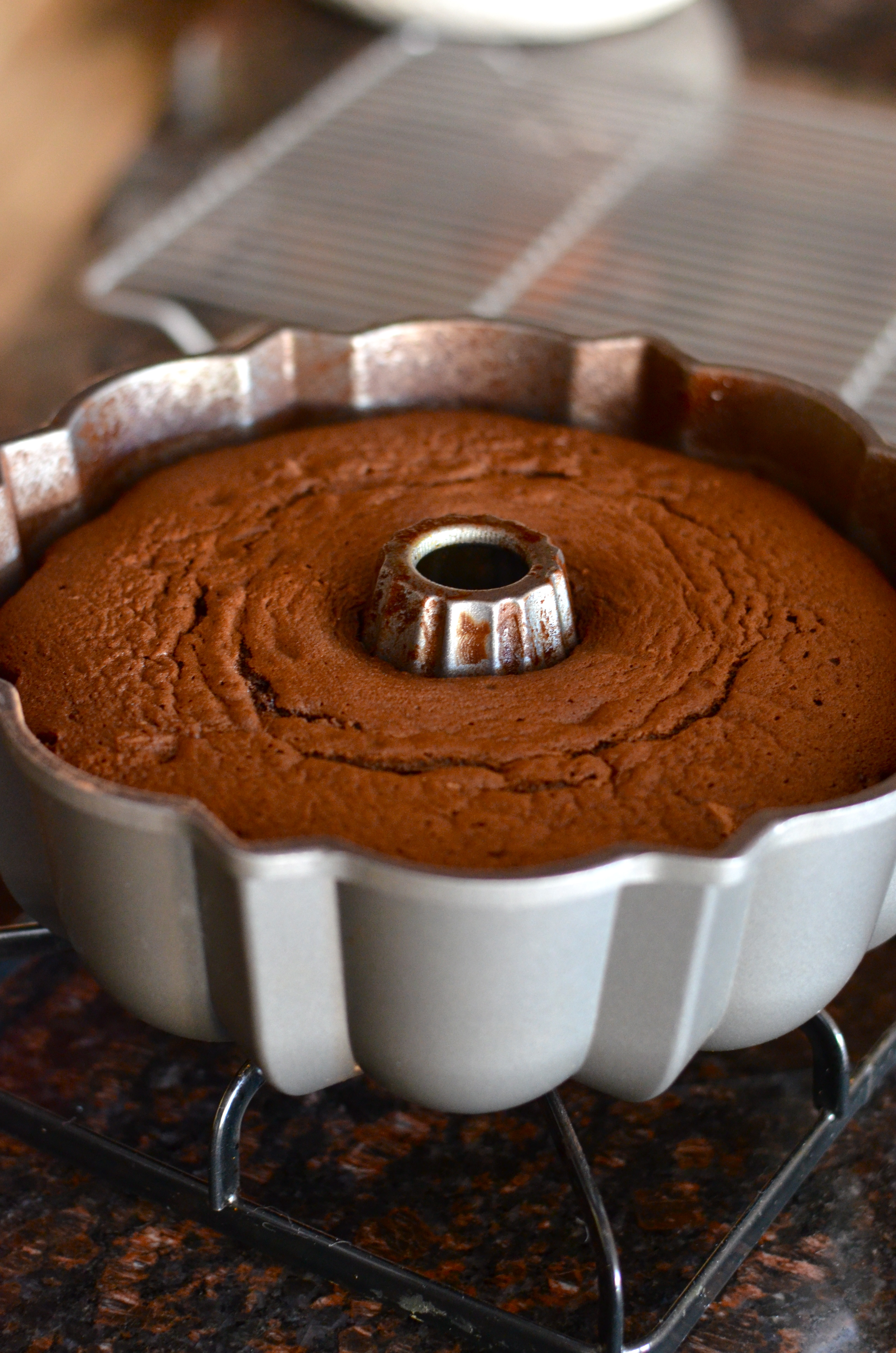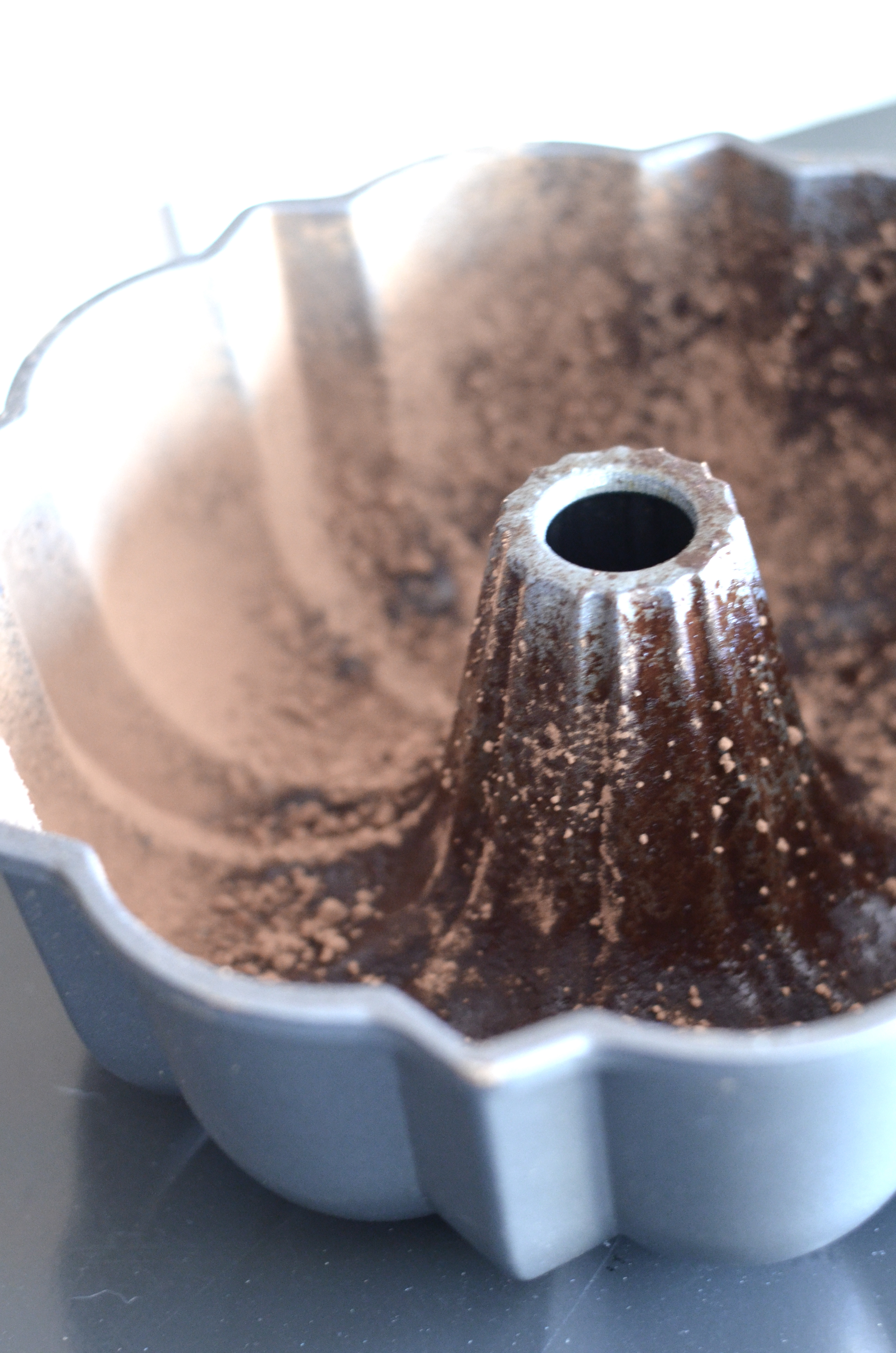 Spray a bundt pan with baking spray and sprinkle with cocoa powder. Set aside.