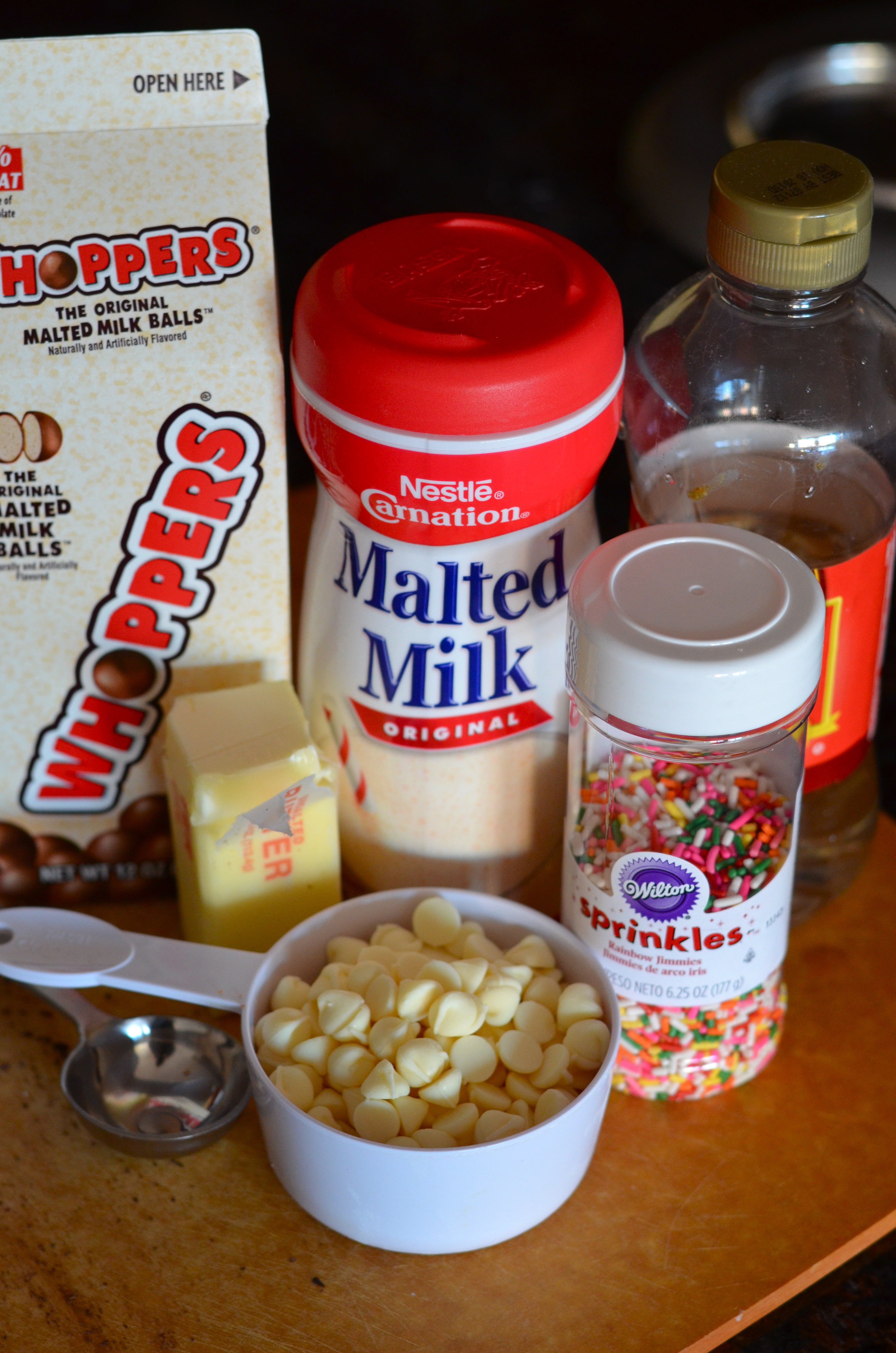 Once everything is cool, pour glaze over cake and top with sliced Whoppers and sprinkles. Serve with a large glass of milk and enjoy!
