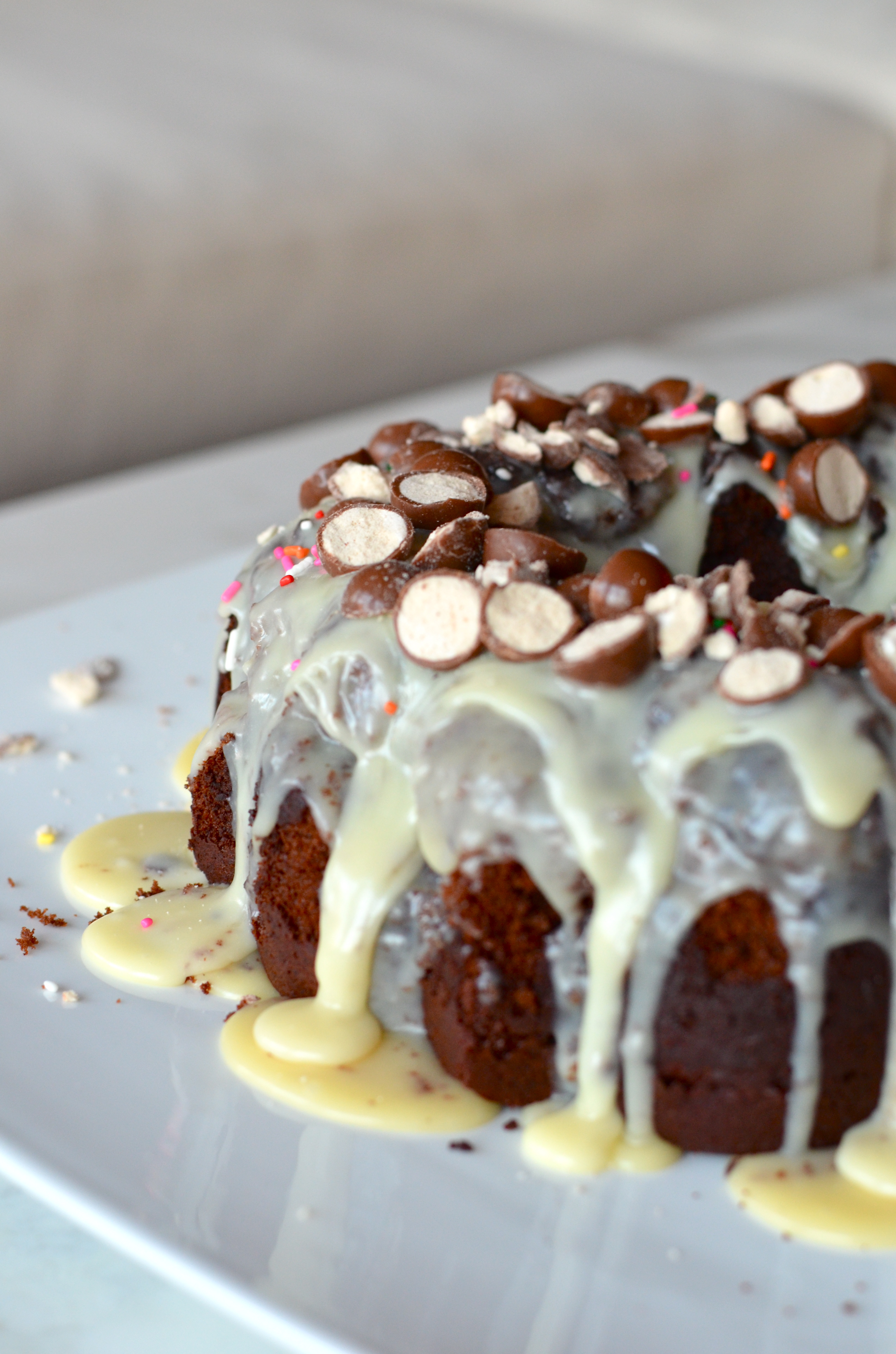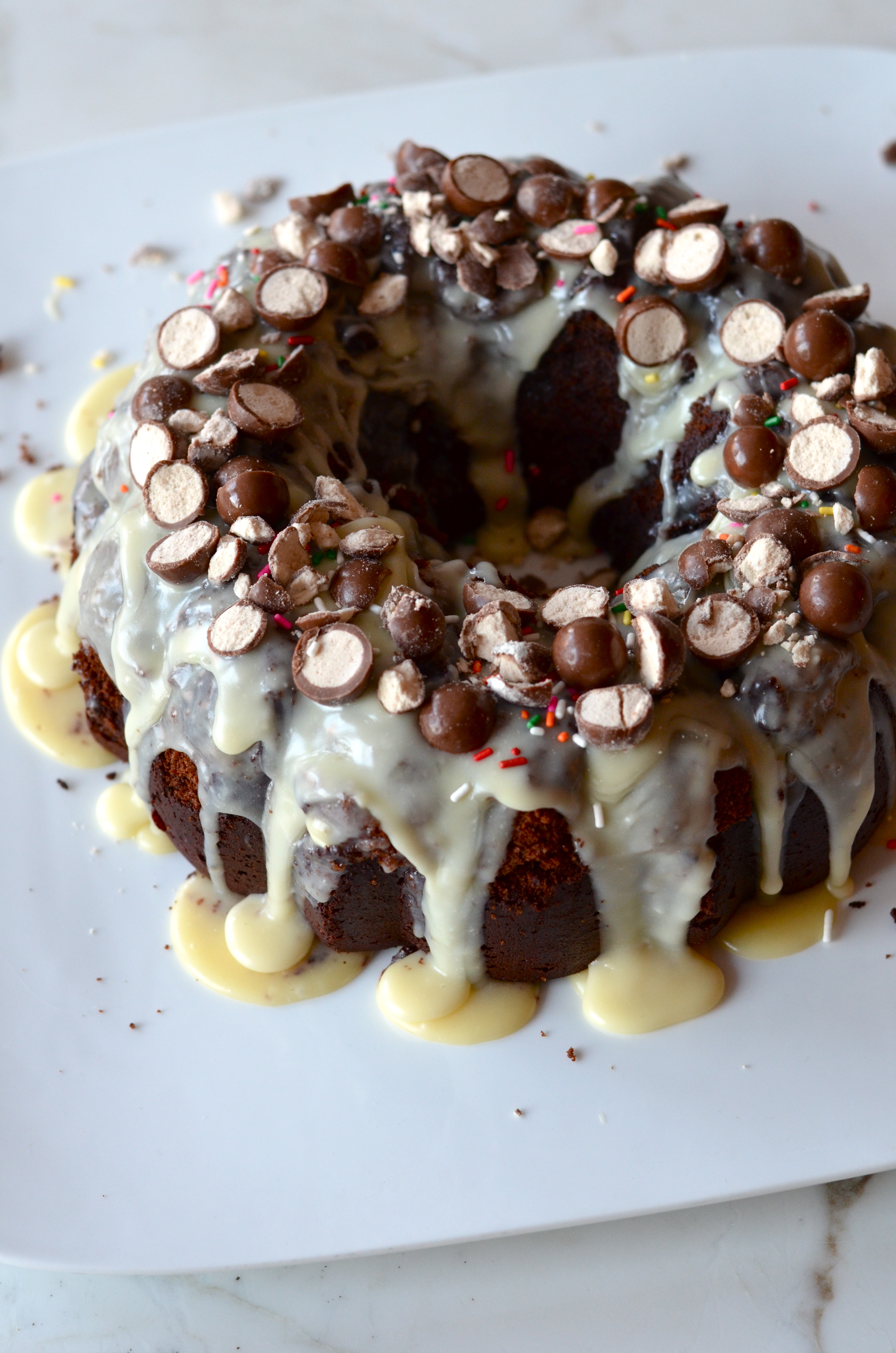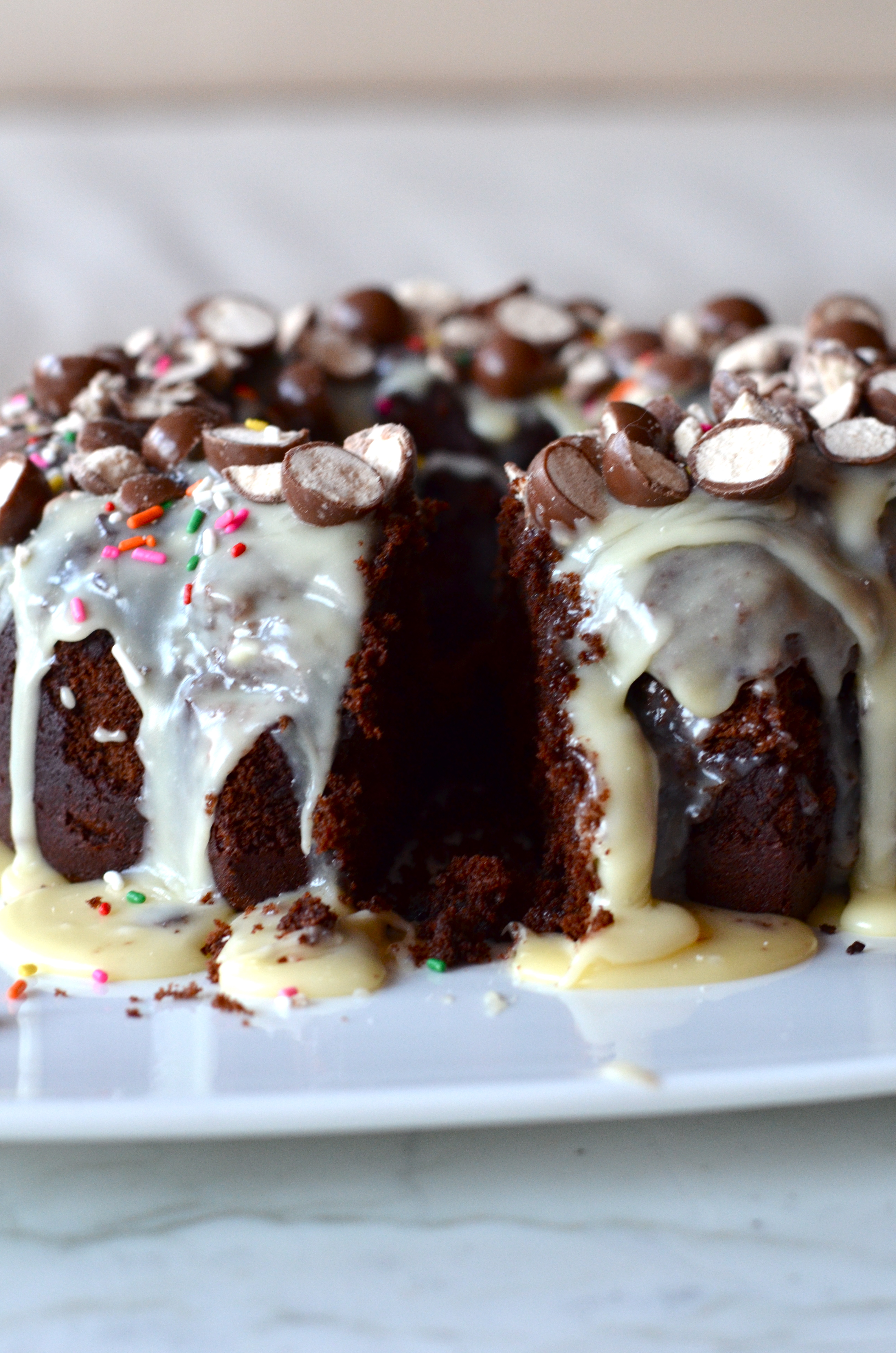 This is a pretty simple cake to make and the chocolate/malt cake is absolutely delicious. Who knew you could add malt powder to batter and glaze? A genius, that’s who. I am so in love. I recommend you make this cake whether you like malt powder or not. It is a light and fluffy chocolate cake but so so moist. Then the crunch from the Whoppers and sprinkles, plus the soft fluffy cake and sweet sticky glaze…I just can’t stop.