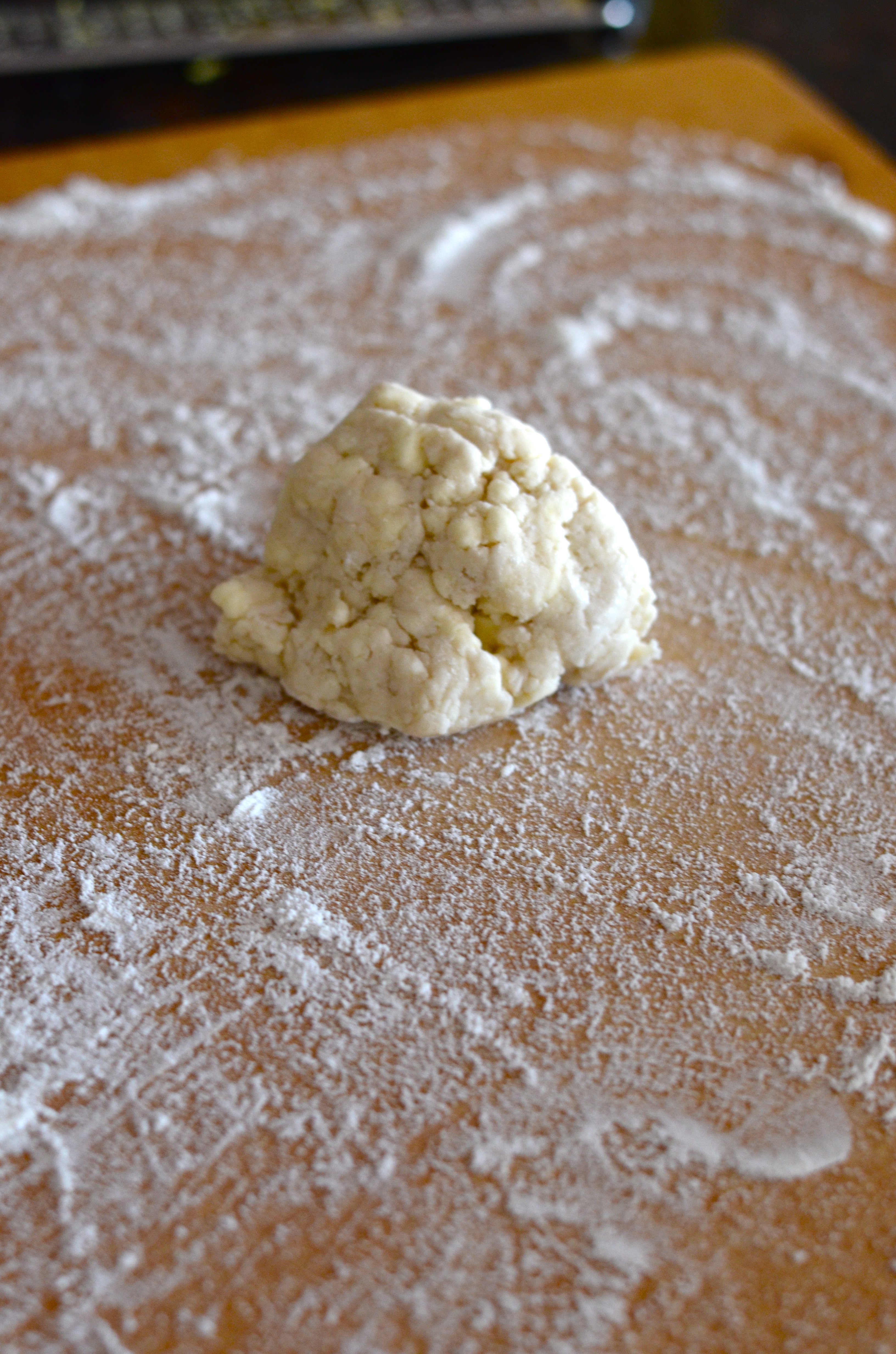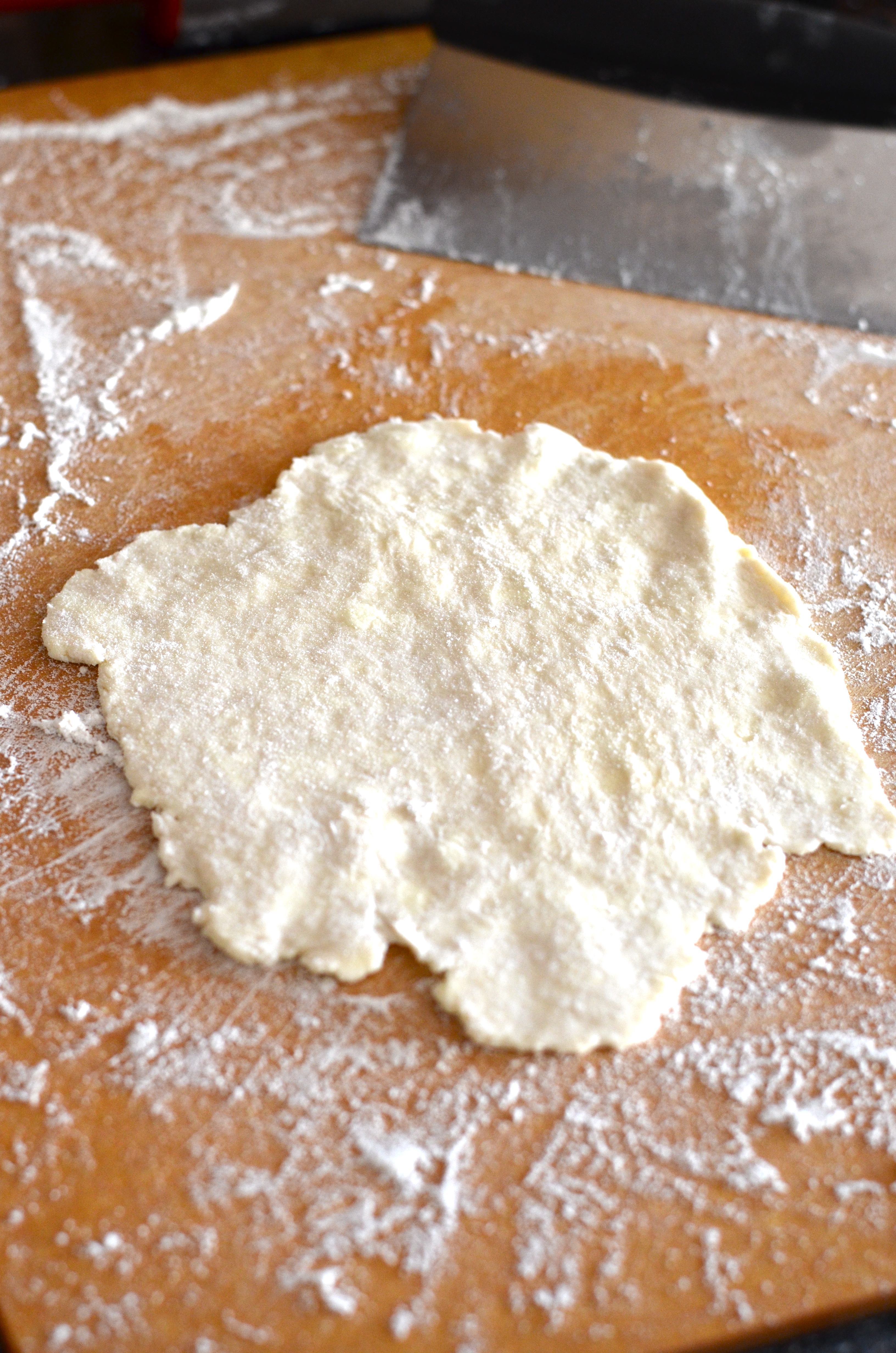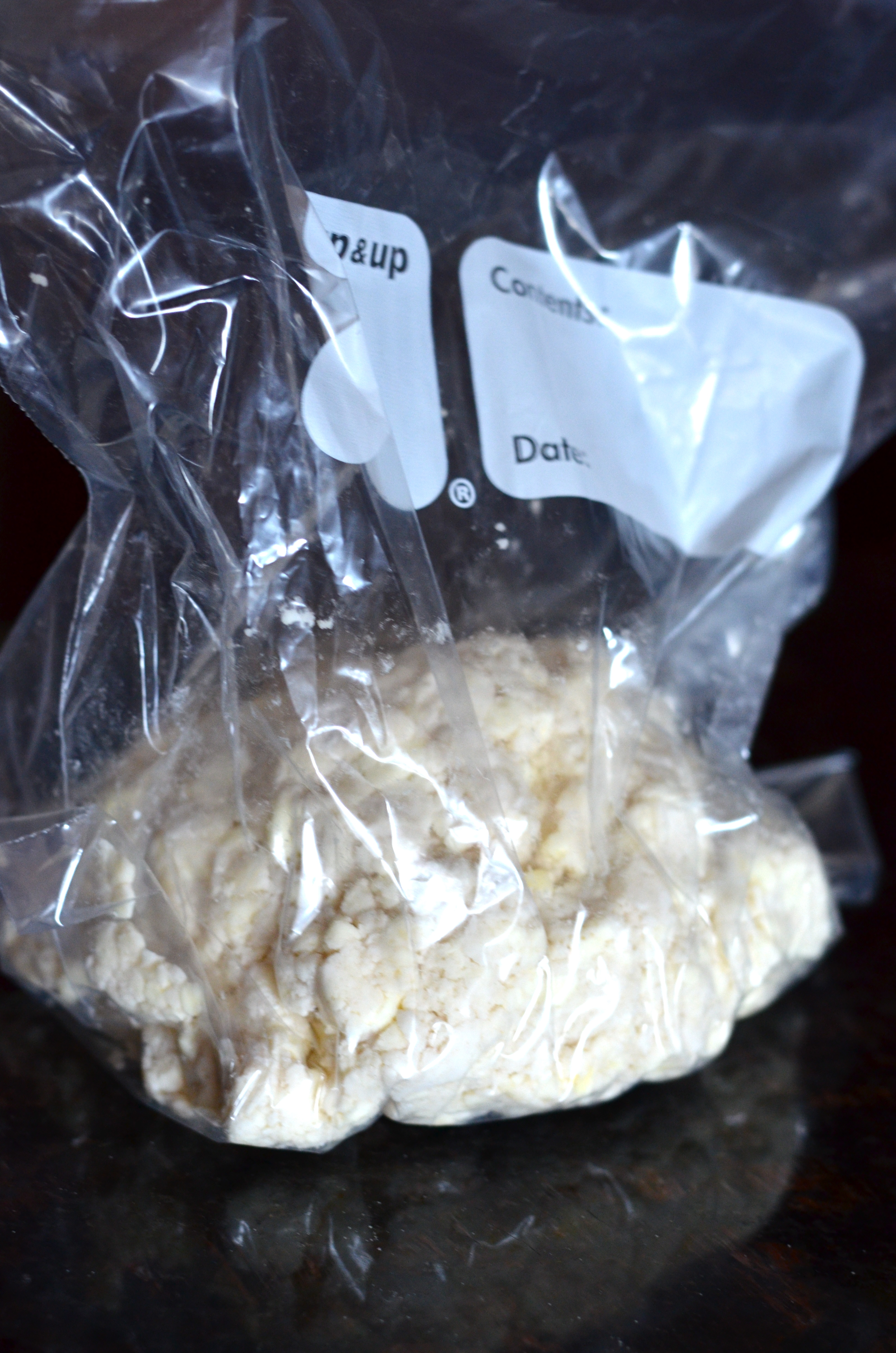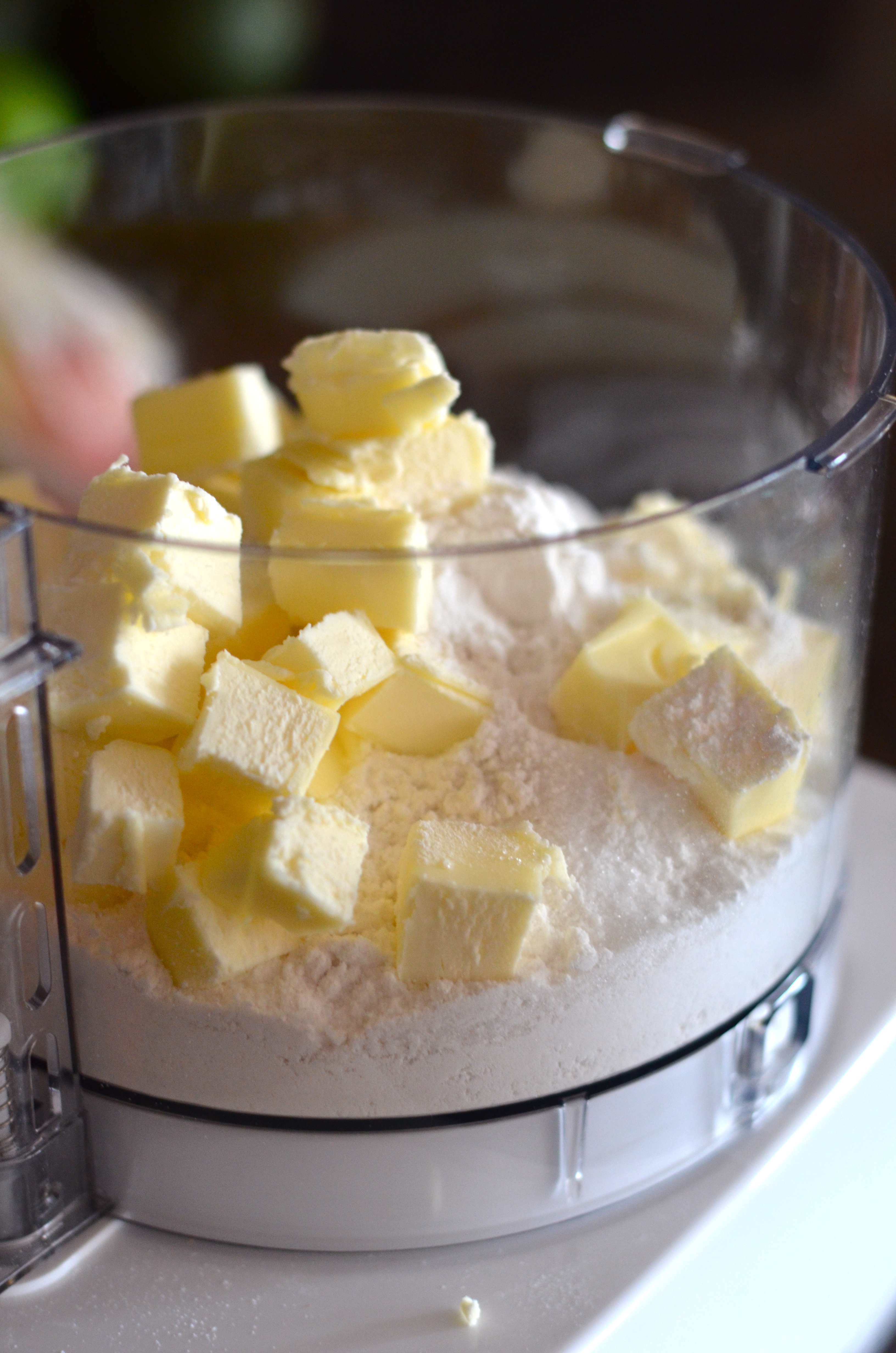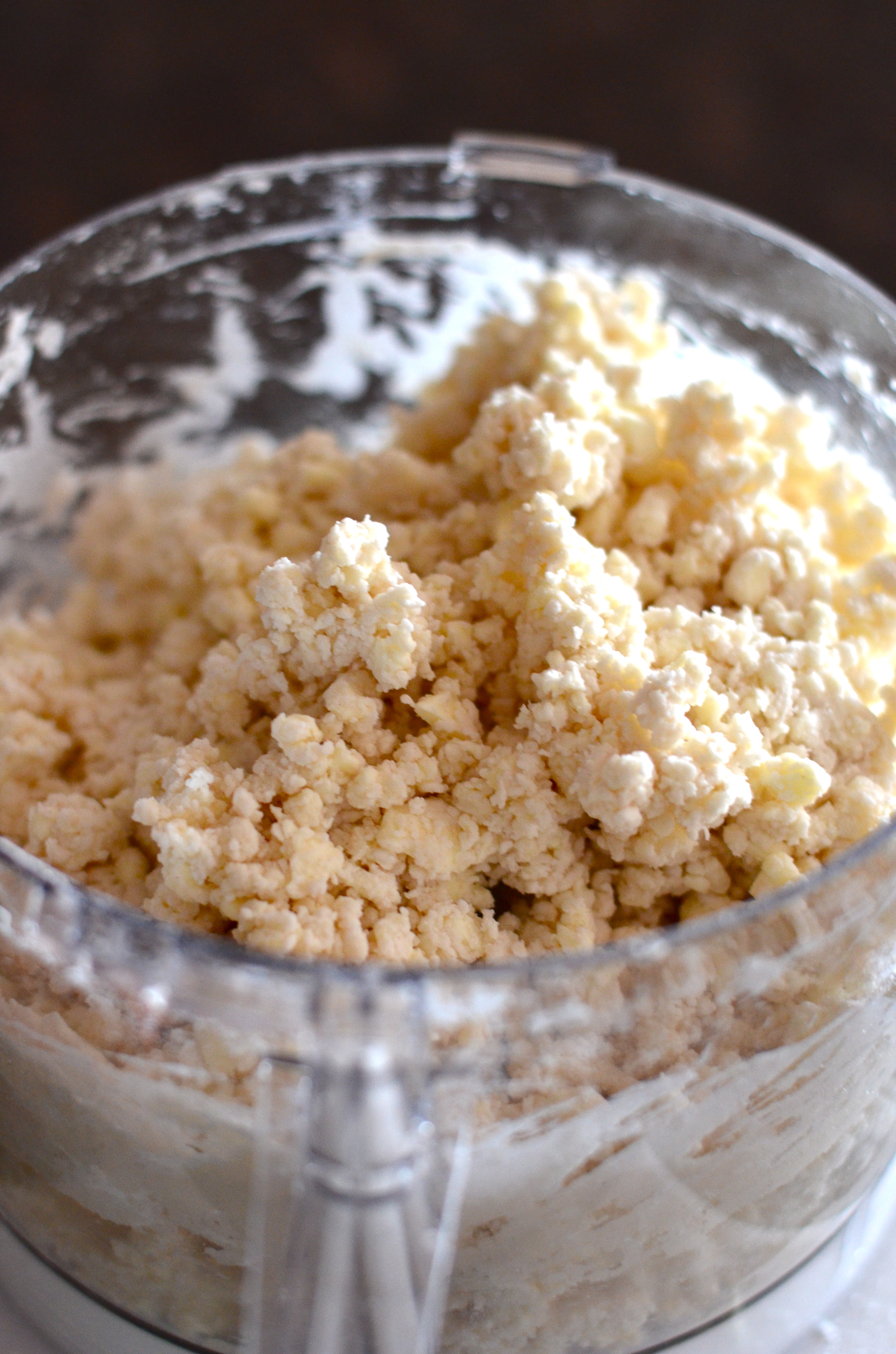 Sprinkle water evenly over butter and flour mixture and process until mixture just comes together (still seeing butter pieces is ok).Β Place the dough in a ziplock bag and place in the refrigerator for at least 30 minutes or up to a day to chill.