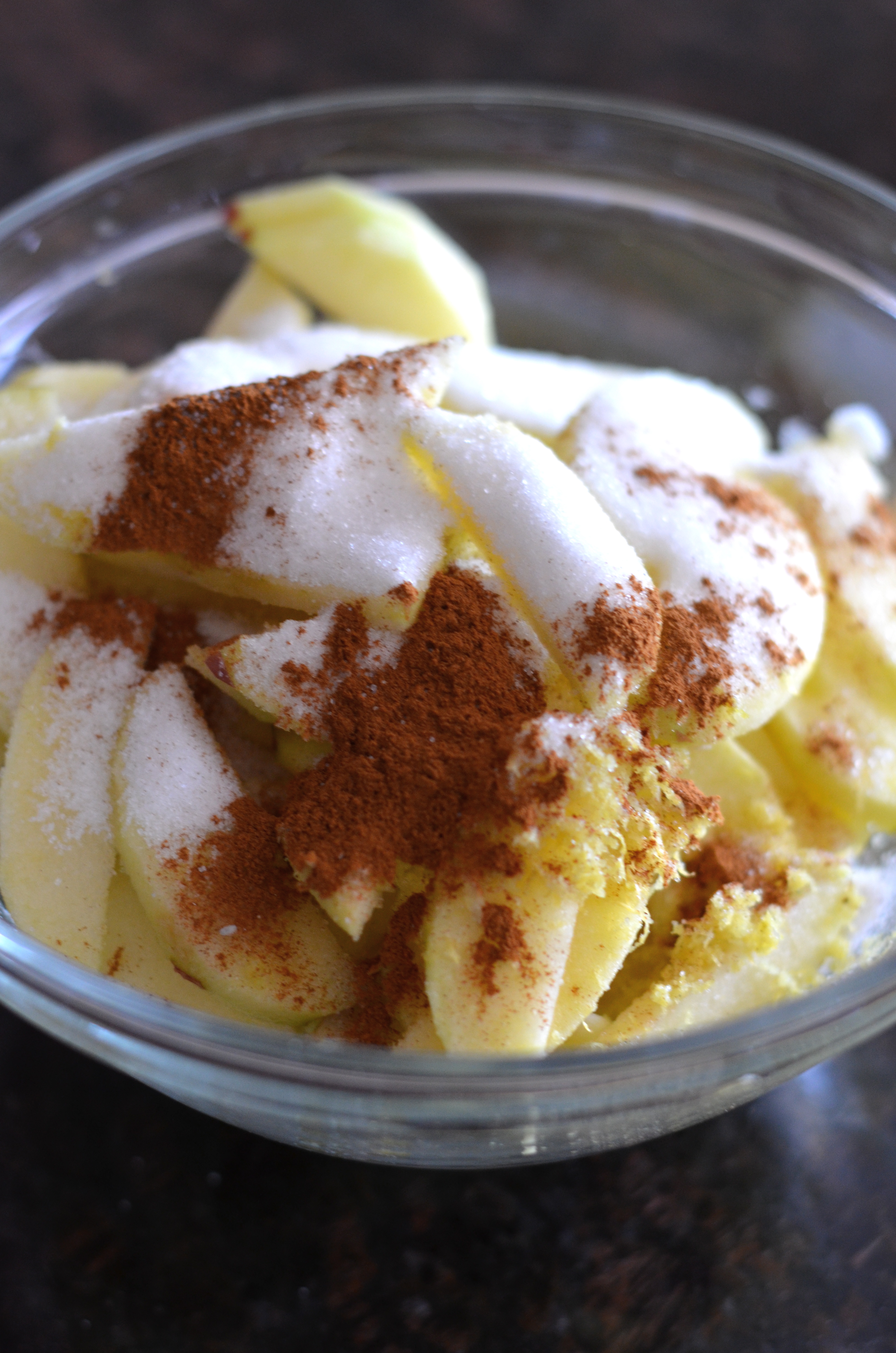 While dough chills, peel and slice apples. In a large bowl, combine apples, lemon zest and juice, sugar, cinnamon and a pinch of salt. Stir gently until apples are coated.