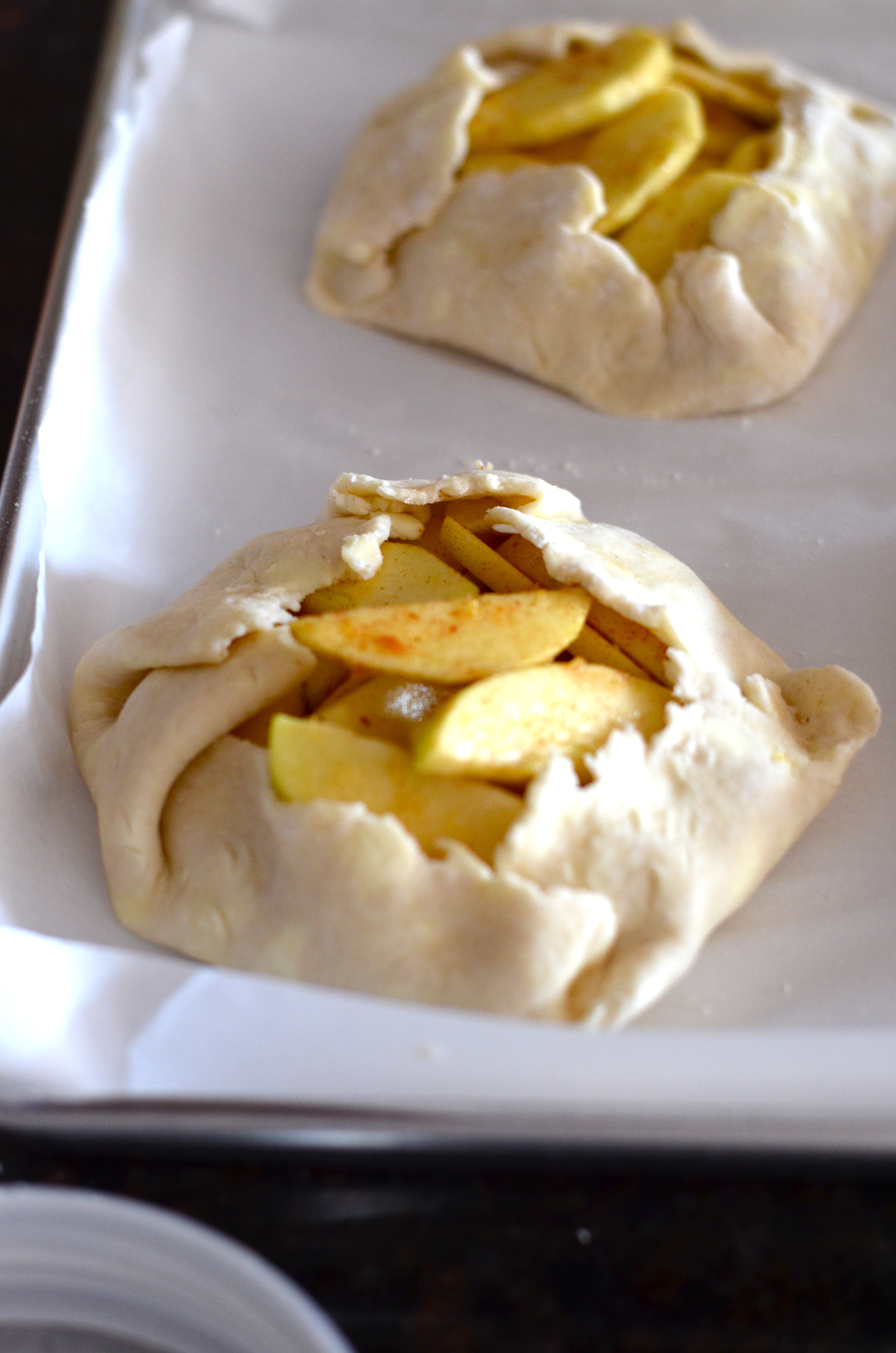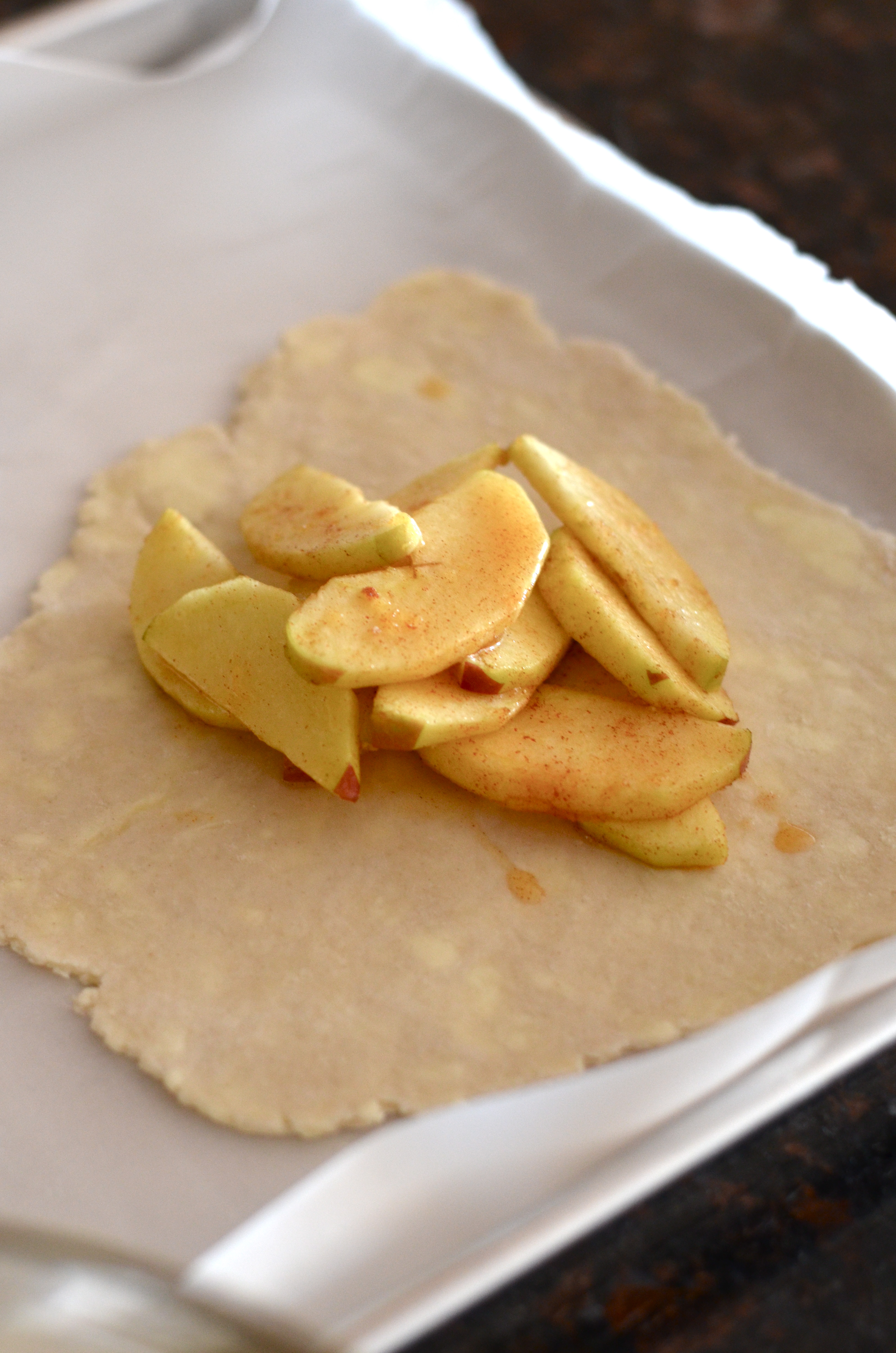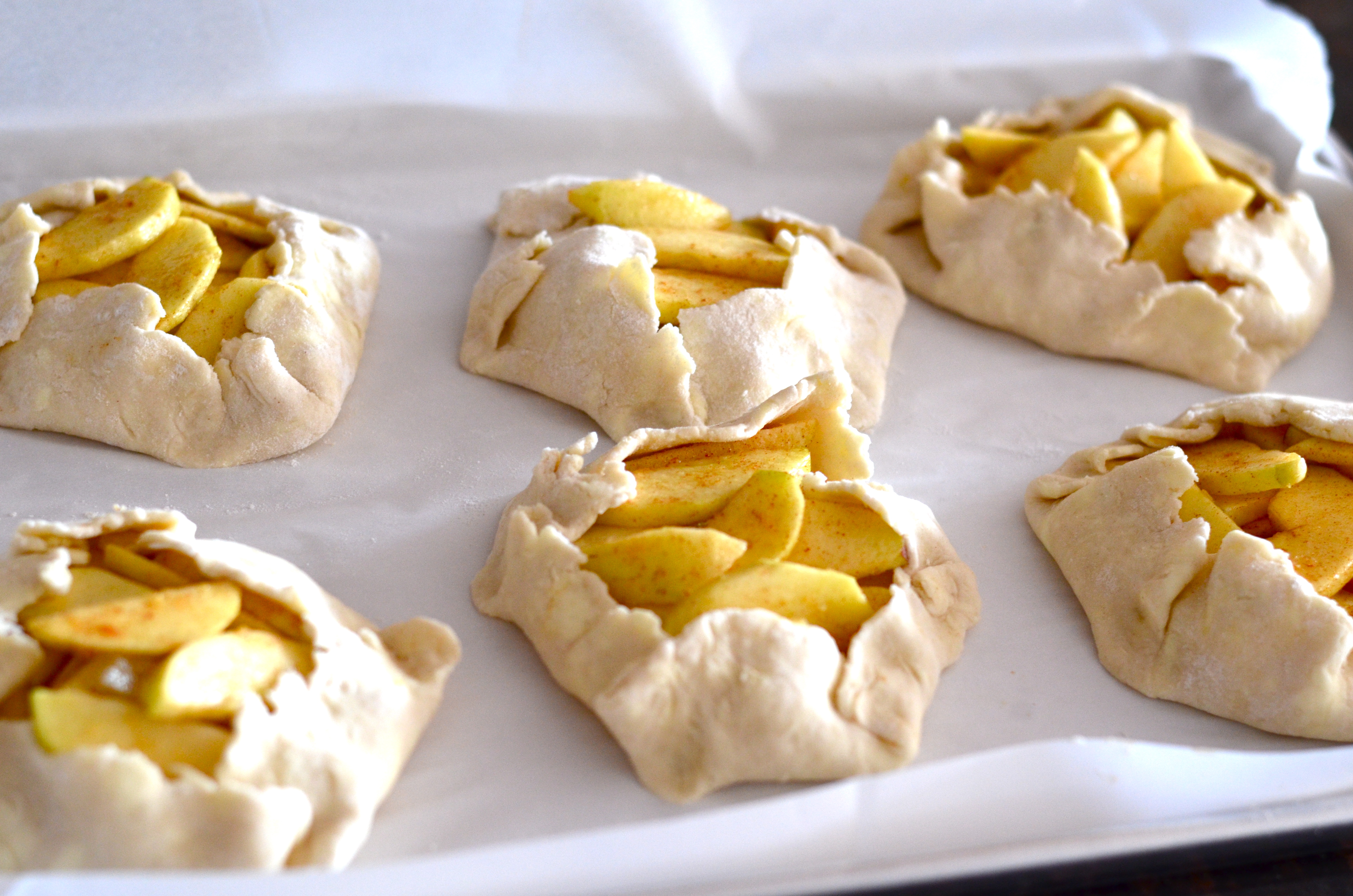 Line a baking sheet with parchment . Cut dough into 6 even pieces and roll them out, one at a time on a floured surface (about 1/8 inch thick). Transfer to baking sheet and fill with apples, leaving about 1 inch around the border uncovered.
