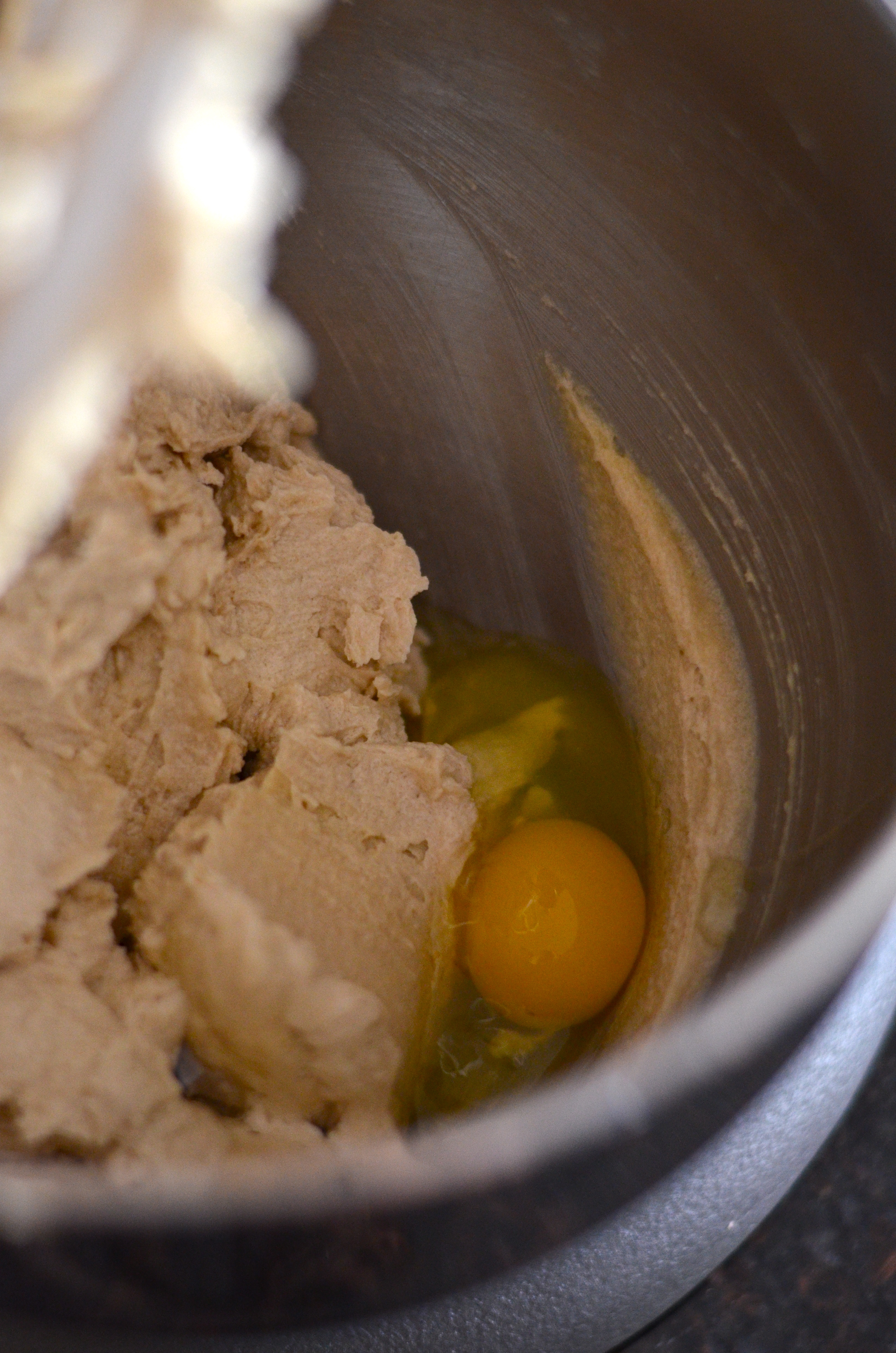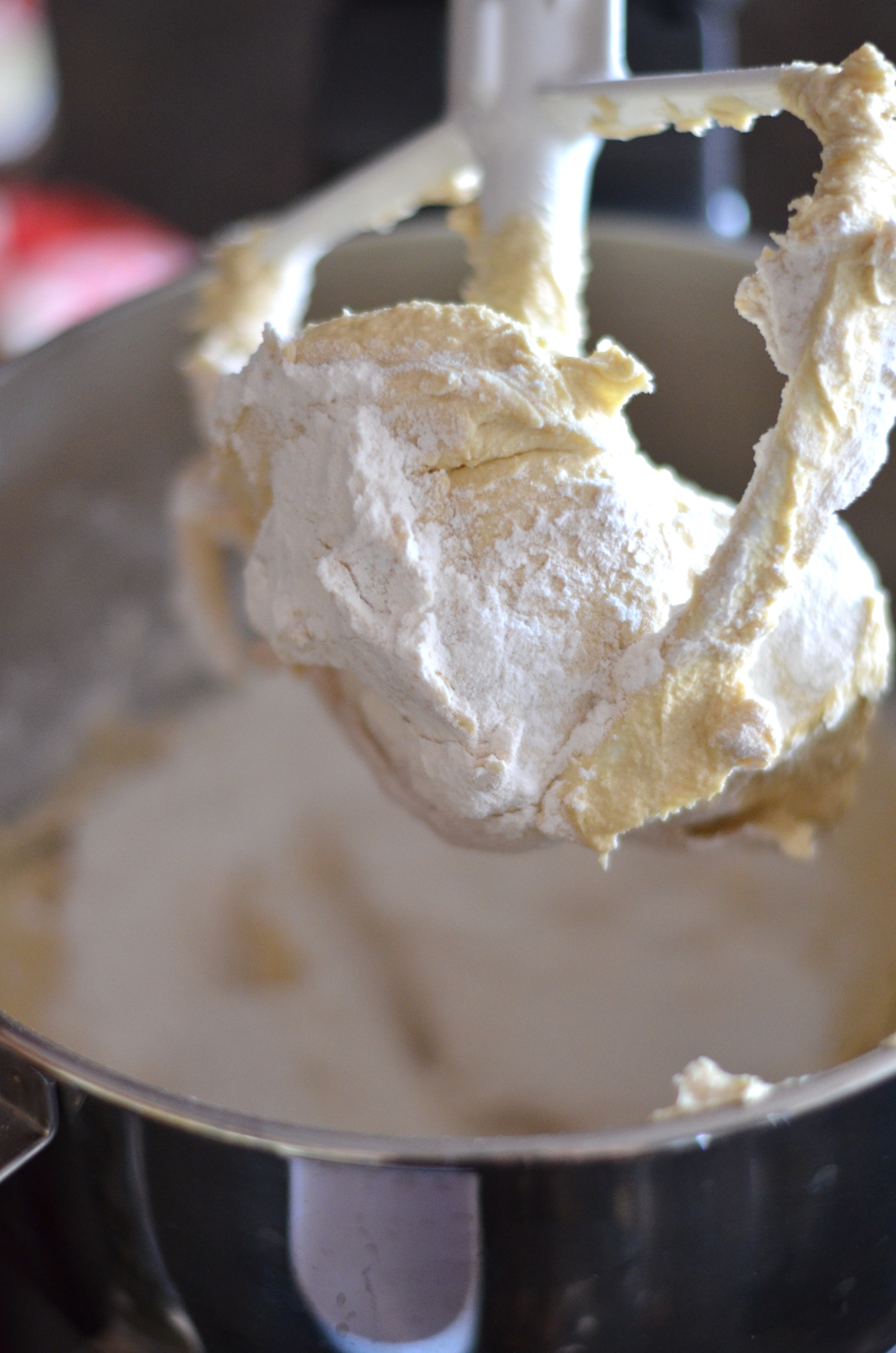 Slowly add flour mixture, scraping down sides as needed.