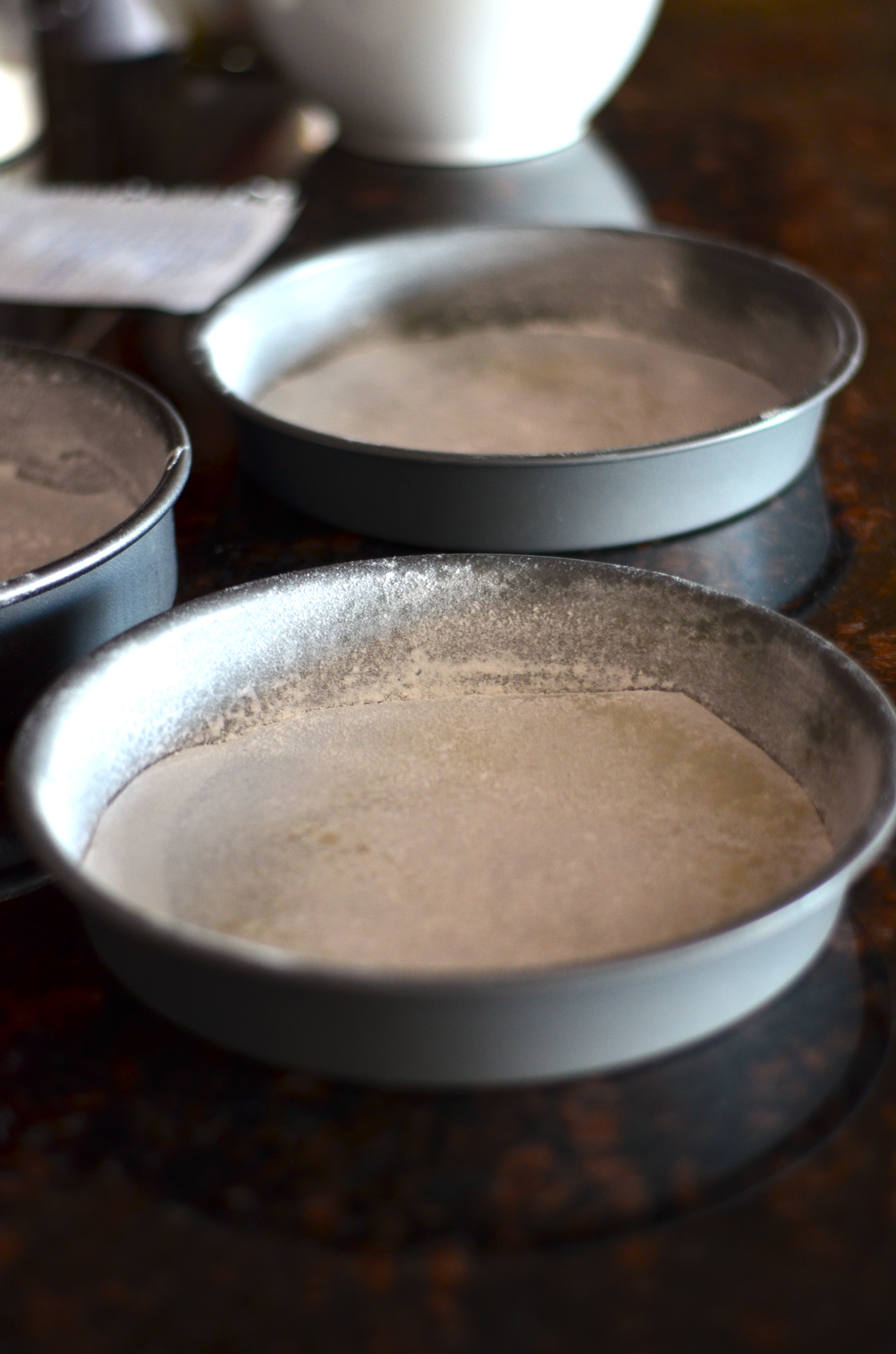 Preheat oven to 350 Degrees. Grease three 8-inch round cake pans and line bottoms with parchment paper, flour sides and set aside.