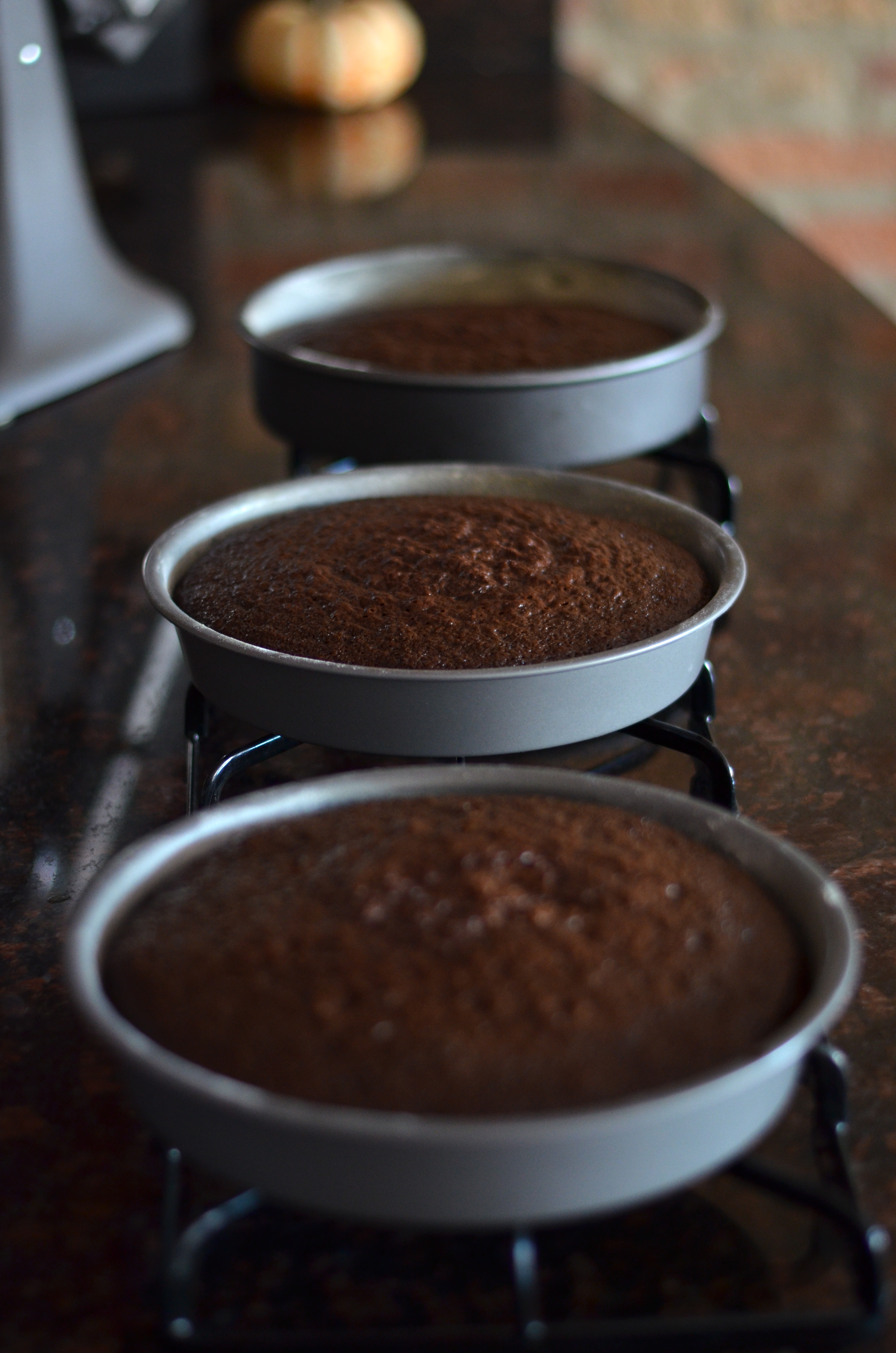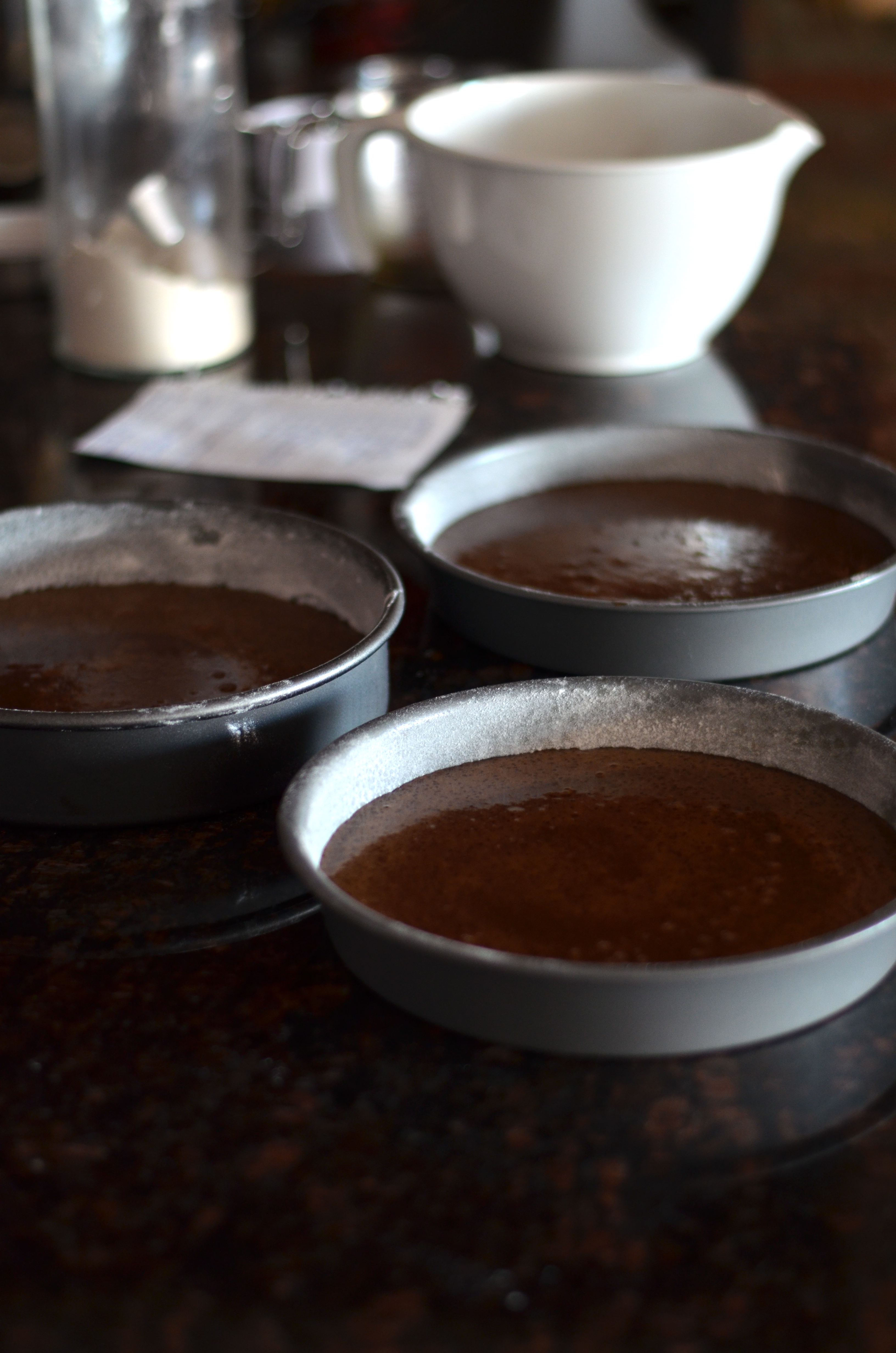 Divide batter evenly between three cake pans and bake for 20 minutes. Rotate pans after 20 minutes and continue to bake for about 12 more minutes or until a toothpick inserted into the center comes out clean.