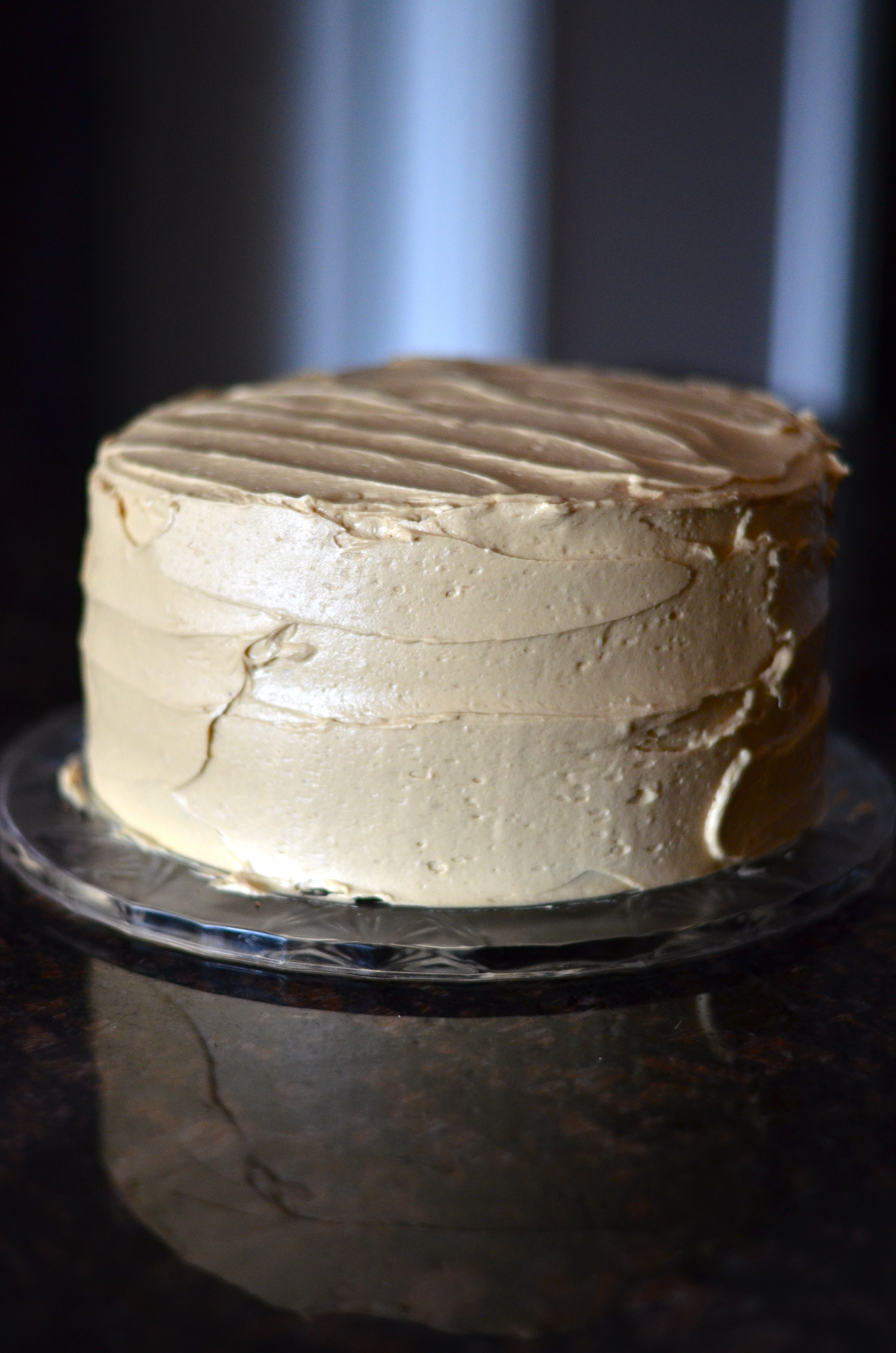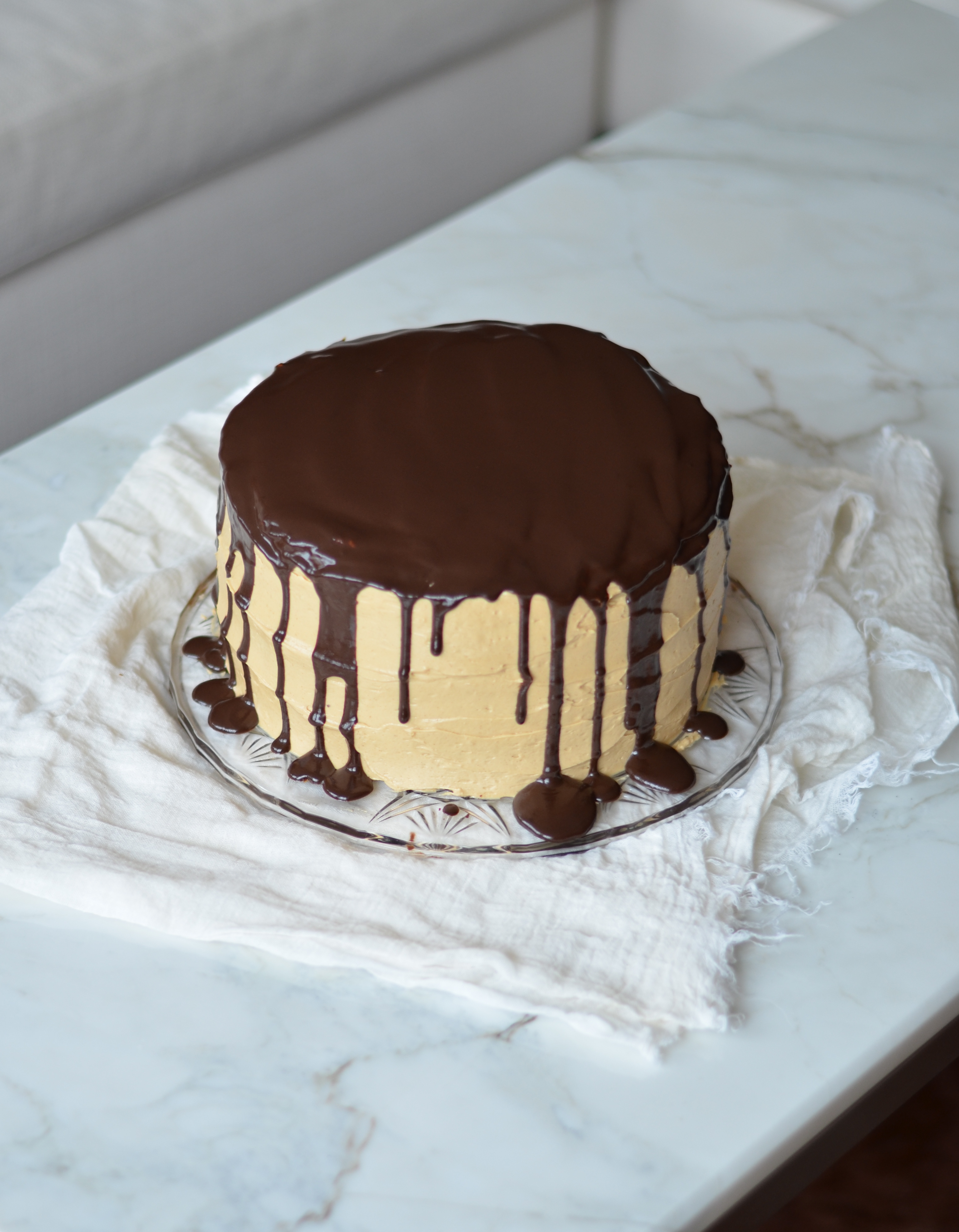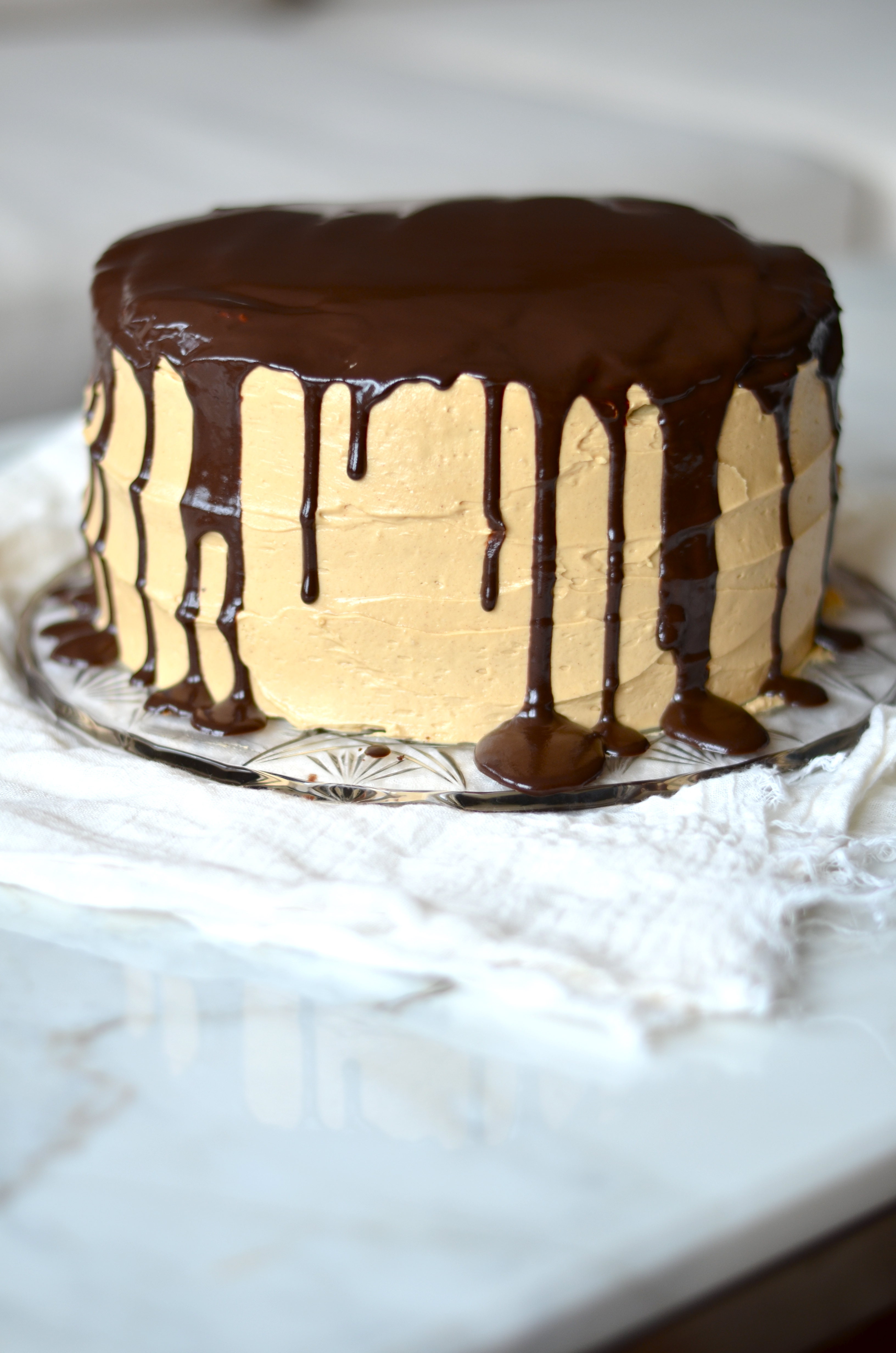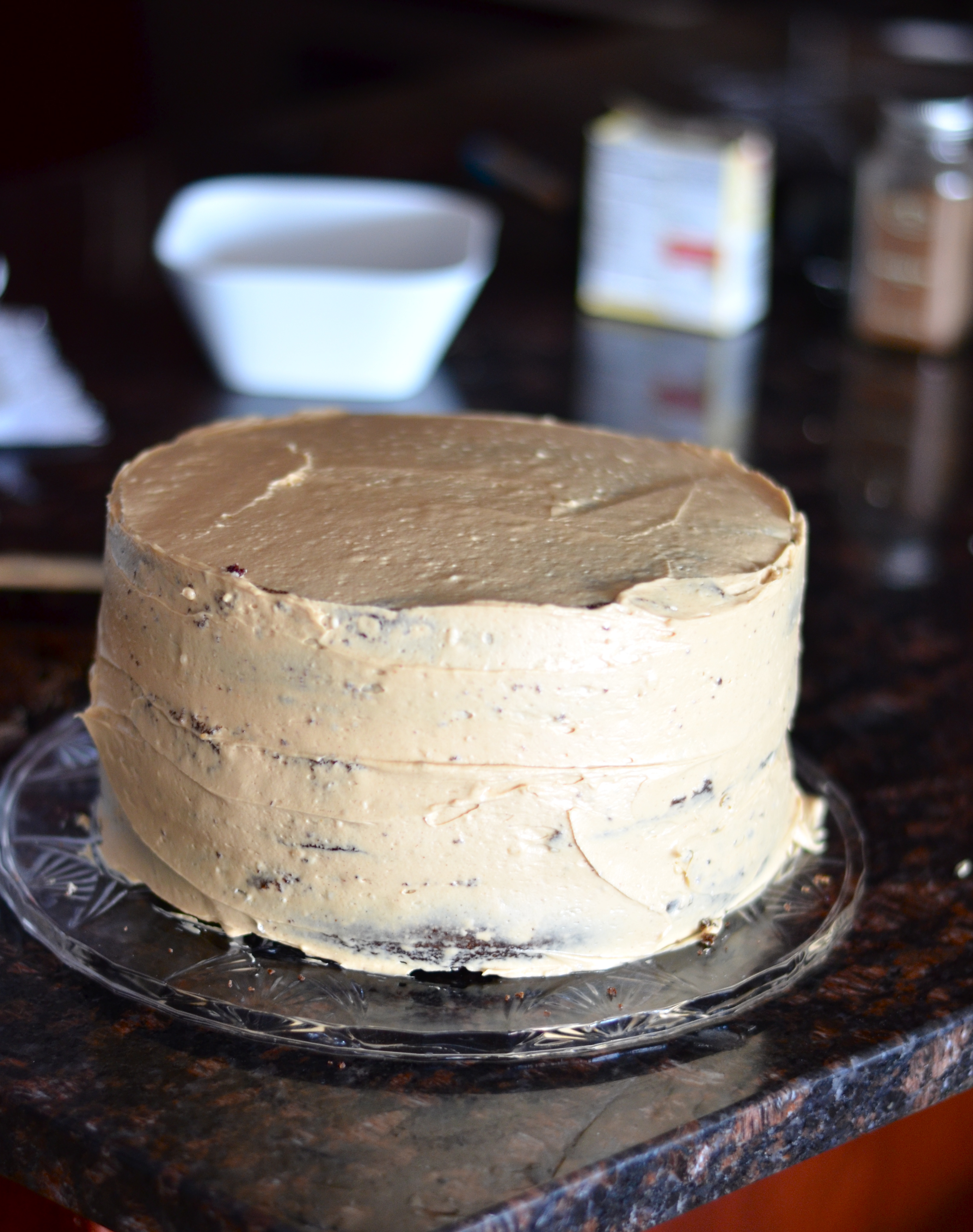 Once the cakes have cooled you can begin the assembly. Place one cake on your desired cake plant and level off any dome shape the cake may have. Place about 1 cup of frosting on the cake and spread evenly up to the edges. Place the next layer on top and repeat with about 1 cup of frosting. Add the final cake and make sure that the sides and top are even. Use a serrated knife to even out any uneven layers or the top of the cake. Use about a cup of frosting on the top of the cake and then evenly spread a super thin layer of frosting on the sides of the cake. I call the first layer my “crumb layer” Don’t worry about crumbs. Once fully frosted with a thin layer, place in the refrigerator for about 20 minutes to let the frosting harden on the cake. Remove and finish frosting with the rest of your peanut butter frosting. Place in the refrigerator for at least 1 hour to set.