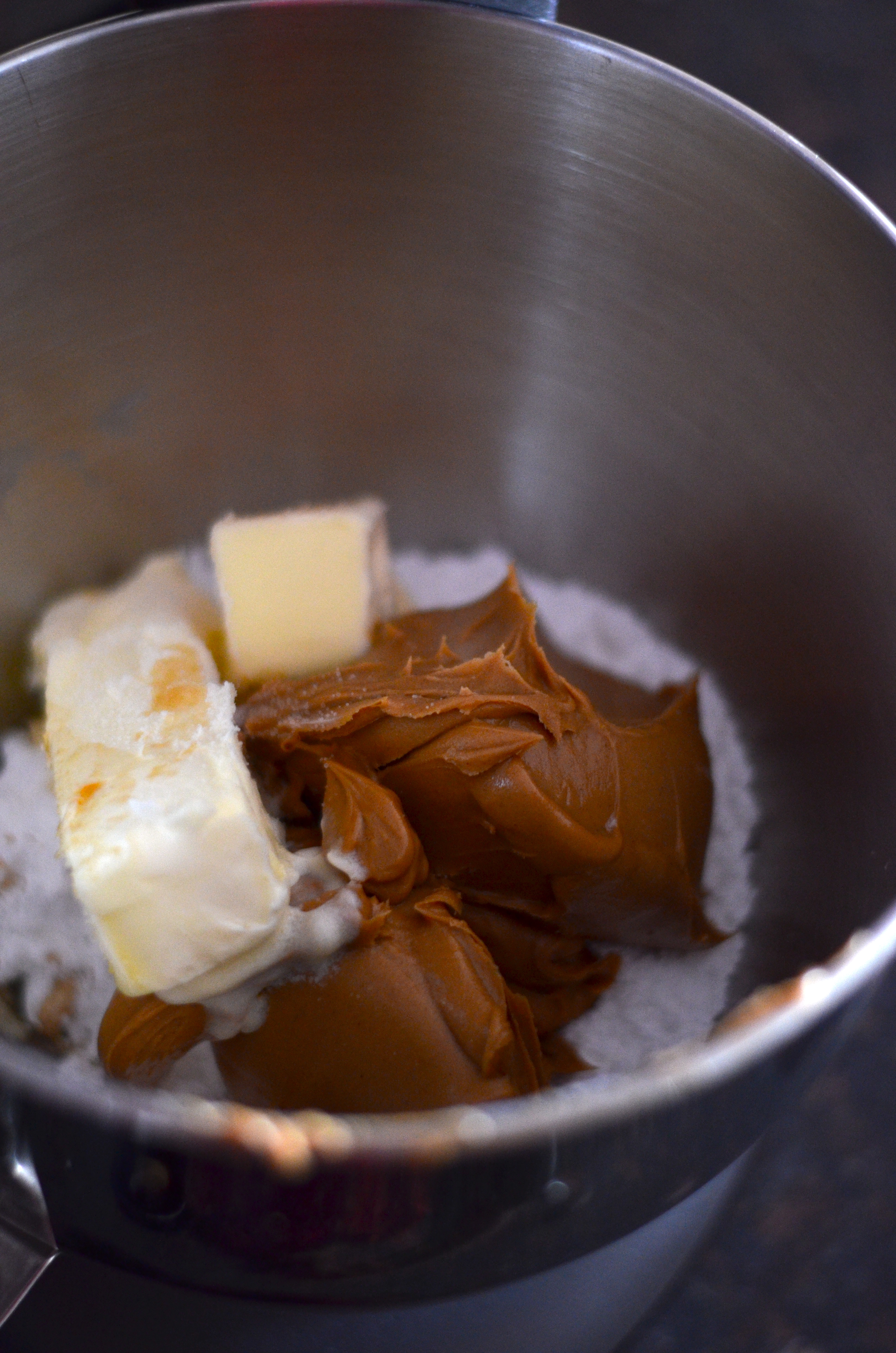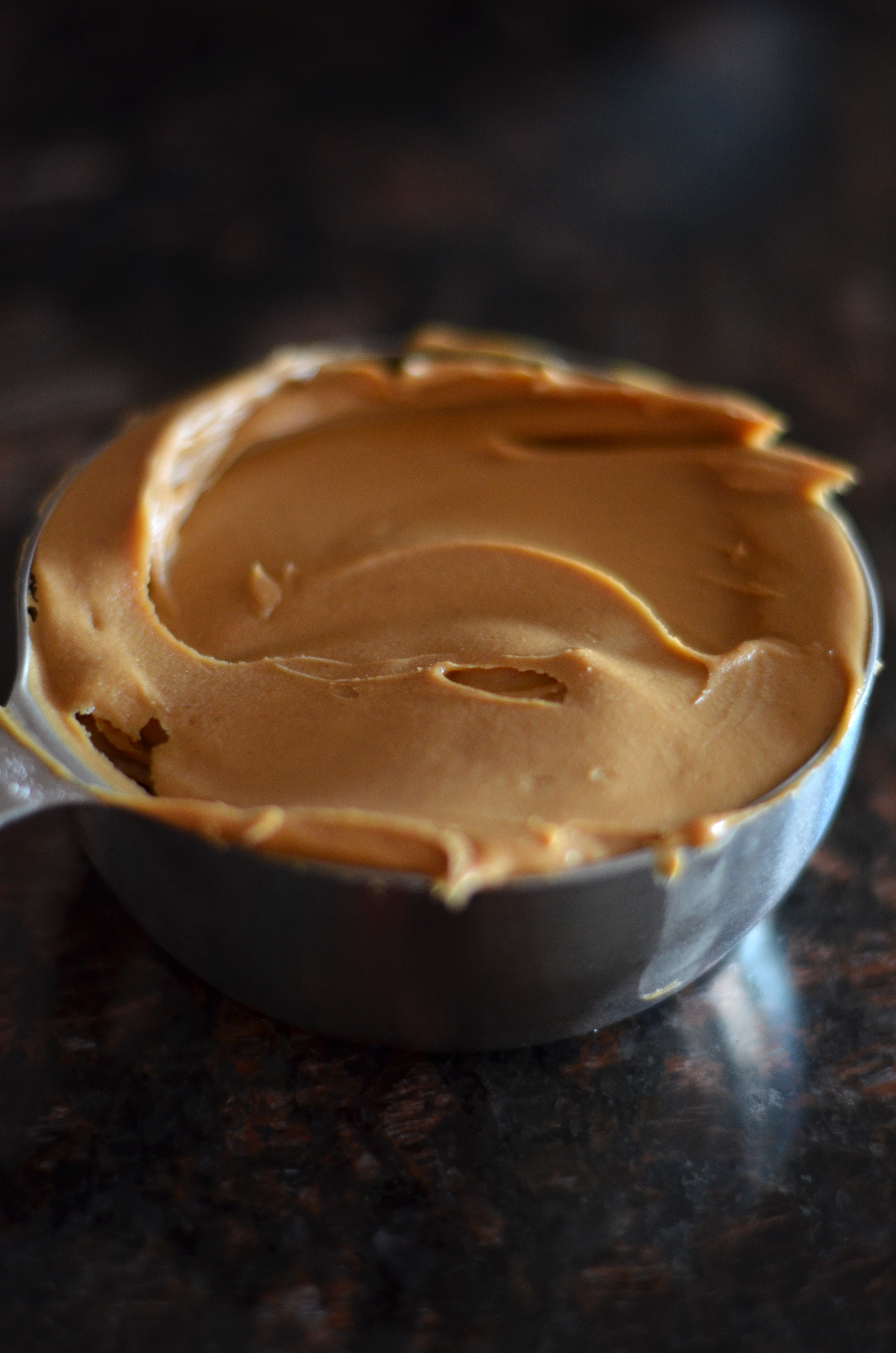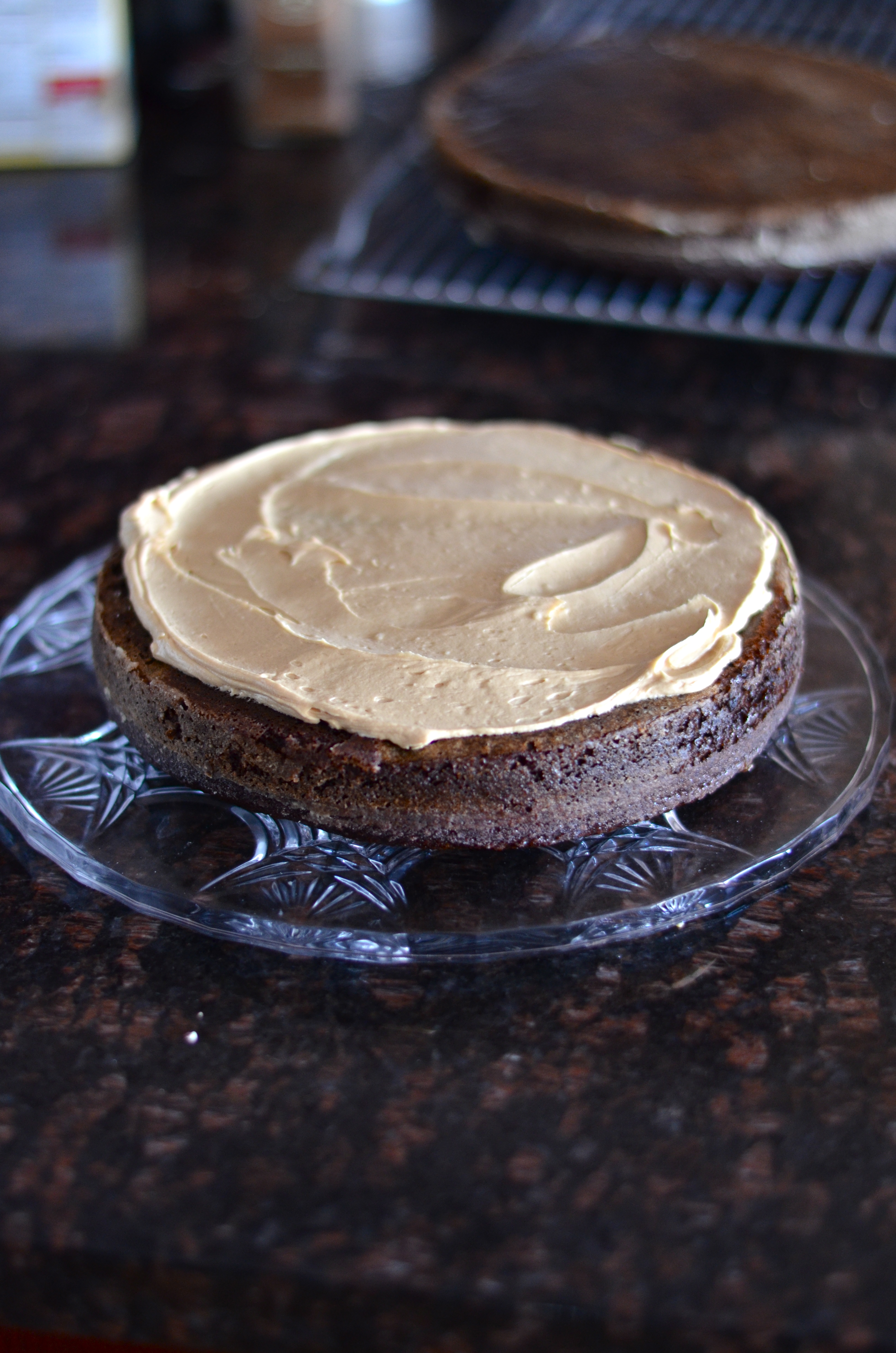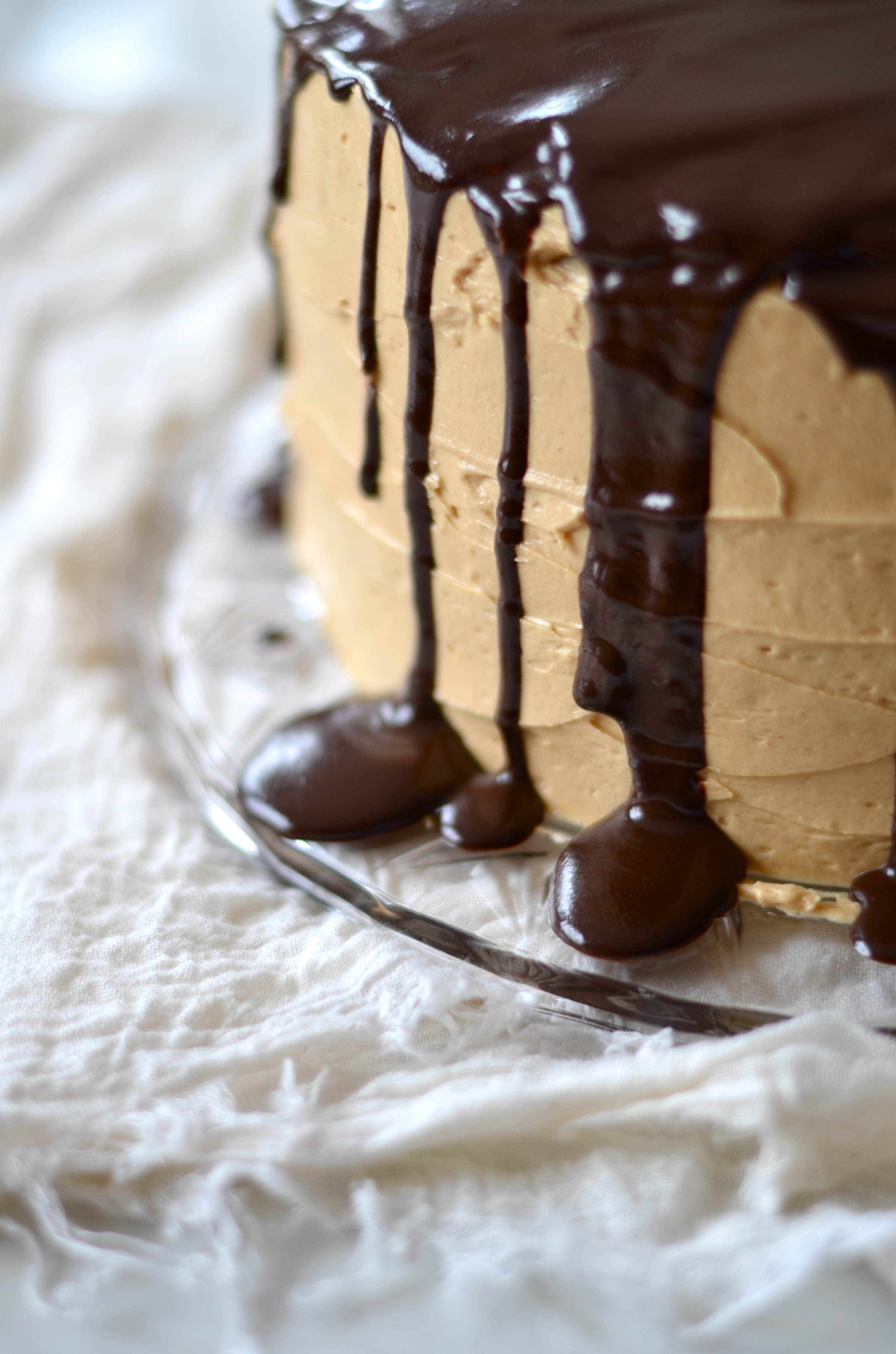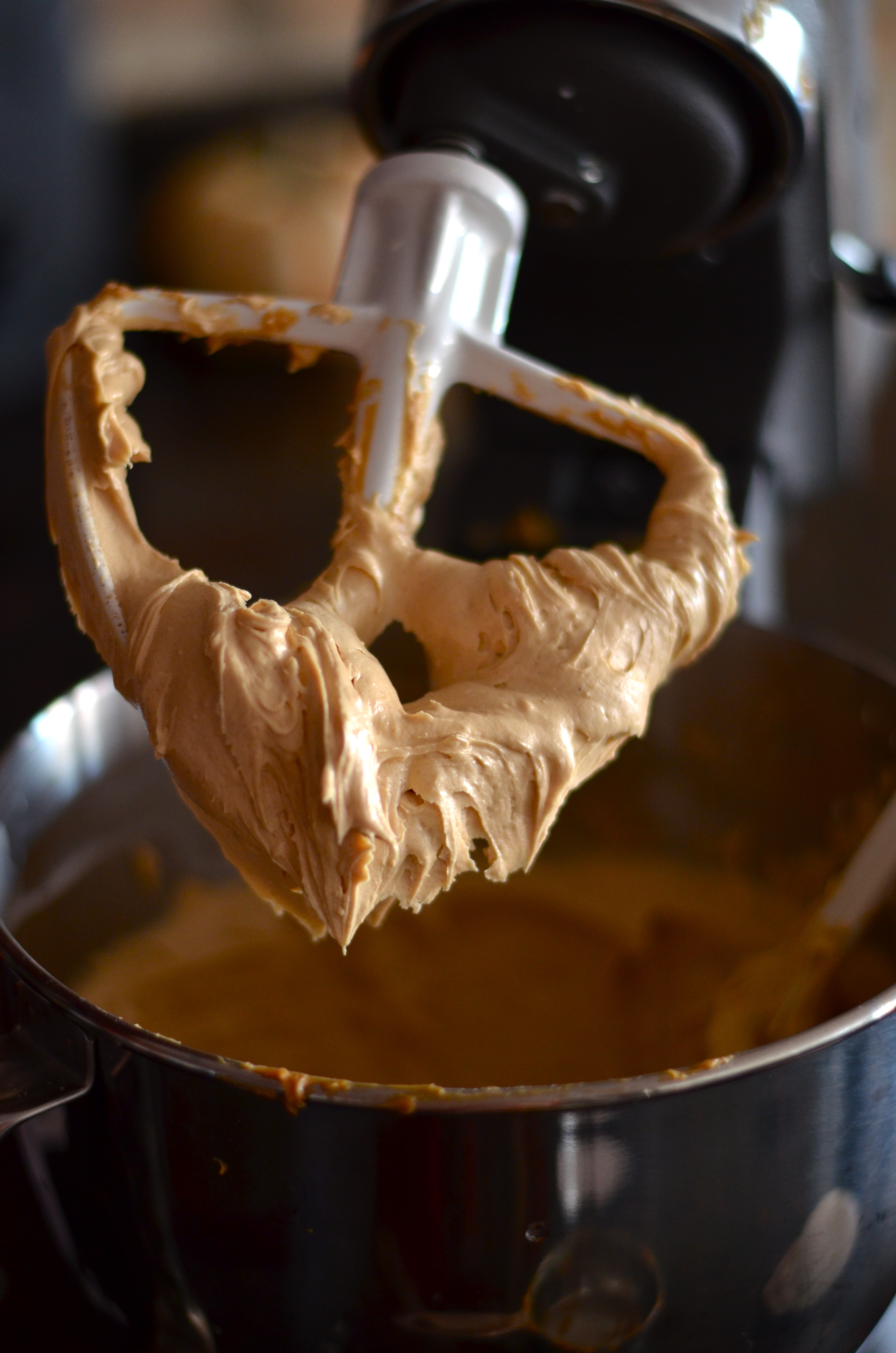 Once the cakes have cooled you can begin the assembly. Place one cake on your desired cake plant and level off any dome shape the cake may have. Place about 1 cup of frosting on the cake and spread evenly up to the edges. Place the next layer on top and repeat with about 1 cup of frosting. Add the final cake and make sure that the sides and top are even. Use a serrated knife to even out any uneven layers or the top of the cake. Use about a cup of frosting on the top of the cake and then evenly spread a super thin layer of frosting on the sides of the cake. I call the first layer my “crumb layer” Don’t worry about crumbs. Once fully frosted with a thin layer, place in the refrigerator for about 20 minutes to let the frosting harden on the cake. Remove and finish frosting with the rest of your peanut butter frosting. Place in the refrigerator for at least 1 hour to set.