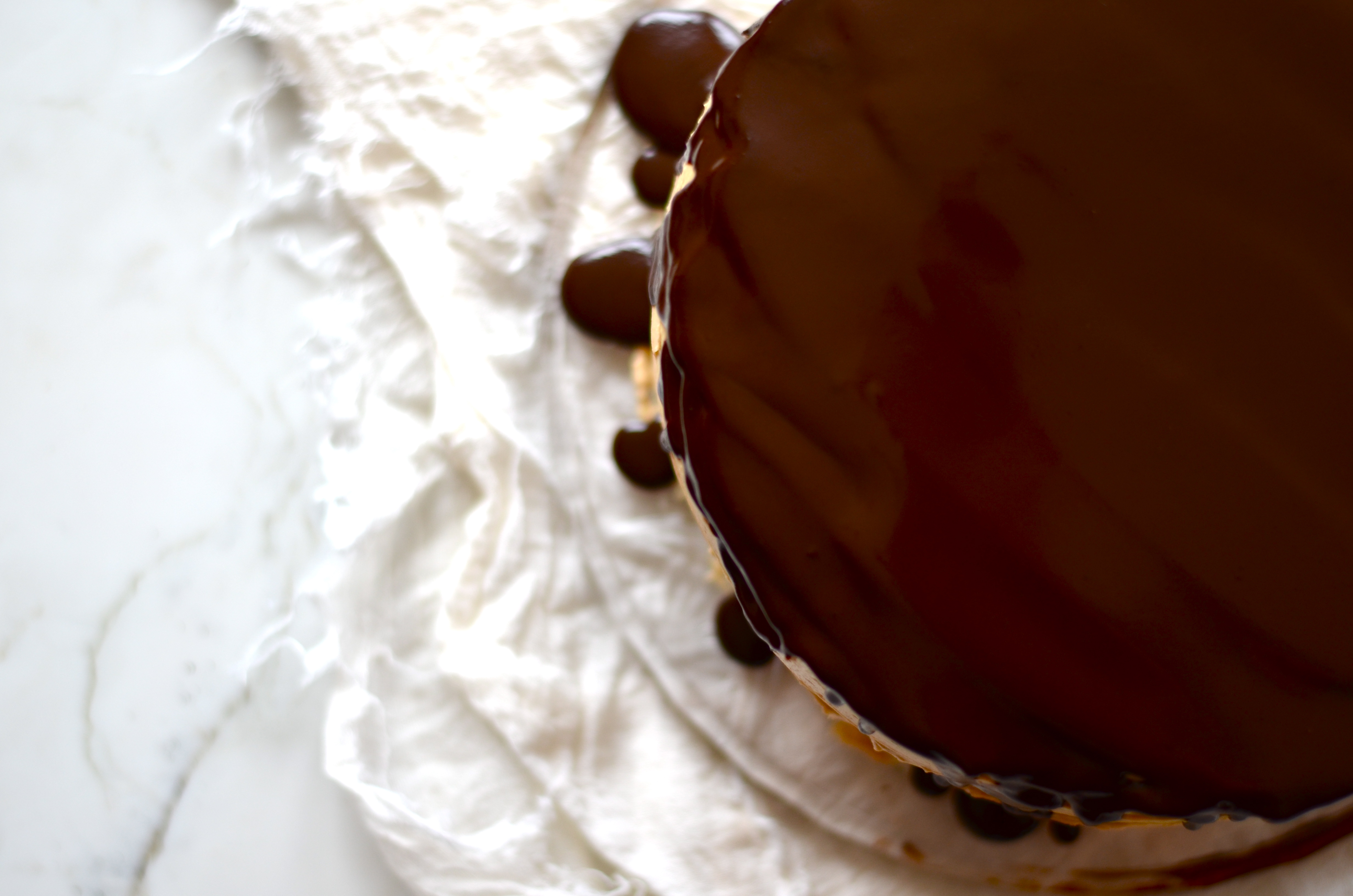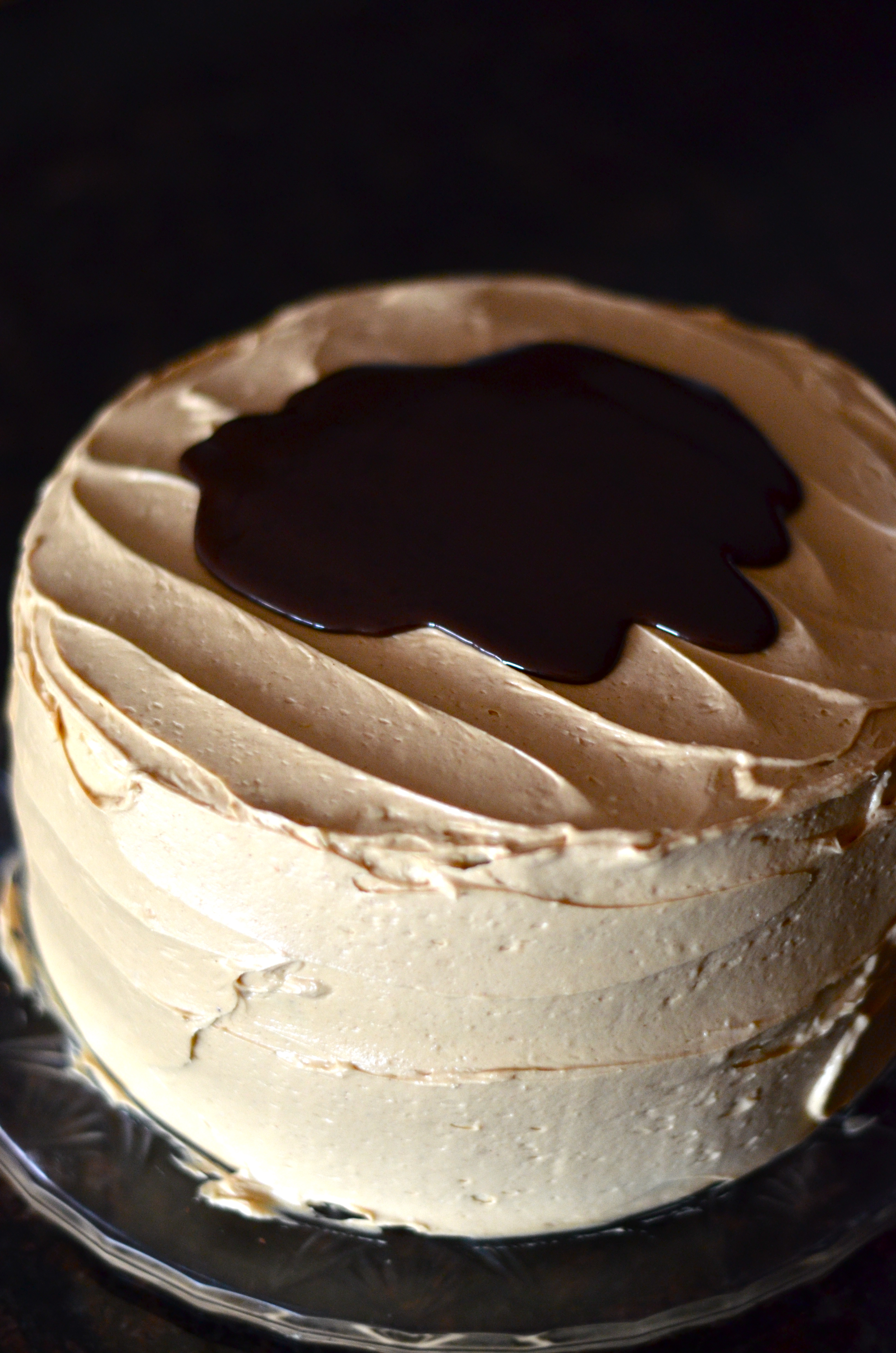 Once cake and ganache have cooled, pour ganache slowly over the center of the cake. Being patient while it slowly makes its way down the edges of the cake.