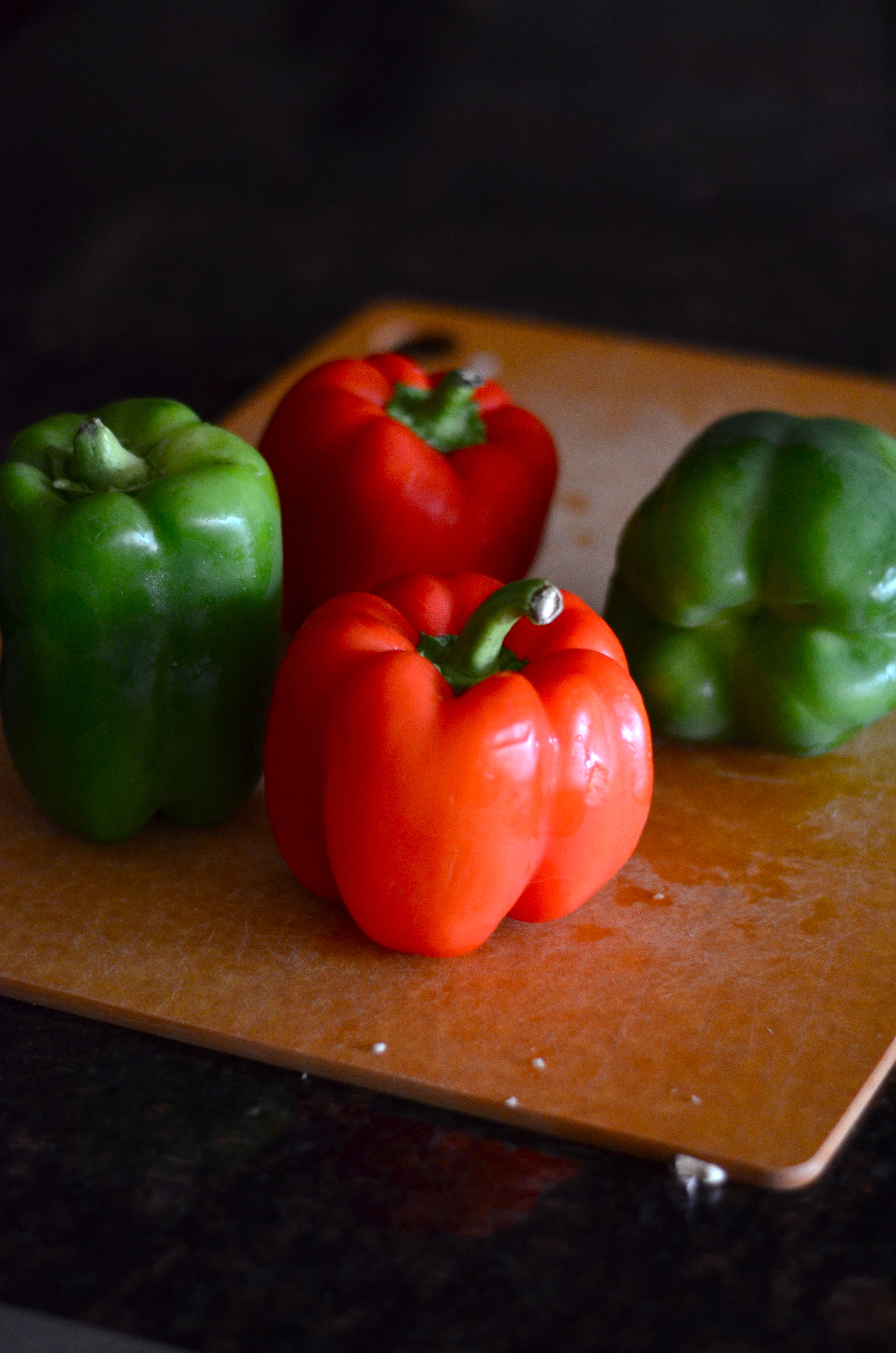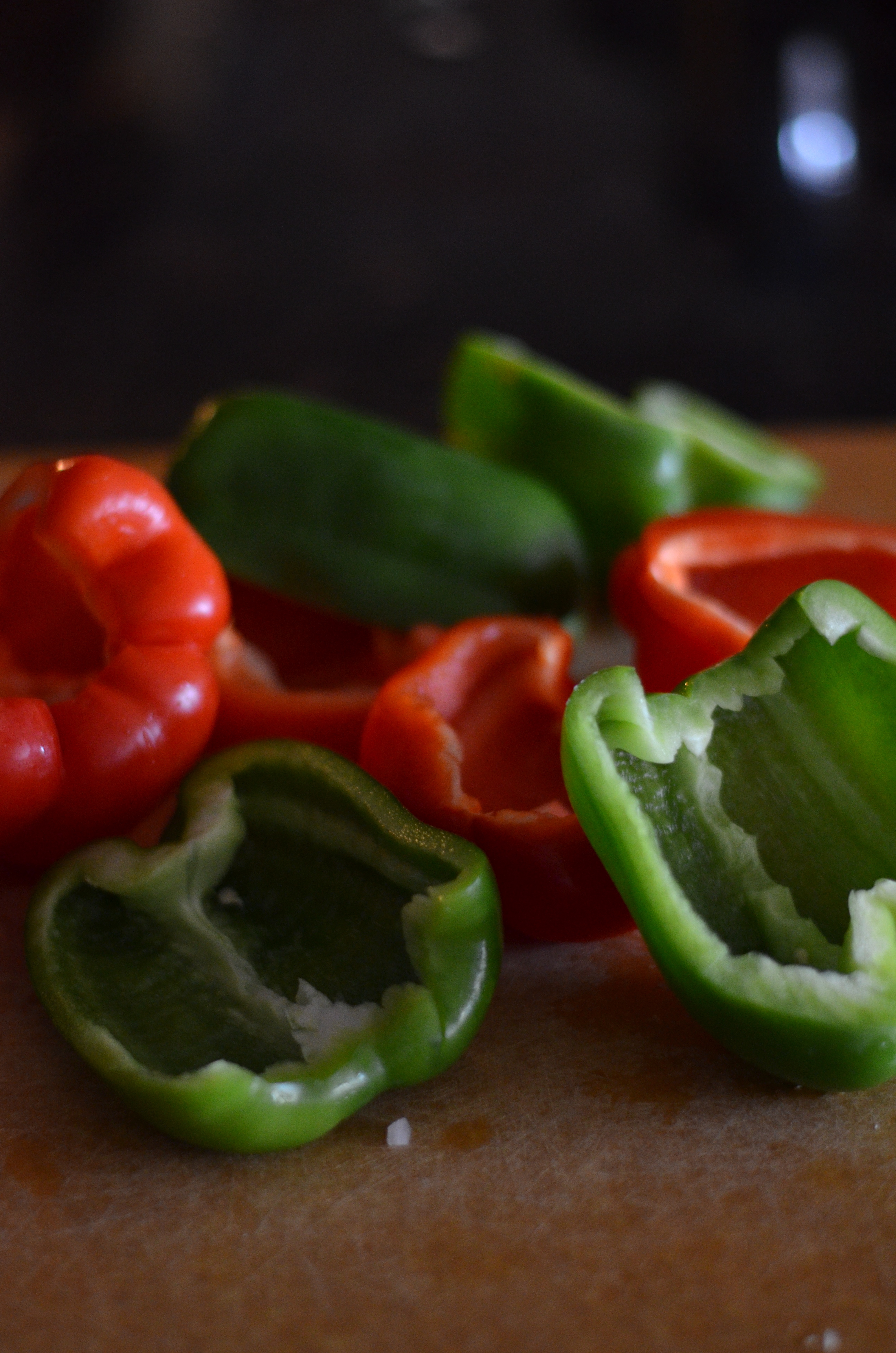 I par-boil the peppers in water so the baking time is shorter. You can either slice the peppers in half or cut off the tops. If you’re making for more people I suggest cutting them in half (or if you want to have half of one color pepper and half of another).