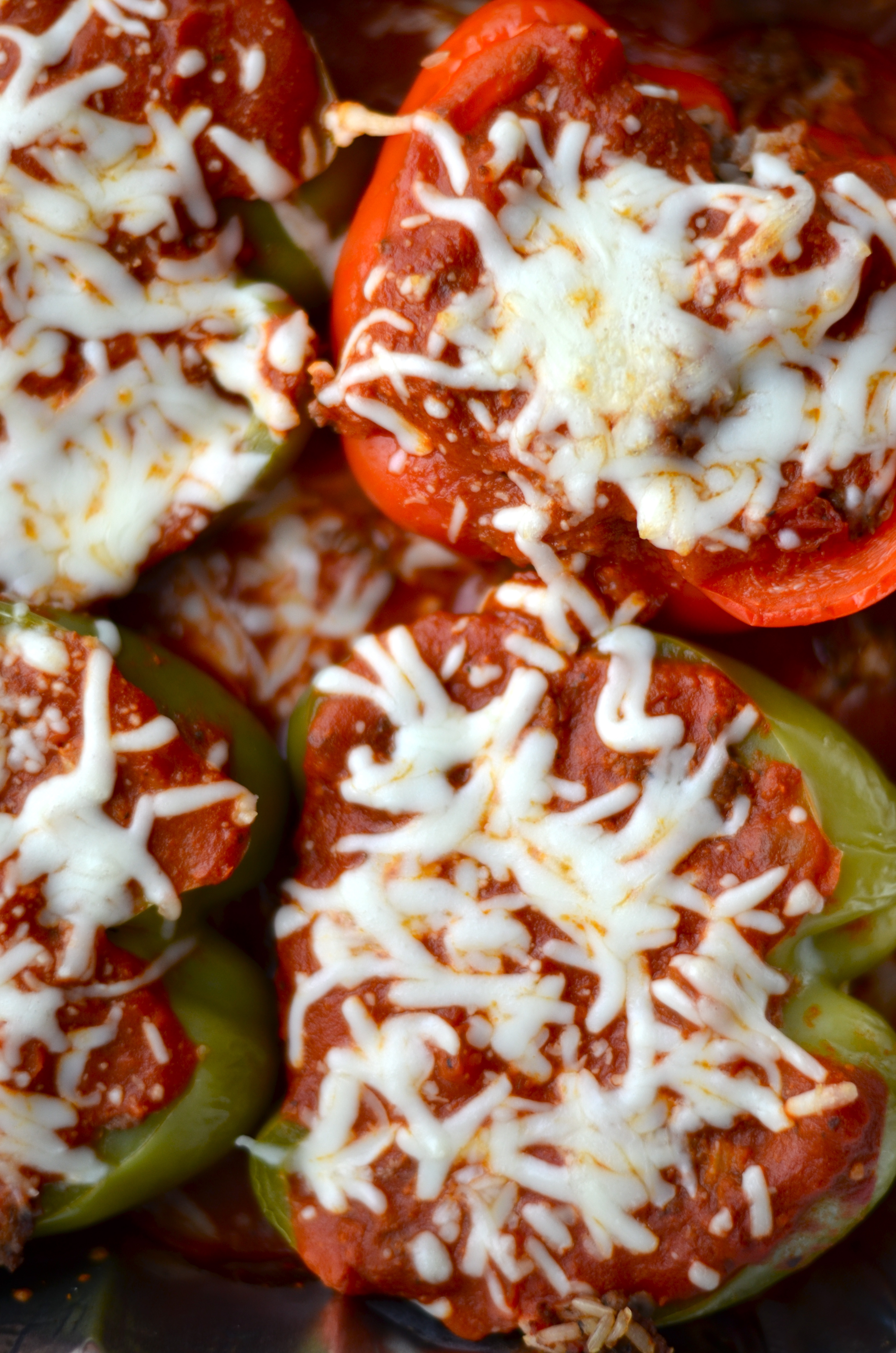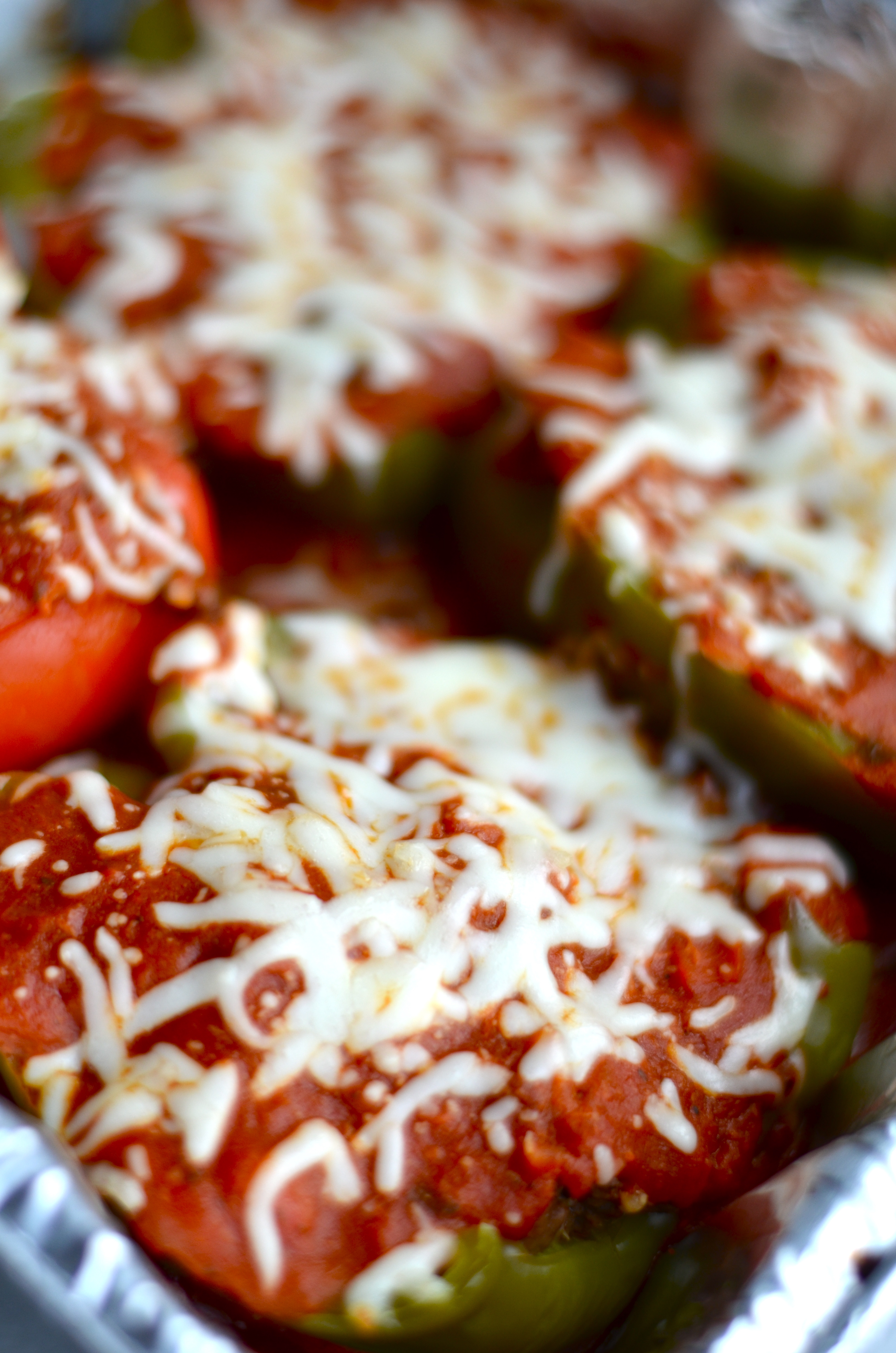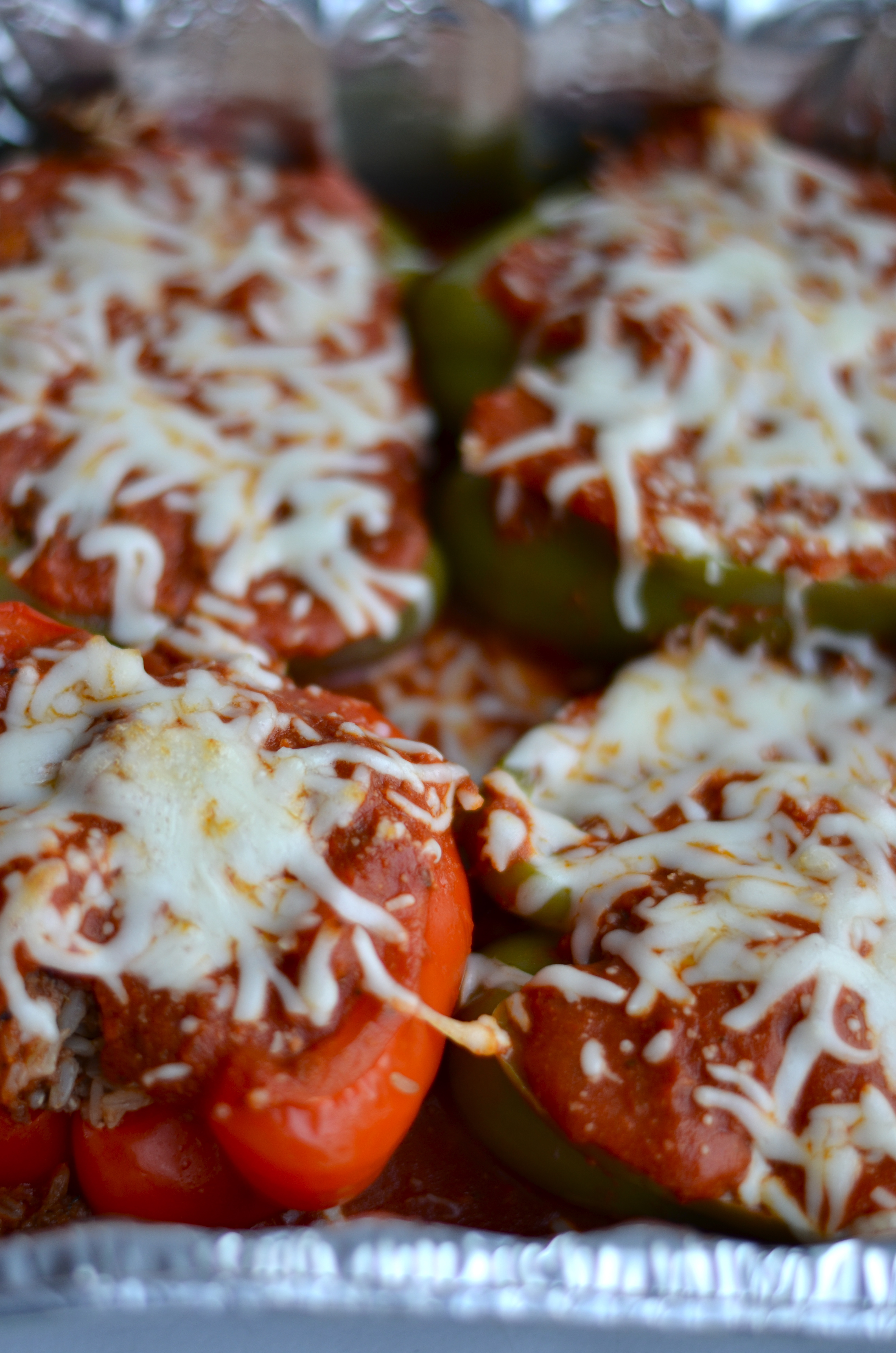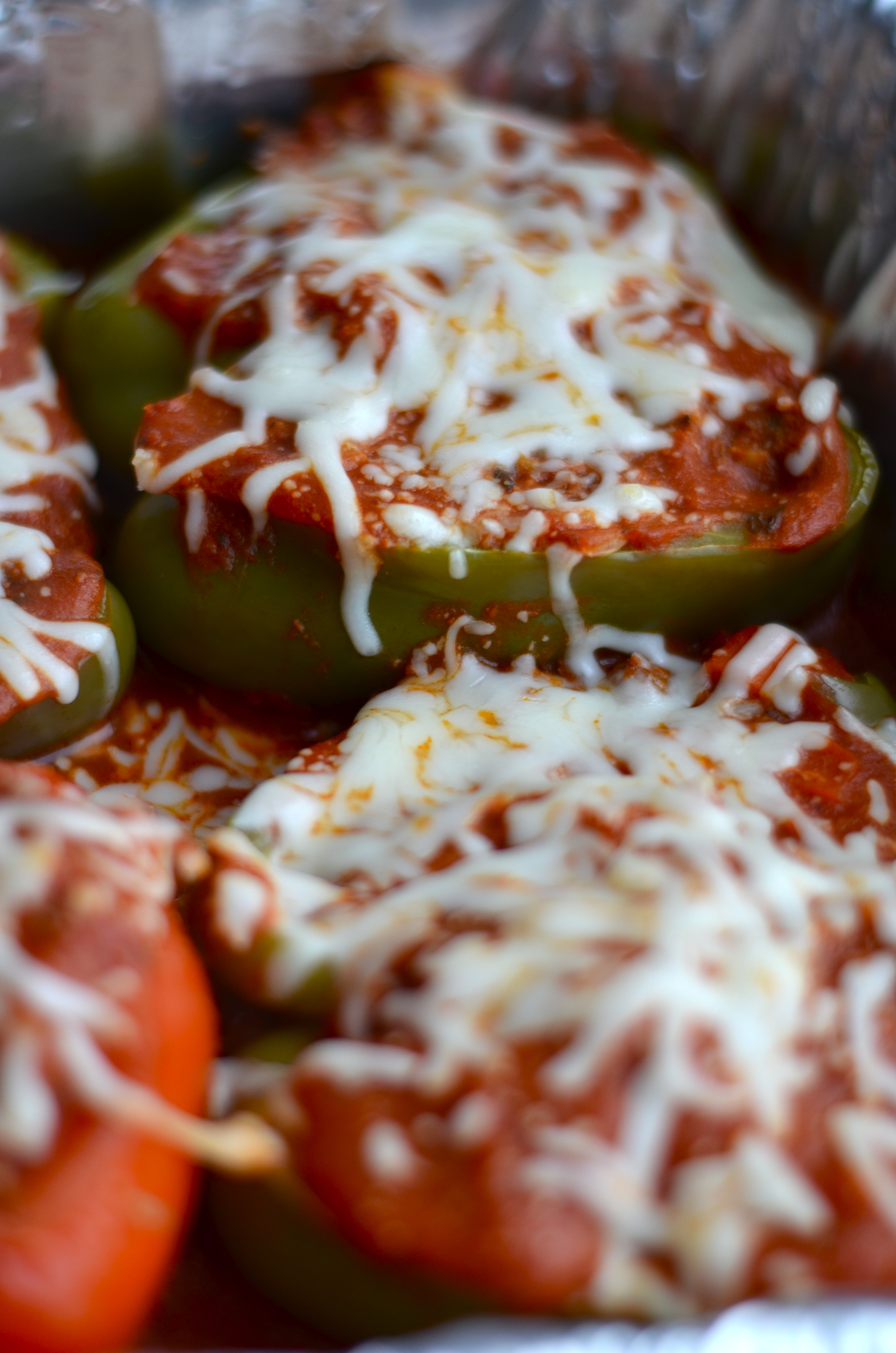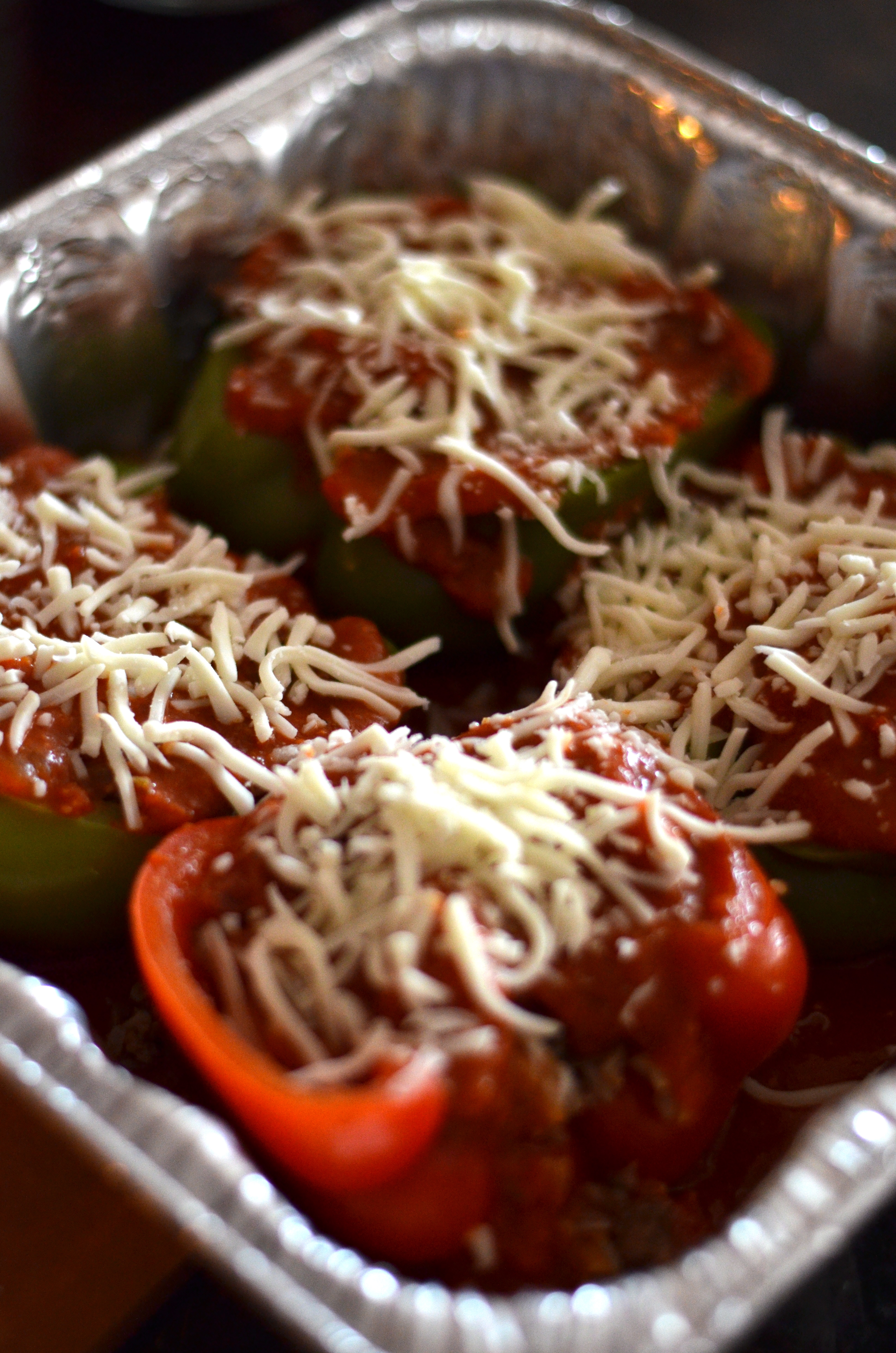 Place the peppers on top of the red sauce and fill the peppers with the meat and rice mixture. Once they are stuffed pour the remainder of sauce onto the peppers and down into the cracks and sprinkle the tops with mozzarella and Parmesan cheese.