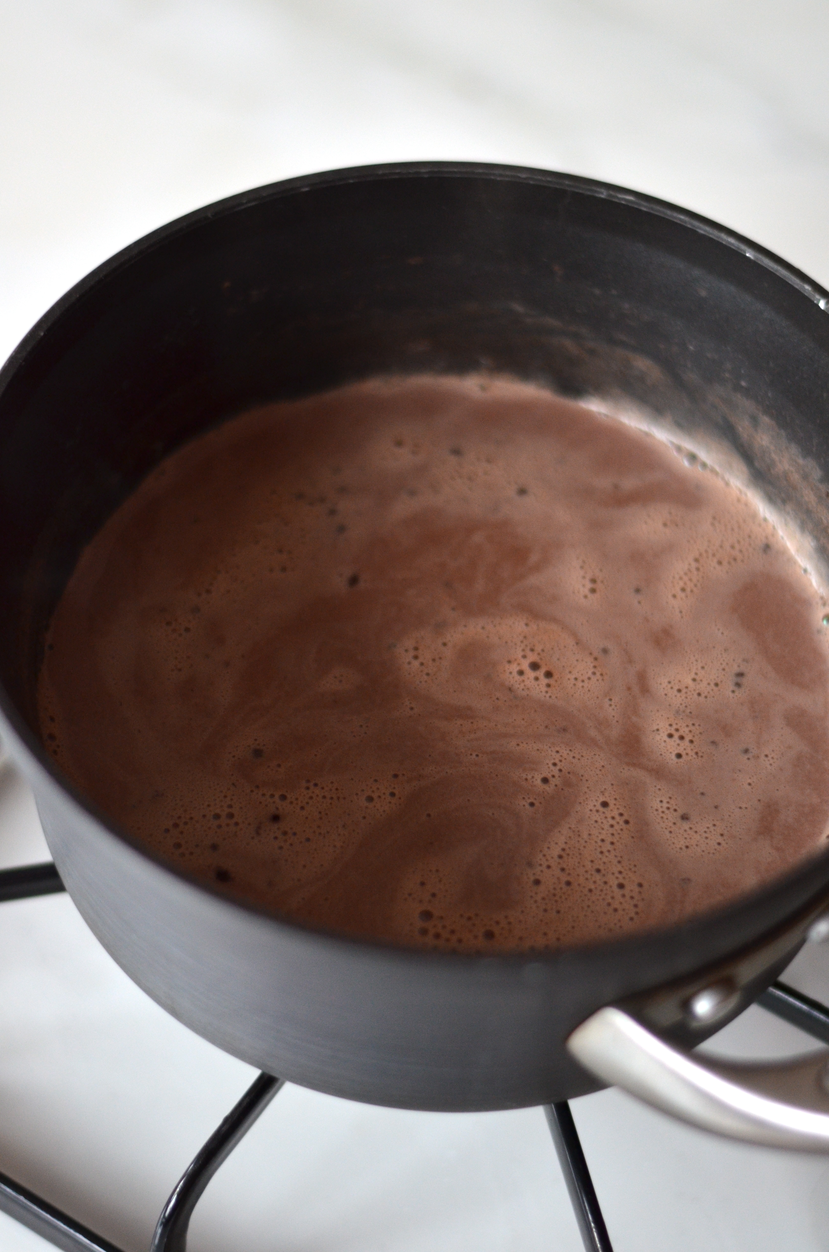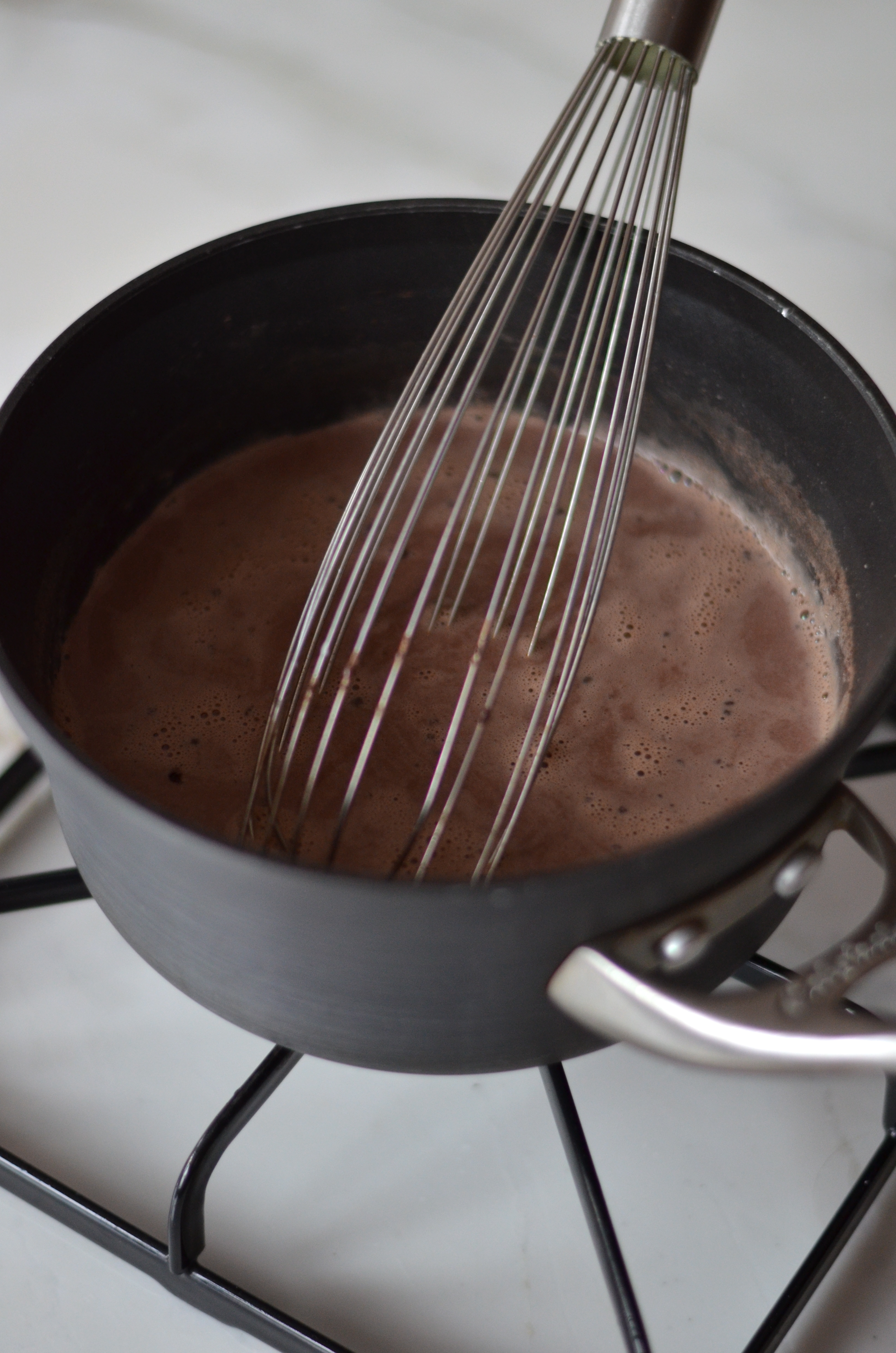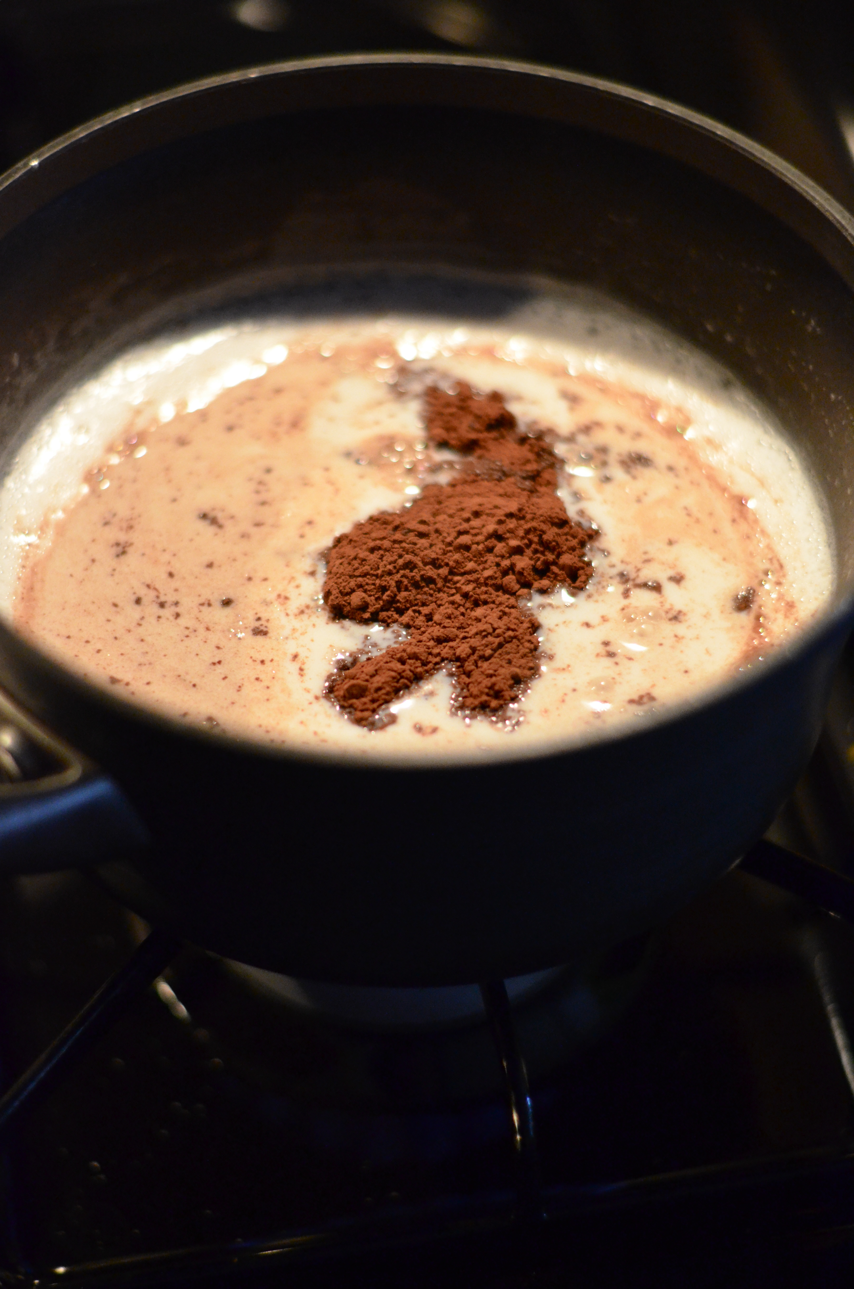 Remove the pan from the heat and add chocolate. Let sit for a minute to melt. Once melted, whisk until there are no clumps. Add cocoa powder and vanilla and mix until combined.