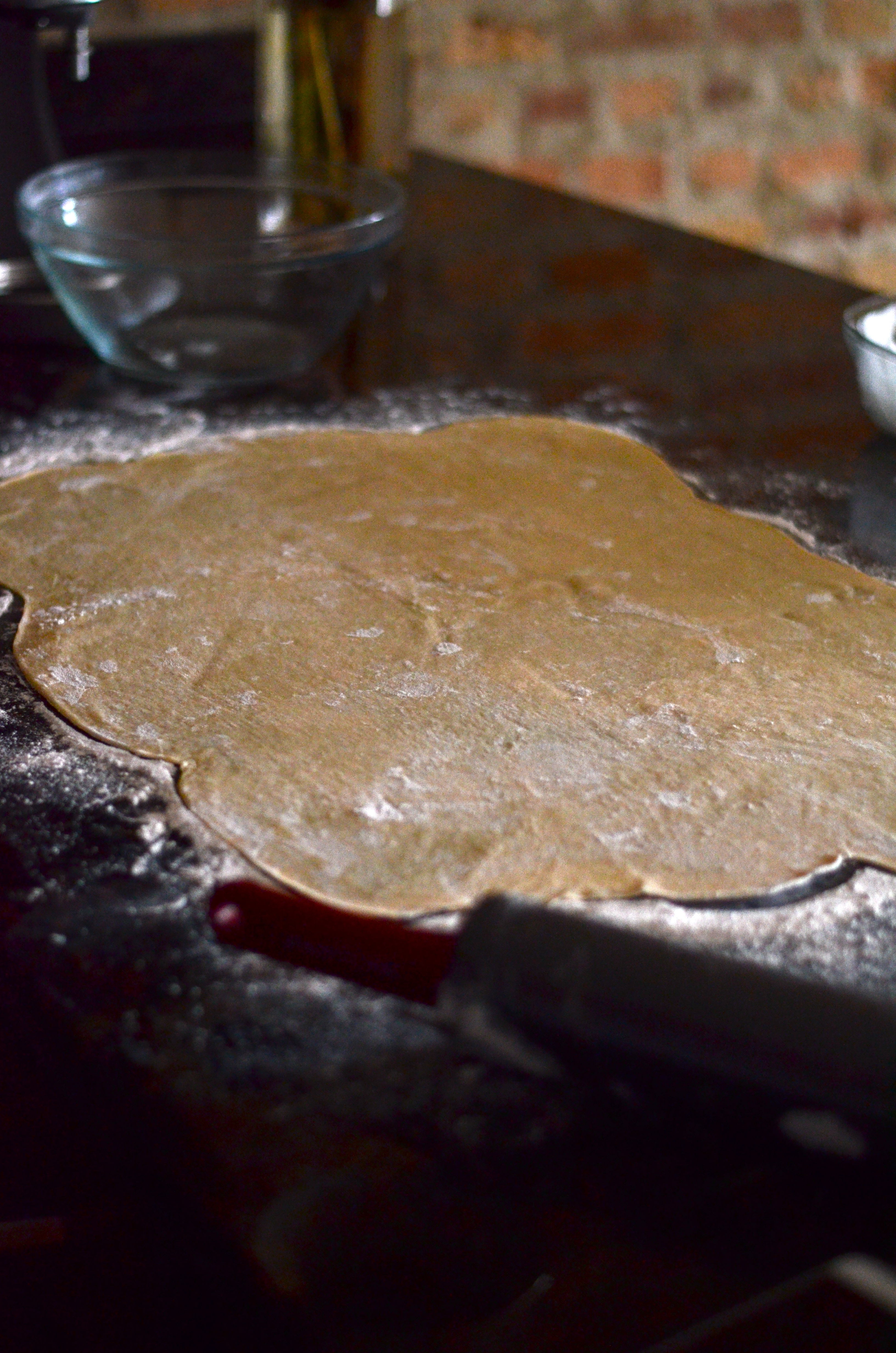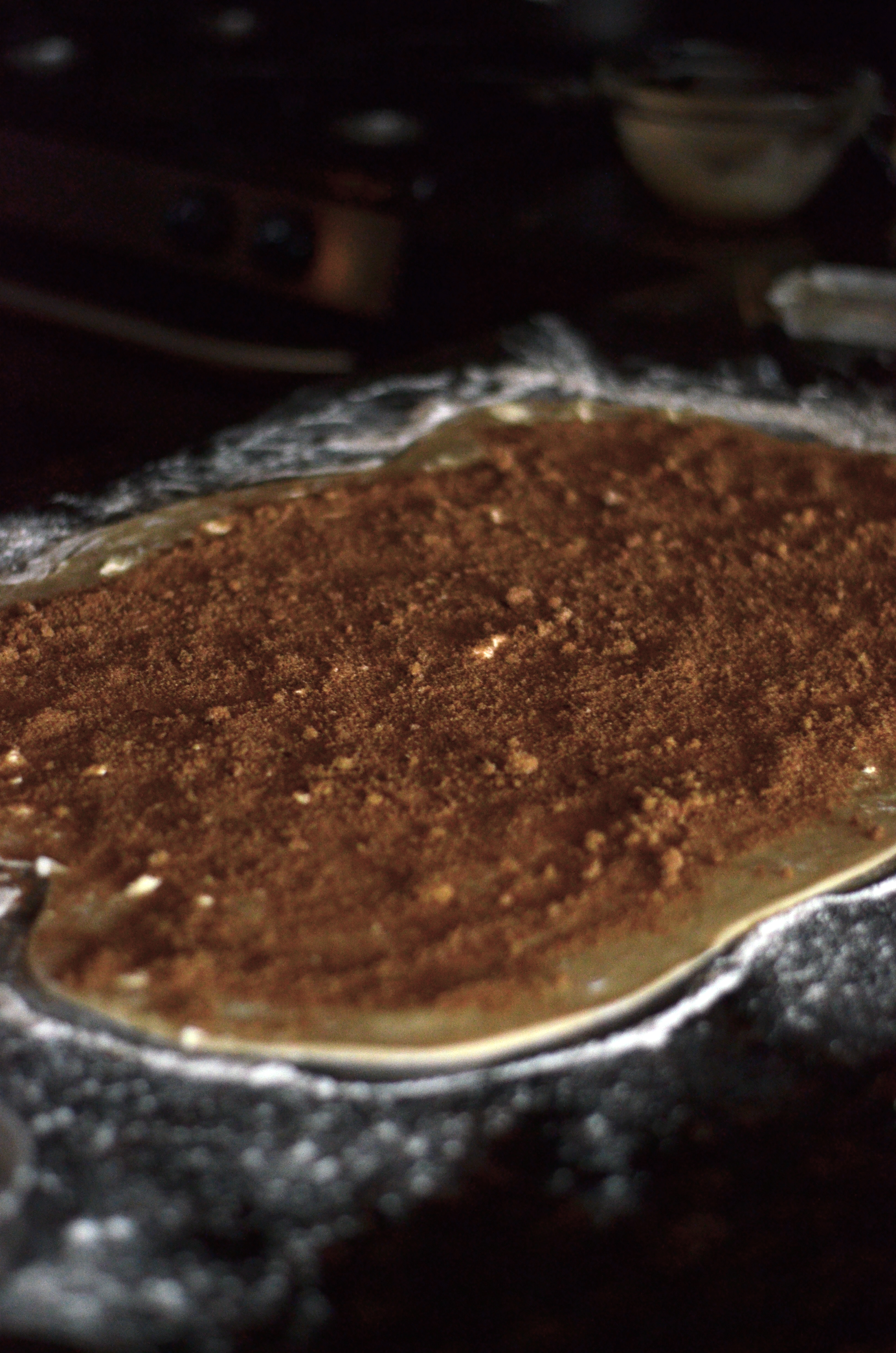 Once the dough has risen, you need to liberally flour a work surface and punch the dough down to remove any bubbles. transfer dough to work surface and sprinkle with flour. Roll out to roughly a 20×30 inch rectangle. Spread the softened butter (I just used my hands to spread it around) all over the dough leaving a 1 inch strip all the way around the edges. Then evenly sprinkle cinnamon and sugar mixture over that and press down gently with fingers.