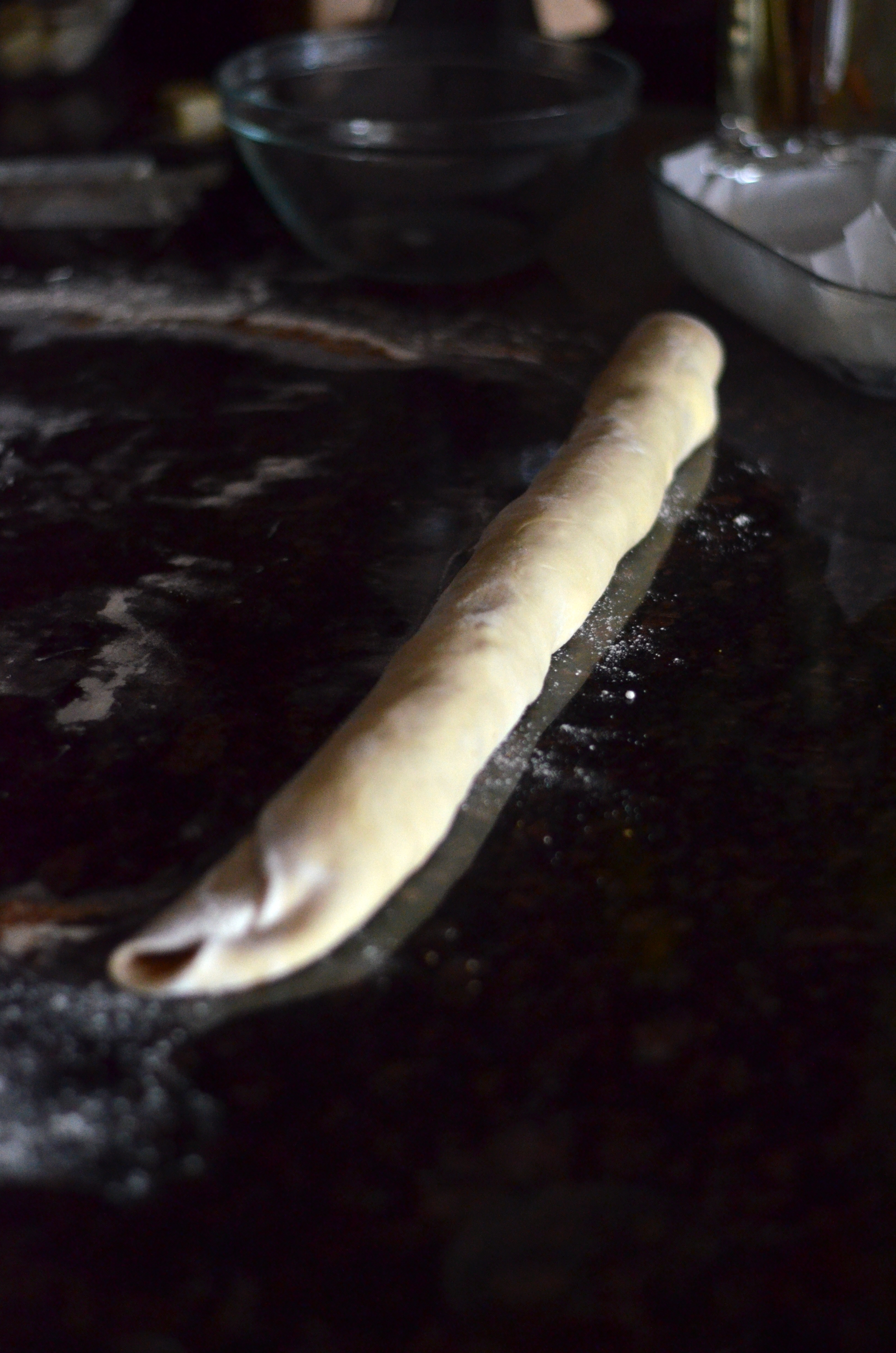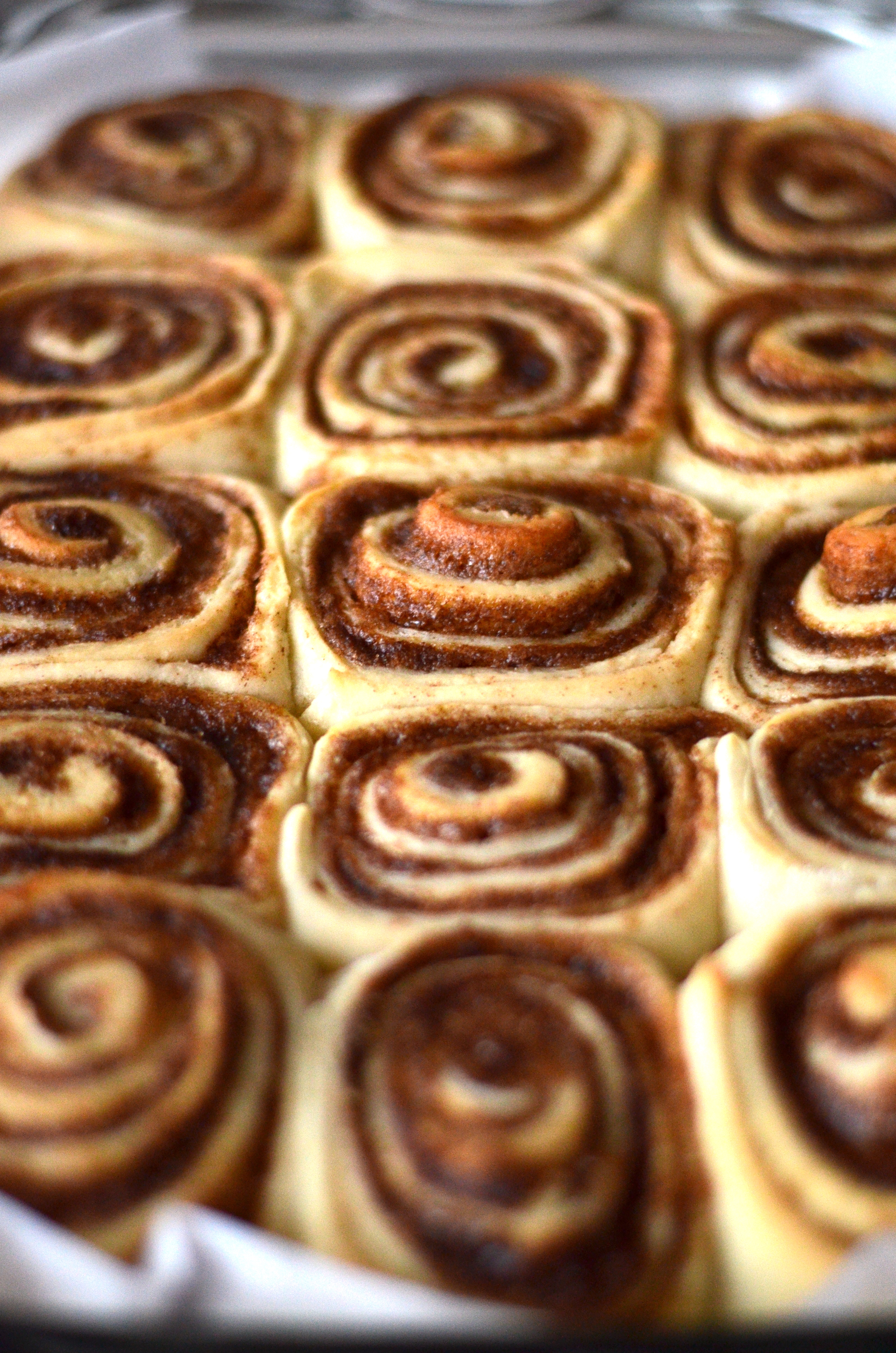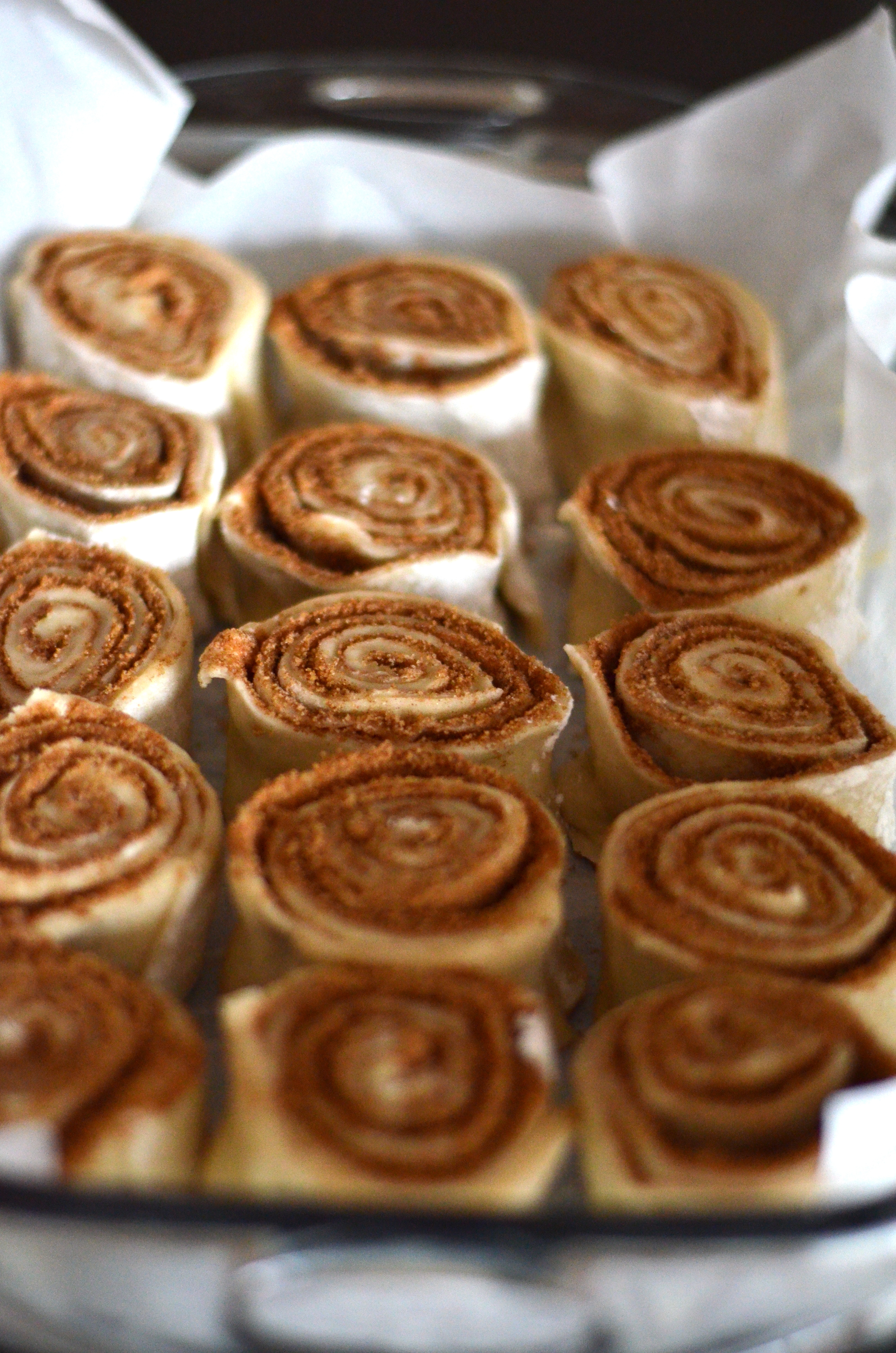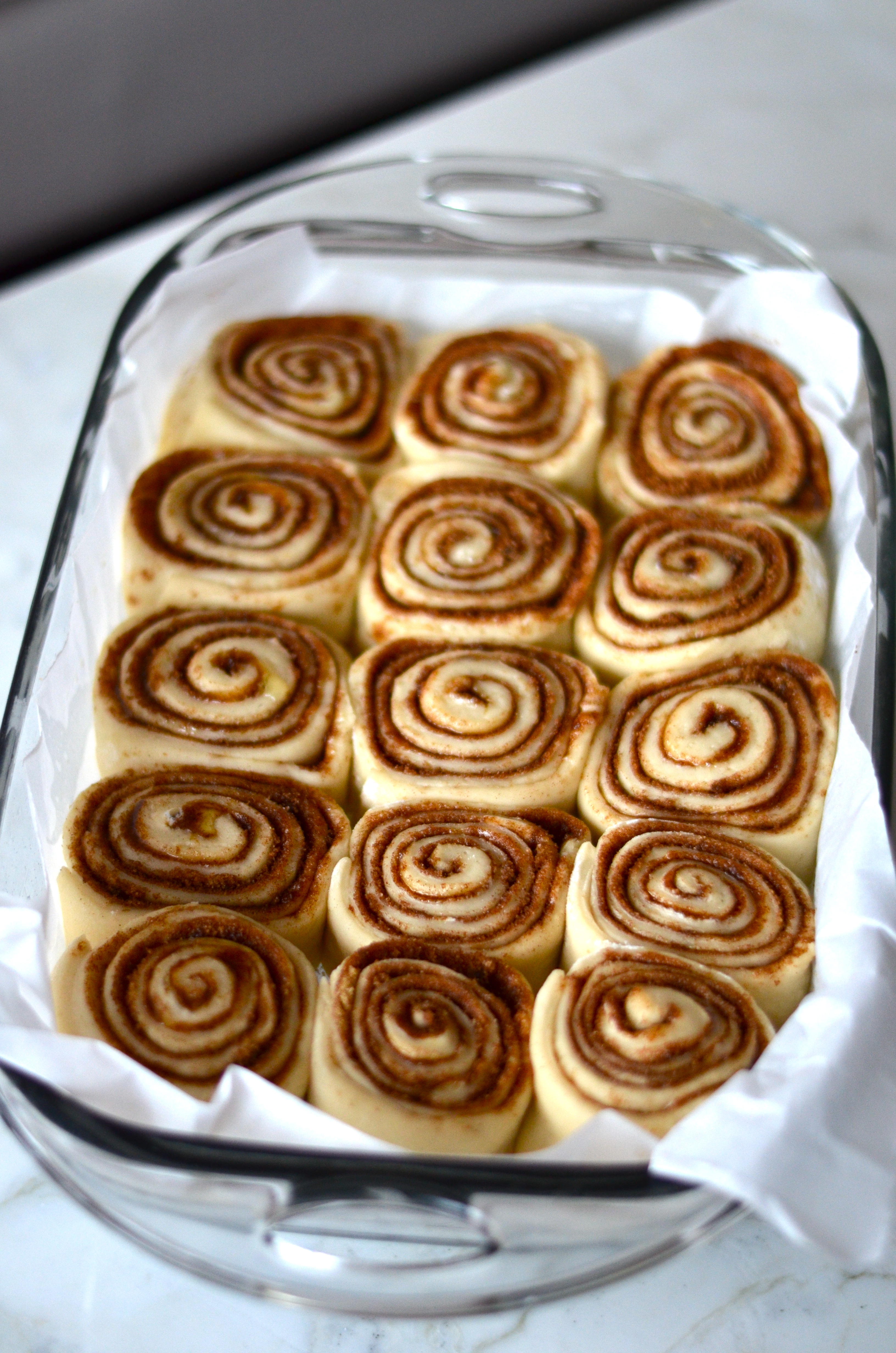 Starting with the edge closest to you, gently roll the dough away from you and into a roll. Seal with the 1 inch dry dough at the back by pressing down with your fingers. Cut off uneven ends and dispose. Use a sharp knife or string/floss to cut even (about 2 inches) rolls out of dough. Place into 9×13 inch pan and let rise, covered with plastic wrap for 1-2 hours or until they have either doubled in size or are touching.