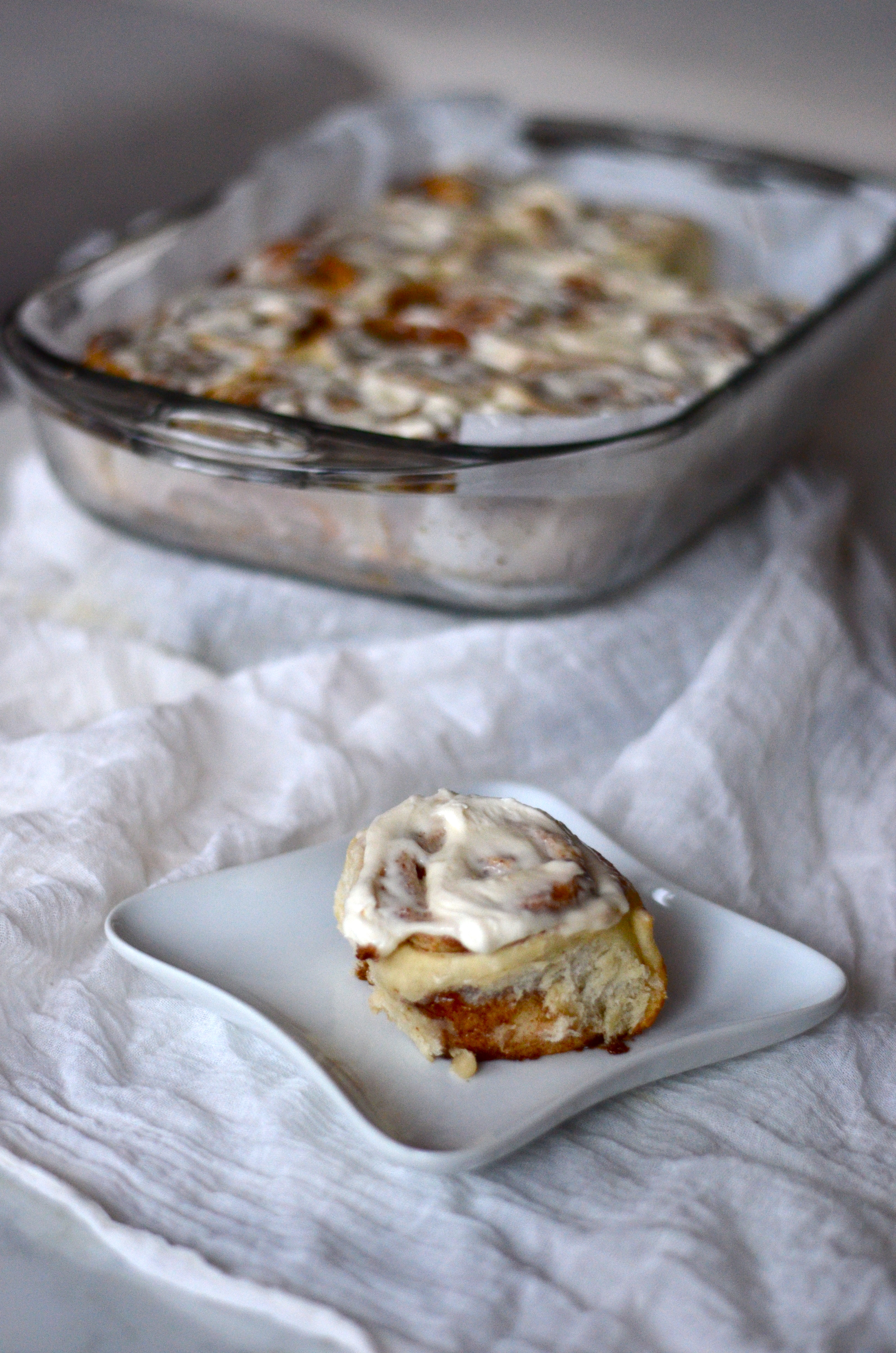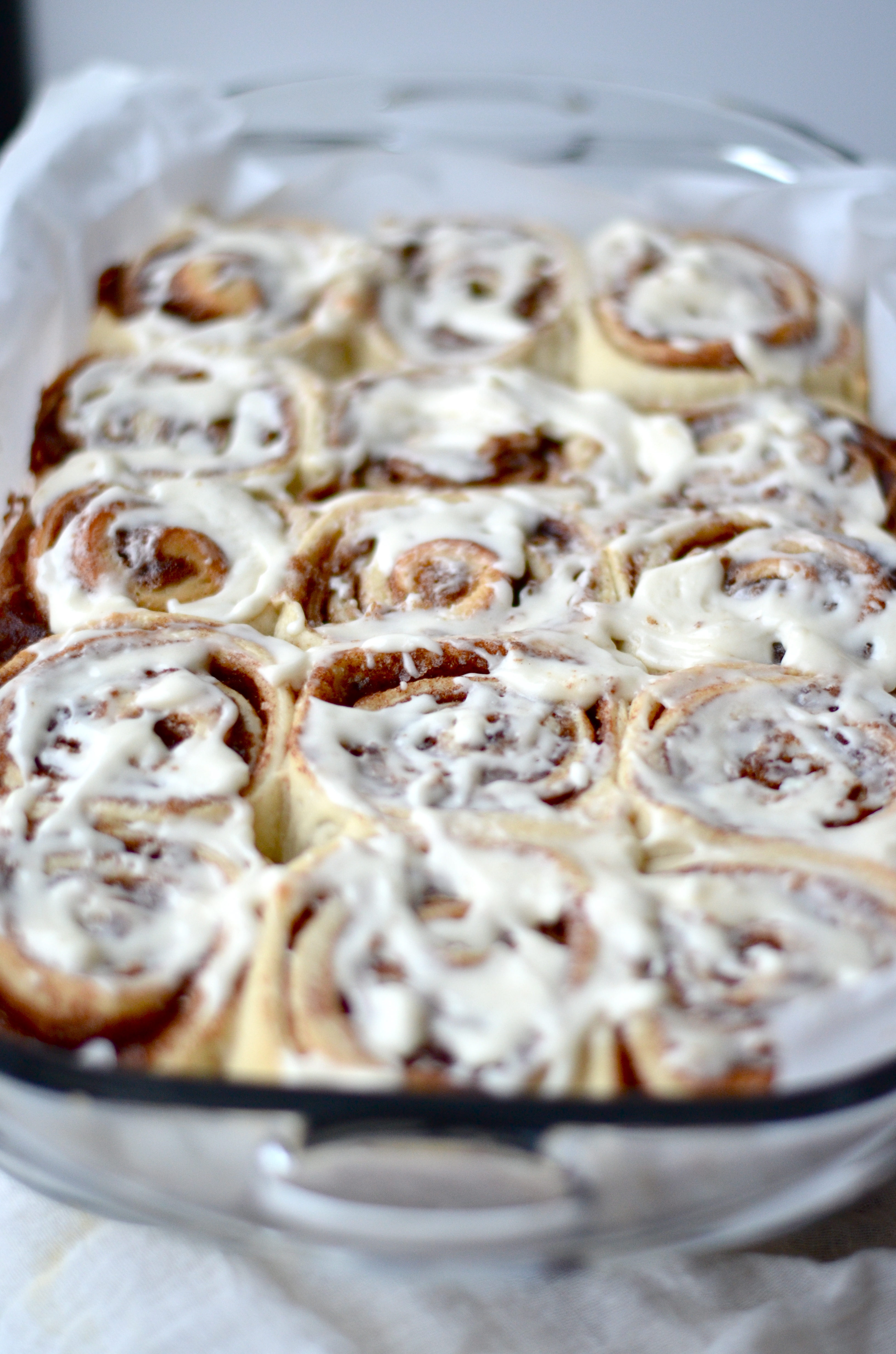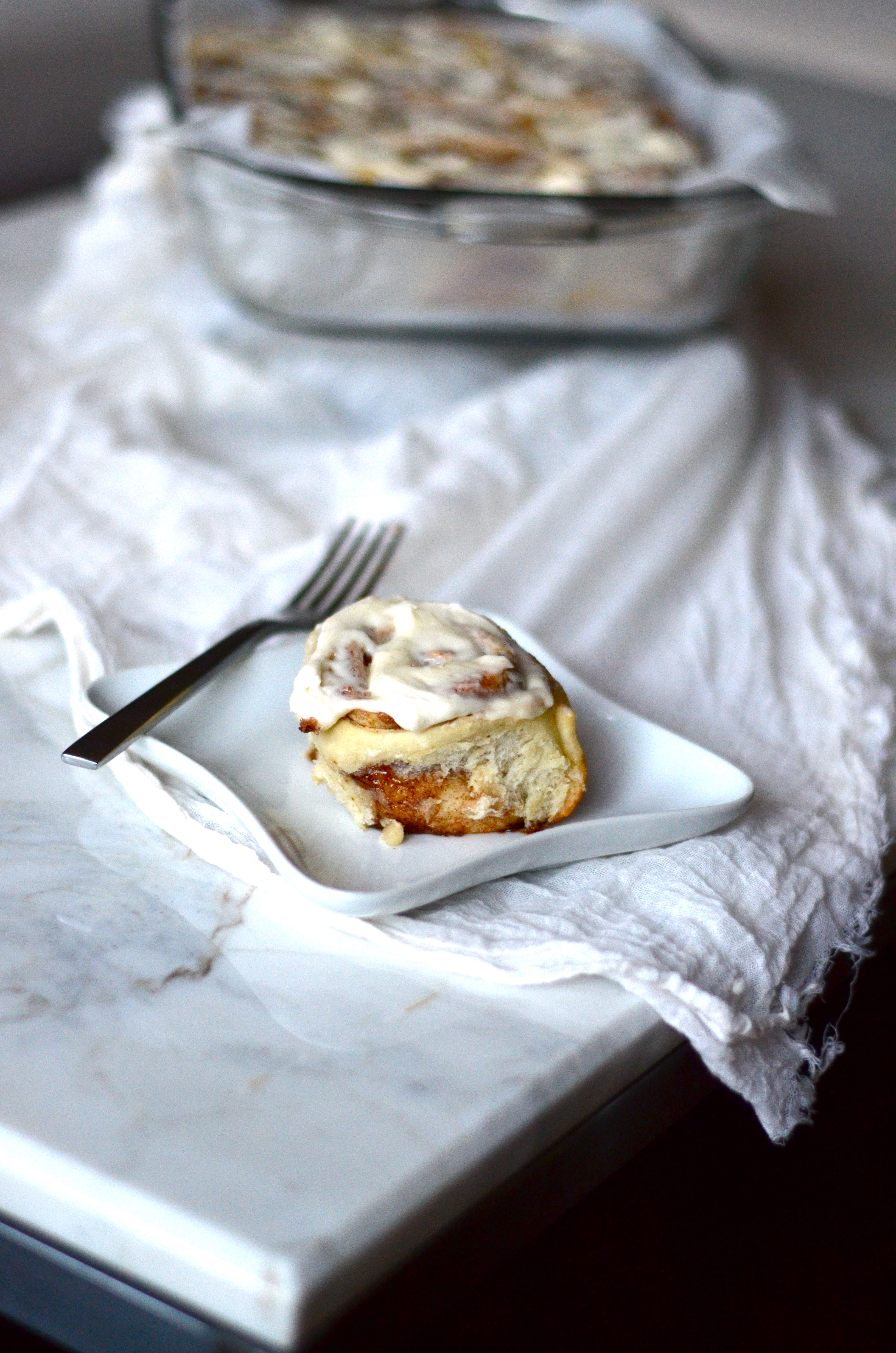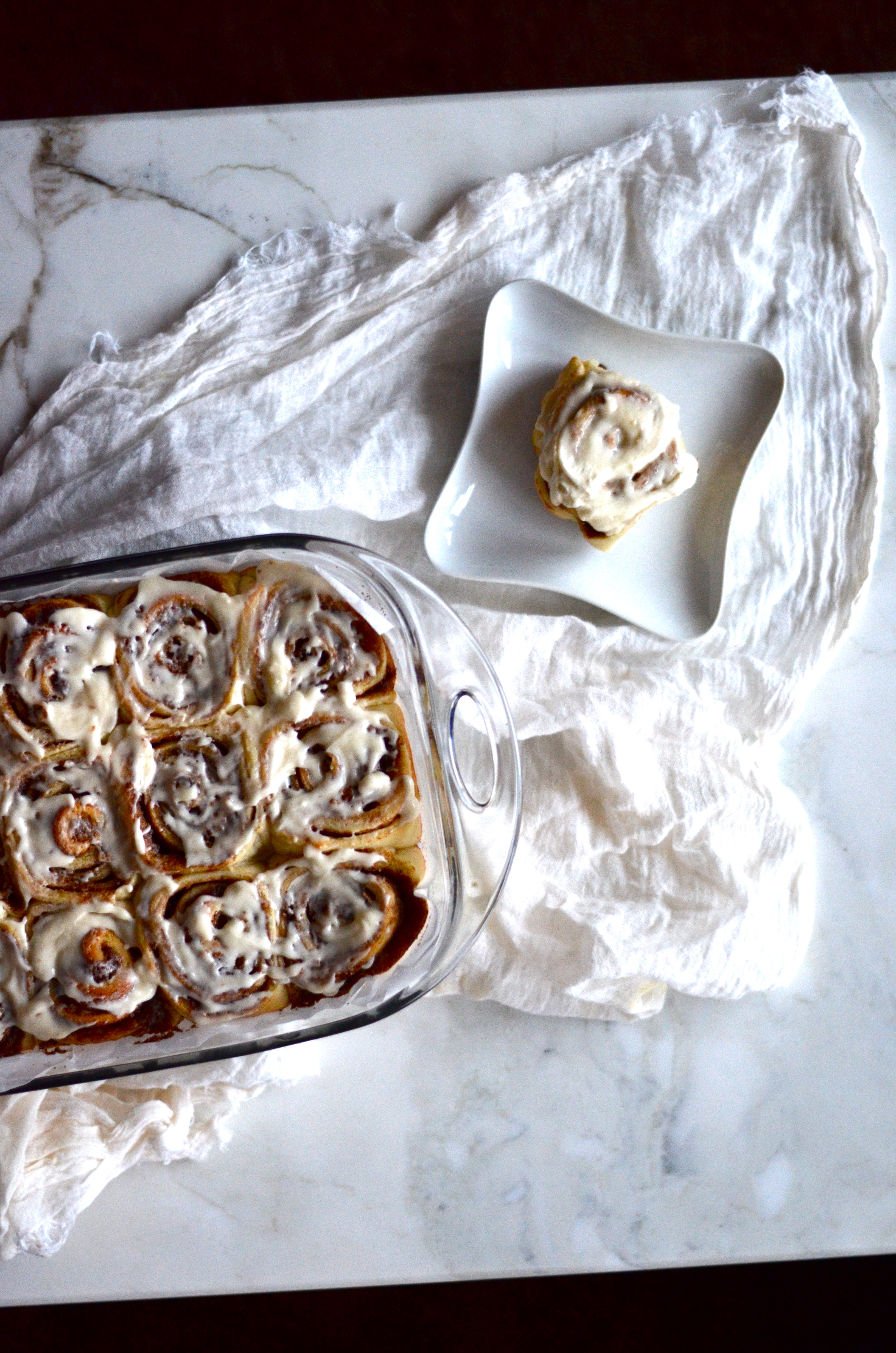 I have been meaning to make and share my favorite cinnamon roll recipe for a couple years and finally had the time to make them when Mikey was away one weekend (which resulted in me eating them for every meal). They are a bit time consuming, but if you have other things to do during some of the waiting periods they’re totally manageable (and worth it). Any time I see a cinnamon roll on a menu I am tempted to get it. The smell of Cinnabon at the mall gets me every. single. time. There is something about that cream cheese frosting melting into the doughy cinnamon and sugar that I literally can’t say no to! As I write this I am having a super hard time telling myself not to go get a cinnamon roll for lunch!