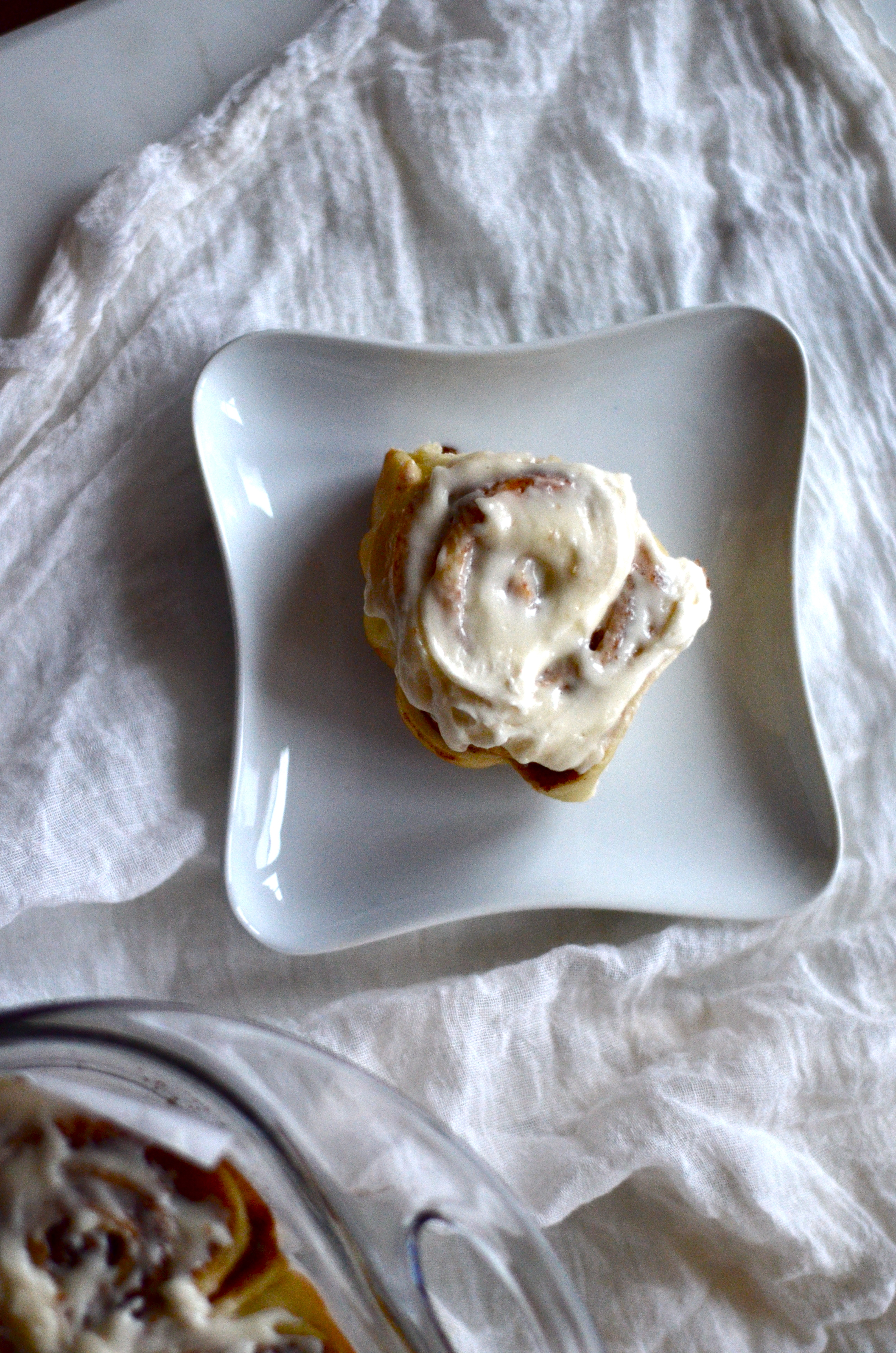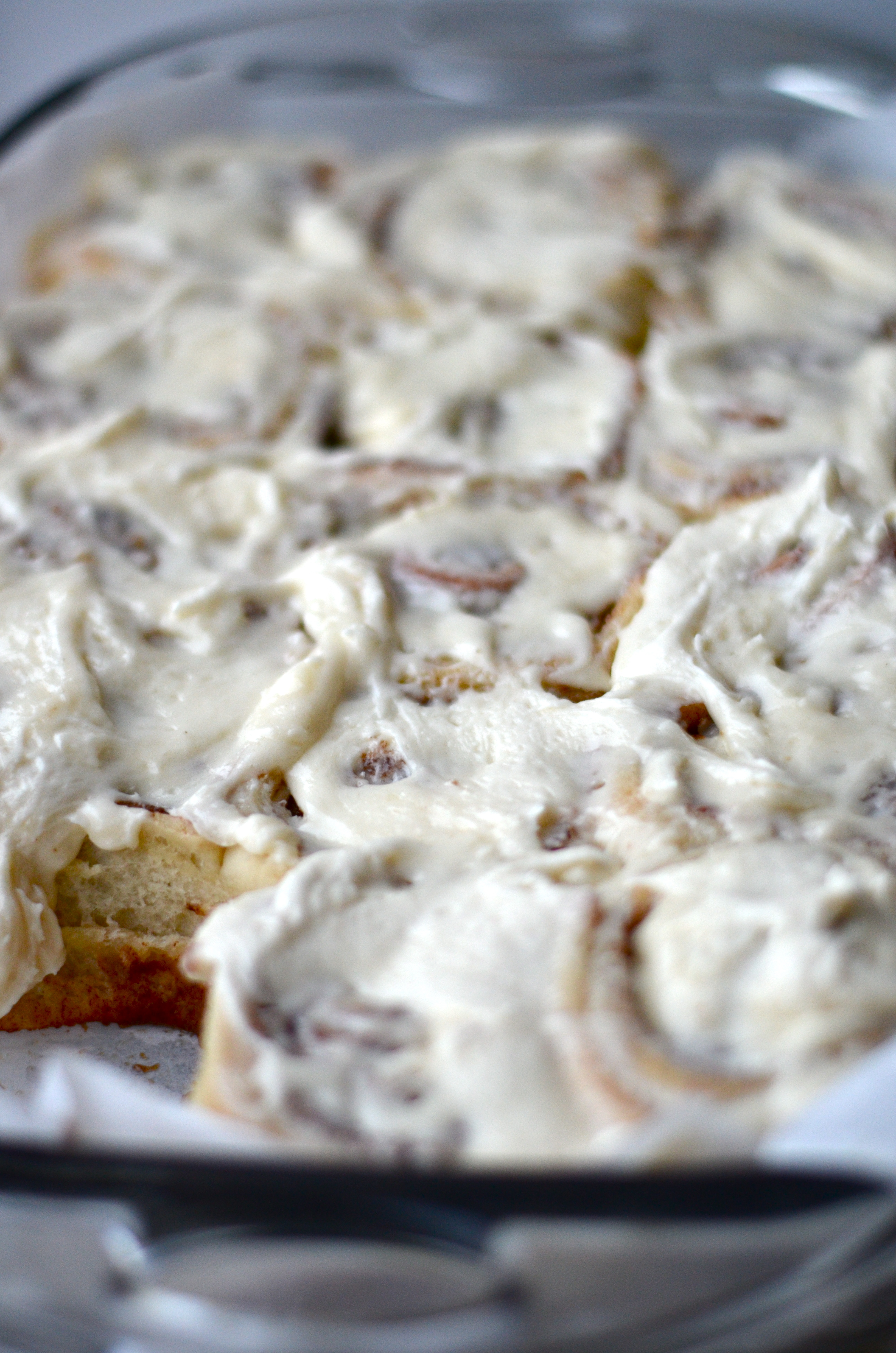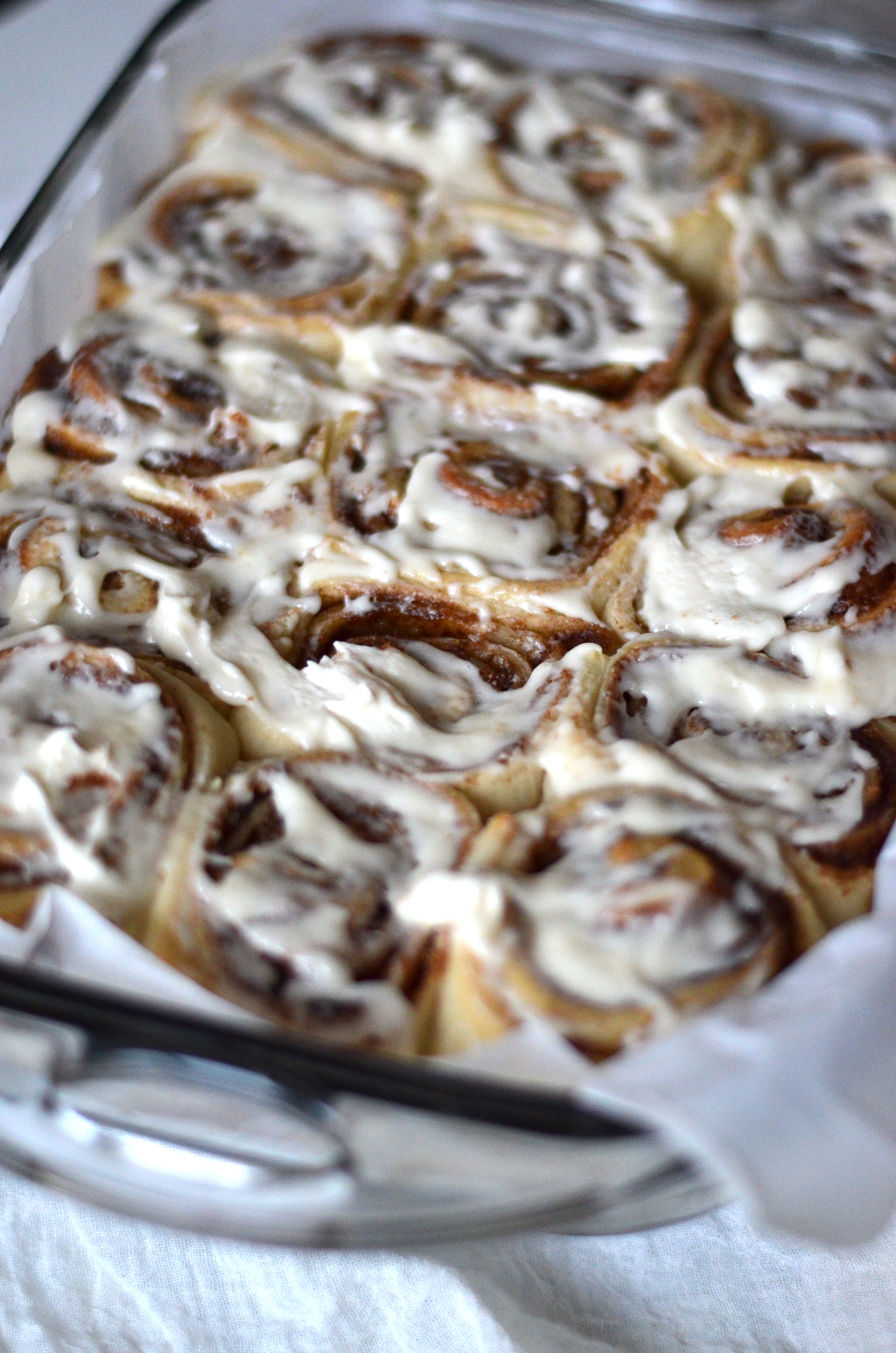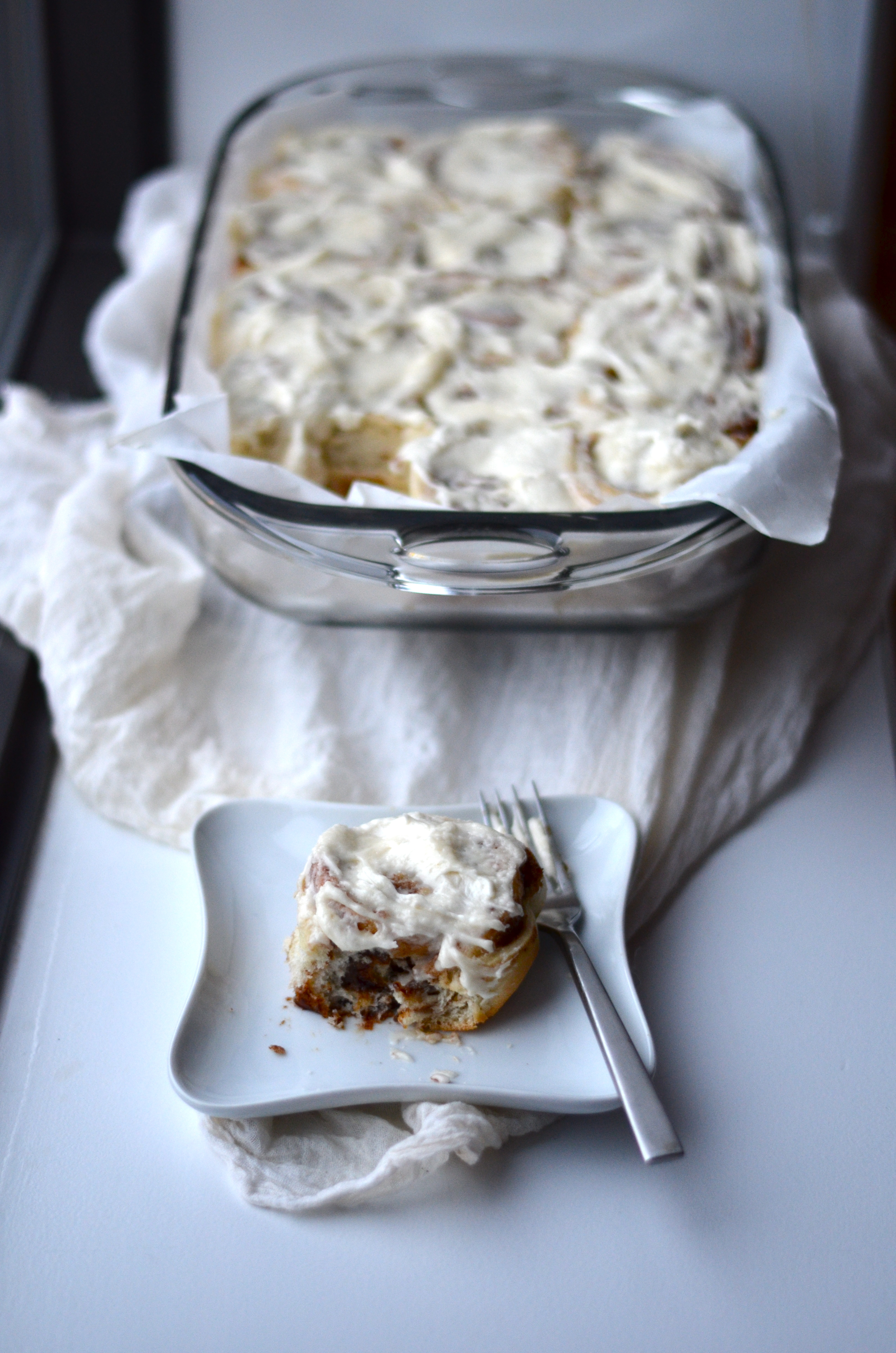 I have been meaning to make and share my favorite cinnamon roll recipe for a couple years and finally had the time to make them when Mikey was away one weekend (which resulted in me eating them for every meal). They are a bit time consuming, but if you have other things to do during some of the waiting periods they’re totally manageable (and worth it). Any time I see a cinnamon roll on a menu I am tempted to get it. The smell of Cinnabon at the mall gets me every. single. time. There is something about that cream cheese frosting melting into the doughy cinnamon and sugar that I literally can’t say no to! As I write this I am having a super hard time telling myself not to go get a cinnamon roll for lunch!