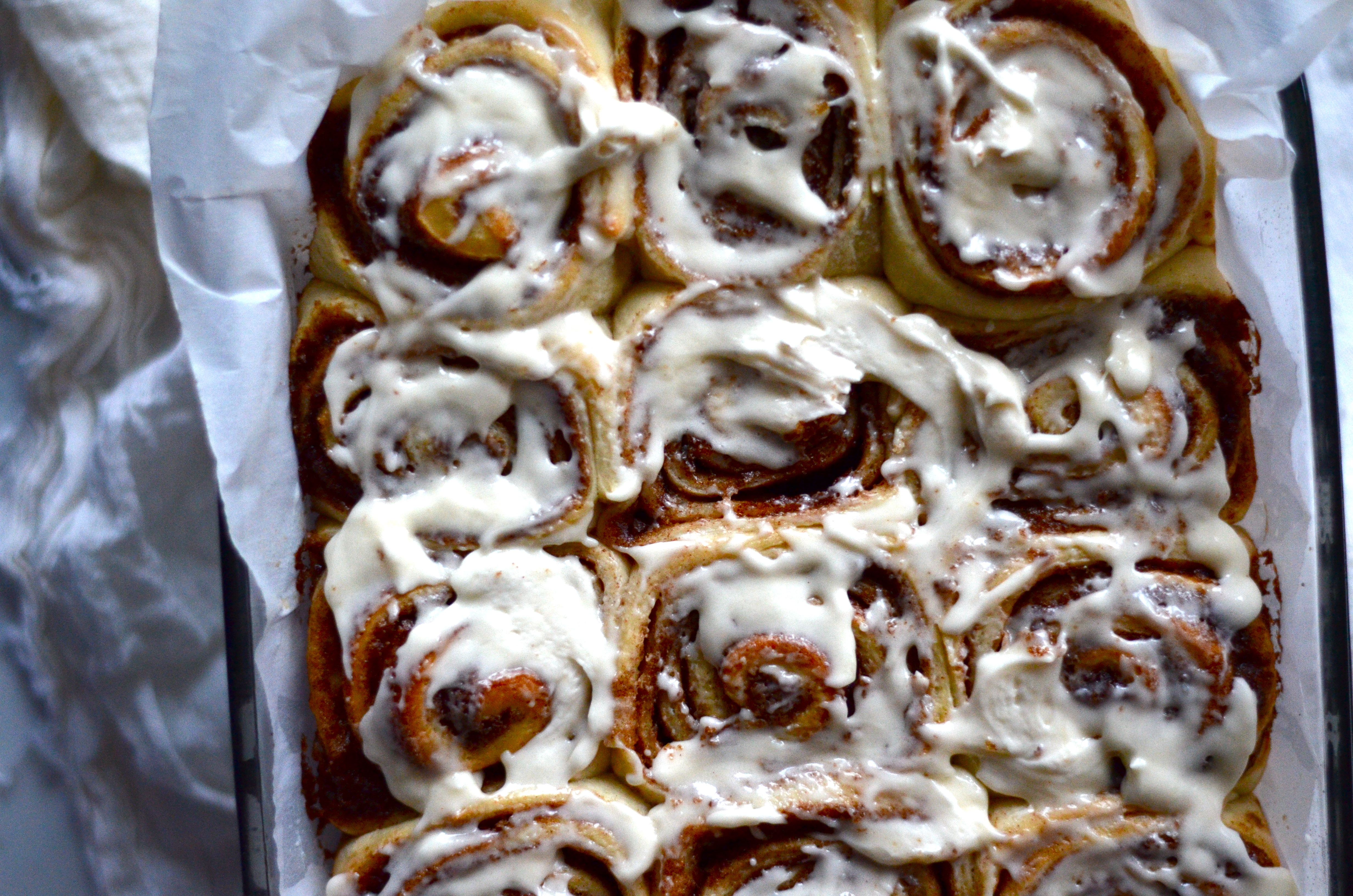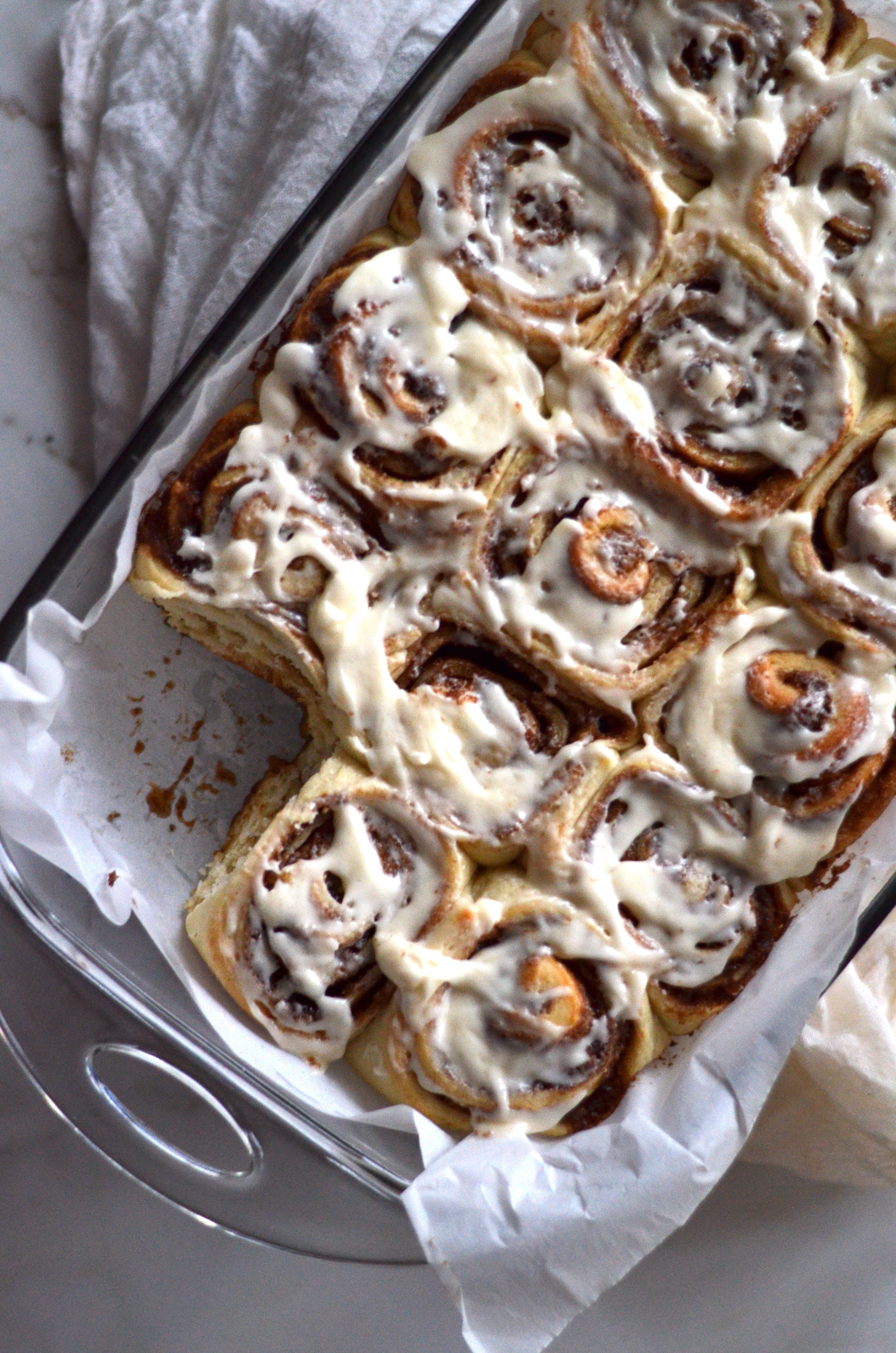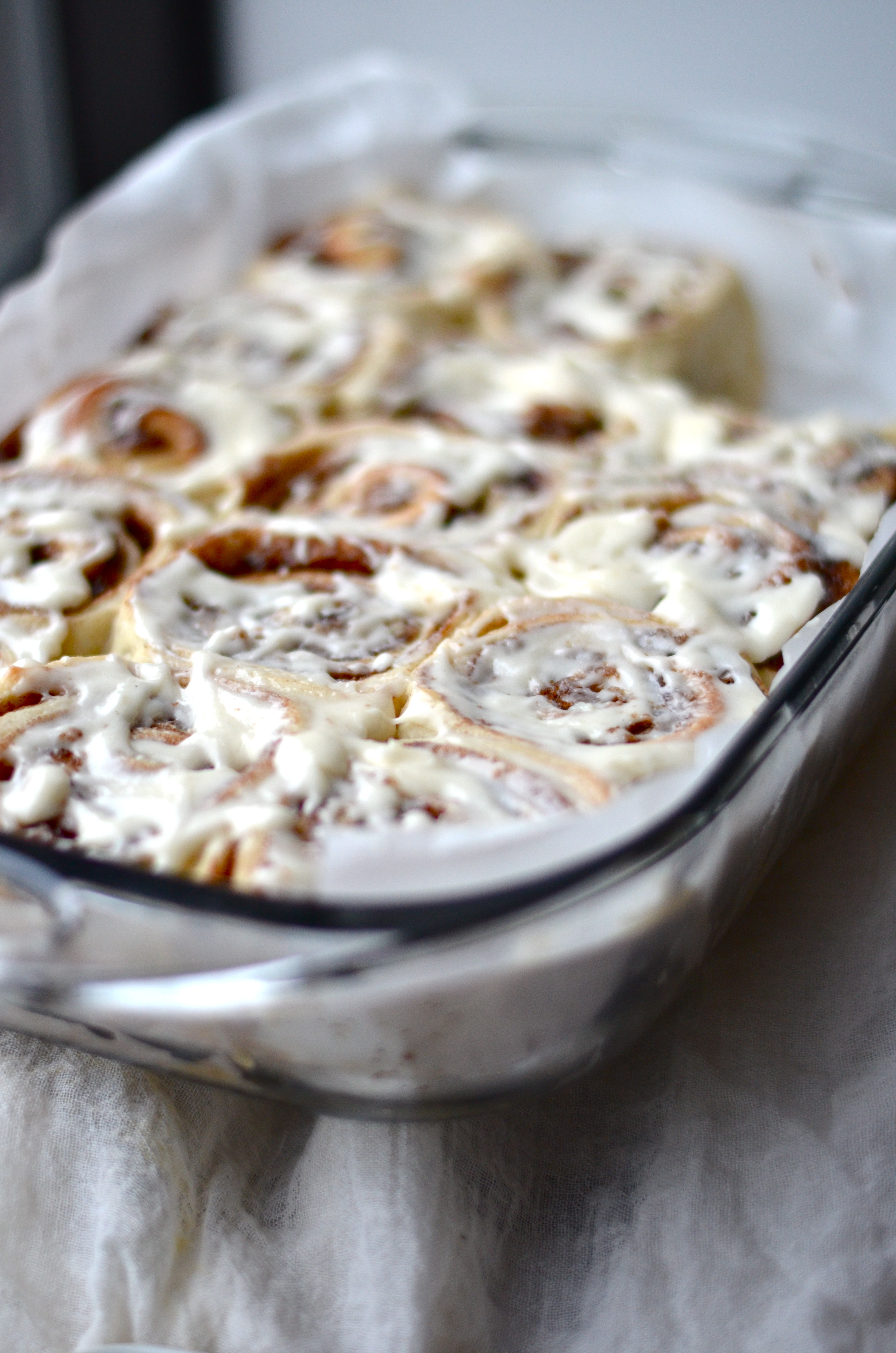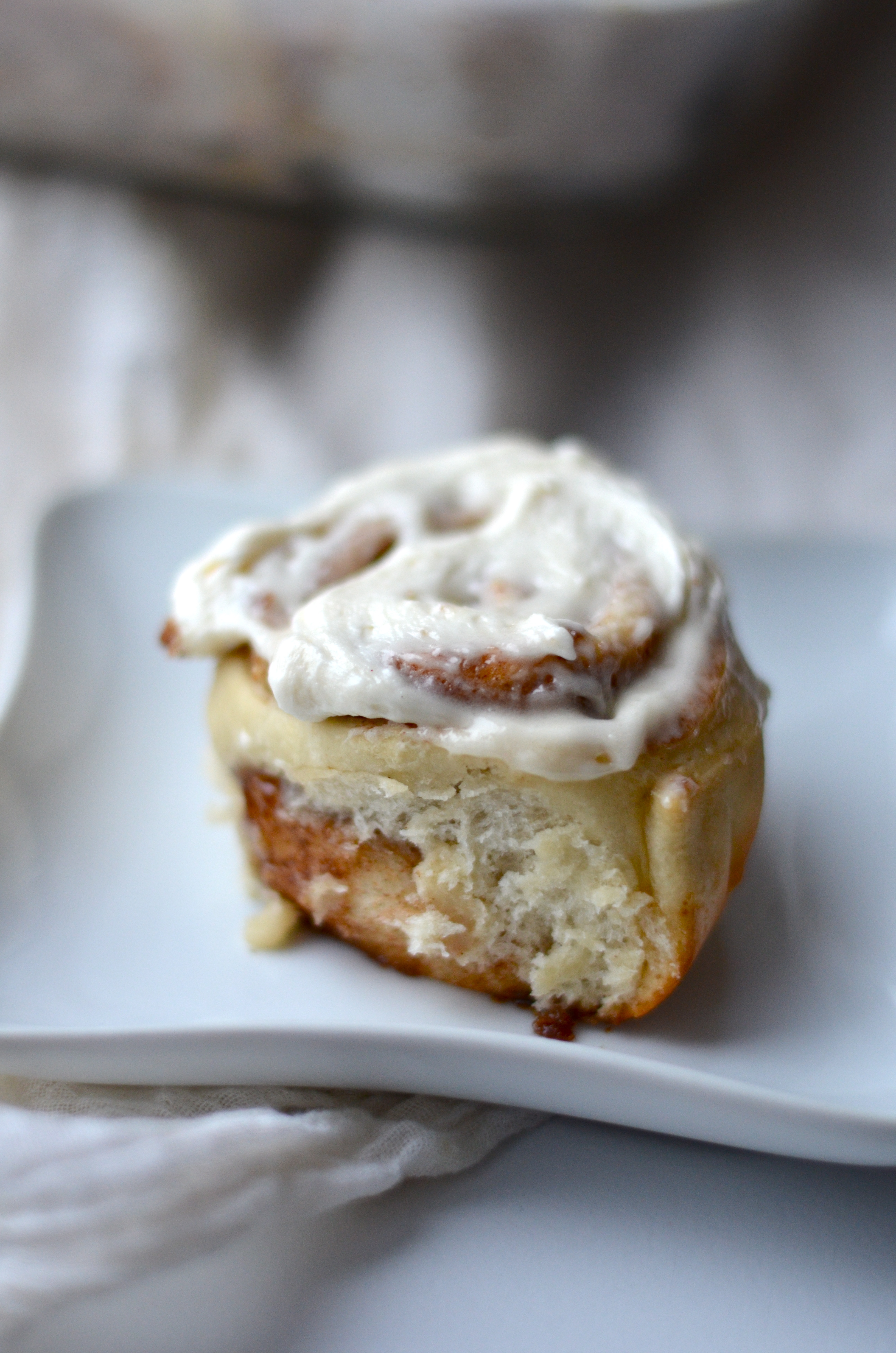 I have been meaning to make and share my favorite cinnamon roll recipe for a couple years and finally had the time to make them when Mikey was away one weekend (which resulted in me eating them for every meal). They are a bit time consuming, but if you have other things to do during some of the waiting periods they’re totally manageable (and worth it). Any time I see a cinnamon roll on a menu I am tempted to get it. The smell of Cinnabon at the mall gets me every. single. time. There is something about that cream cheese frosting melting into the doughy cinnamon and sugar that I literally can’t say no to! As I write this I am having a super hard time telling myself not to go get a cinnamon roll for lunch!
