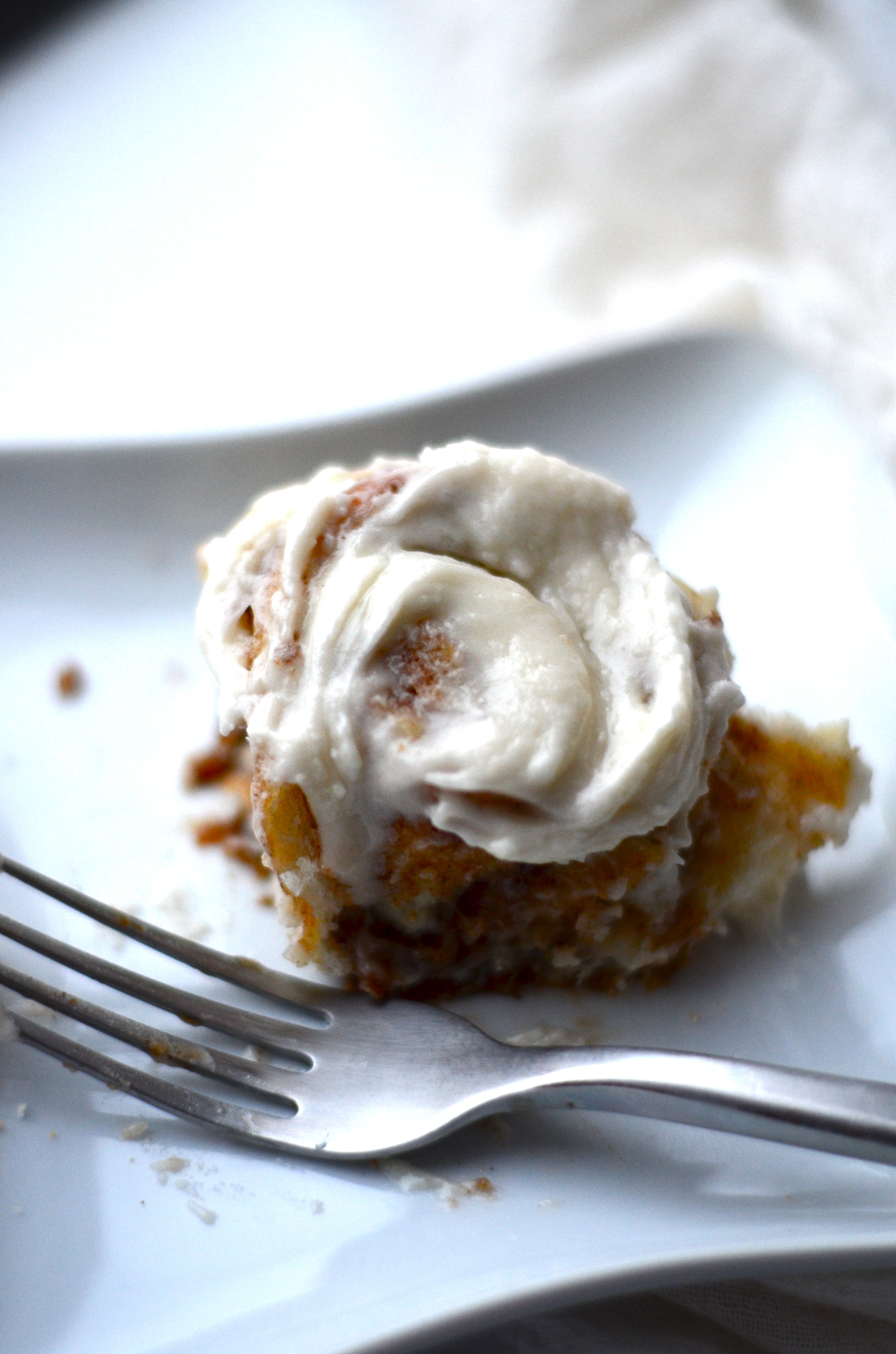 Remove rolls from oven and spread half the frosting over the top while still hot. The frosting will melt into the cracks. Then let cool (doesn’t have to be all the way, just not steaming hot) a bit more and add the rest of the frosting. Serve while warm or warm in the microwave before eating with a large cup of coffee!