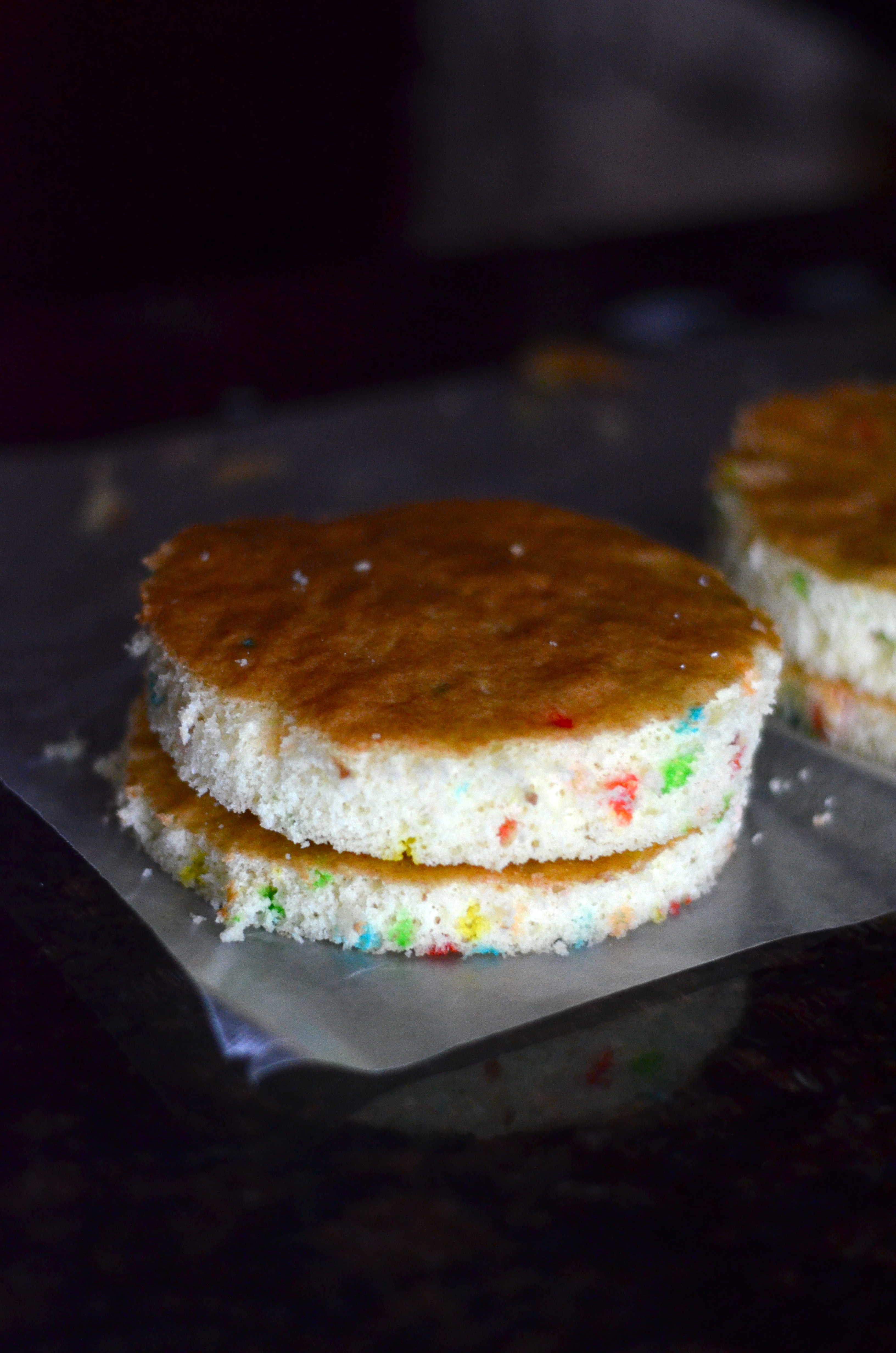 To make the small circular shapes, I placed a small bowl over the cake and cut out desired shapes. I then stacked them and cut them until they are even all the way around. I used a small enough bowl so I could cut 6 small circles out.
