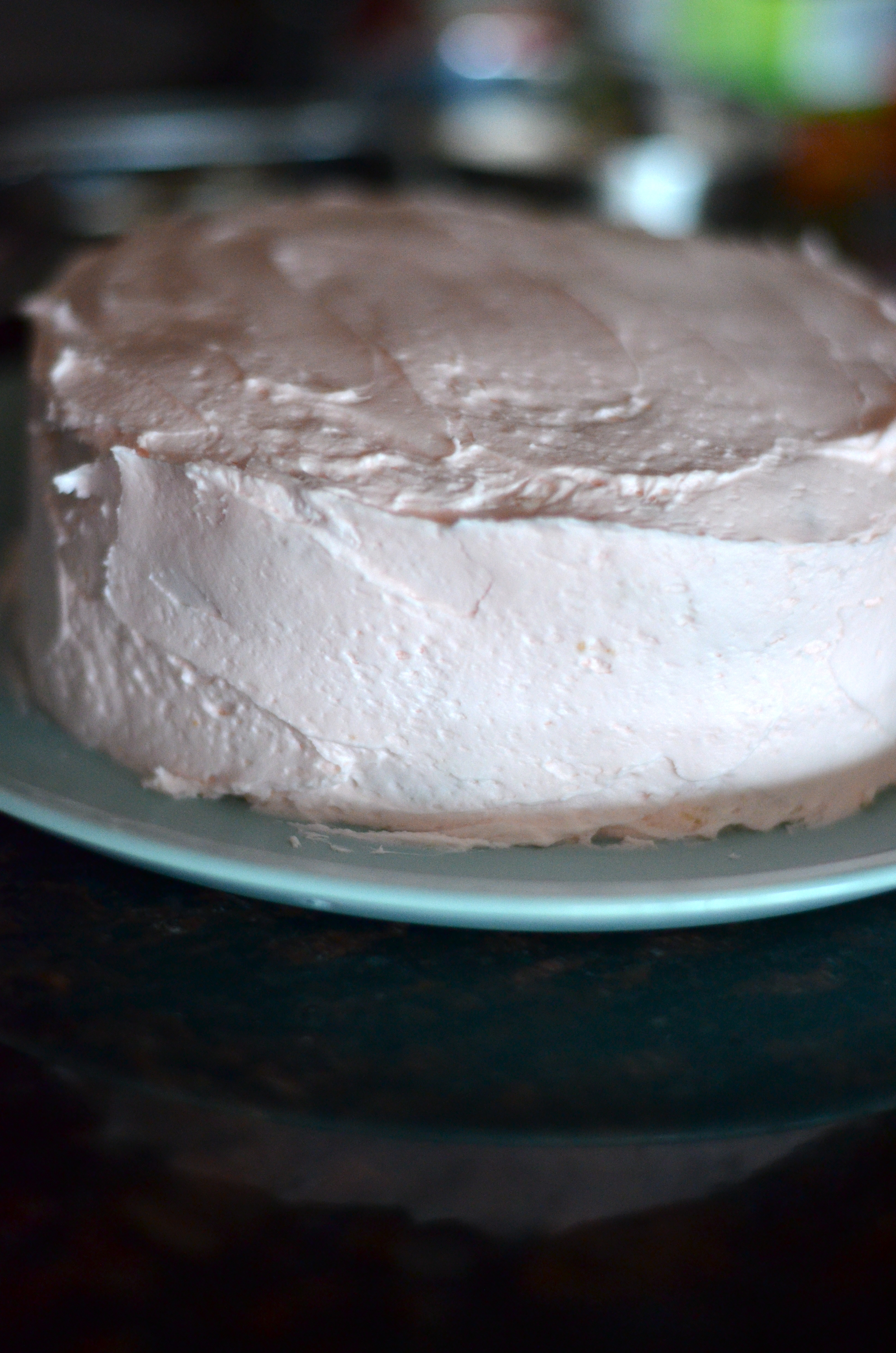 Once cakes are cut to desired shape, find similar shapes to use for the cakes. I stacked 2 layers of cake. To assemble, find a small plate and place bottom cake in the center of the plate. Take about 1/4-1/2 cup frosting and spread it around the top of the cake. Place the next cake on top.