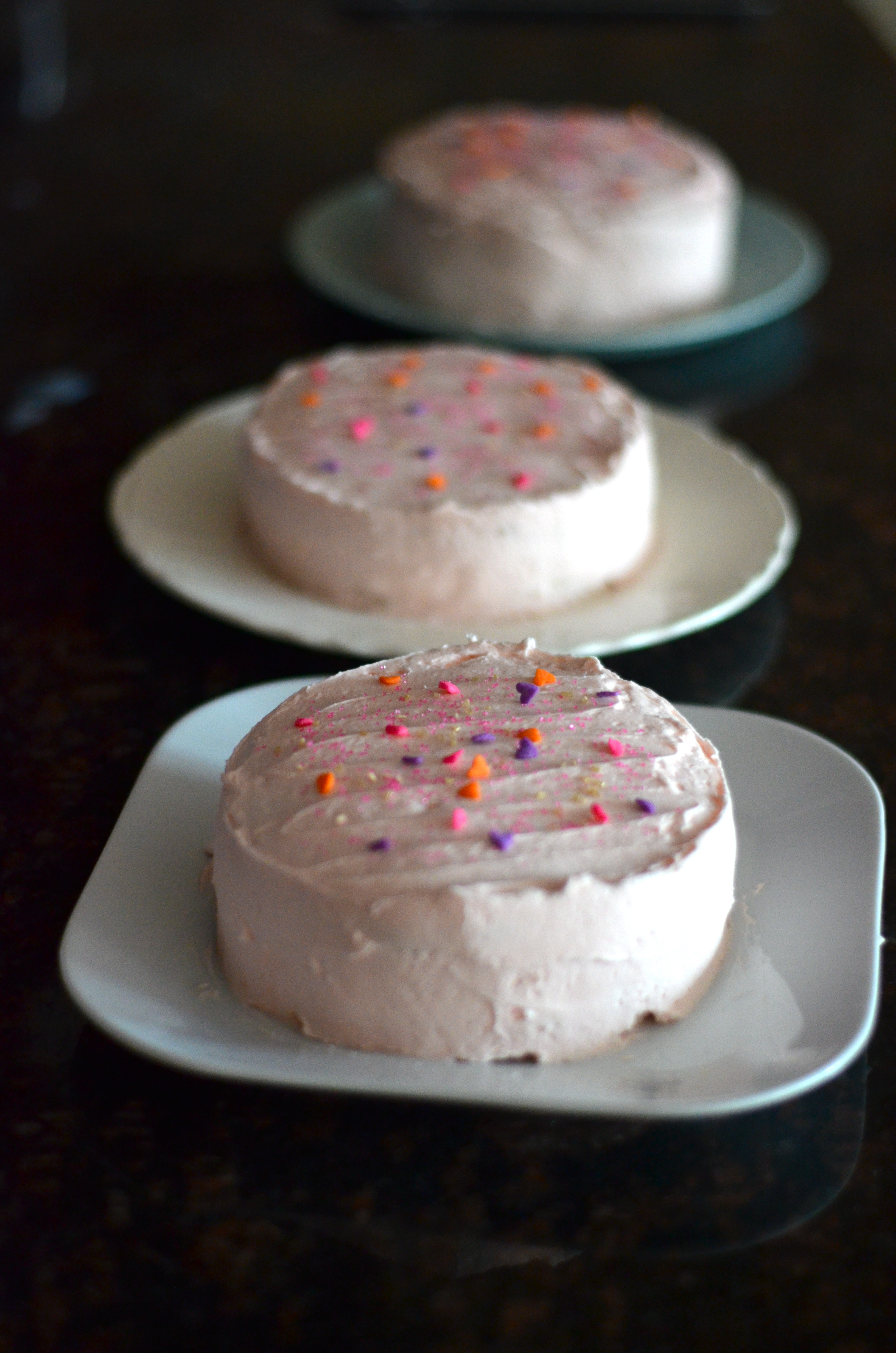 Once all the cakes are frosted, you can decorate them with fun sprinkles. Serve cakes at room temperature.