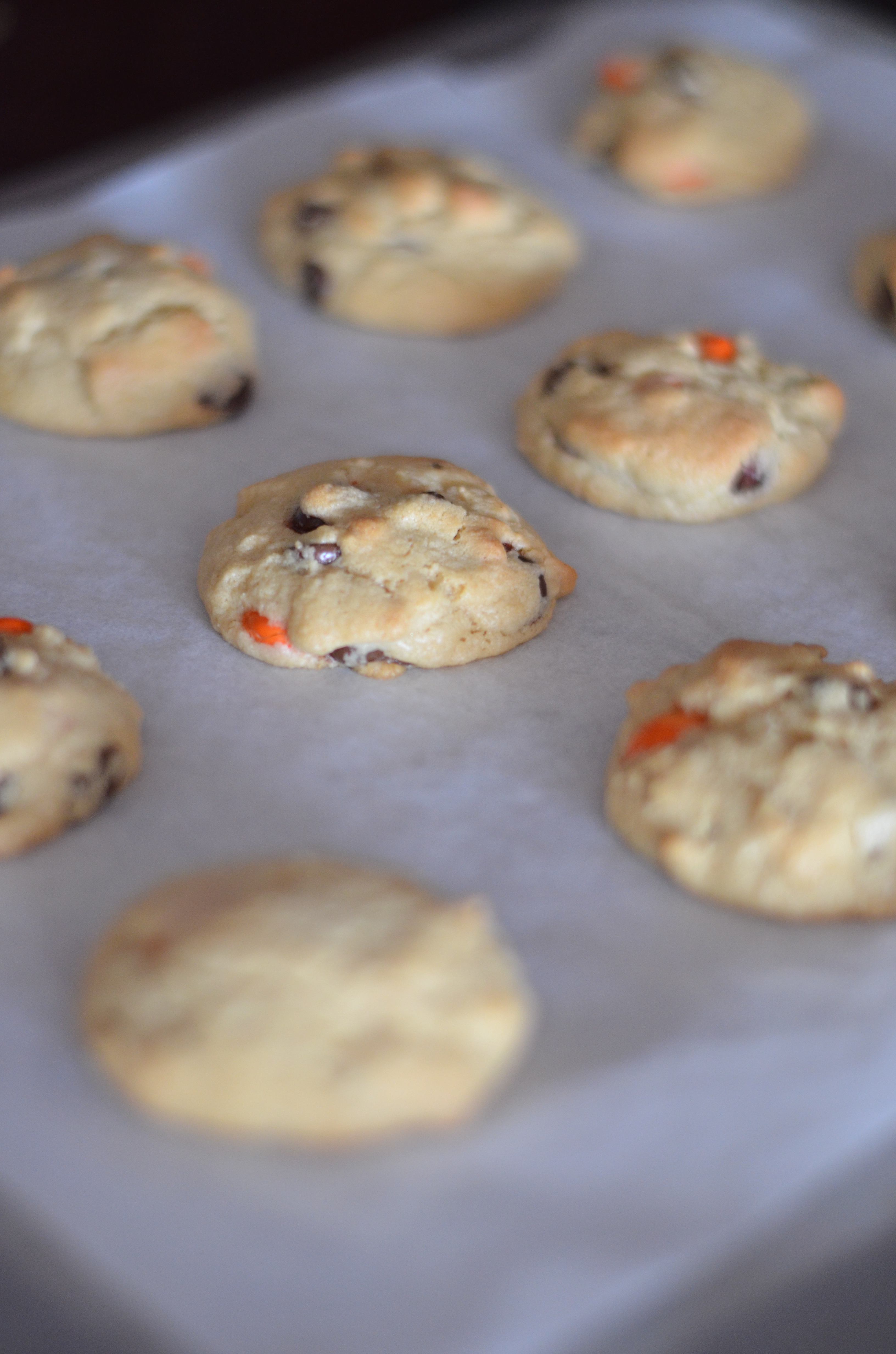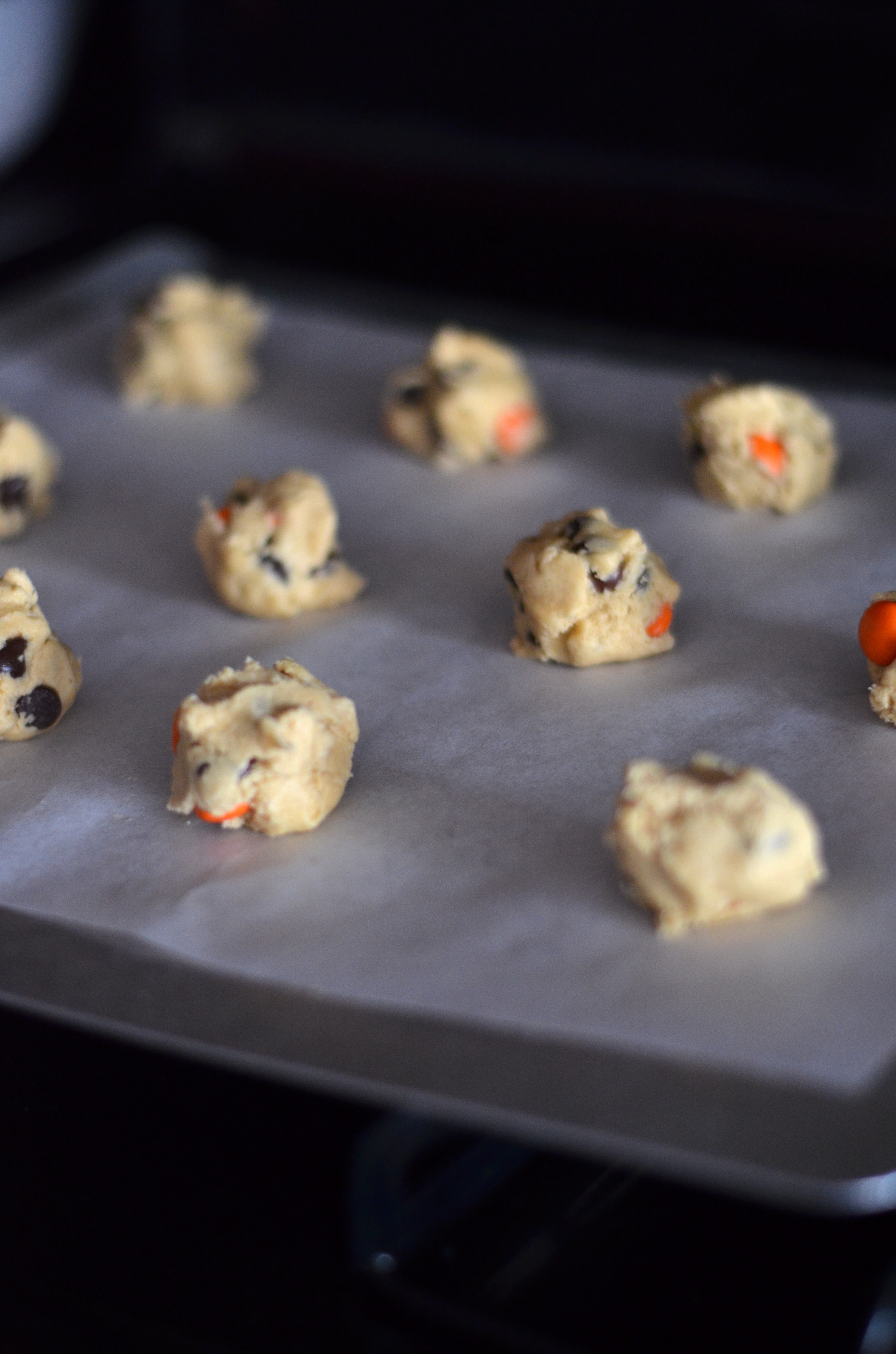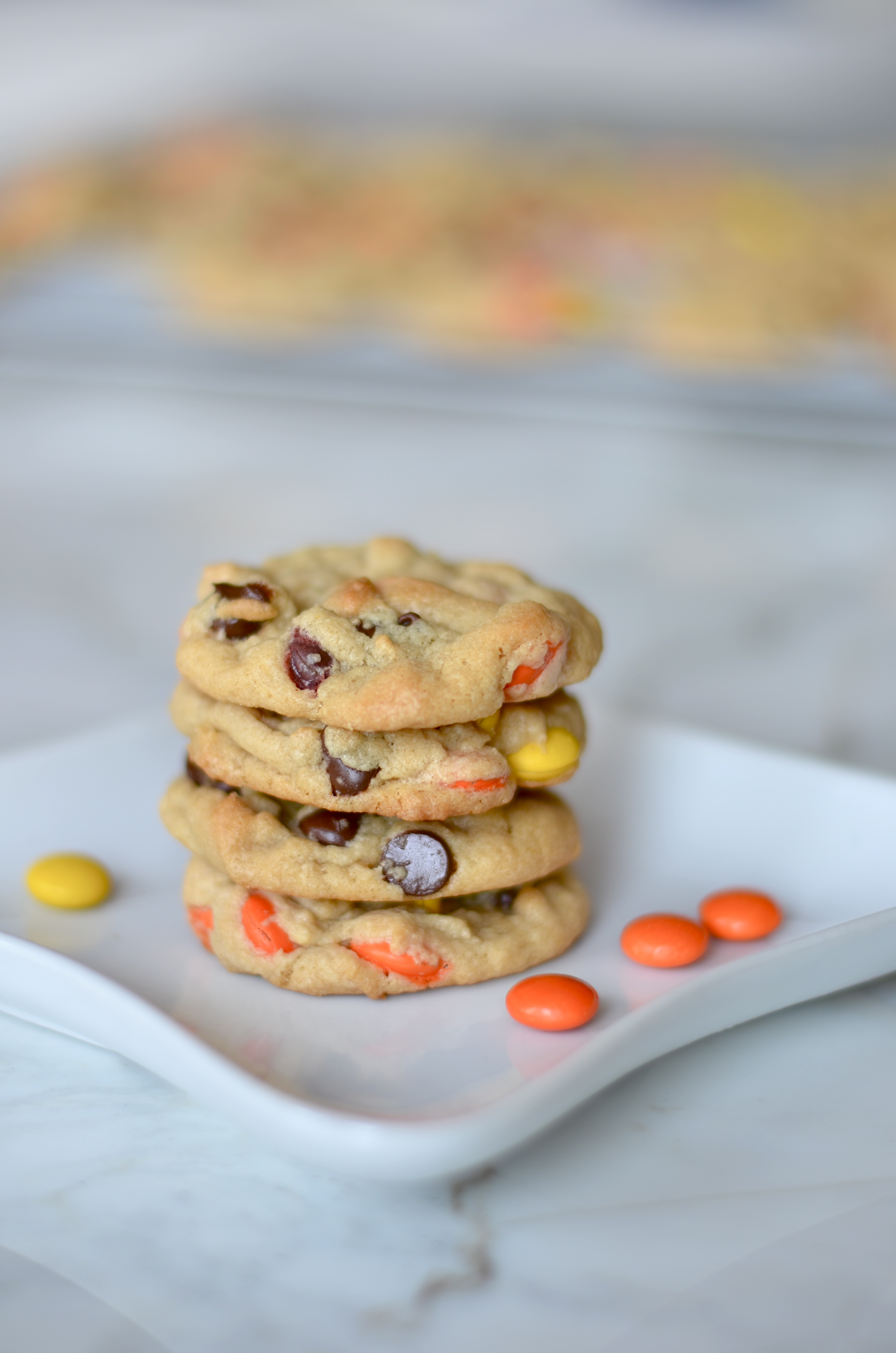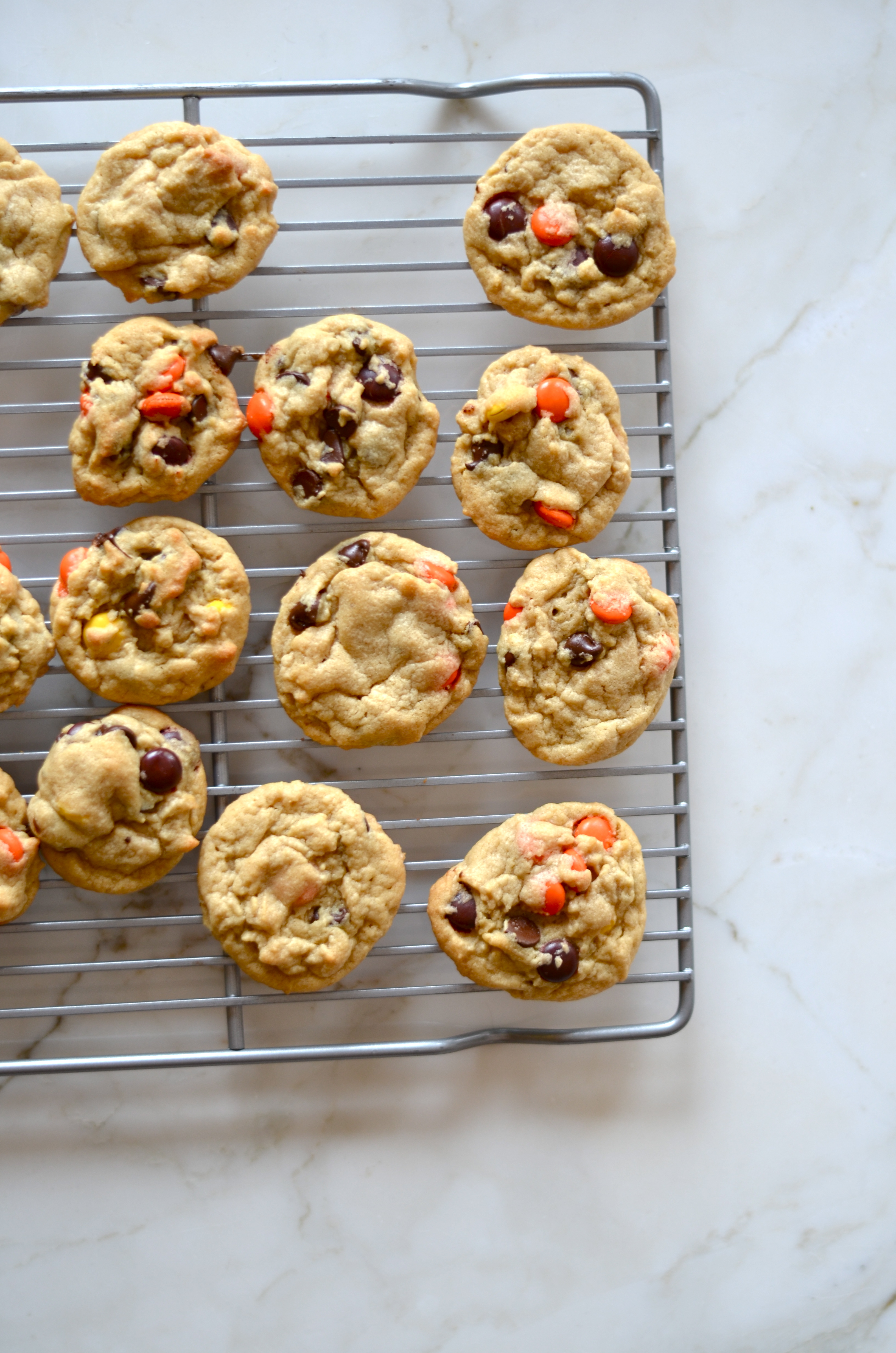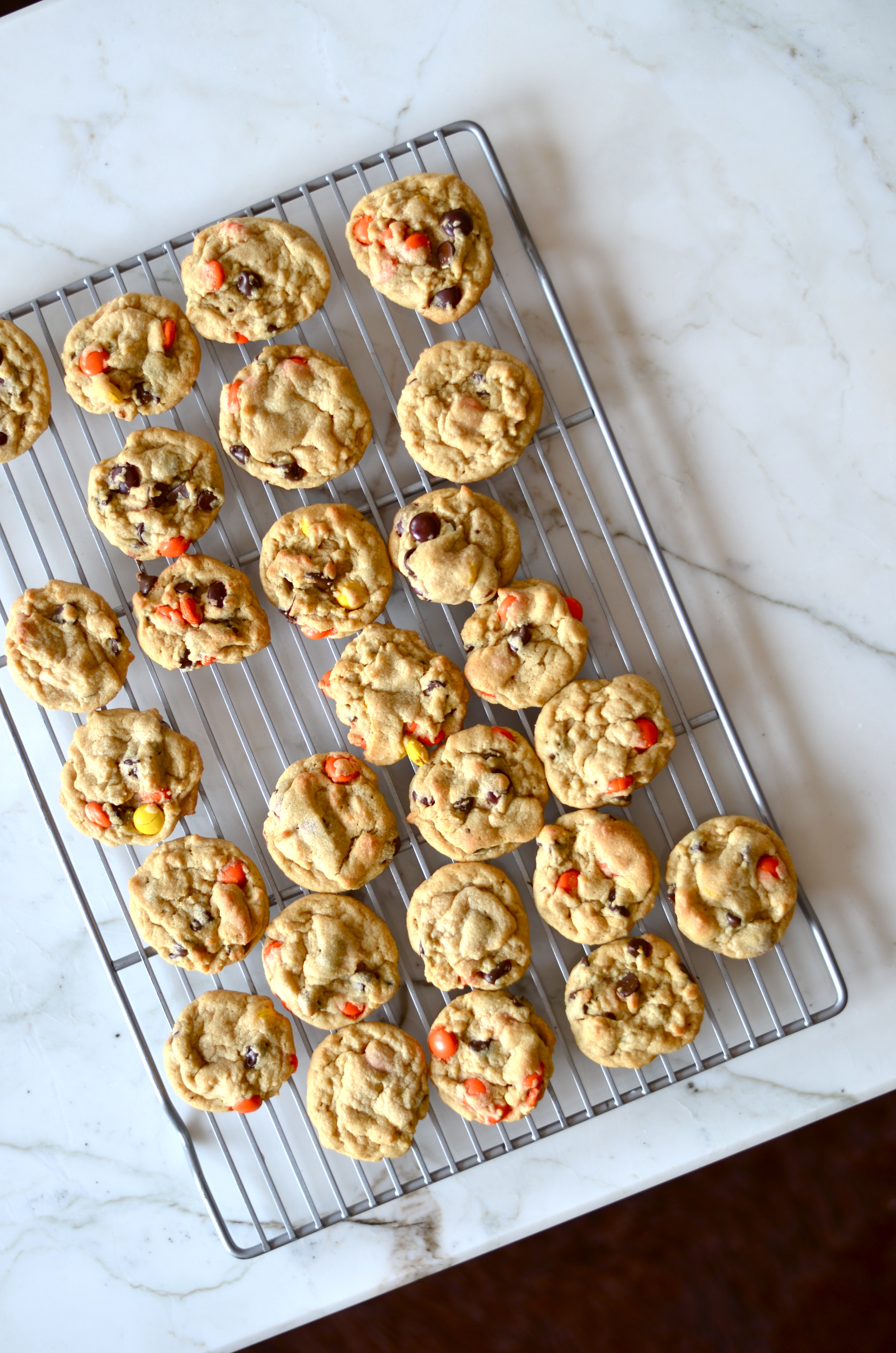A bit about these cookies: they are dangerously good. They are soft and chewy with a delicious peanut butter kick. We added Reese’s Pieces and chocolate chips to them which made the dough some of the best I’ve ever had. The secret ingredient that makes these extra tasty? A box of vanilla pudding. For some reason that magical bag of pudding powder adds the most incredible flavor and depth to cookies. I’m a big fan and know you would be too. Grady sure did love them!