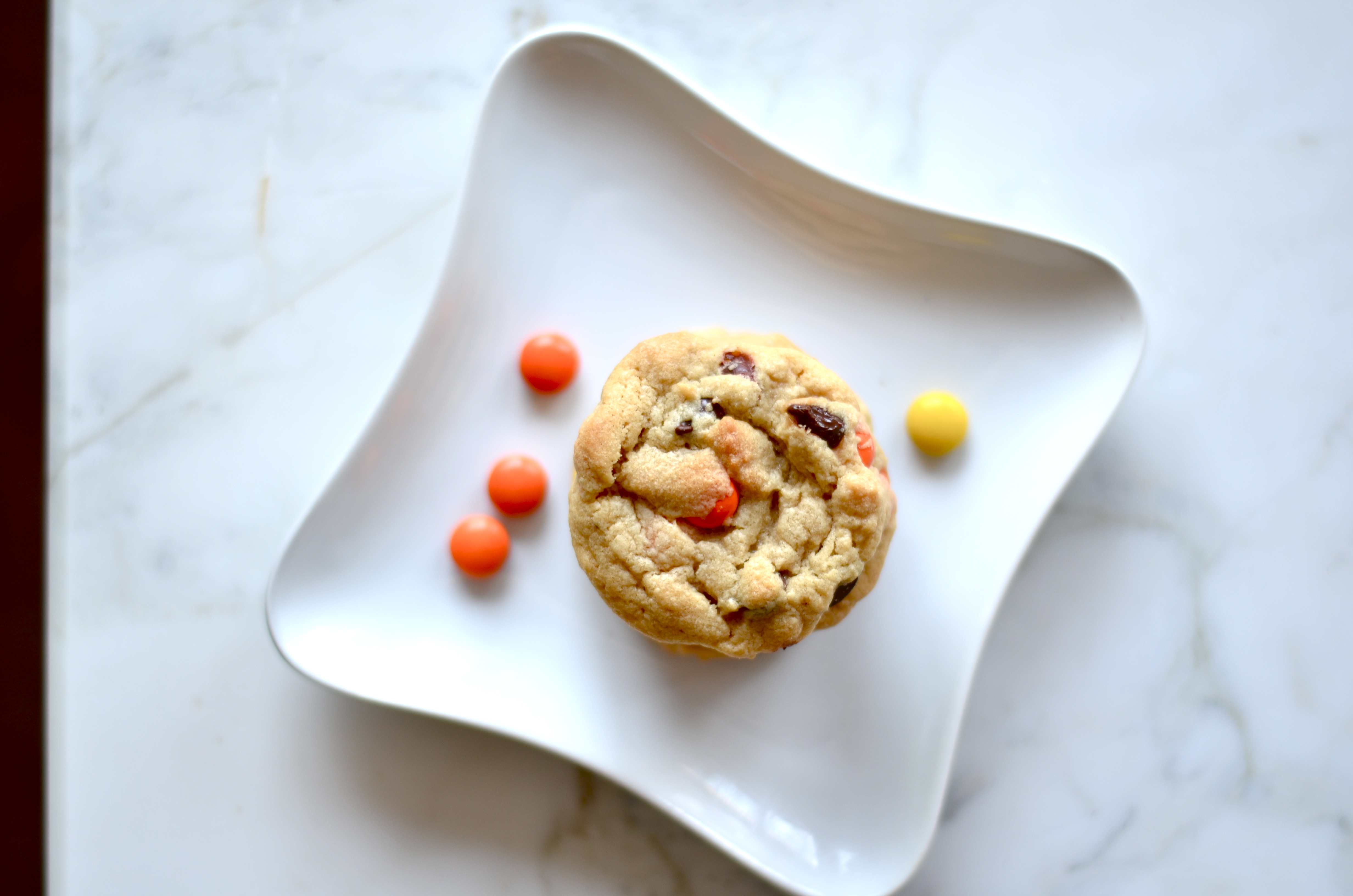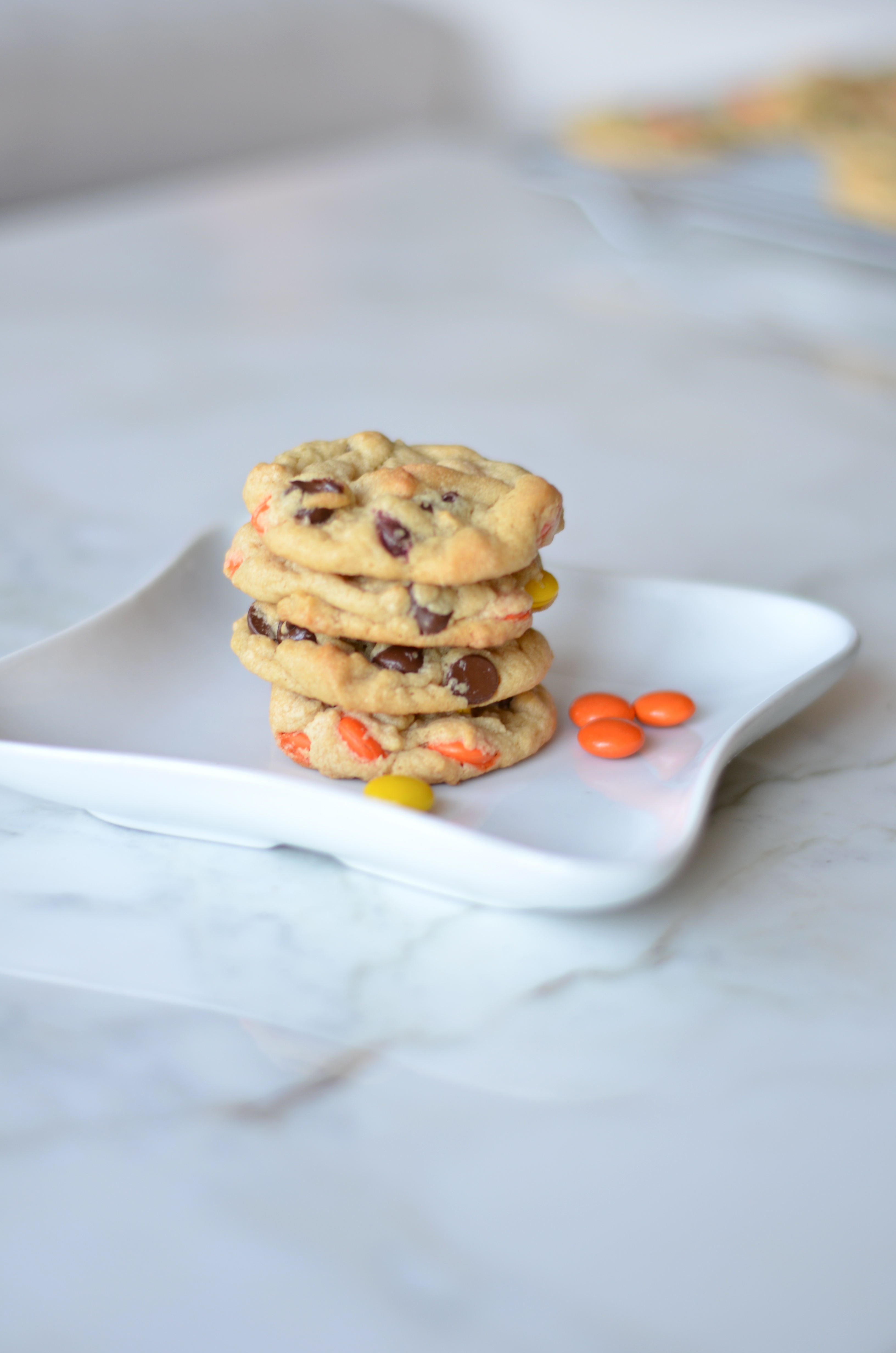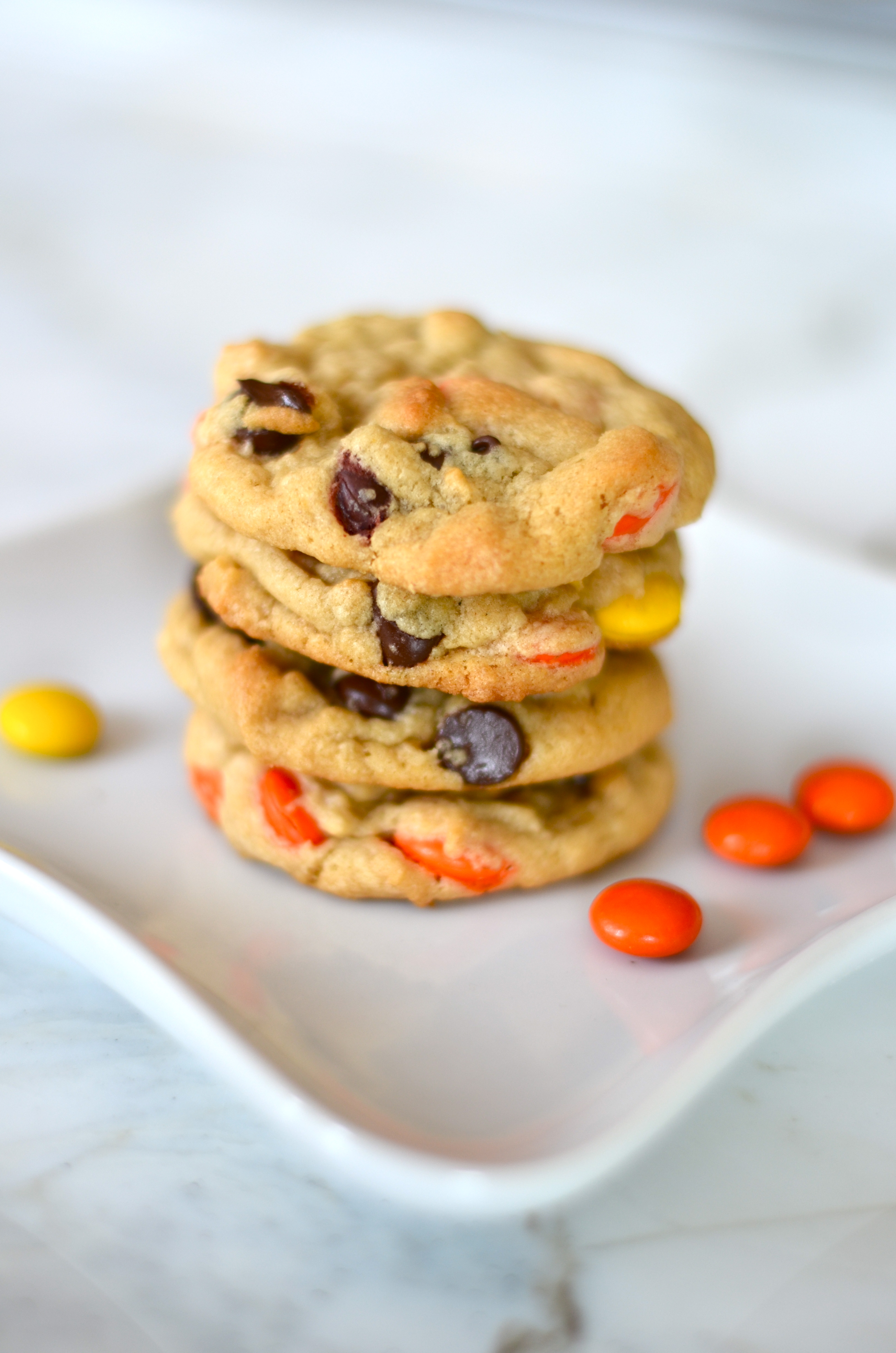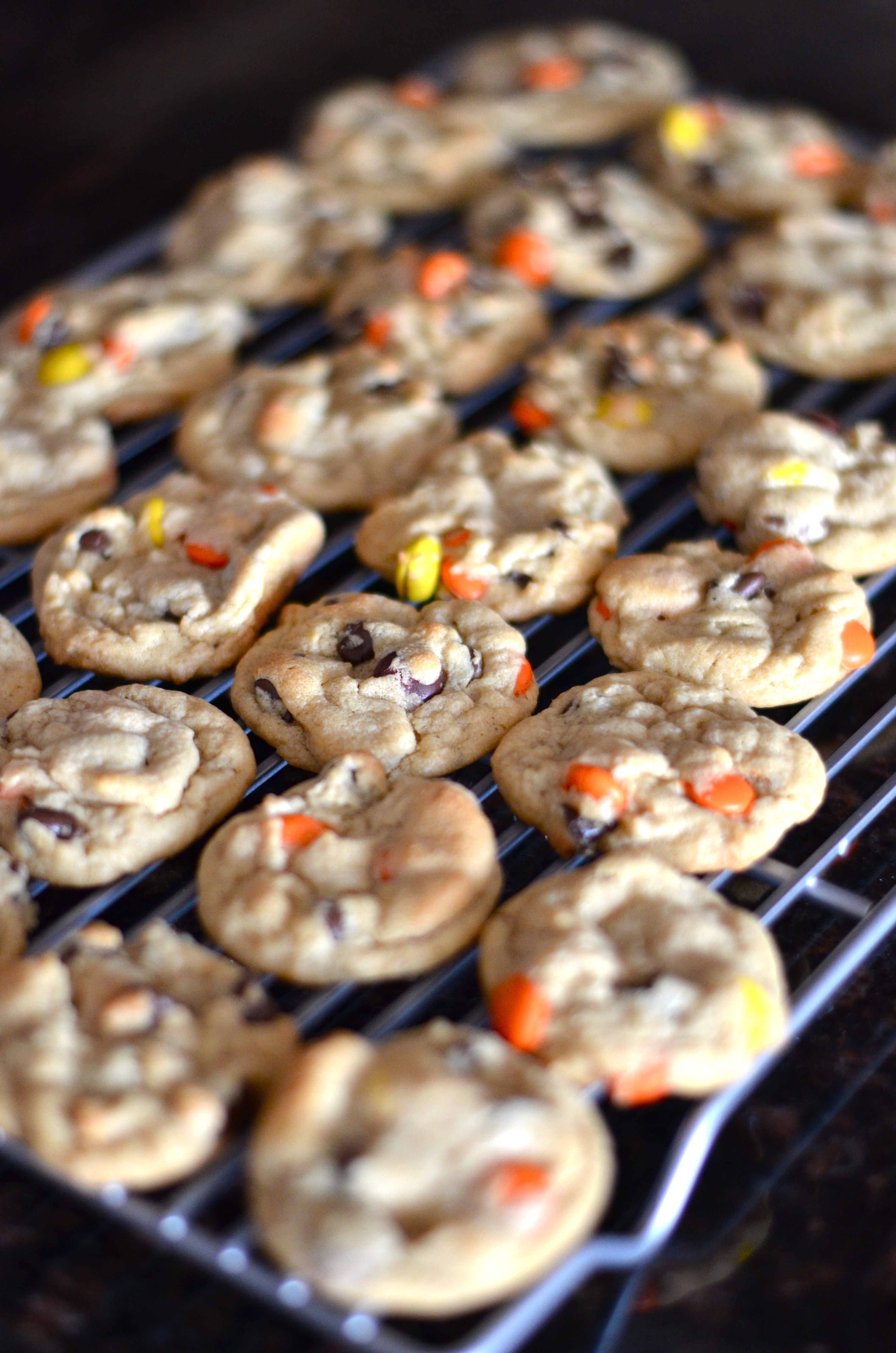Add chocolate chips and Reese’s Pieces and stir to combine.