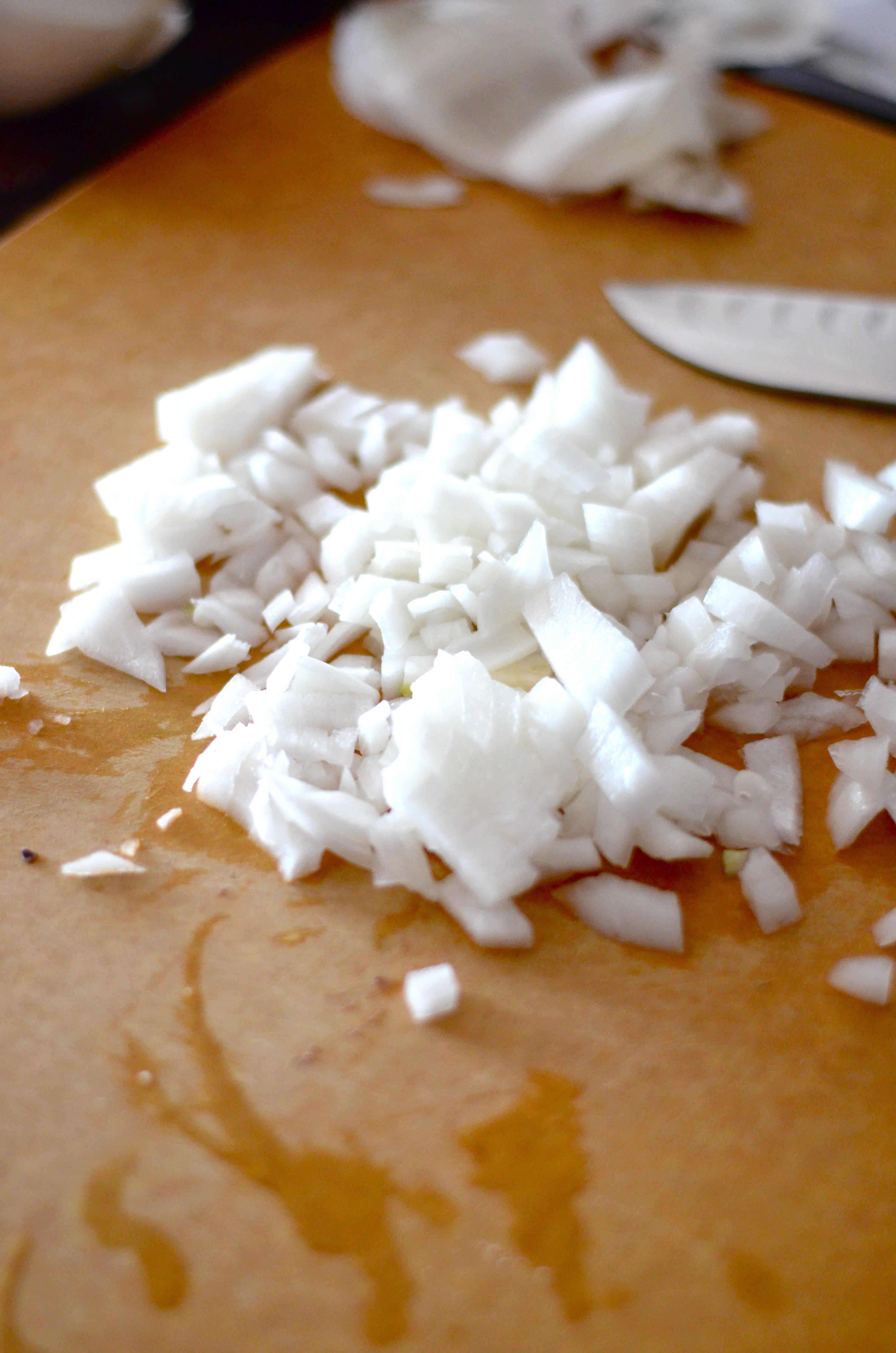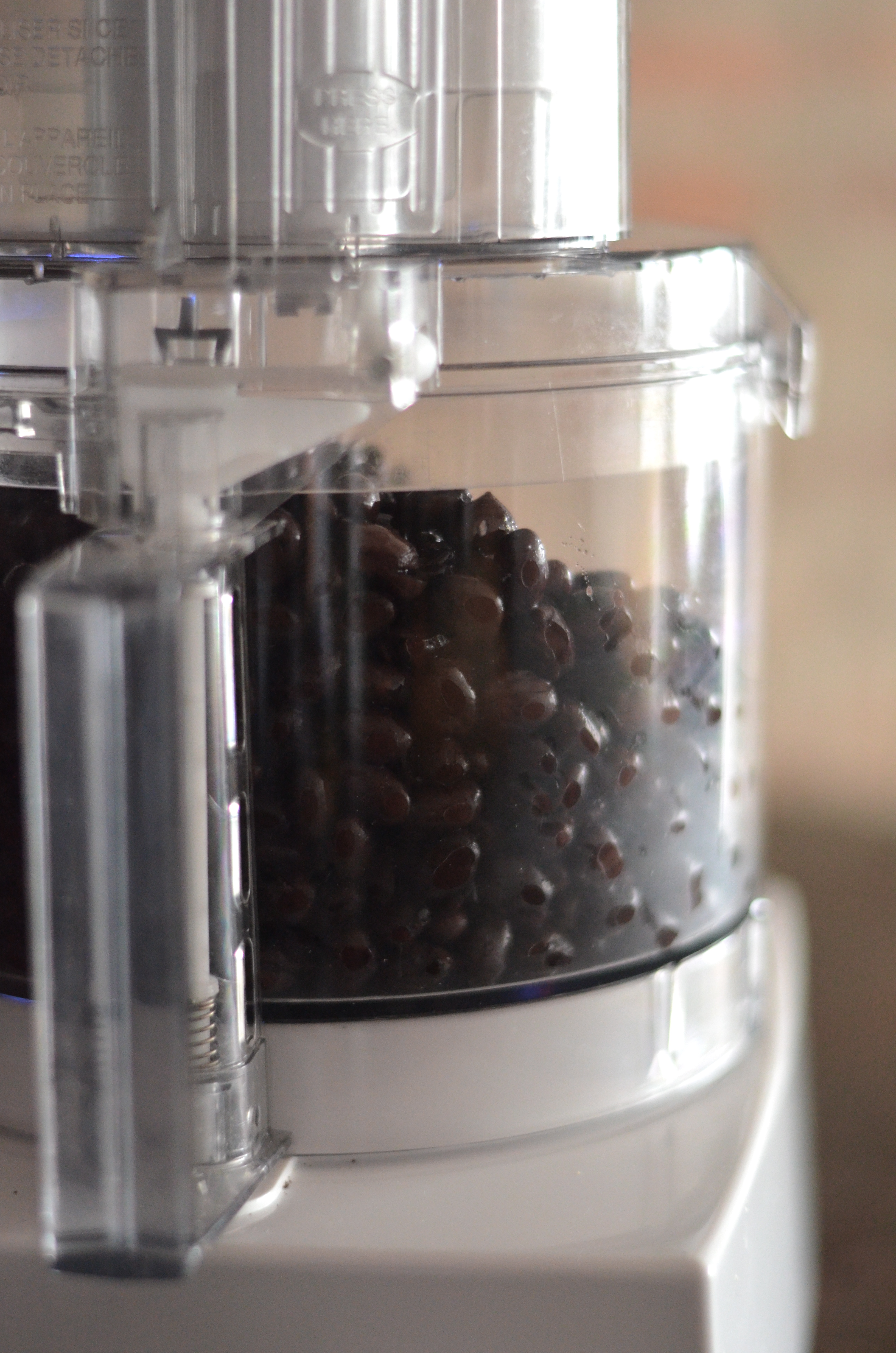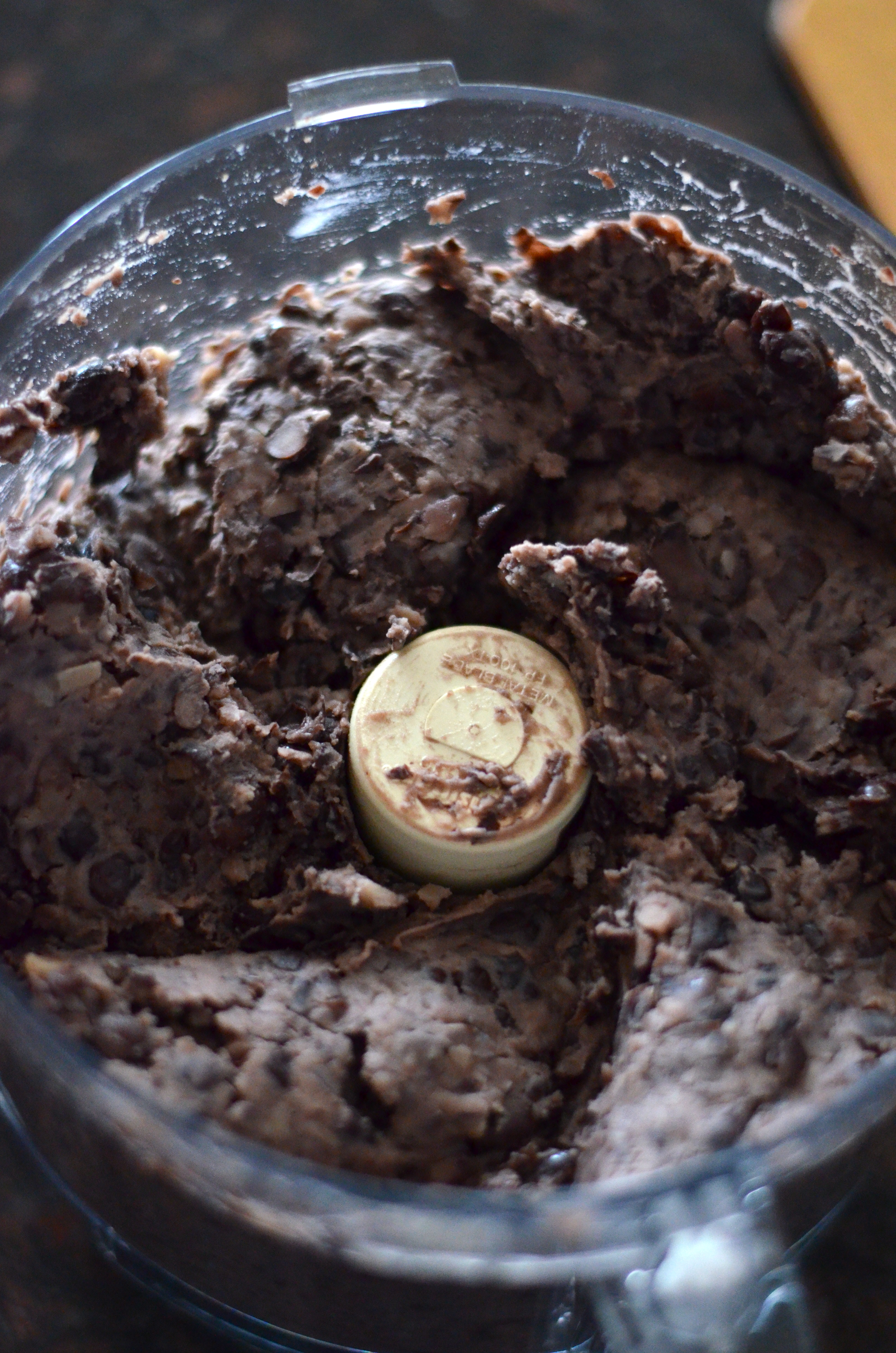 Pulse 2 cans of beans in a food processor (or you can mash by hand with a potato masher once you add beans to cooked onion and garlic mixture (I thought the food processor was way easier) until they reach a smooth consistency with still a few bean pieces remaining (again, more or less depending on preference).
