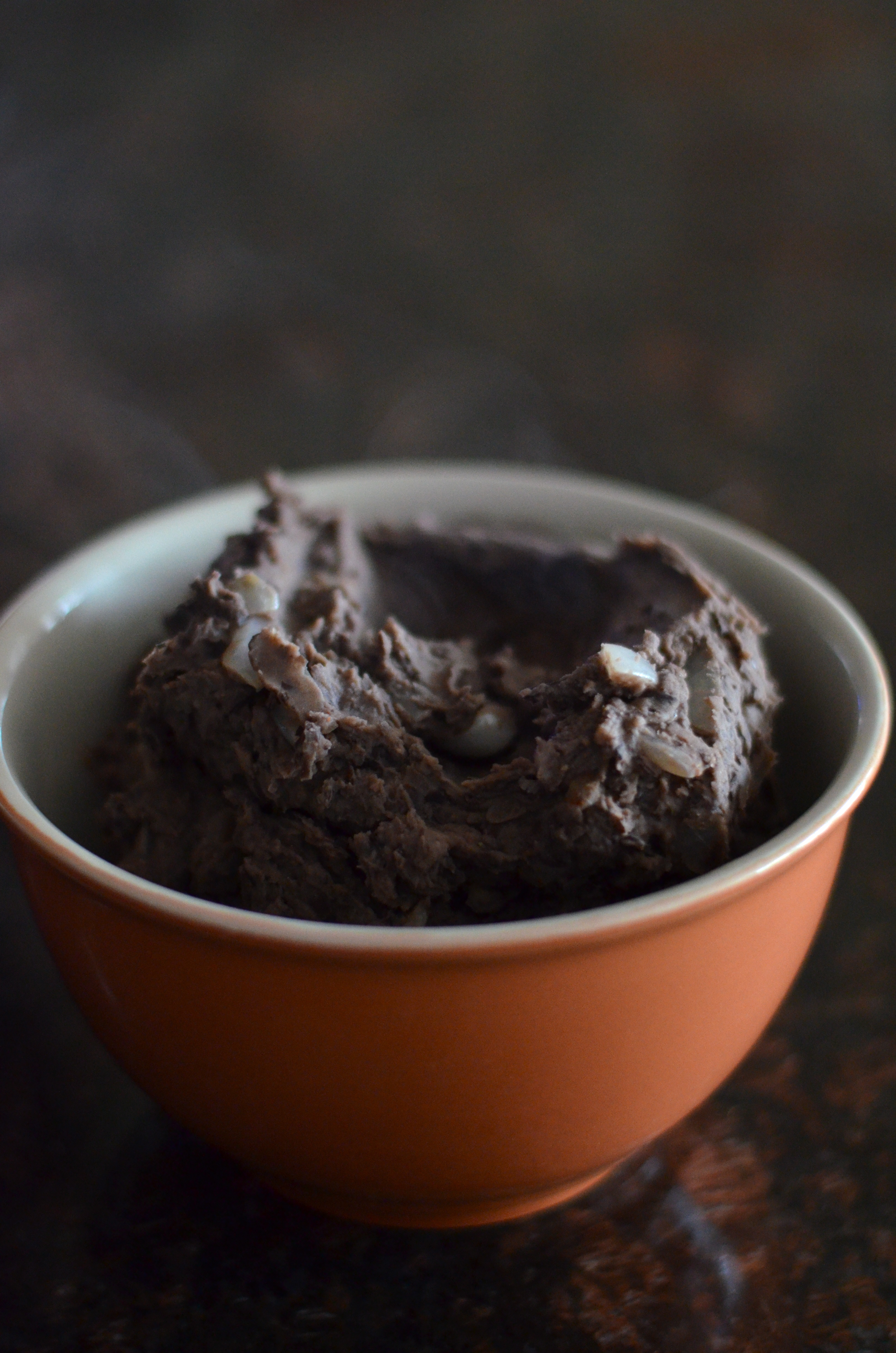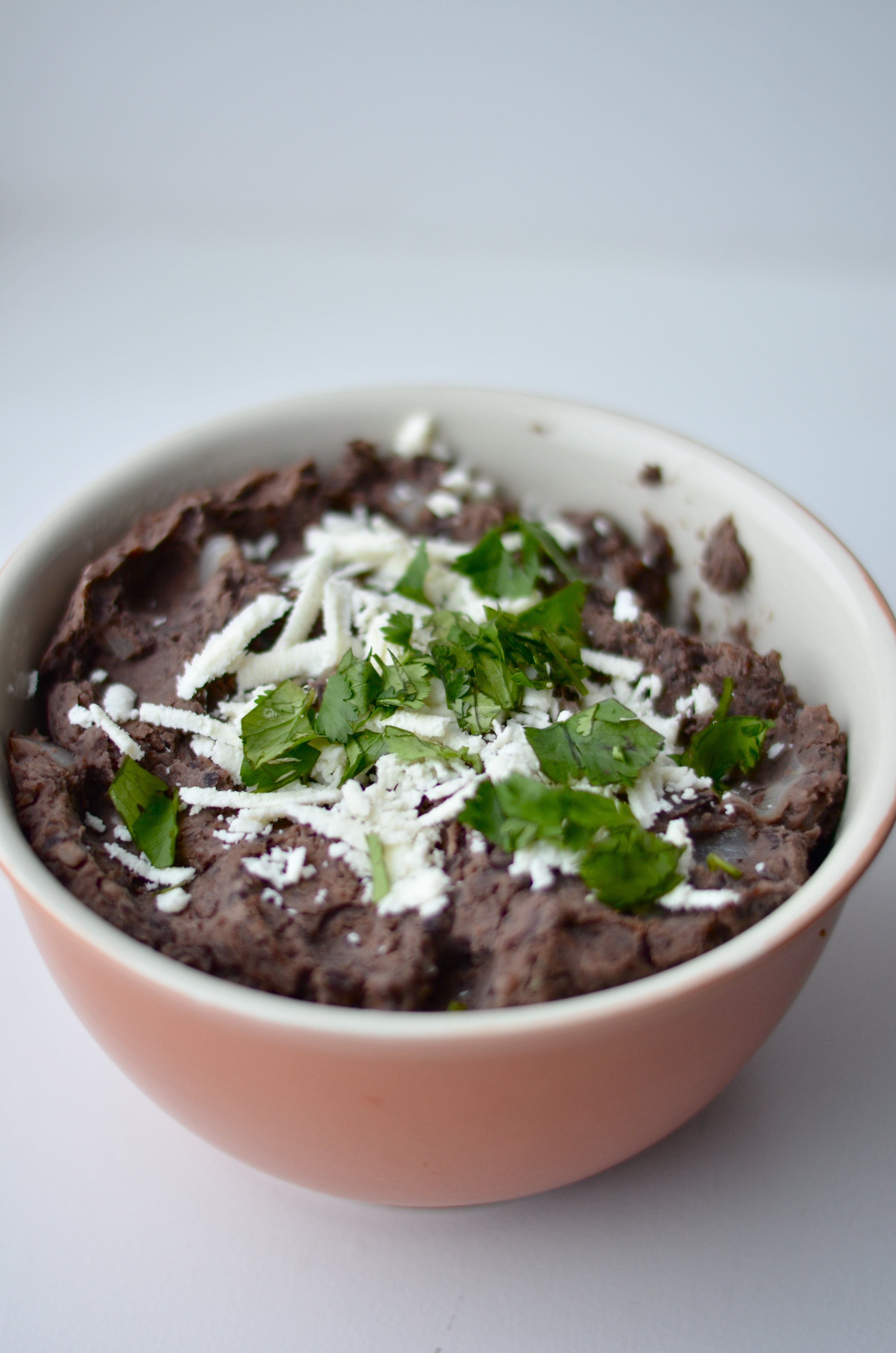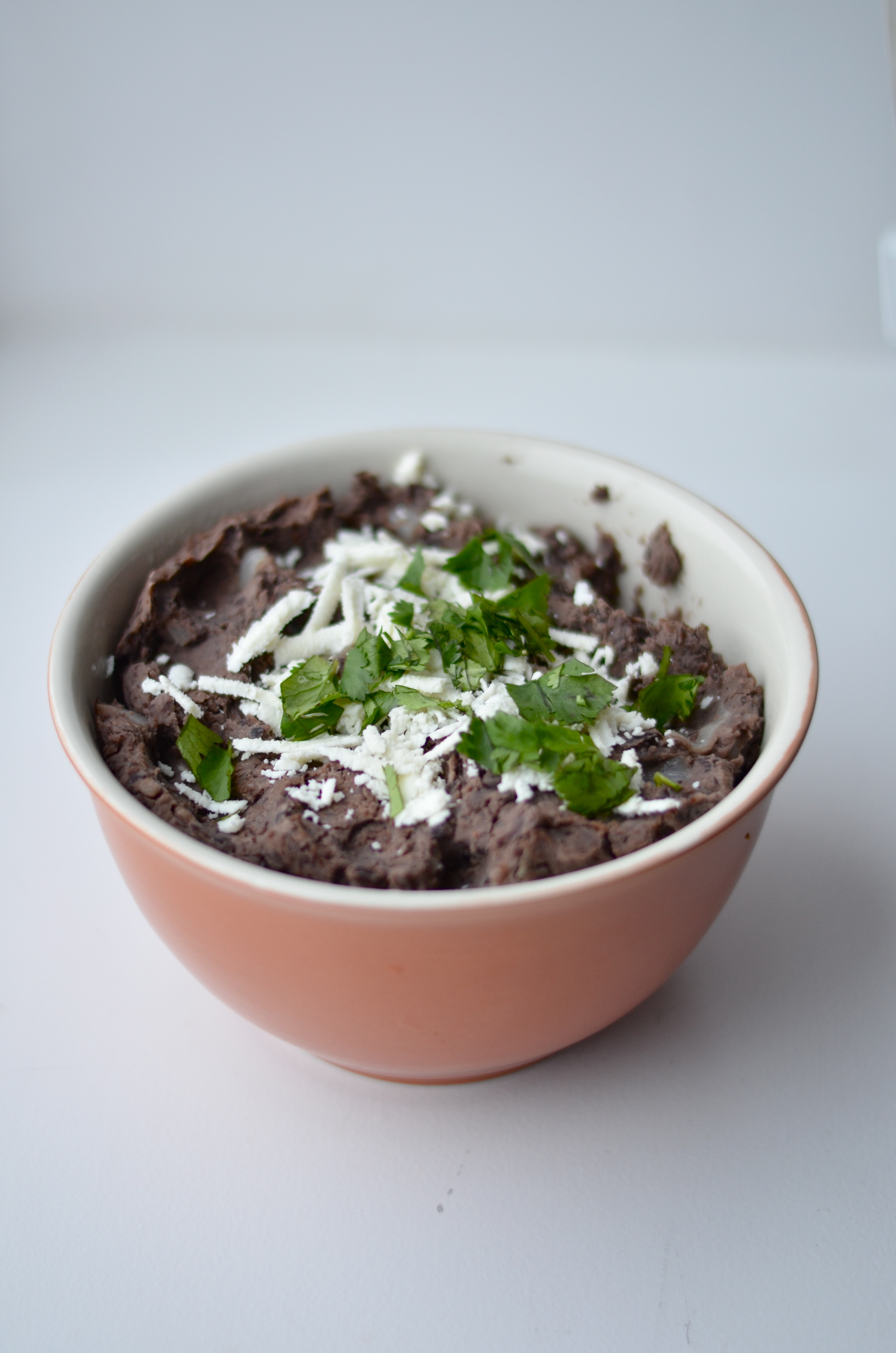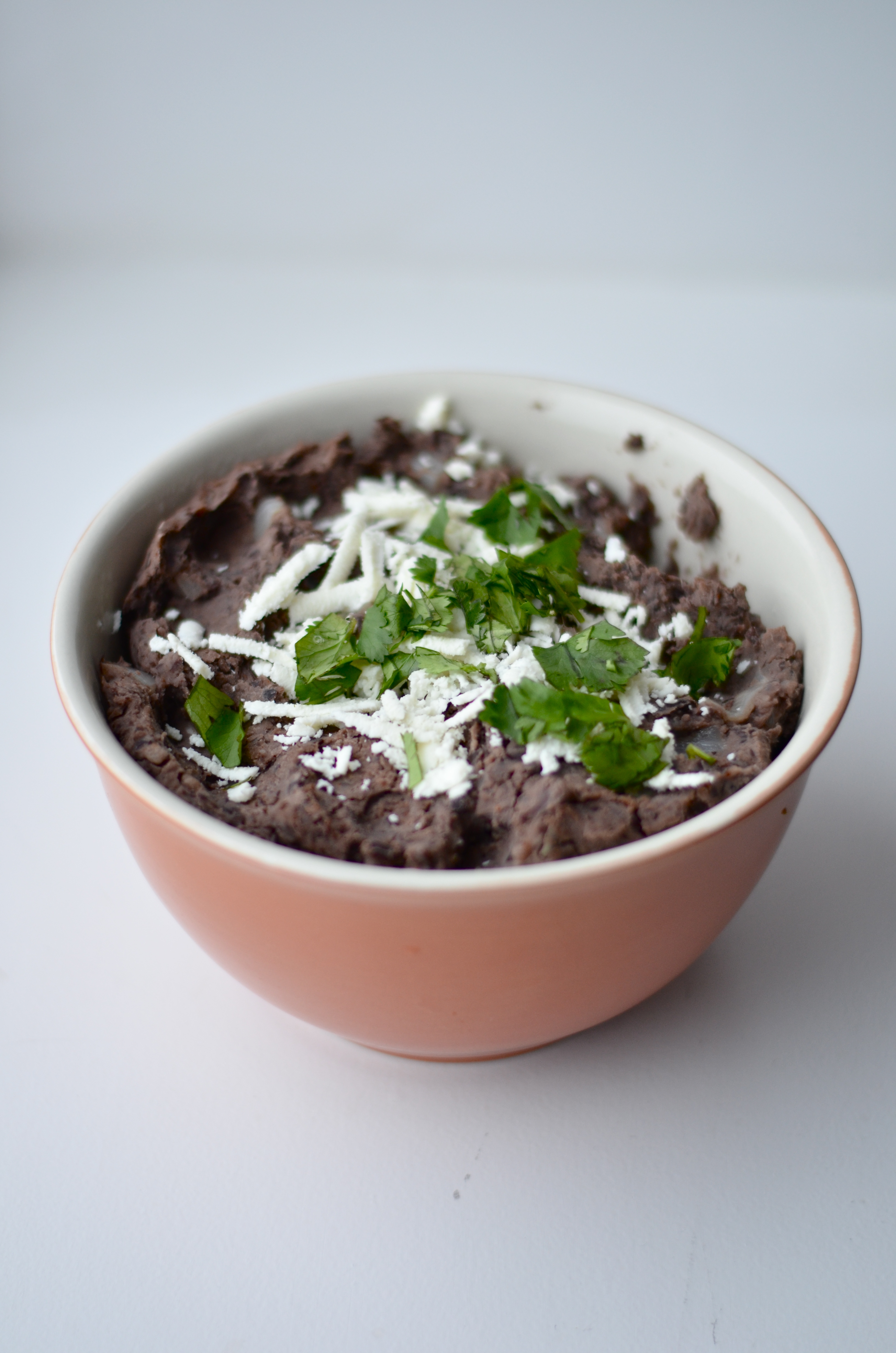 I don’t typically love refried beans. They are usually the one (and only) thing left on my plate after a Mexican feast. However, that has all changed. I couldn’t stop eating these refried black beans. It could be the fact that they are loaded with onion, garlic and a ton of spices. Or the fact that they were topped with queso fresco and fresh cilantro…
