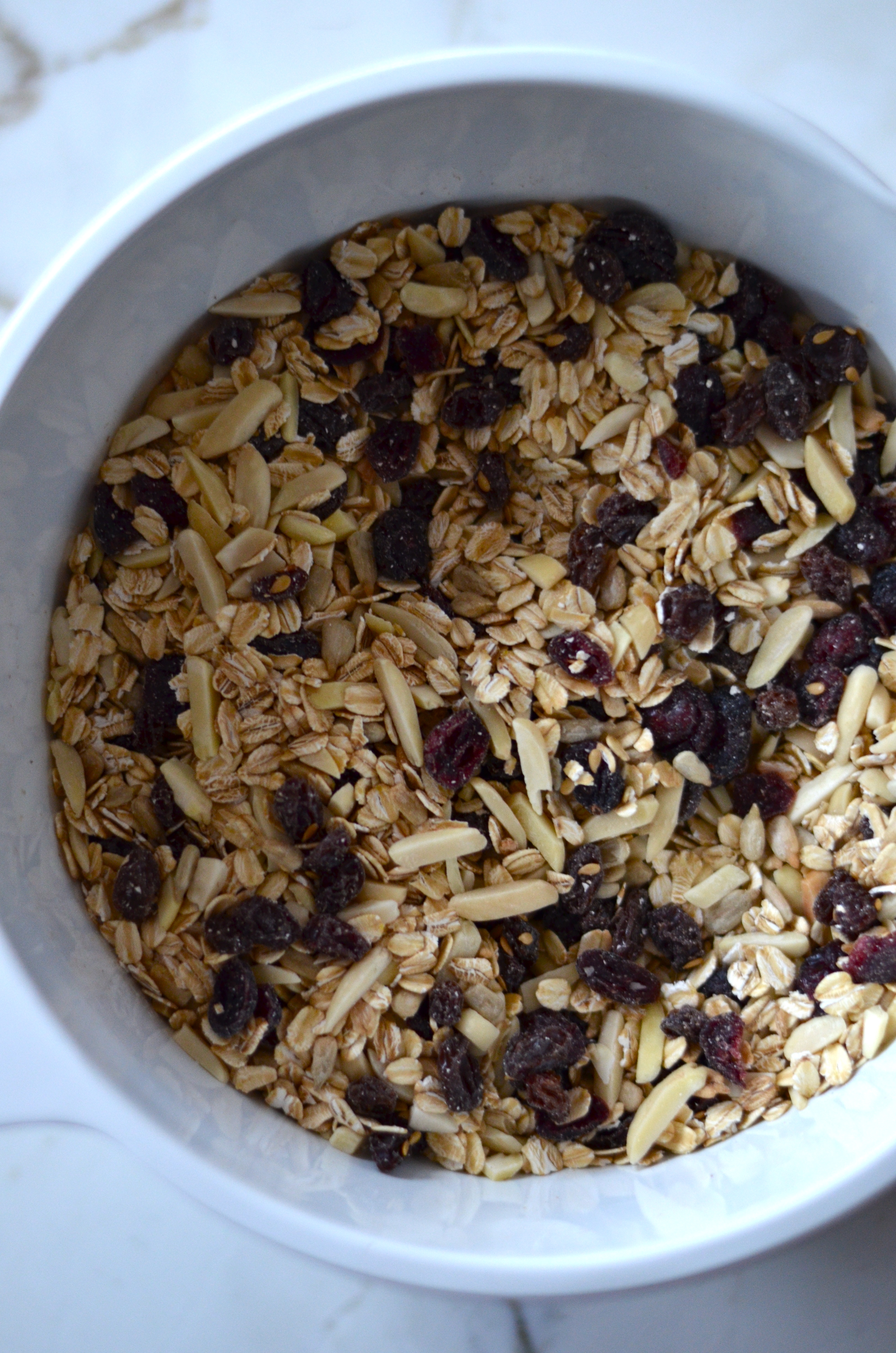 You start with oats. Then you add 1 cup of any nut of choice, and 1/2 cup of a smaller nut (Pepita, sunflower seed, etc). You then add your sweetener: Honey, maple syrup, agave, sugar. You choose spices or extracts of choice. You can also add shredded coconut, flax seed, chia or hemp seed. And then you choose a fruit or sweet addition (chocolate chip, craisin, raisin, dried banana, apricot pieces).