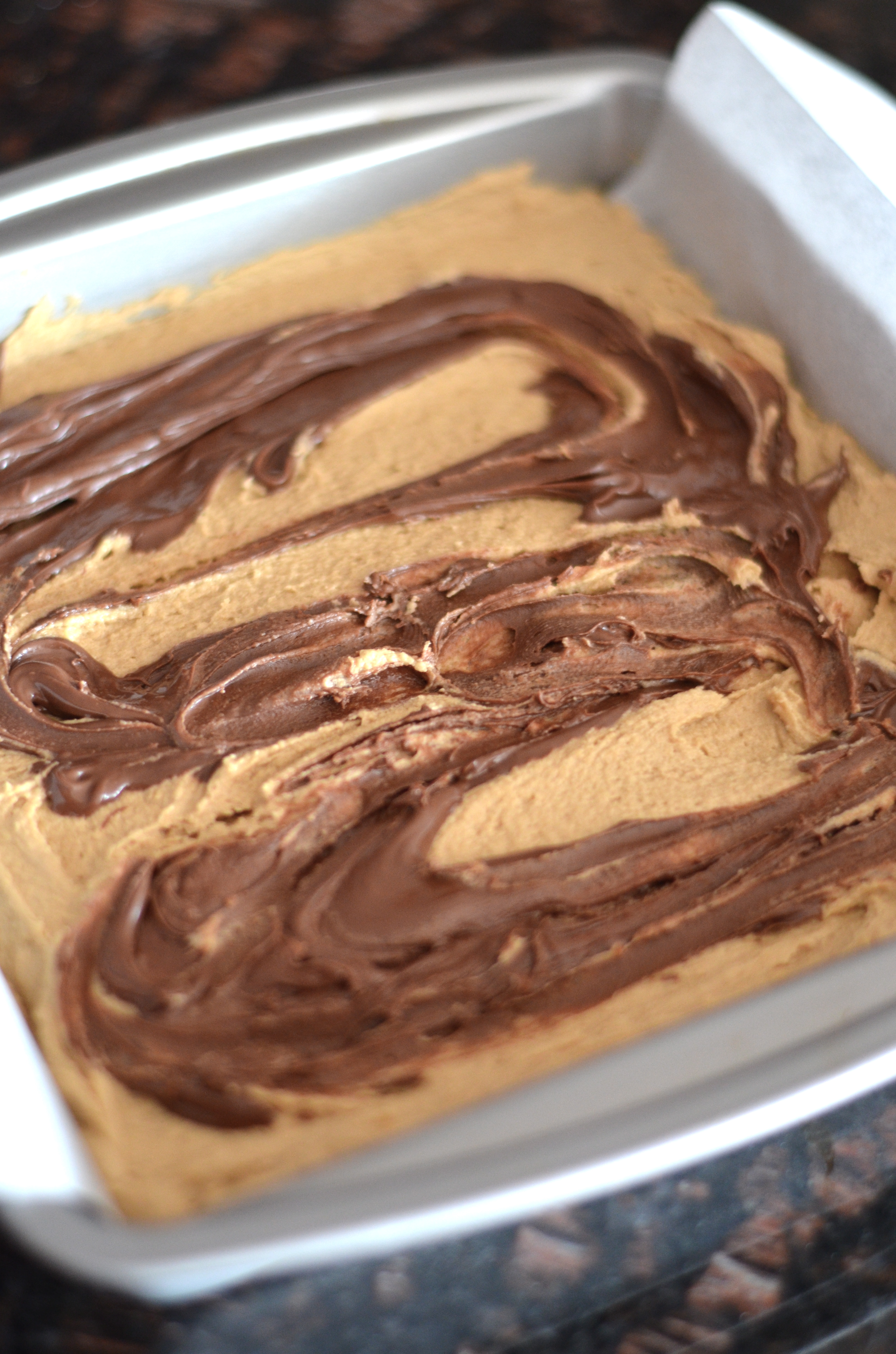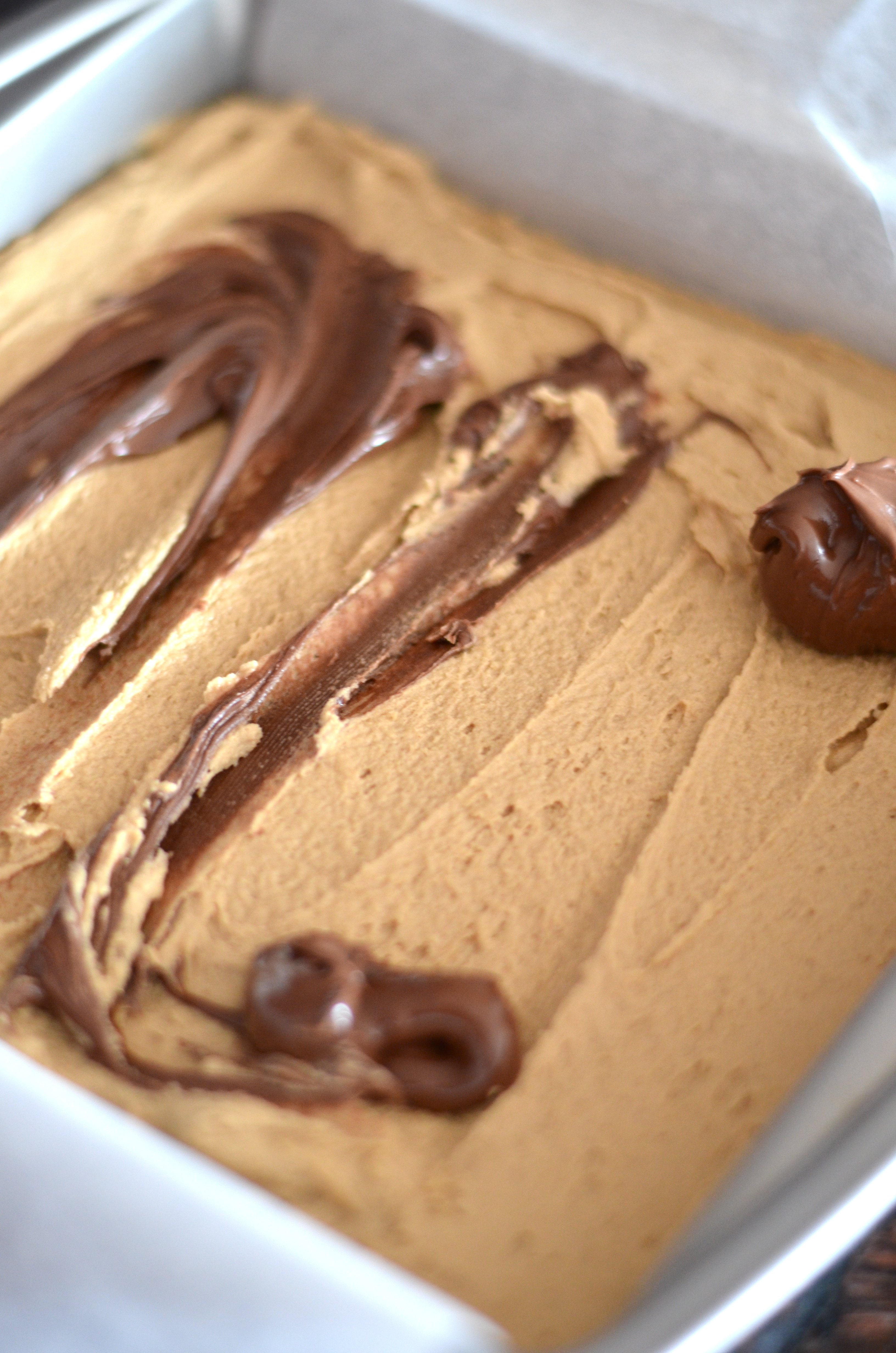 Dollop Nutella over batter and swirl around with the tip of a knife.