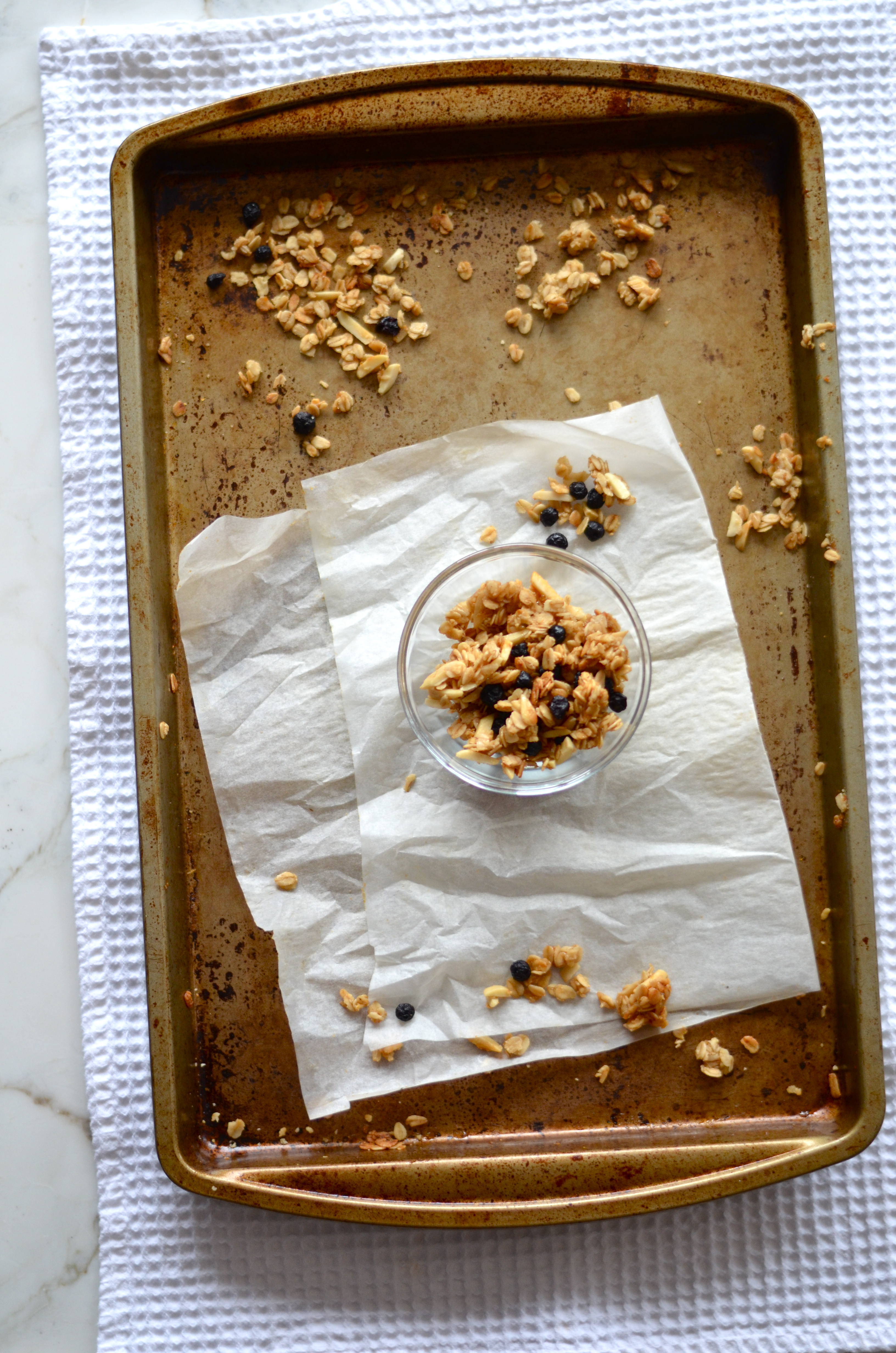 Cook for about 10 more minutes or until the granola is just browned and then let cool on sheet completely without touching. Granola will stay in bigger clusters if you let it cool without touching it. Once granola has cooled, break into clusters and stir in dried blueberries (do this after, if you bake them you will break your teeth!). Serve over yogurt, with any milk of choice or by itself as a snack!