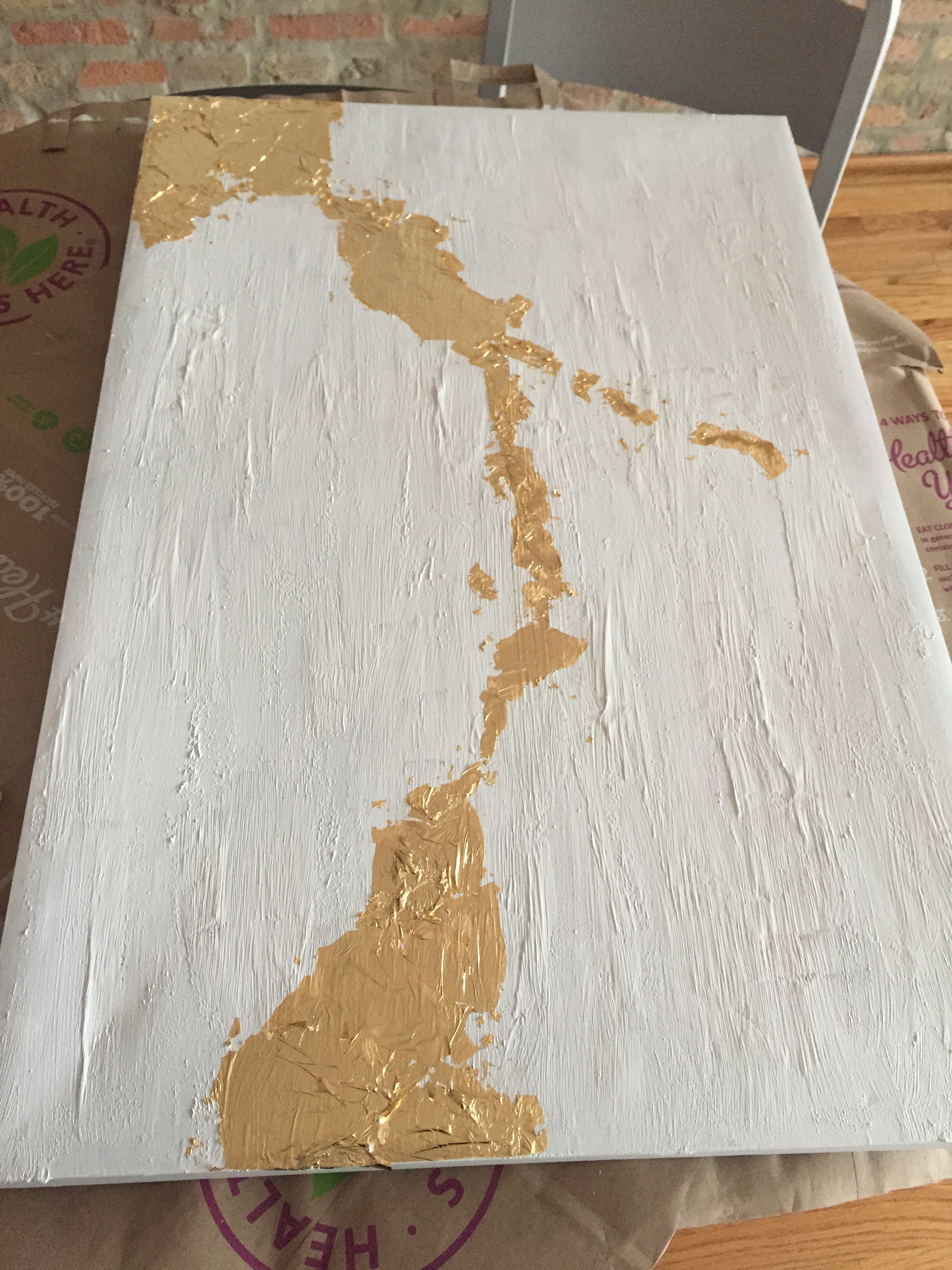 I painted it on sporadically and let it dry. I then painted over the entire canvas, sides included, with white house paint we had lying around. I let it dry for the most part and then began to apply my gold leaf.