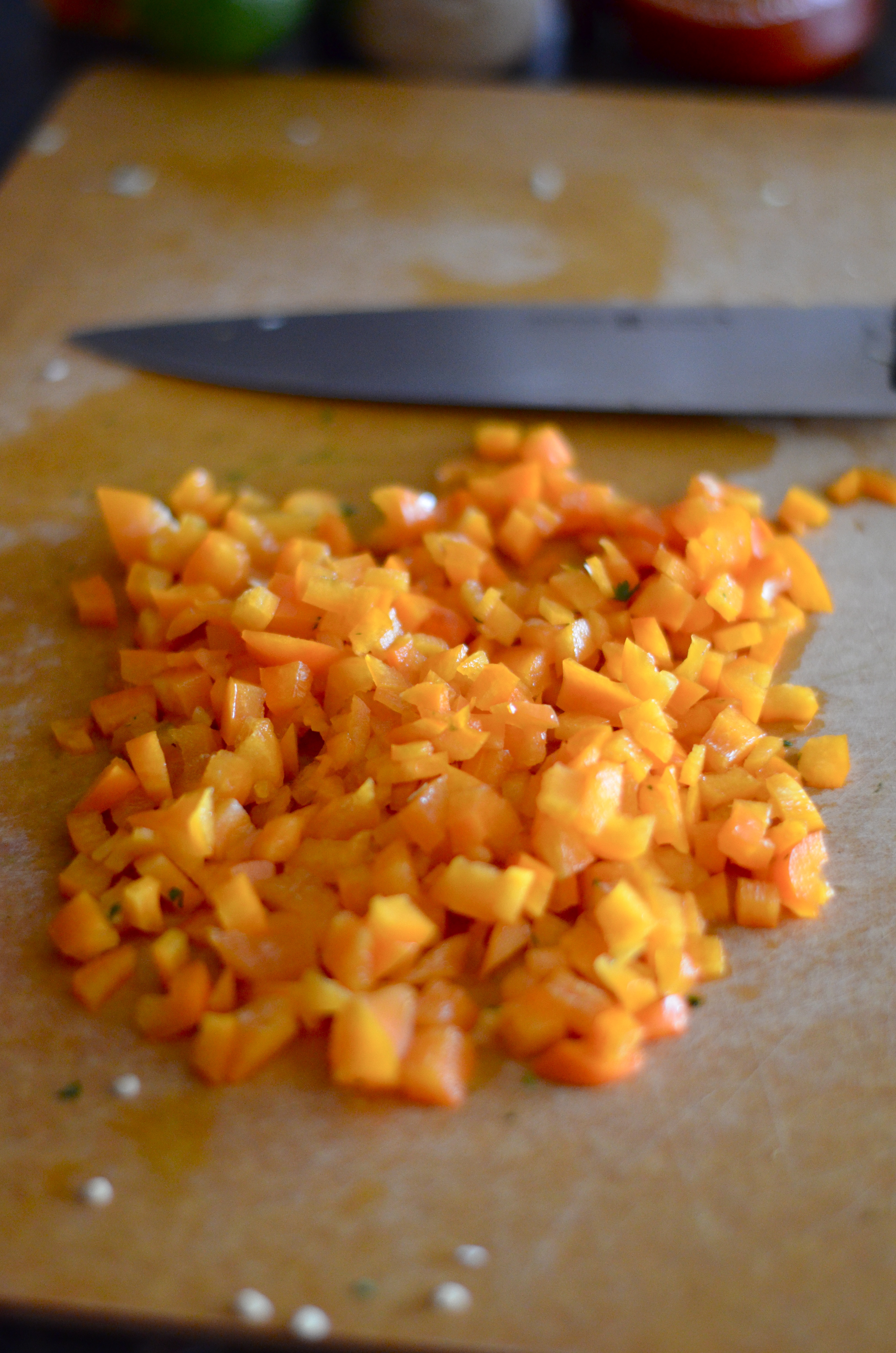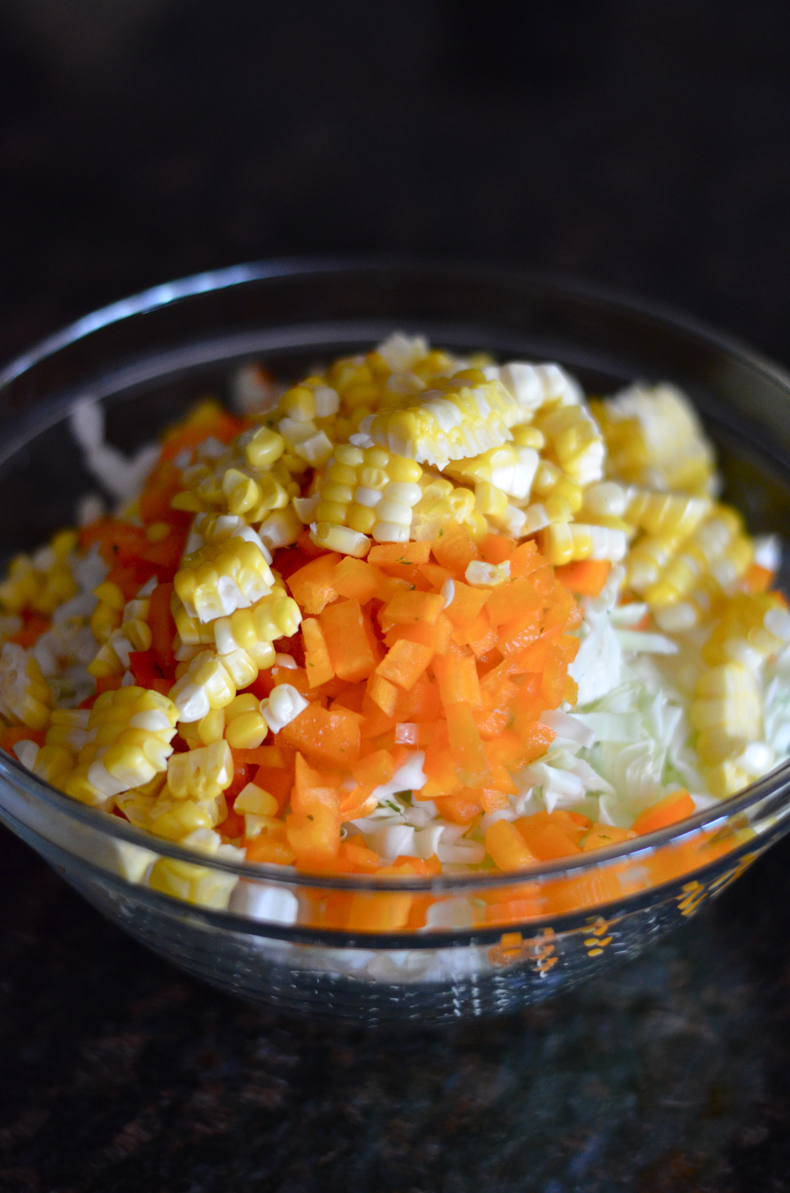 Slice and dice your pepper, corn, cilantro, green onion and corn and add all to a large bowl.
