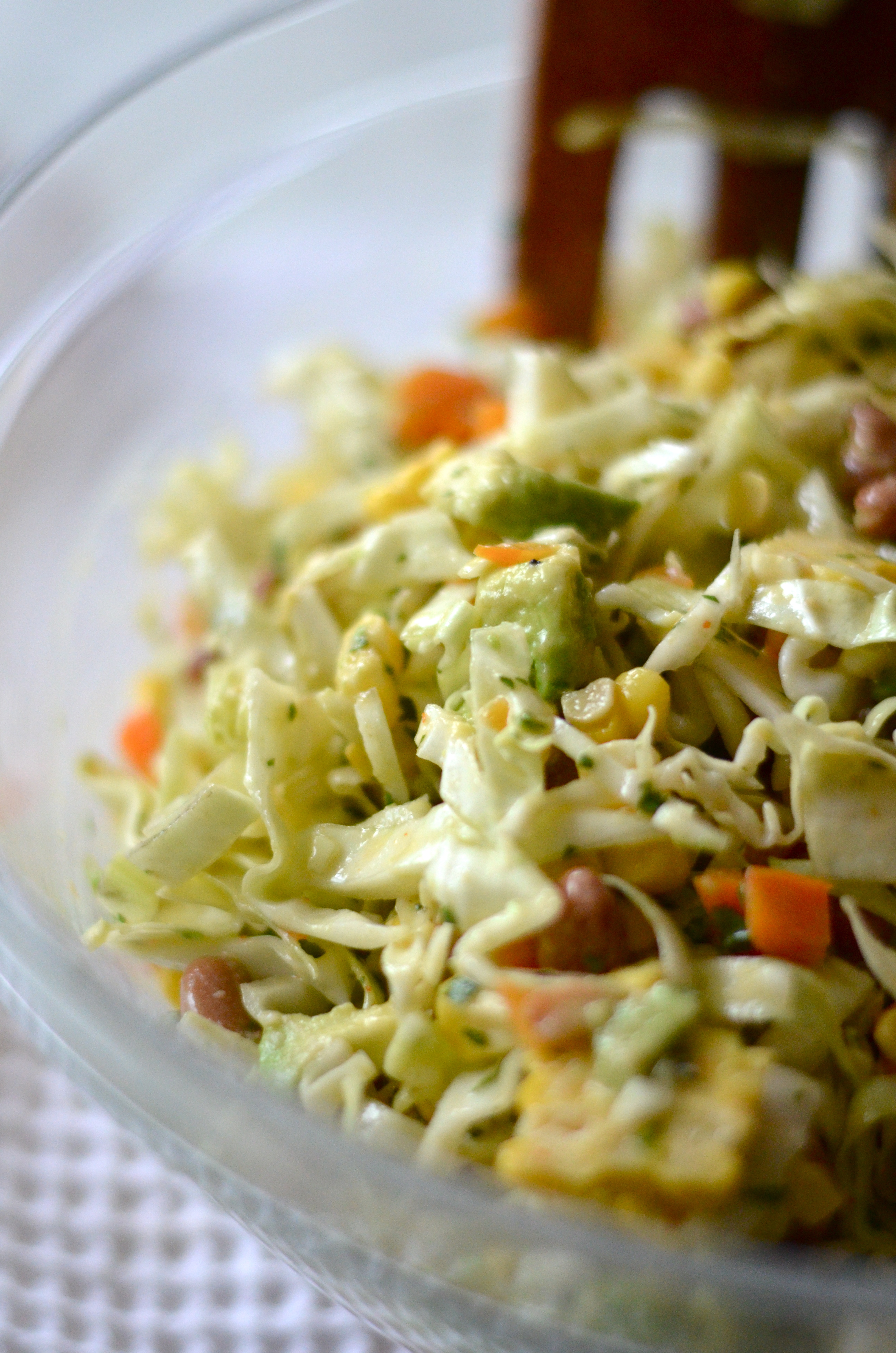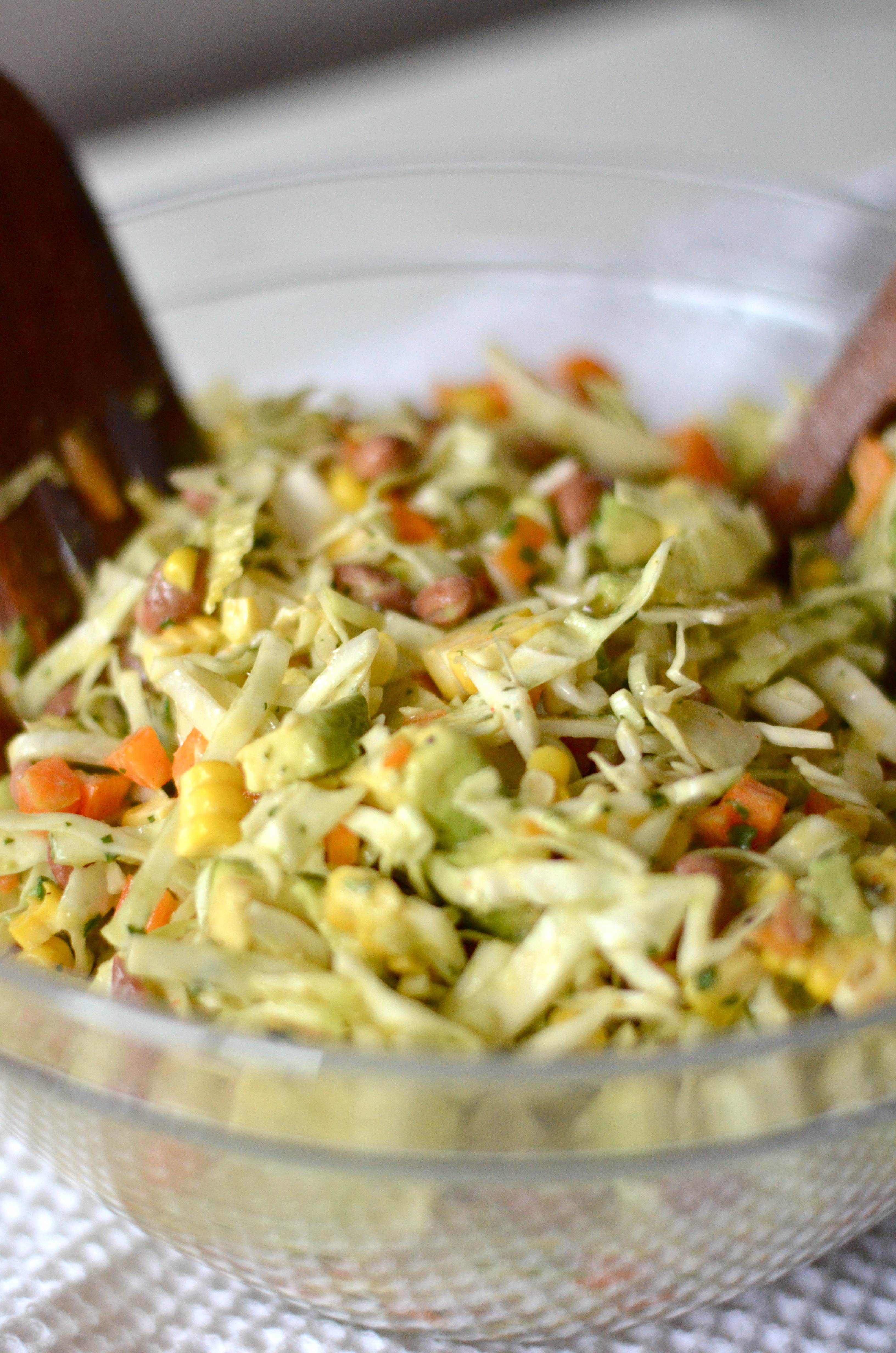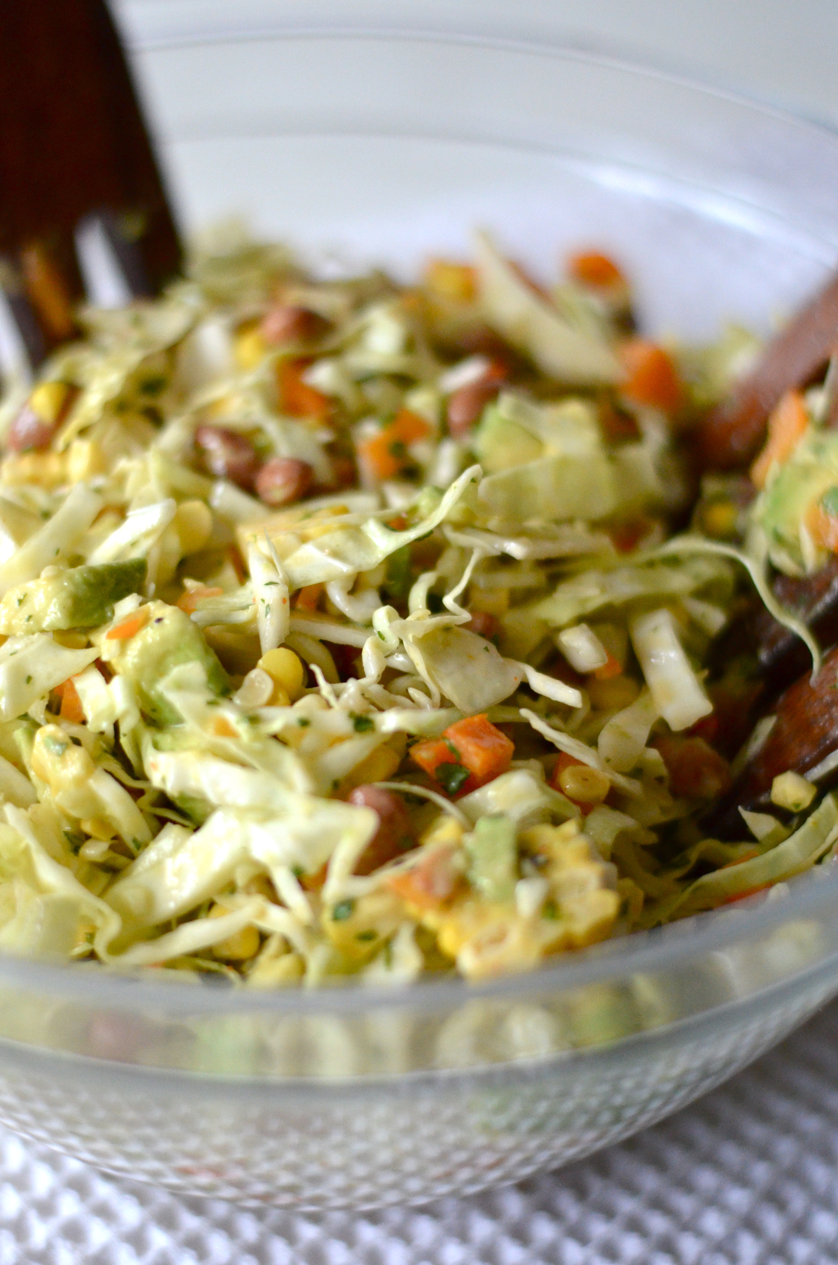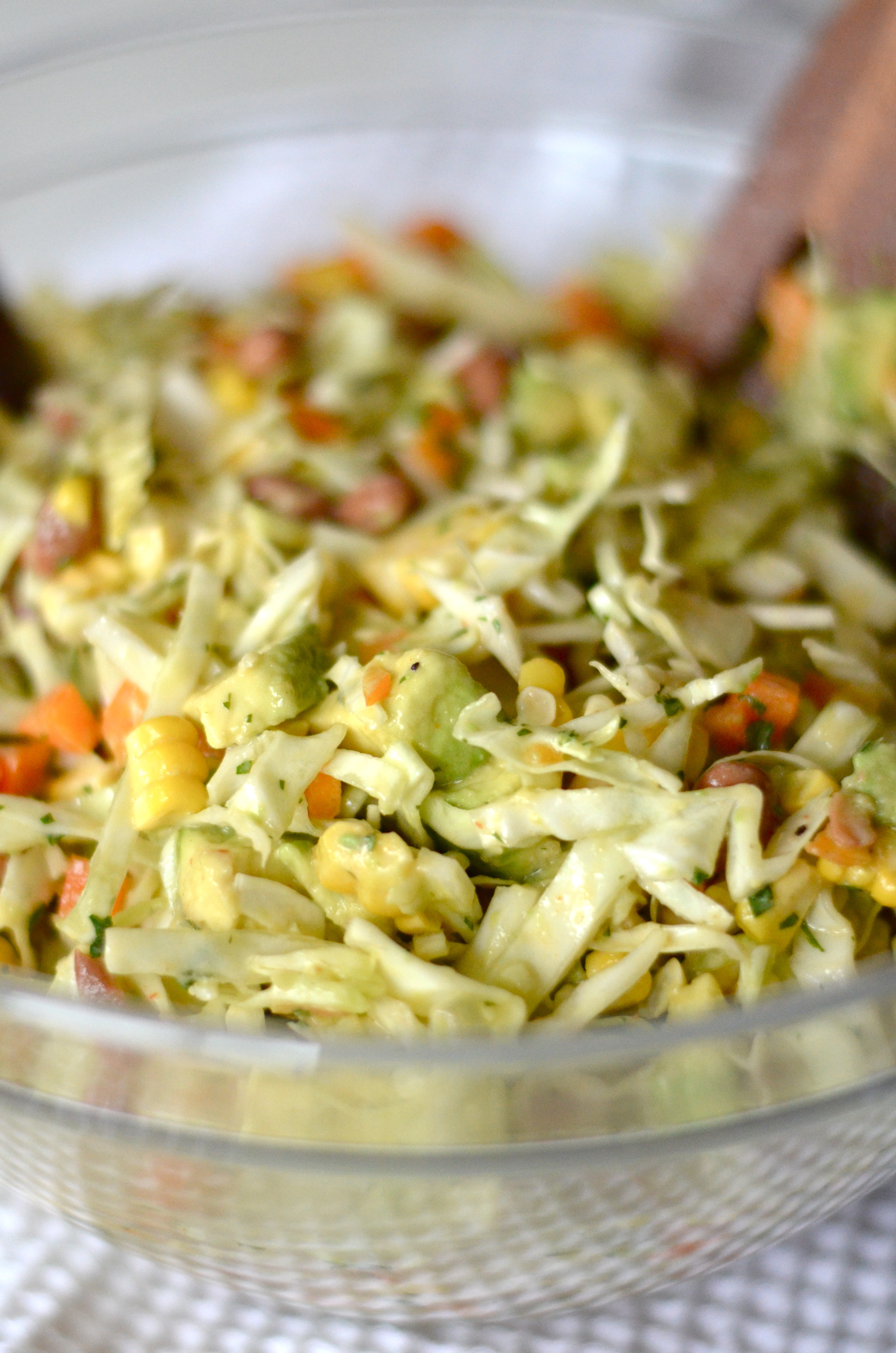 We eat sooooo much salad in the summer time that it is nice to switch it up sometimes with a refreshing slaw. This is a delicious slaw that strays from your typical cabbage salads. The addition of sweet summer corn and smooth avocado is absolutely delicious! Top it off with some grilled chicken or fish and I promise you will have a satisfying summer meal.
