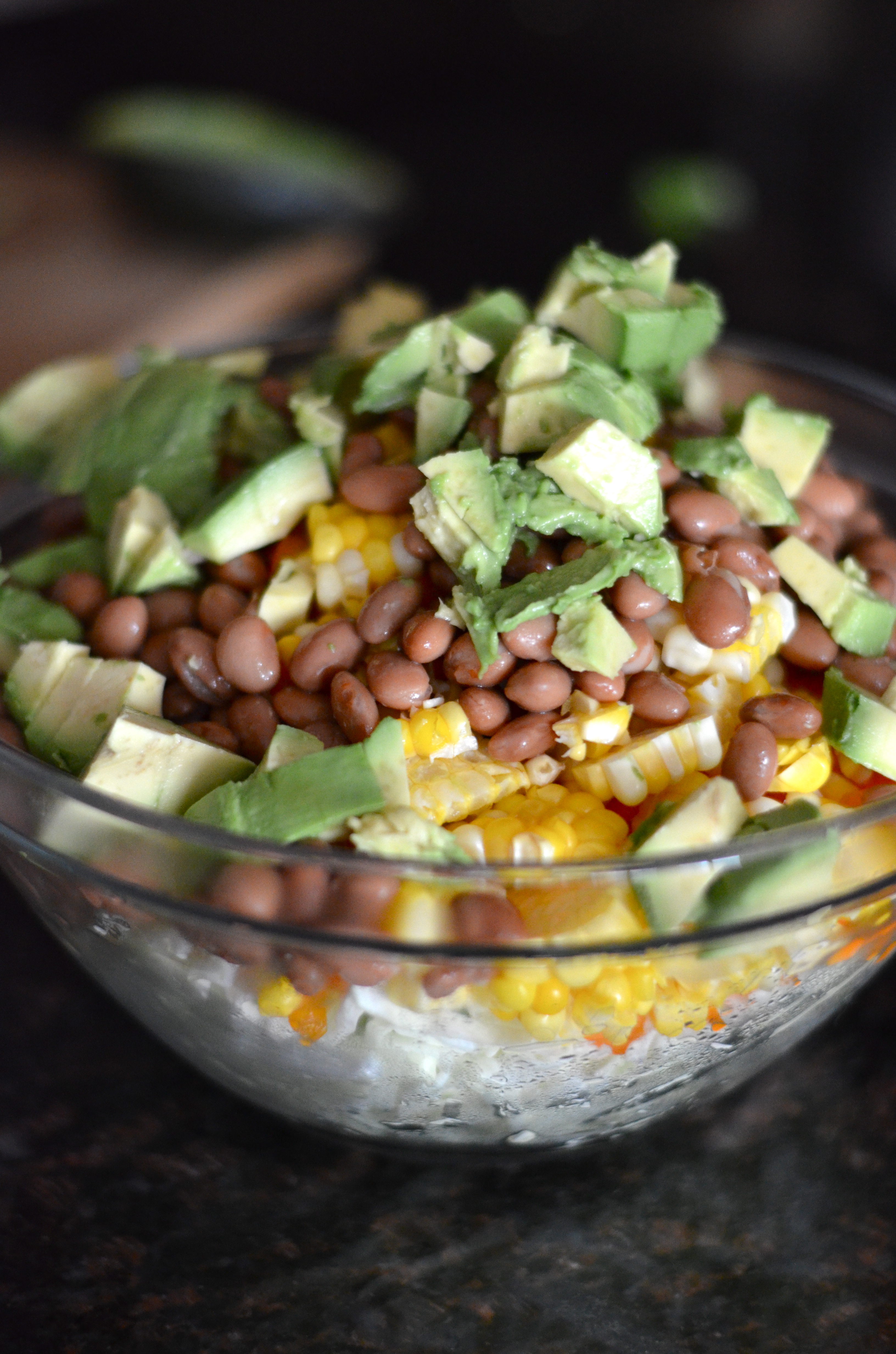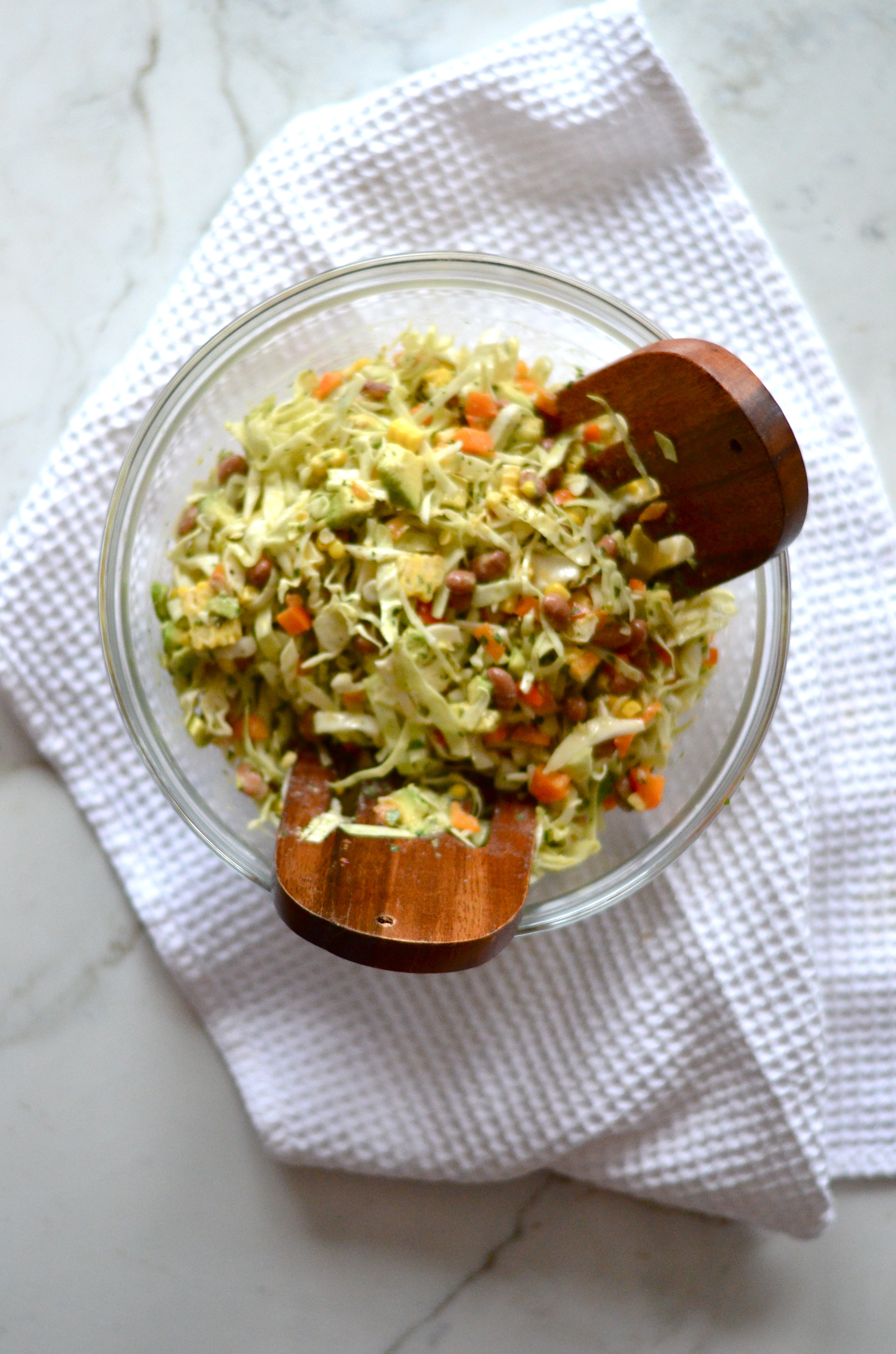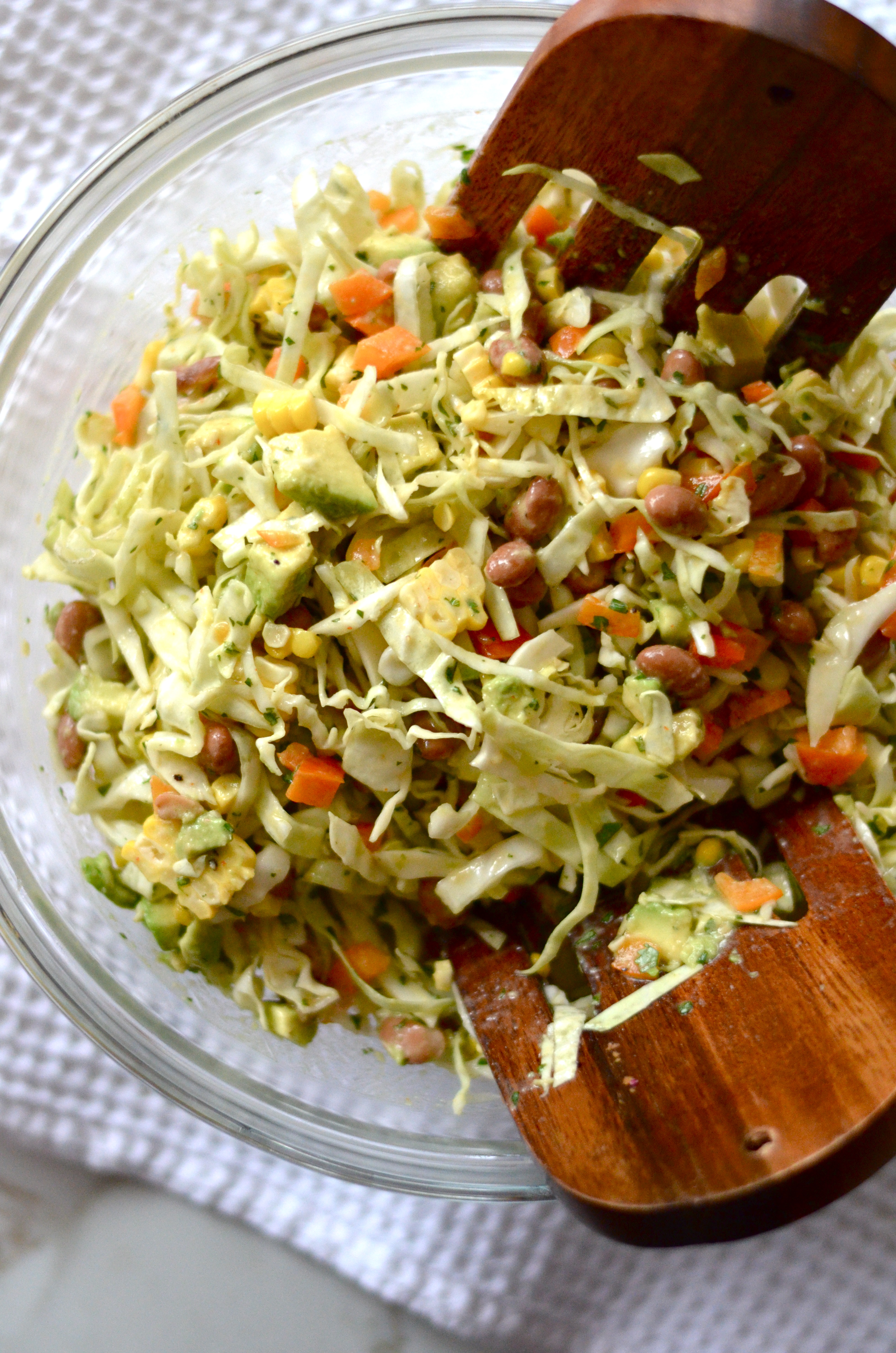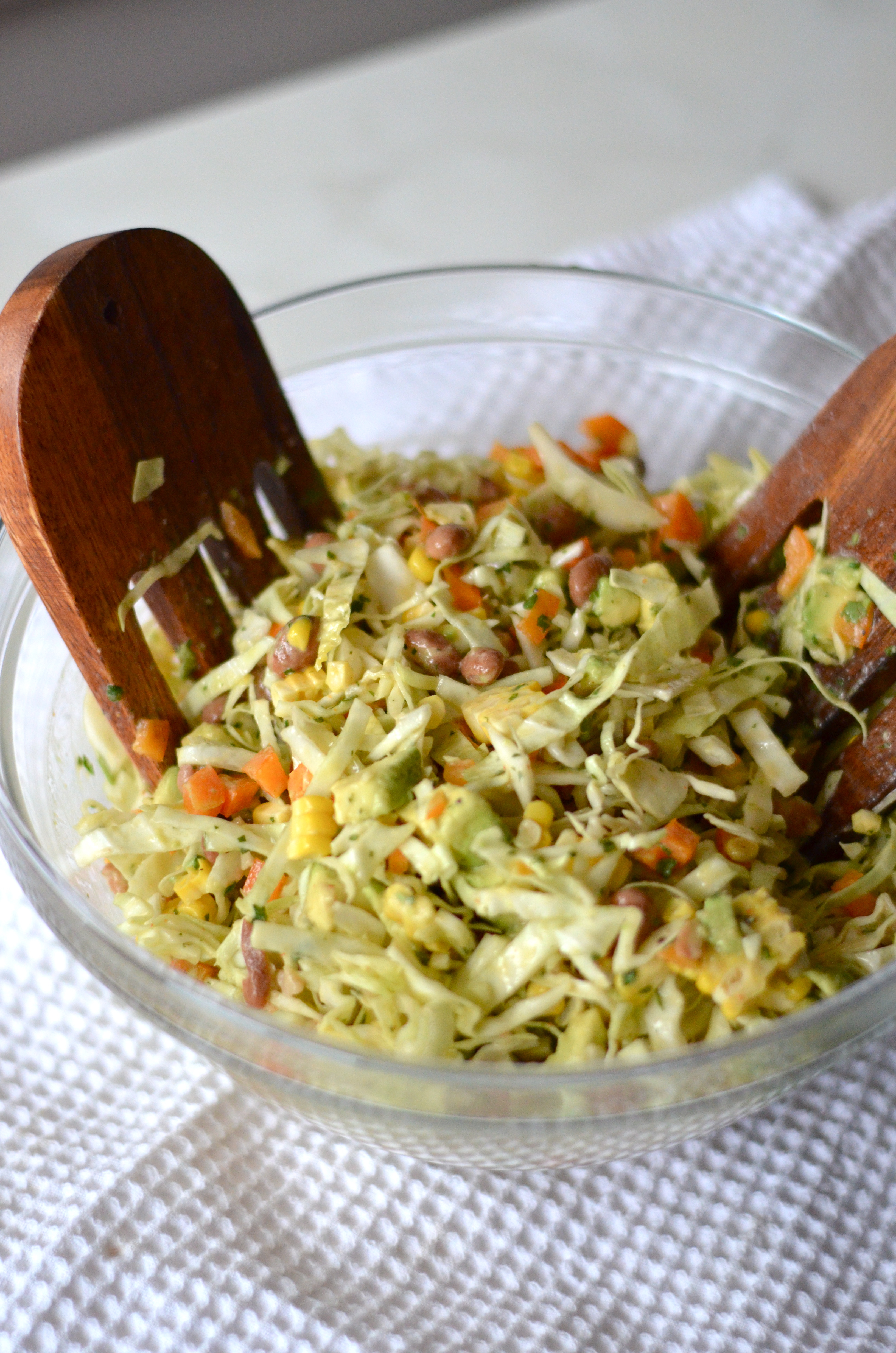 We eat sooooo much salad in the summer time that it is nice to switch it up sometimes with a refreshing slaw. This is a delicious slaw that strays from your typical cabbage salads. The addition of sweet summer corn and smooth avocado is absolutely delicious! Top it off with some grilled chicken or fish and I promise you will have a satisfying summer meal.