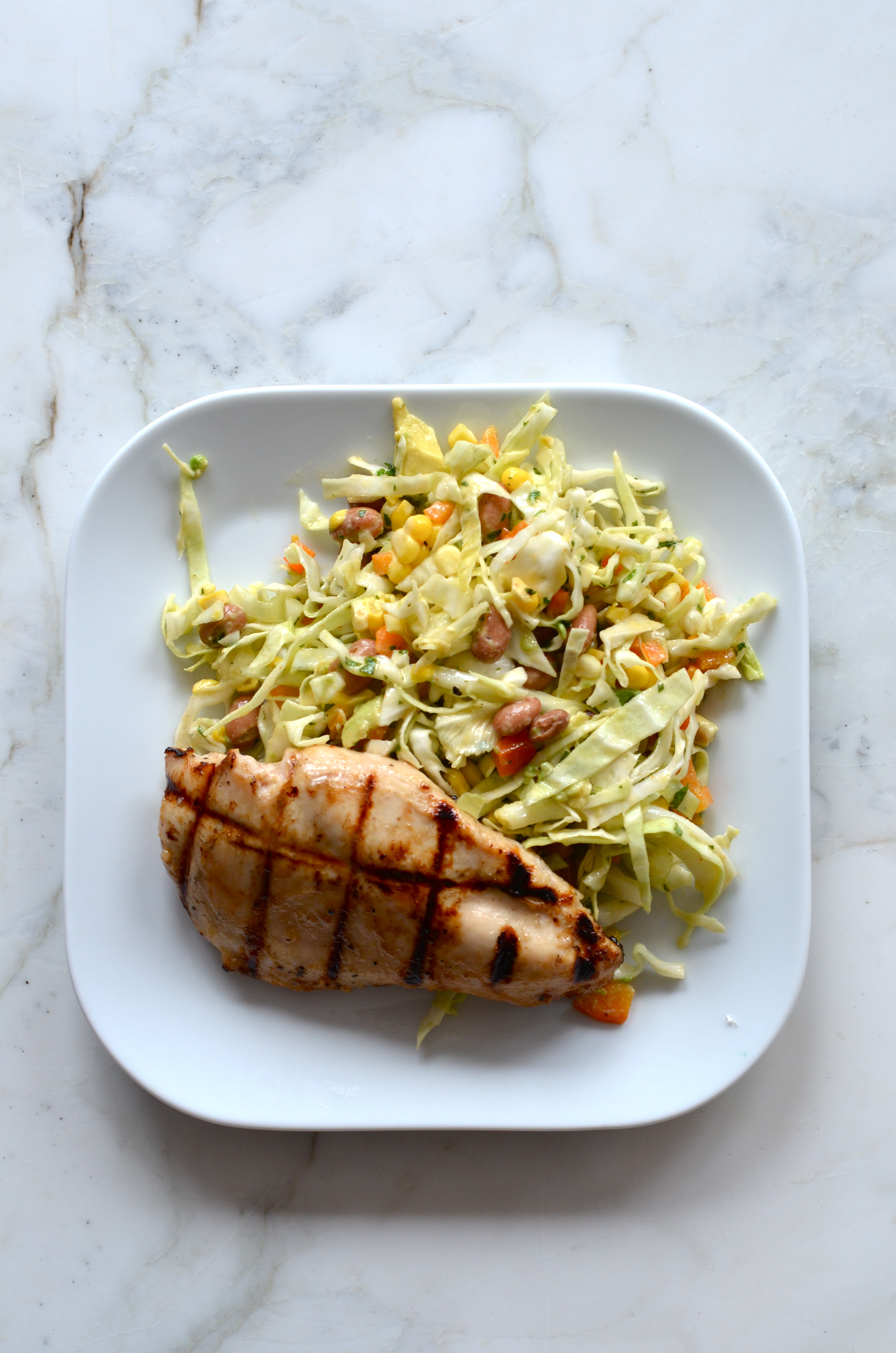 Any protein of choice optional on top. We served our slaw with some marinated chicken breasts. You could use chicken thighs/drums, shrimp, any white fish or salmon, the list goes on!