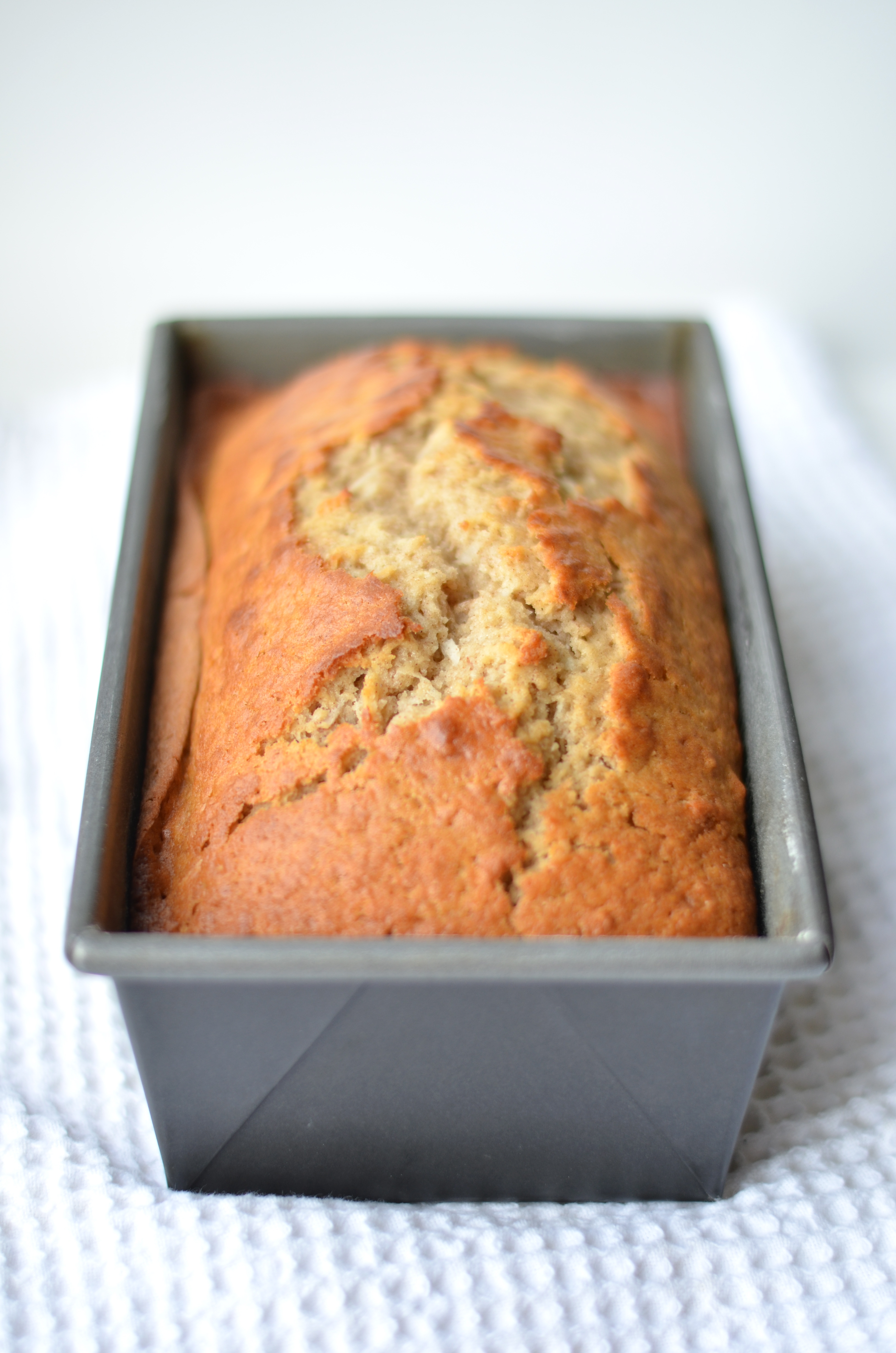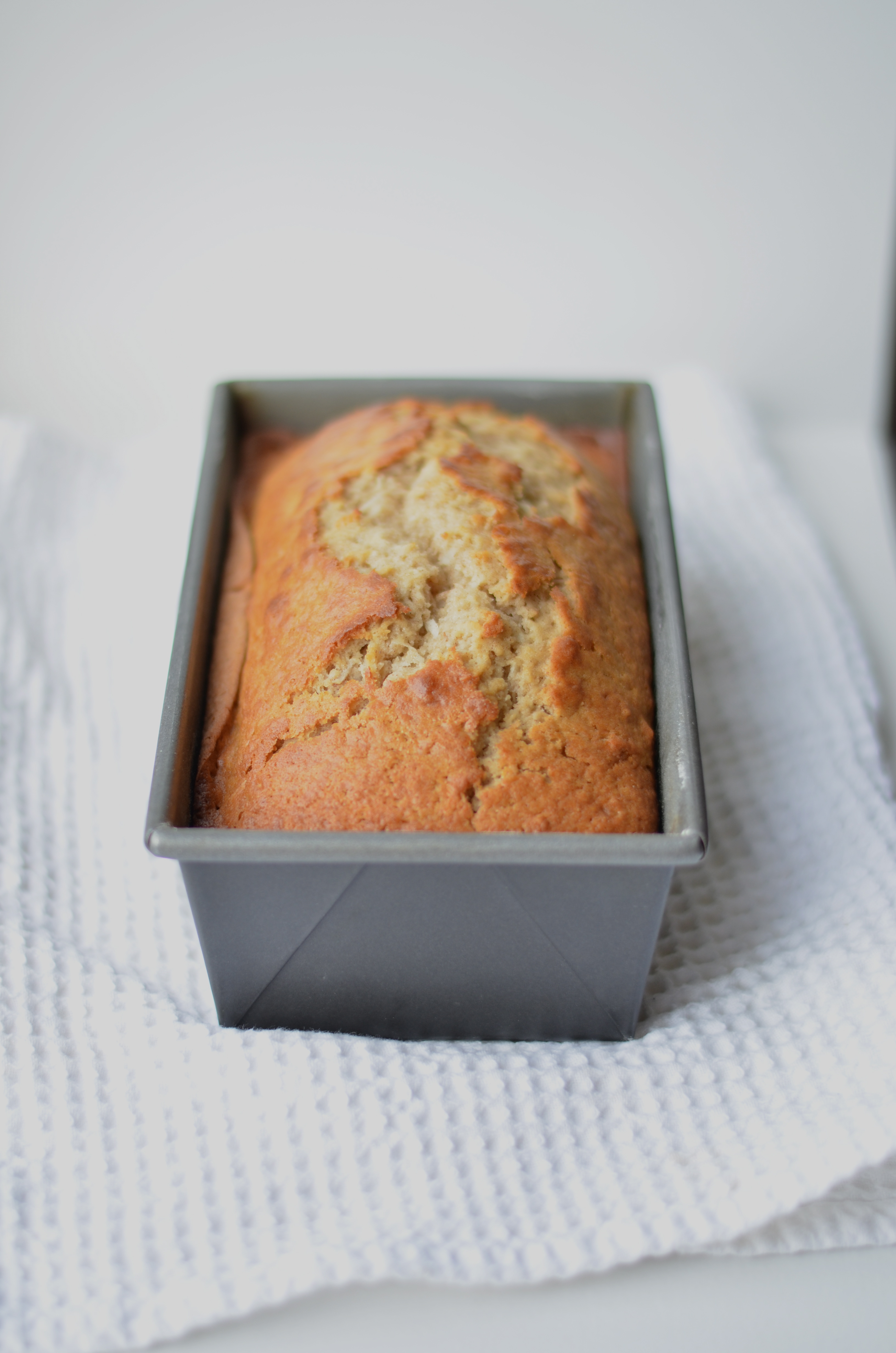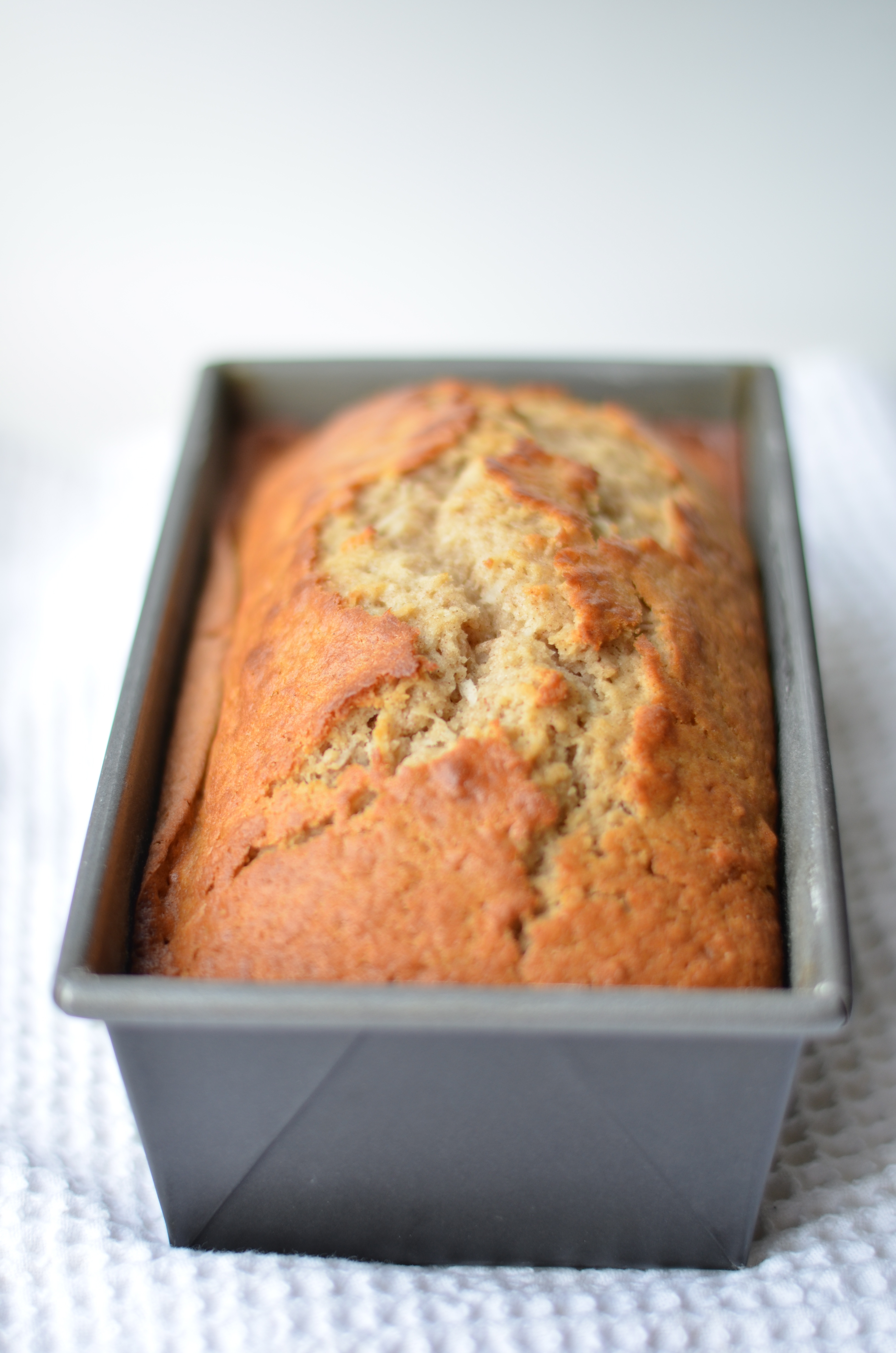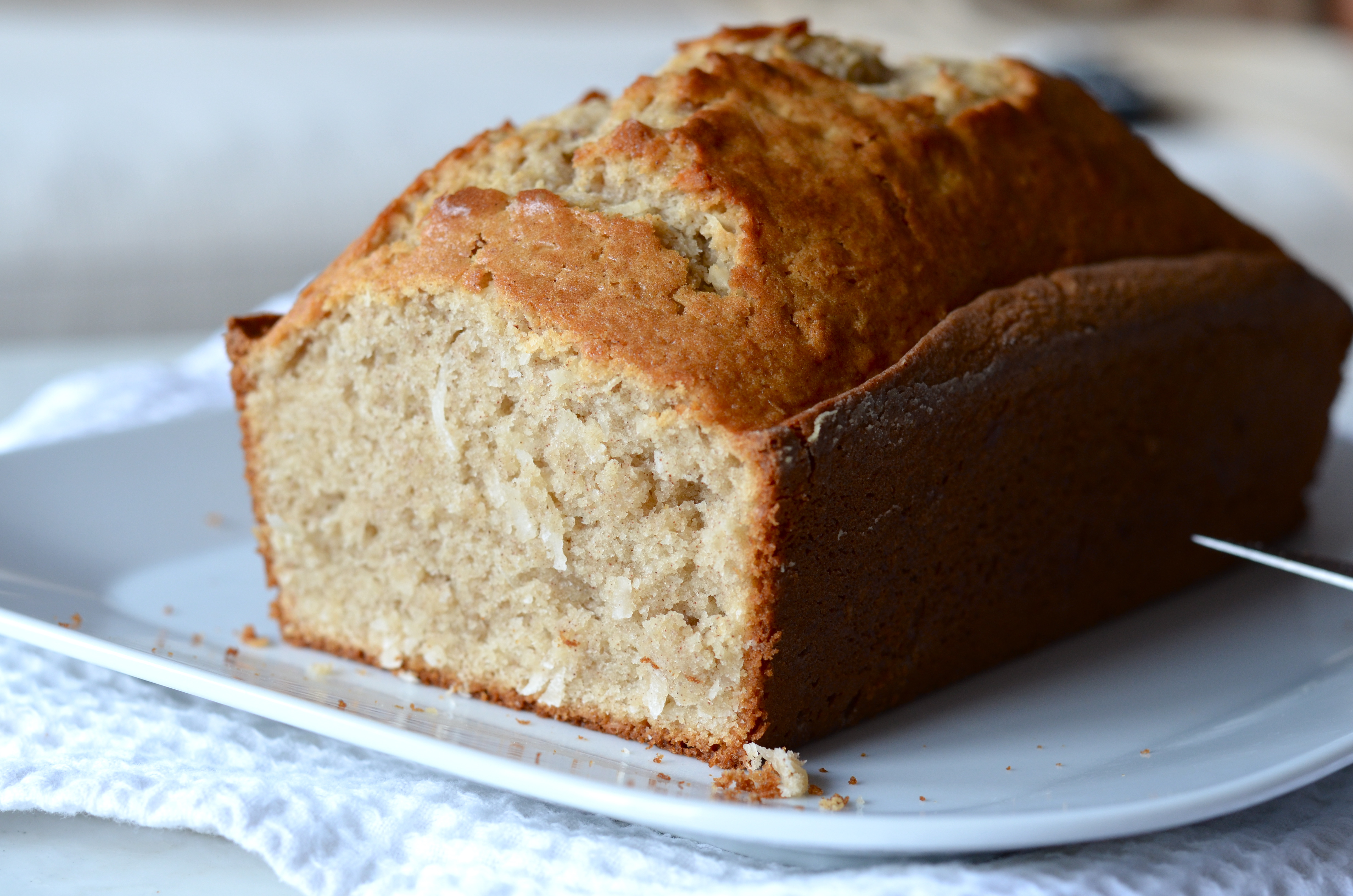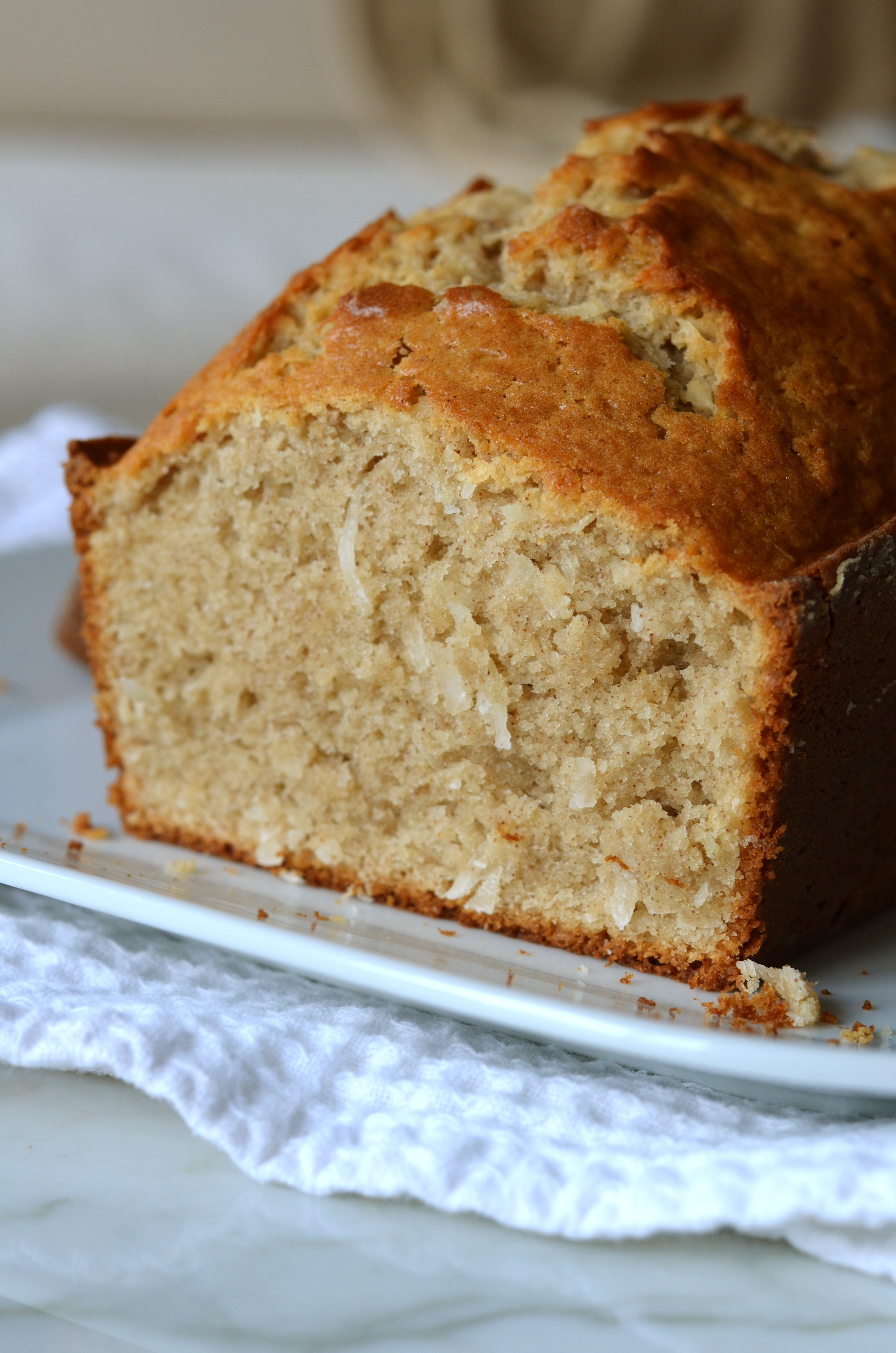 This simple, one bowl, coconut bread is fast to whip up and smells absolutely amazing. It turned out beautifully with a golden brown crust on the top. There is a slight hint of cinnamon followed by the nutty chew of coconut. A tasty bread that is great for breakfast, lunch or a midday snack.