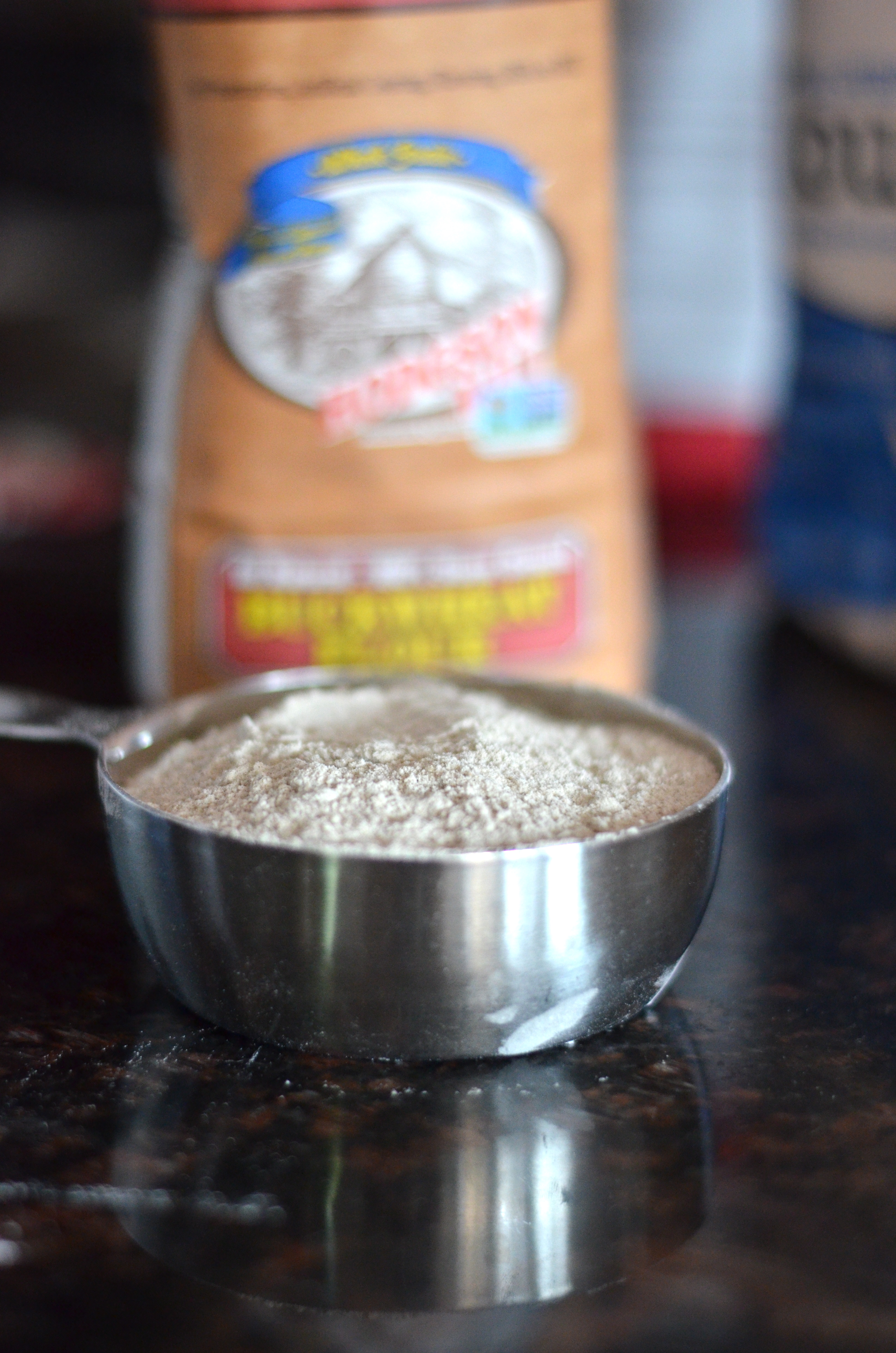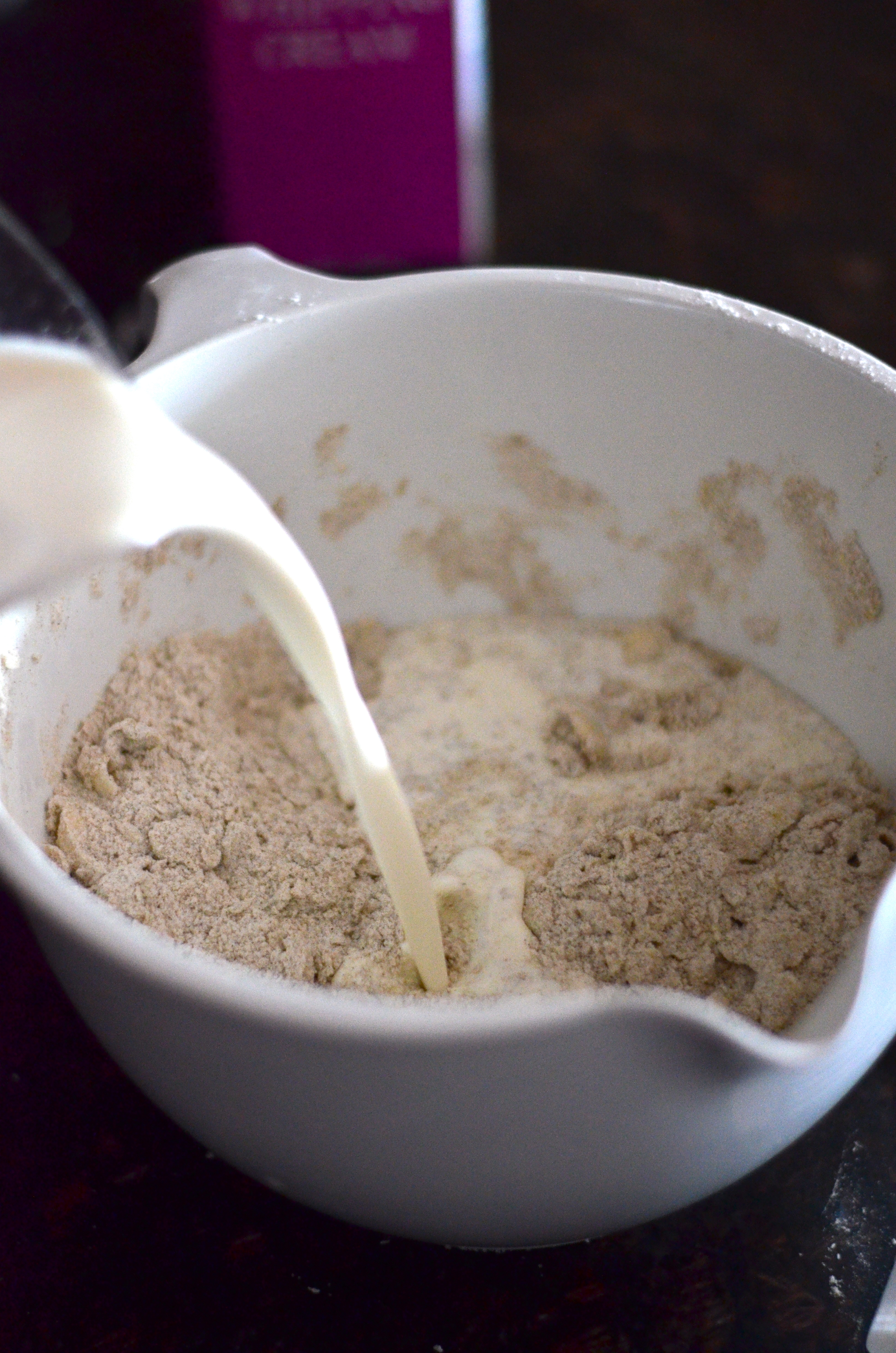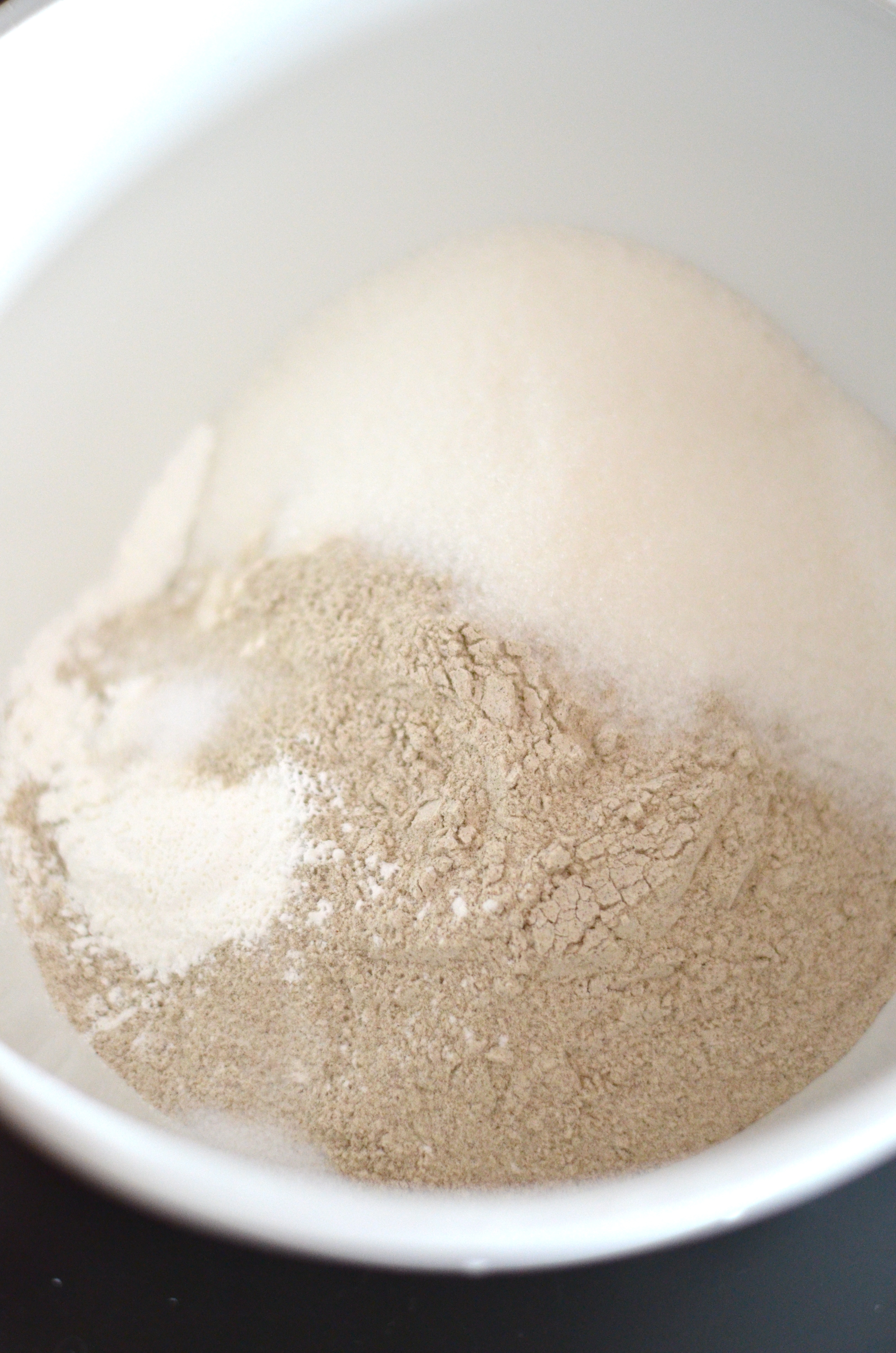 In a large bowl, whisk together flours, sugar, baking powder and salt.